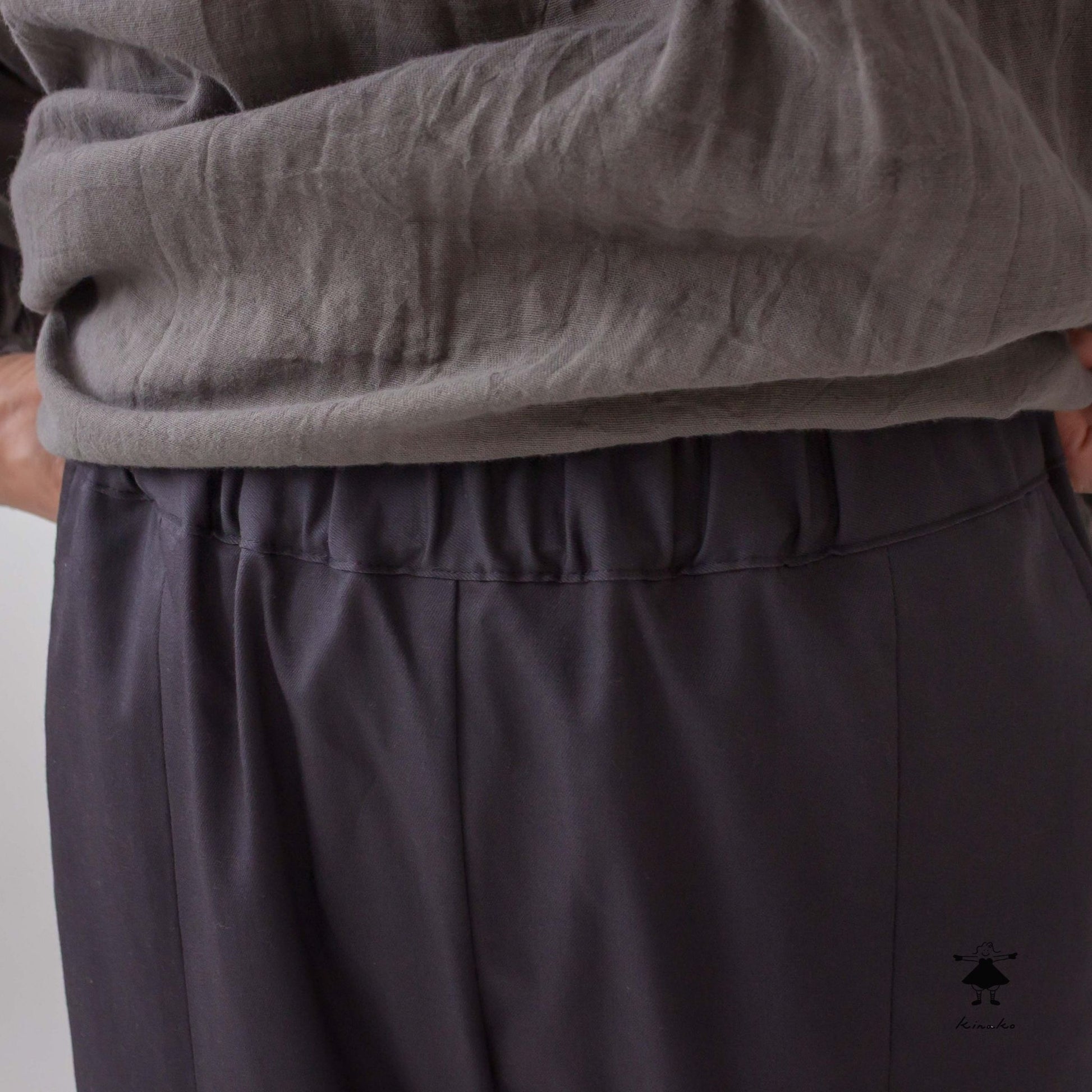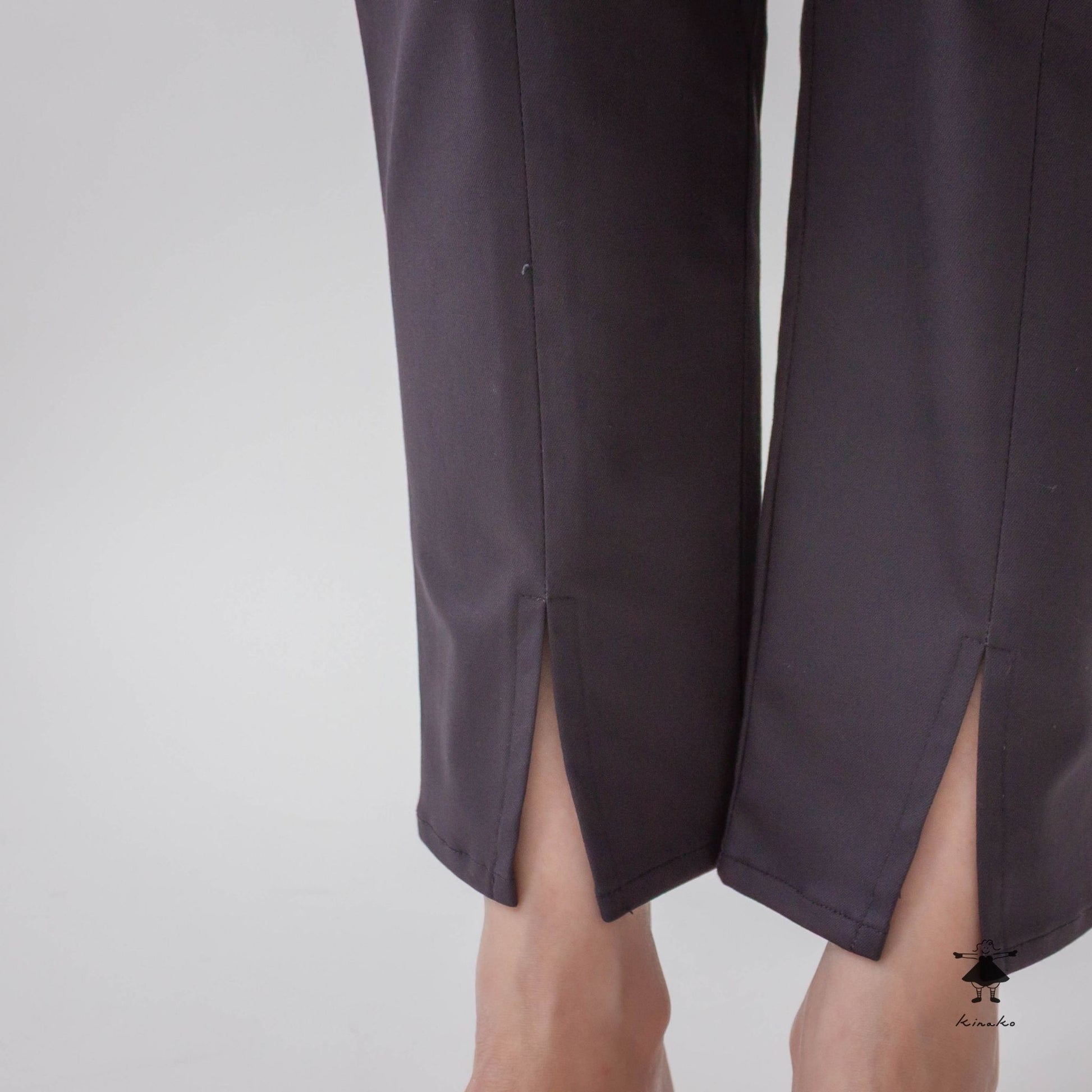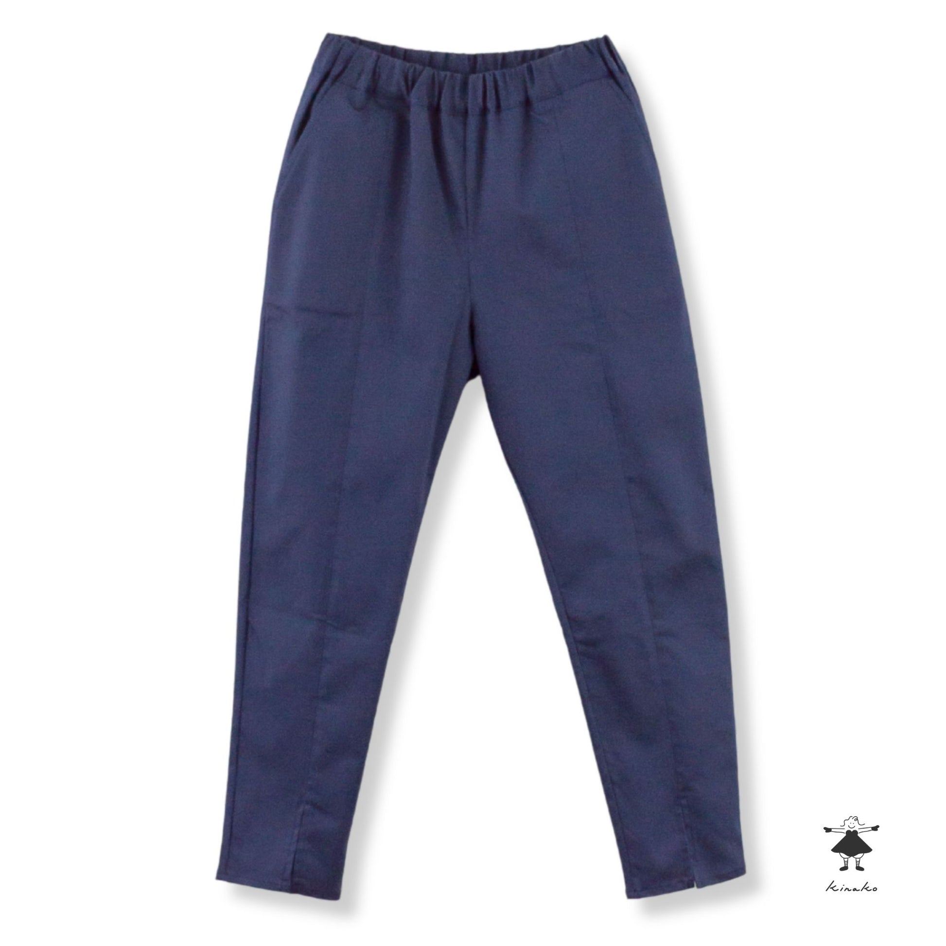 ストレッチの効いたスリムパンツです。ウエスト総ゴムで穿きやすく、足通ししやすい裾のセンタースリットが特徴です。