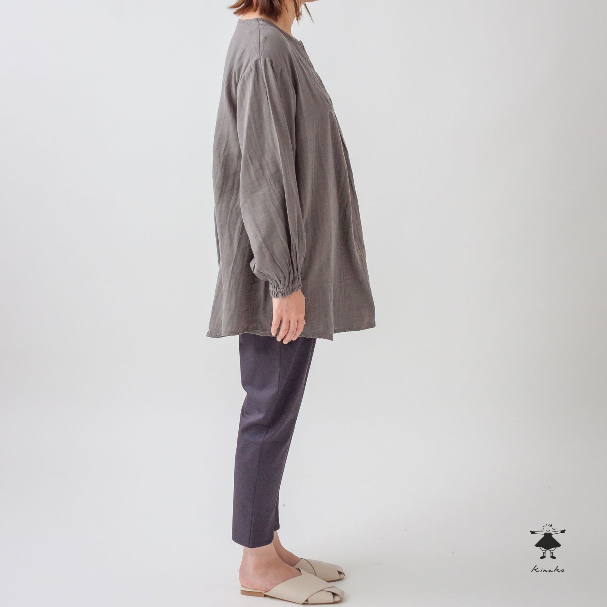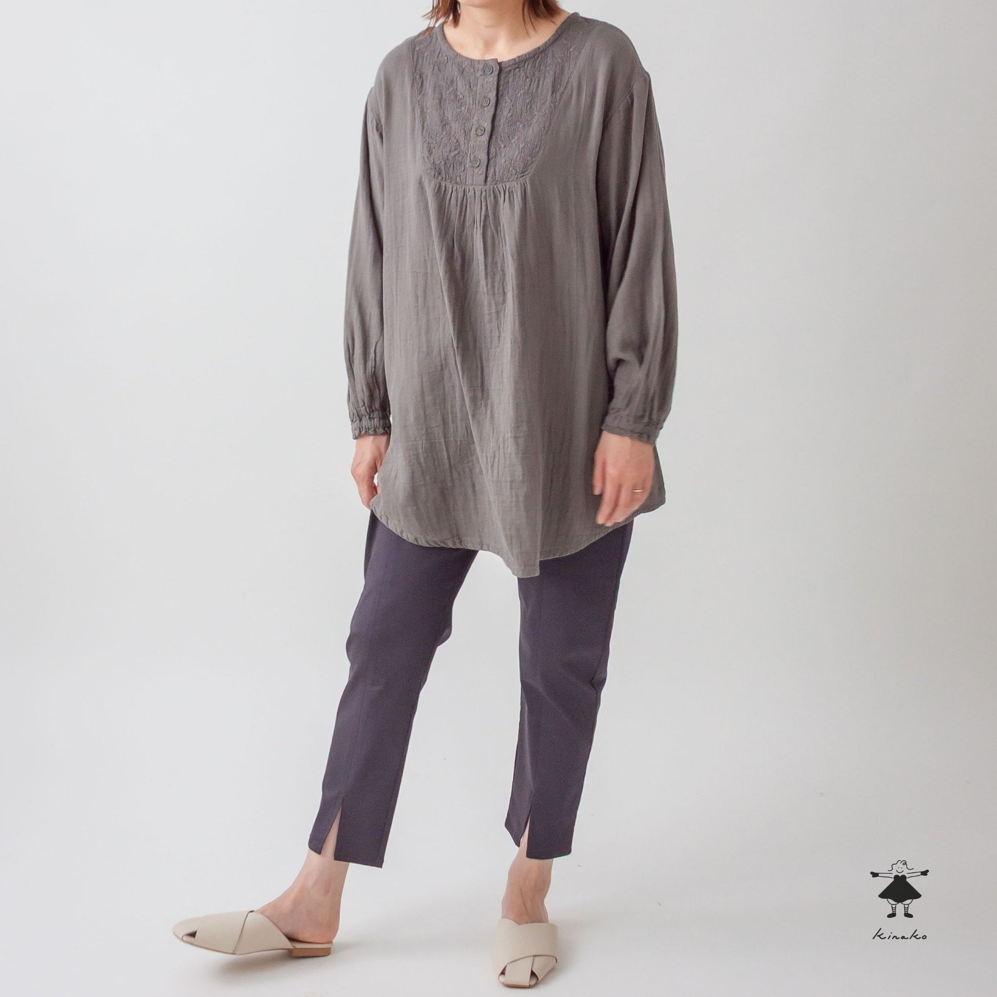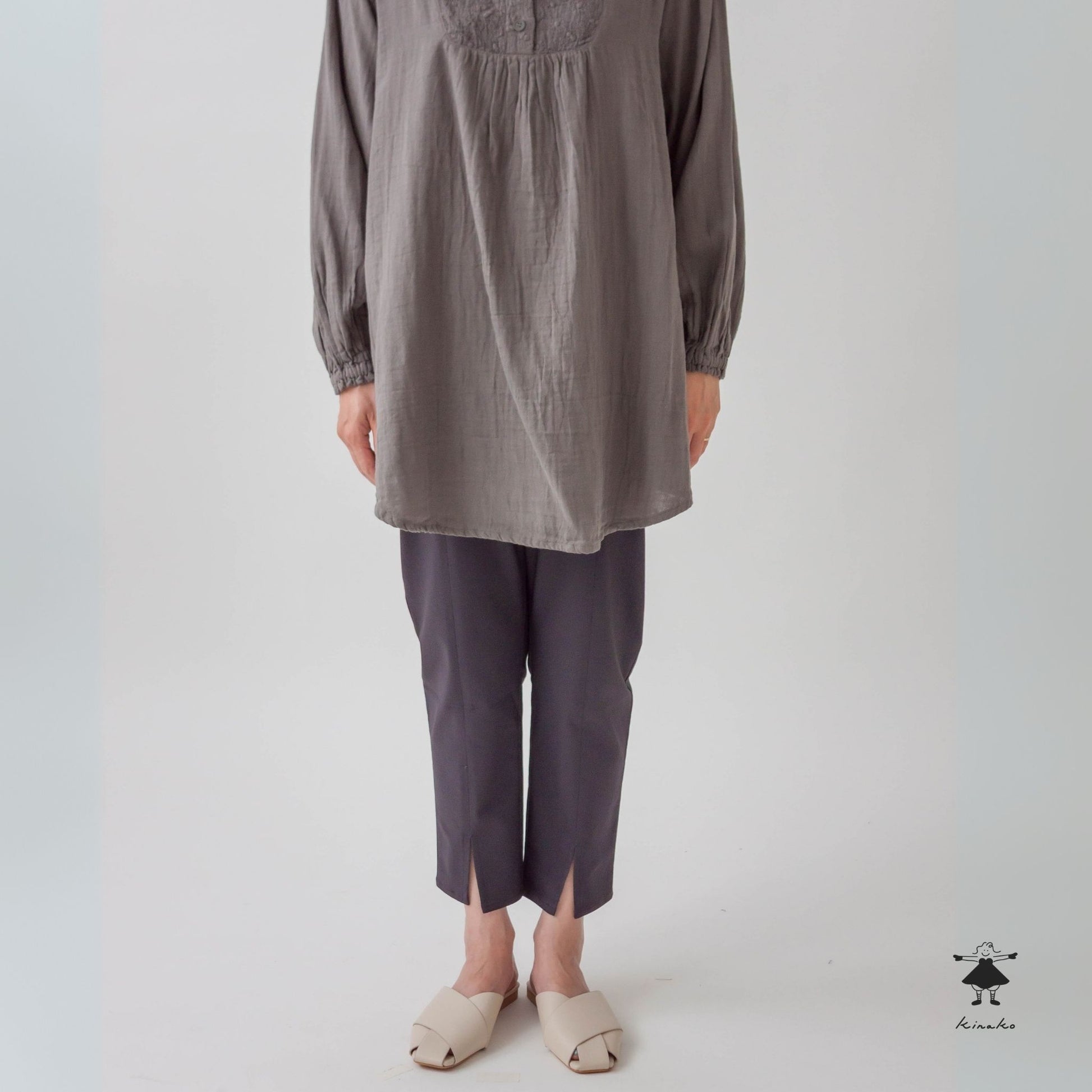 ストレッチの効いたスリムパンツです。ウエスト総ゴムで穿きやすく、足通ししやすい裾のセンタースリットが特徴です。