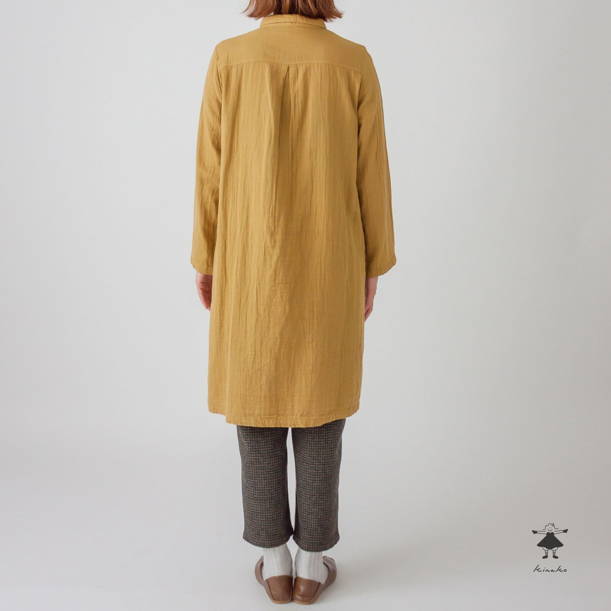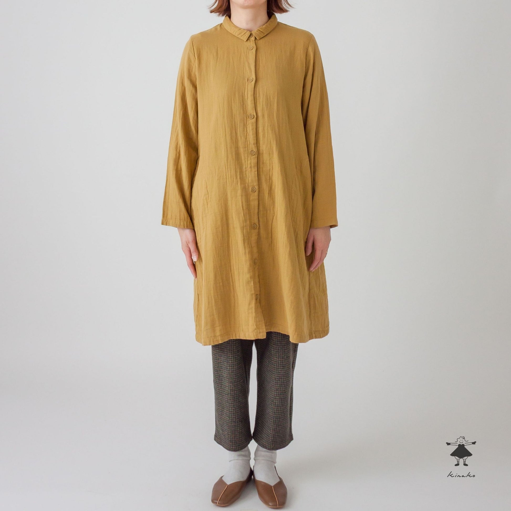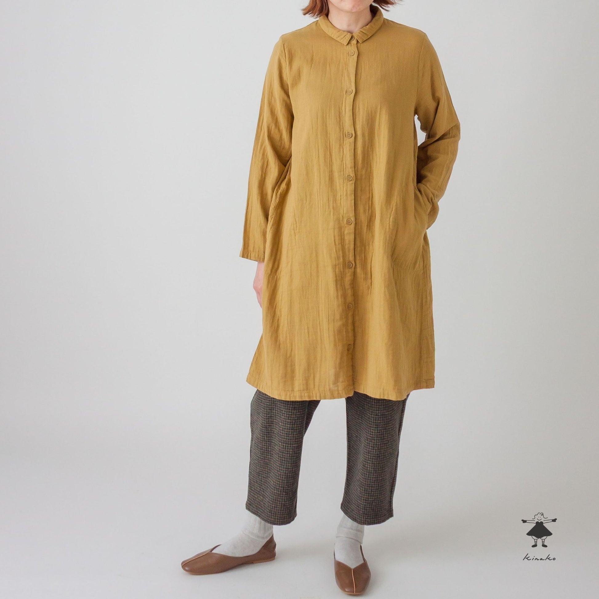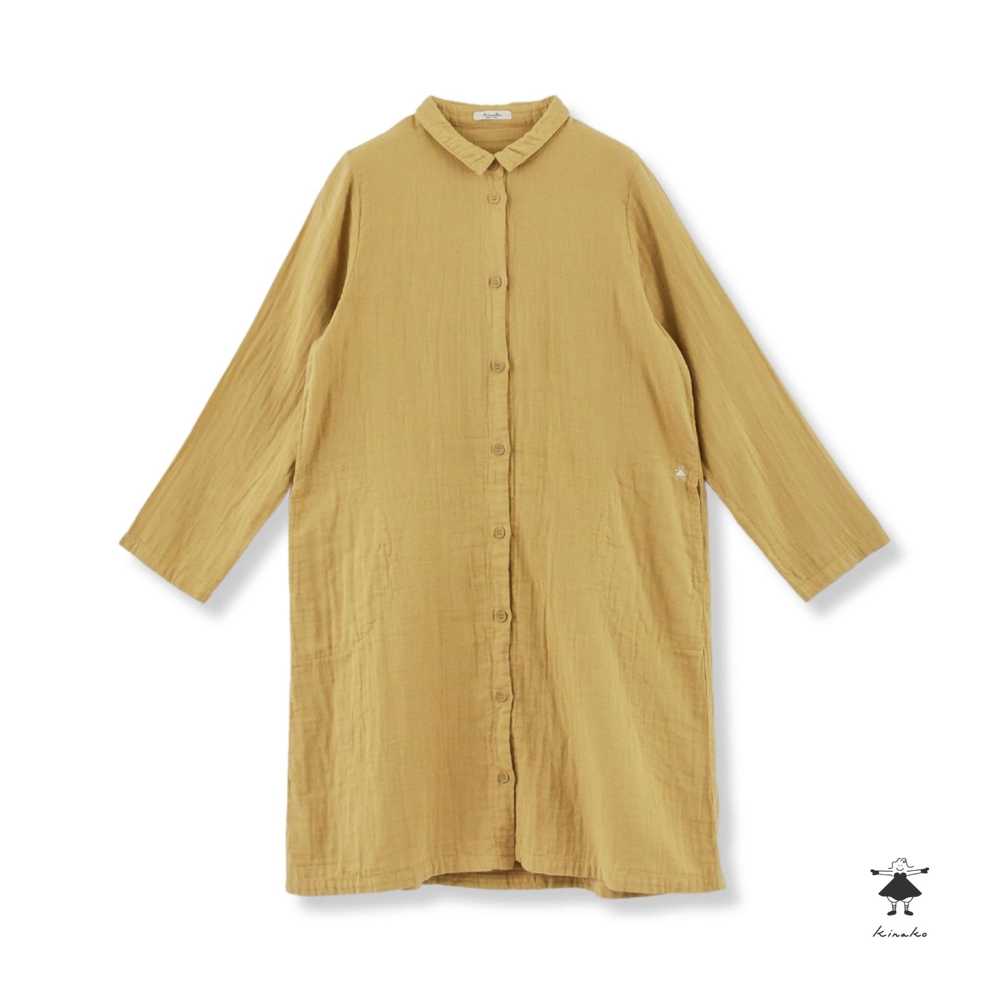 スッキリとした印象のシャツワンピースです。裾にかけてゆるやかな広がりと、小さな衿が特徴です。ボタンを開けて羽織物として使える商品です。左ポケット口にきなこちゃん刺しゅう有り。