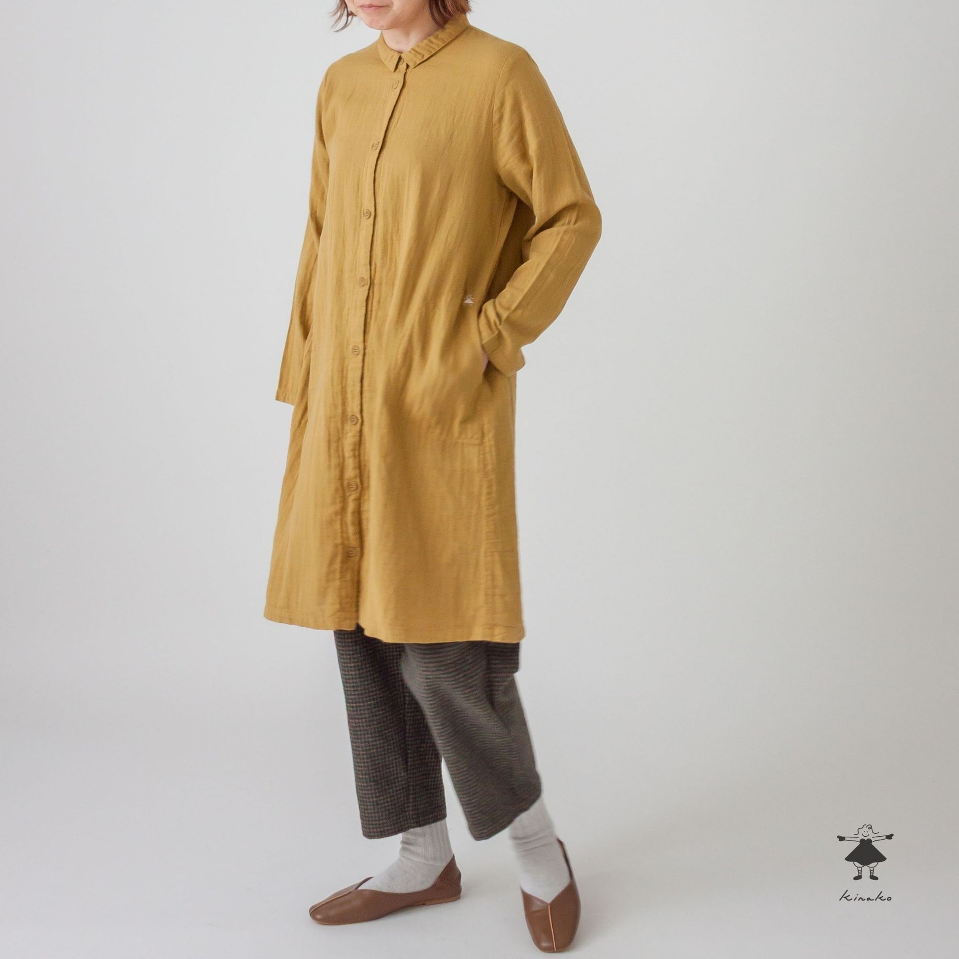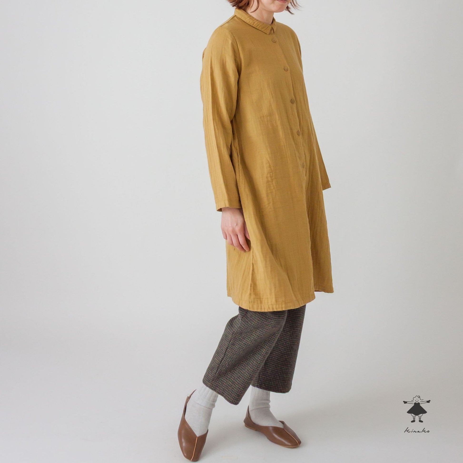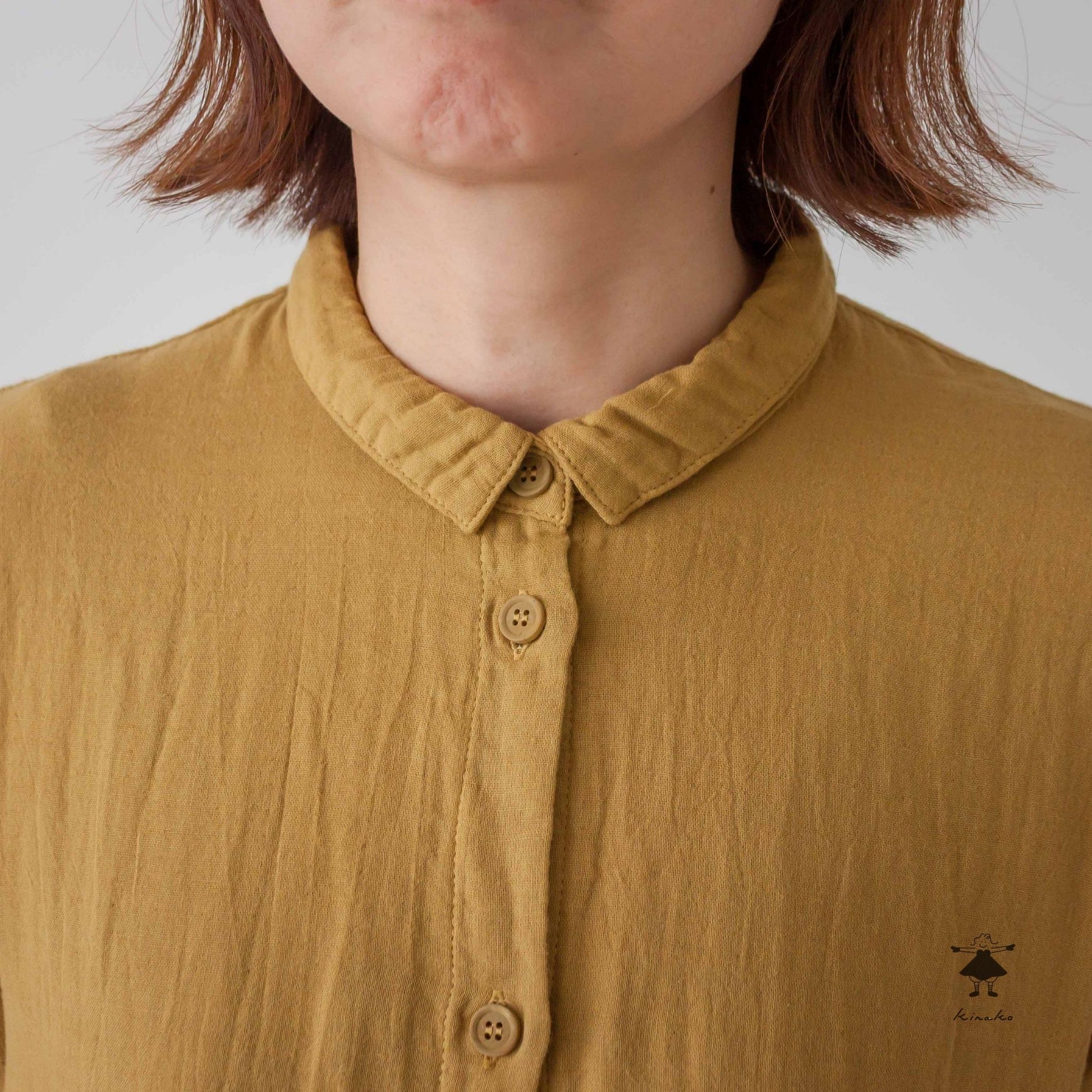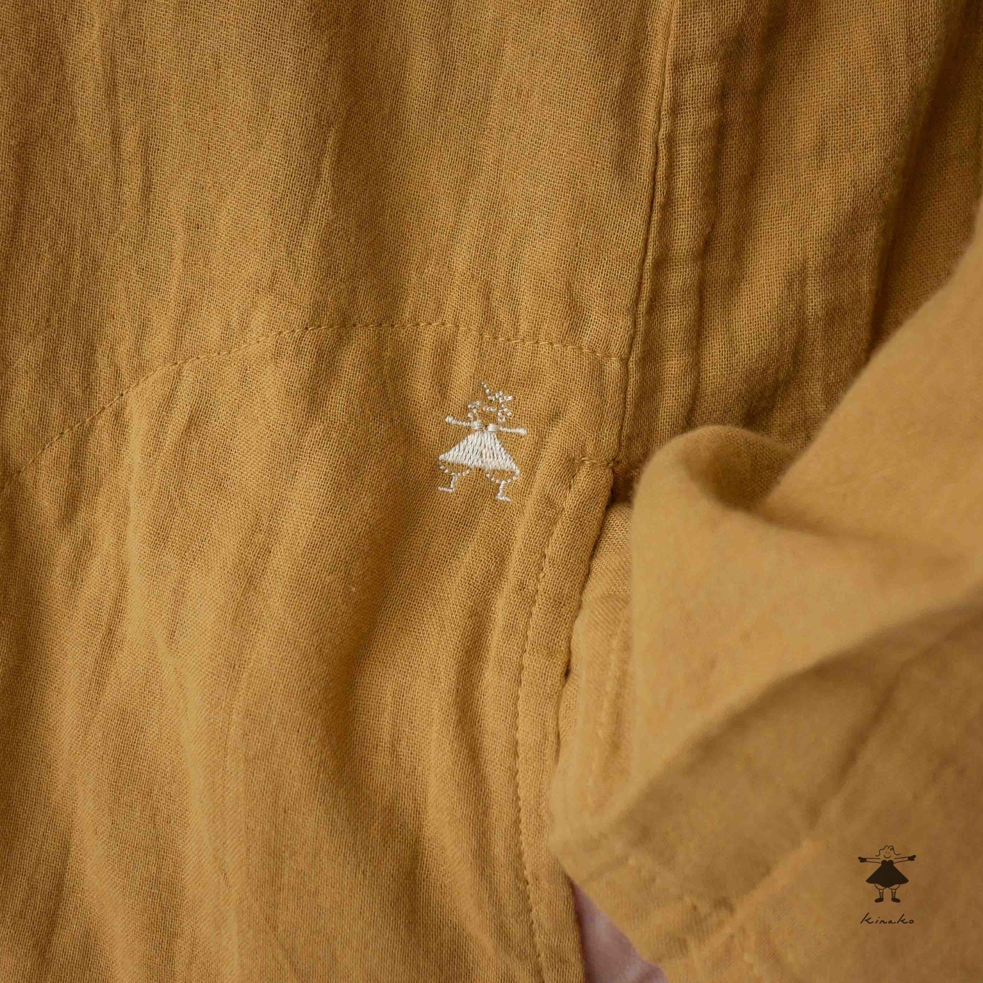 スッキリとした印象のシャツワンピースです。裾にかけてゆるやかな広がりと、小さな衿が特徴です。ボタンを開けて羽織物として使える商品です。左ポケット口にきなこちゃん刺しゅう有り。