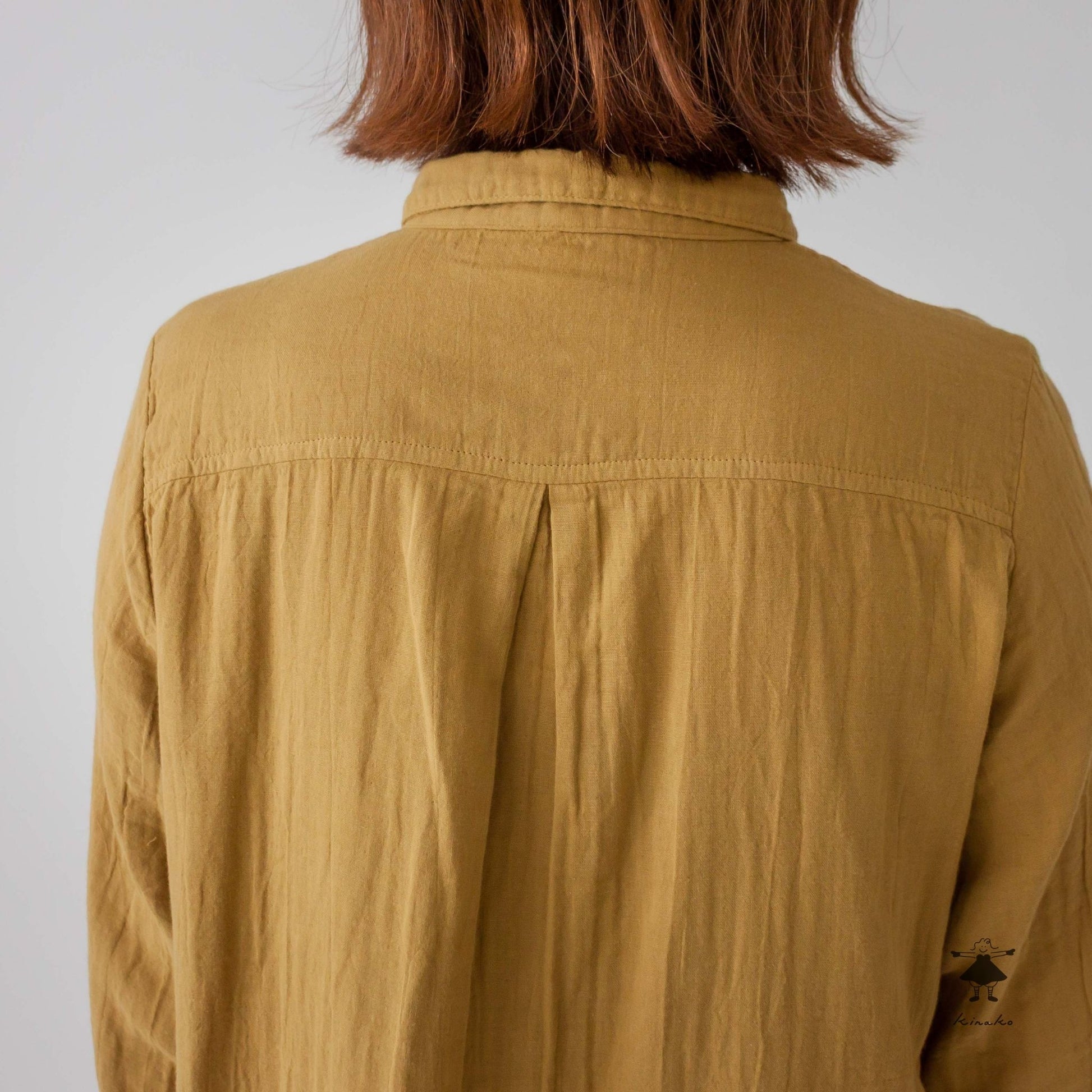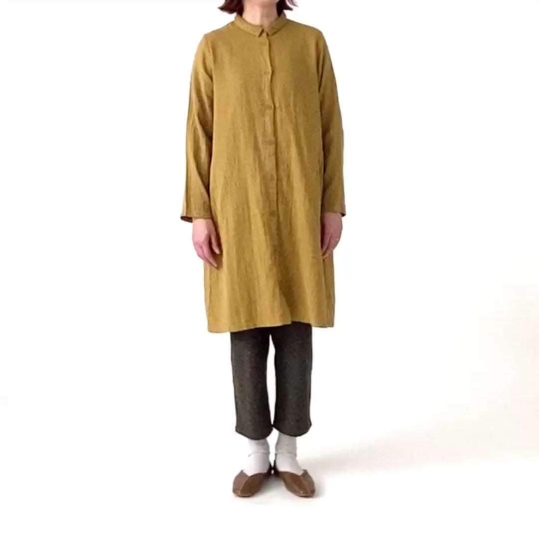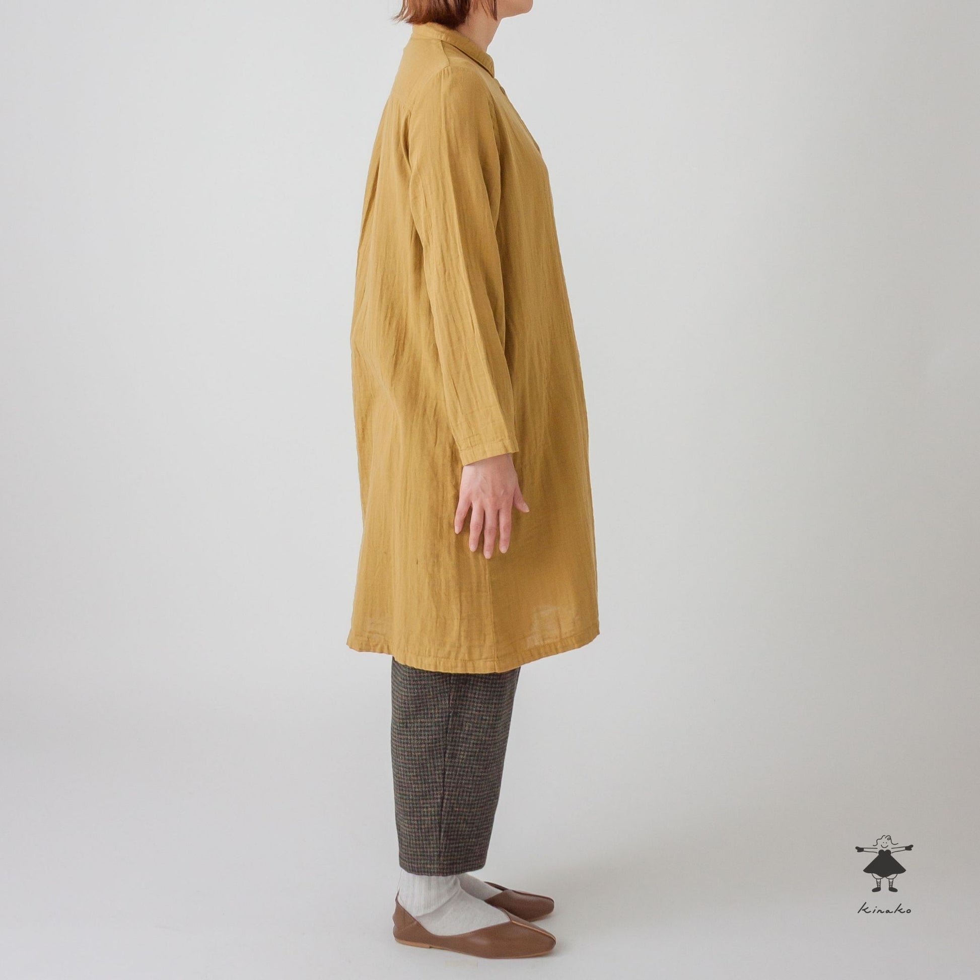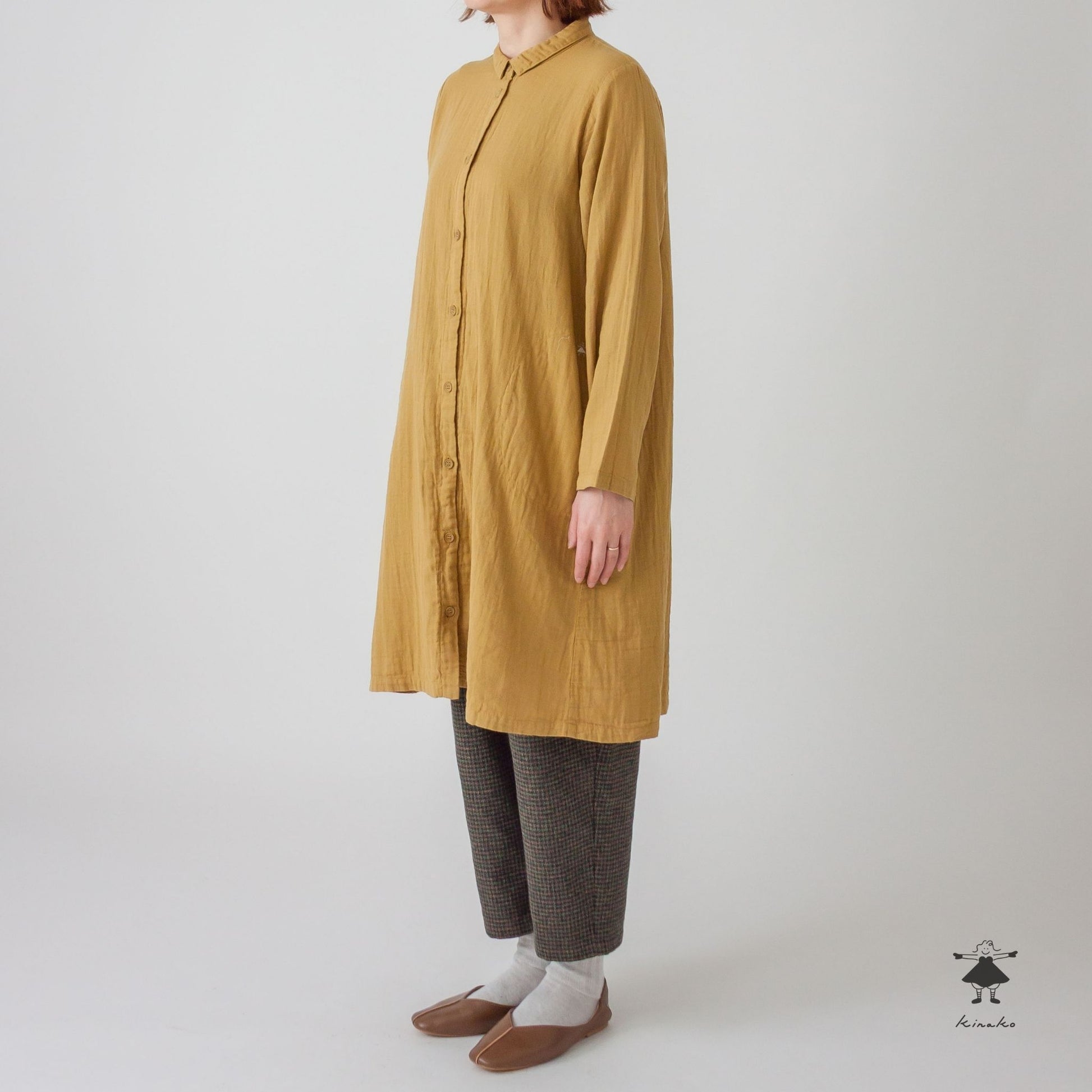 スッキリとした印象のシャツワンピースです。裾にかけてゆるやかな広がりと、小さな衿が特徴です。ボタンを開けて羽織物として使える商品です。左ポケット口にきなこちゃん刺しゅう有り。