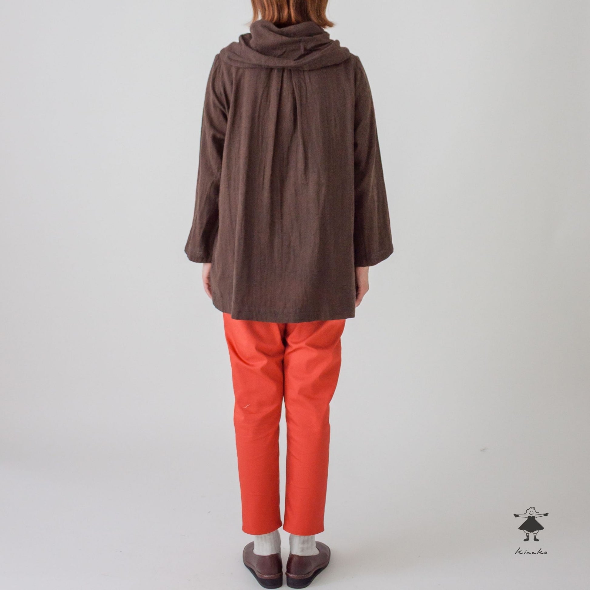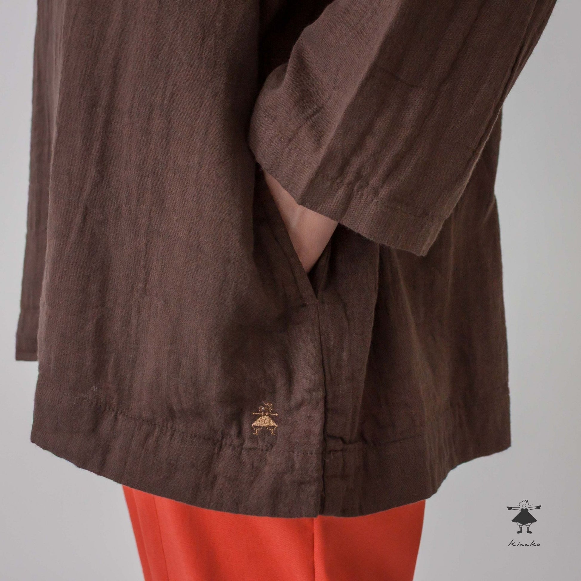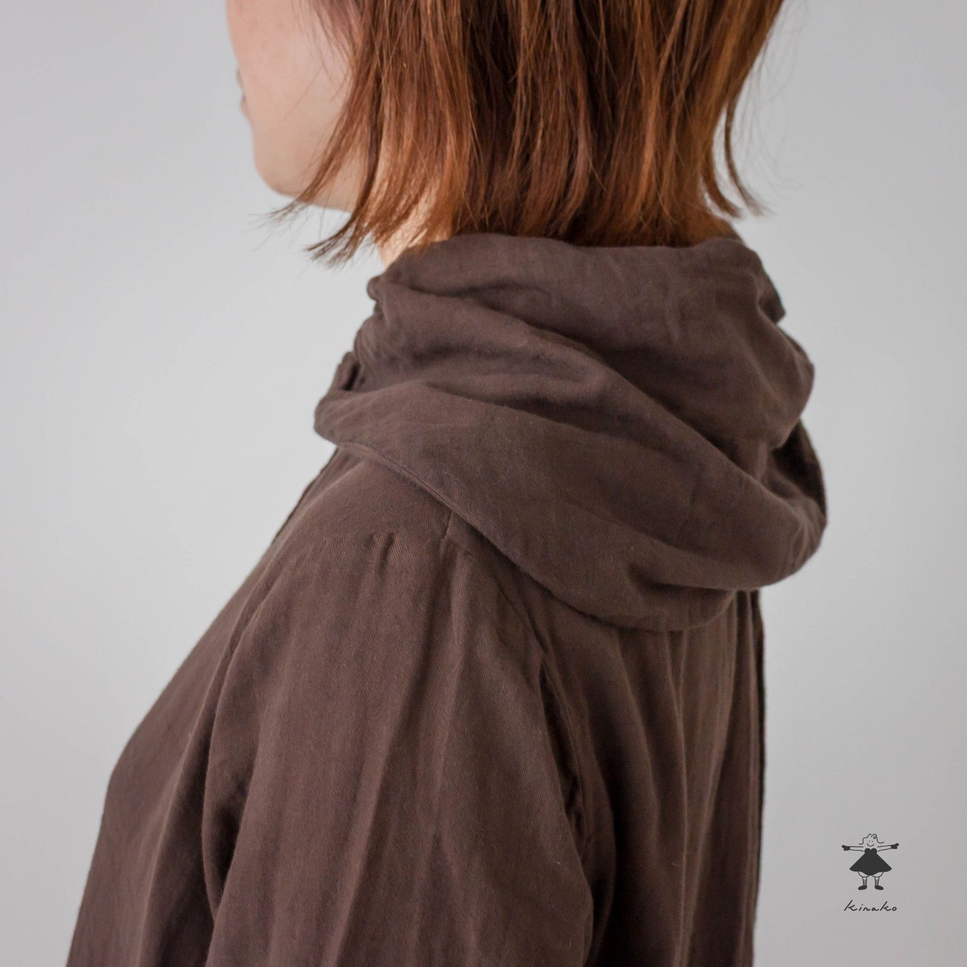 フードの様なボリュームのある衿元がポイントのプルオーバーです。前ボタンで着やすくヒップが隠れる着丈に仕上げました。左裾にきなこちゃん刺しゅう有り。