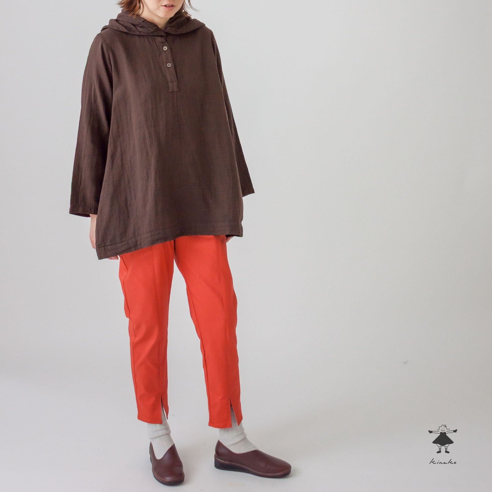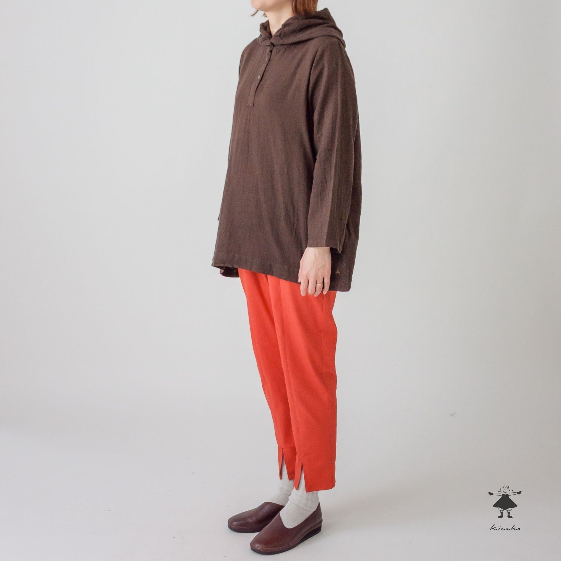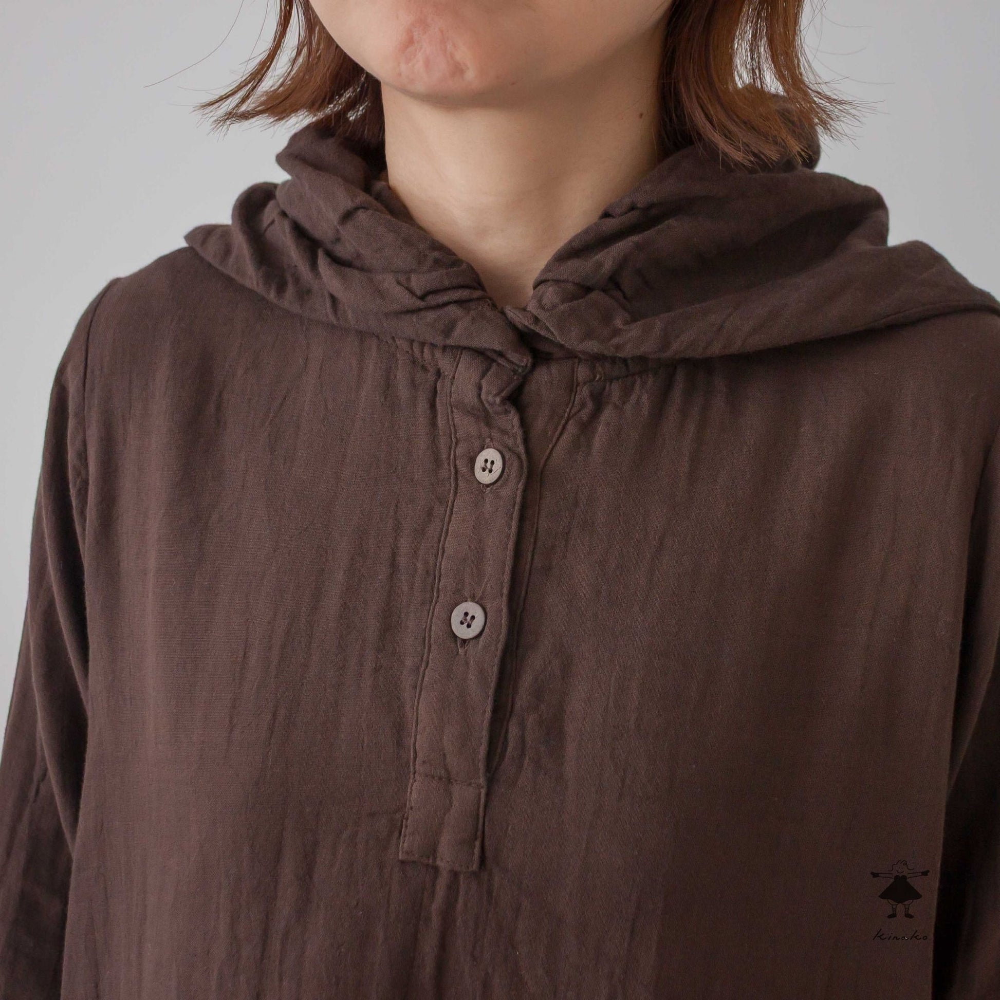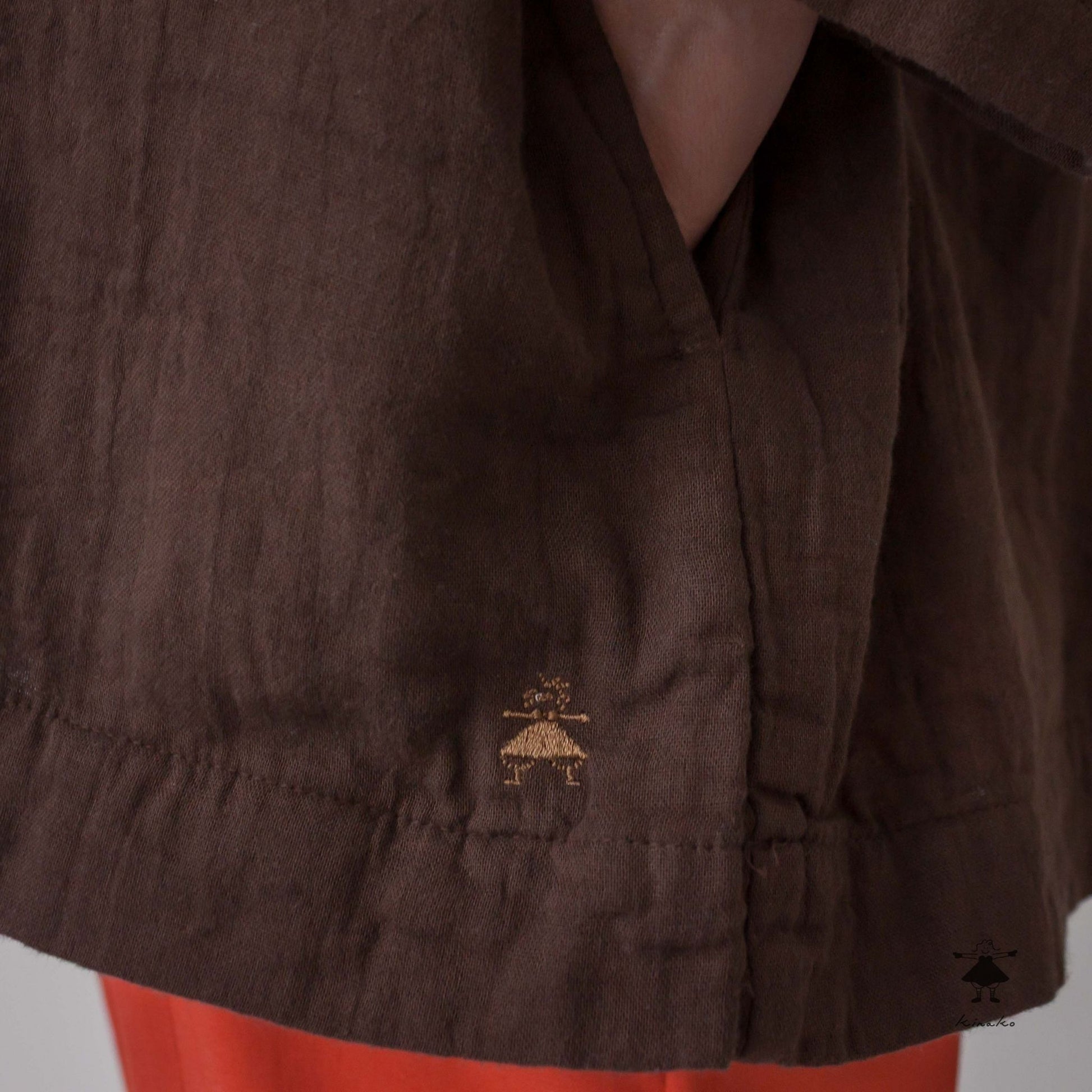 フードの様なボリュームのある衿元がポイントのプルオーバーです。前ボタンで着やすくヒップが隠れる着丈に仕上げました。左裾にきなこちゃん刺しゅう有り。