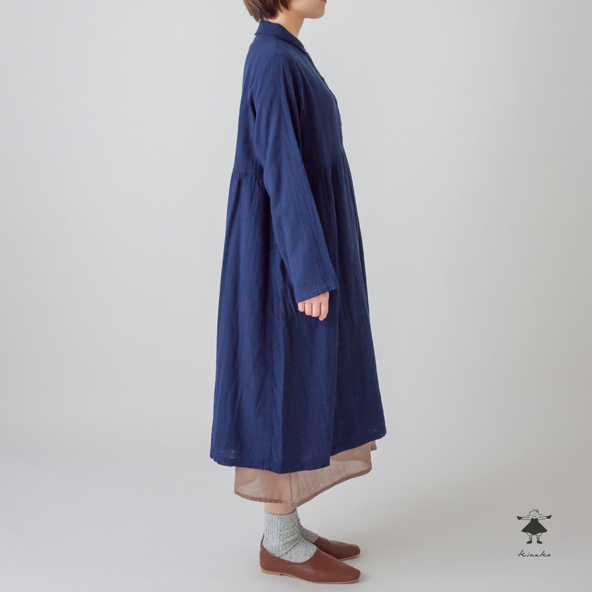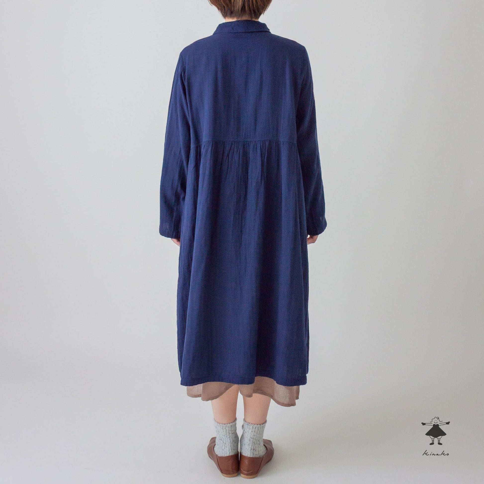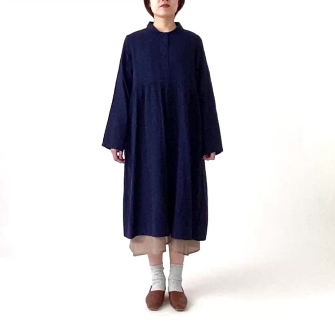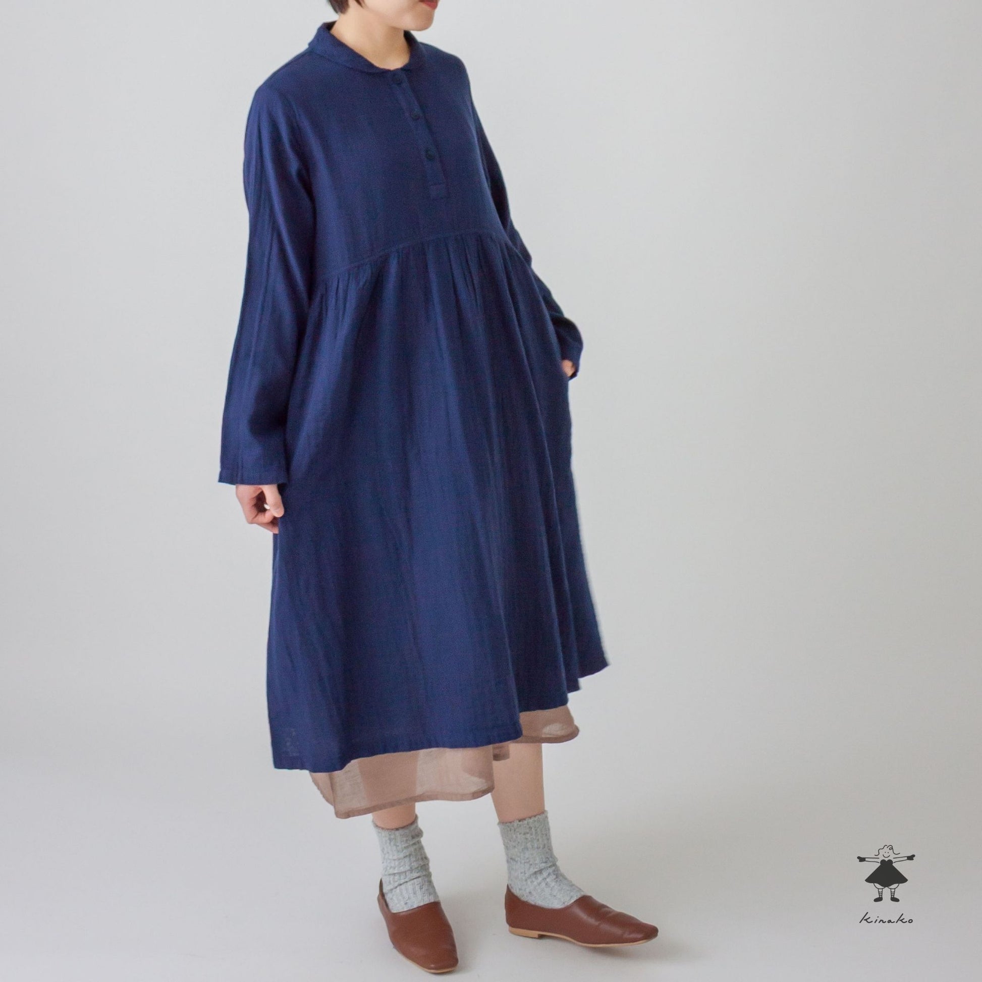 小さなショールカラーが特徴のワンピースです。衿に刺しゅう生地を使い、前ボタンで着やすい仕様にしました。