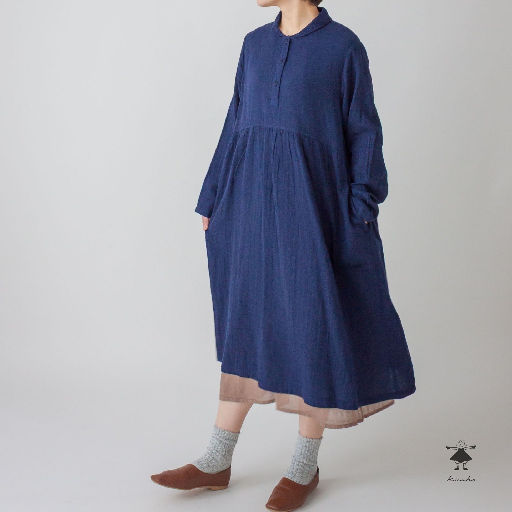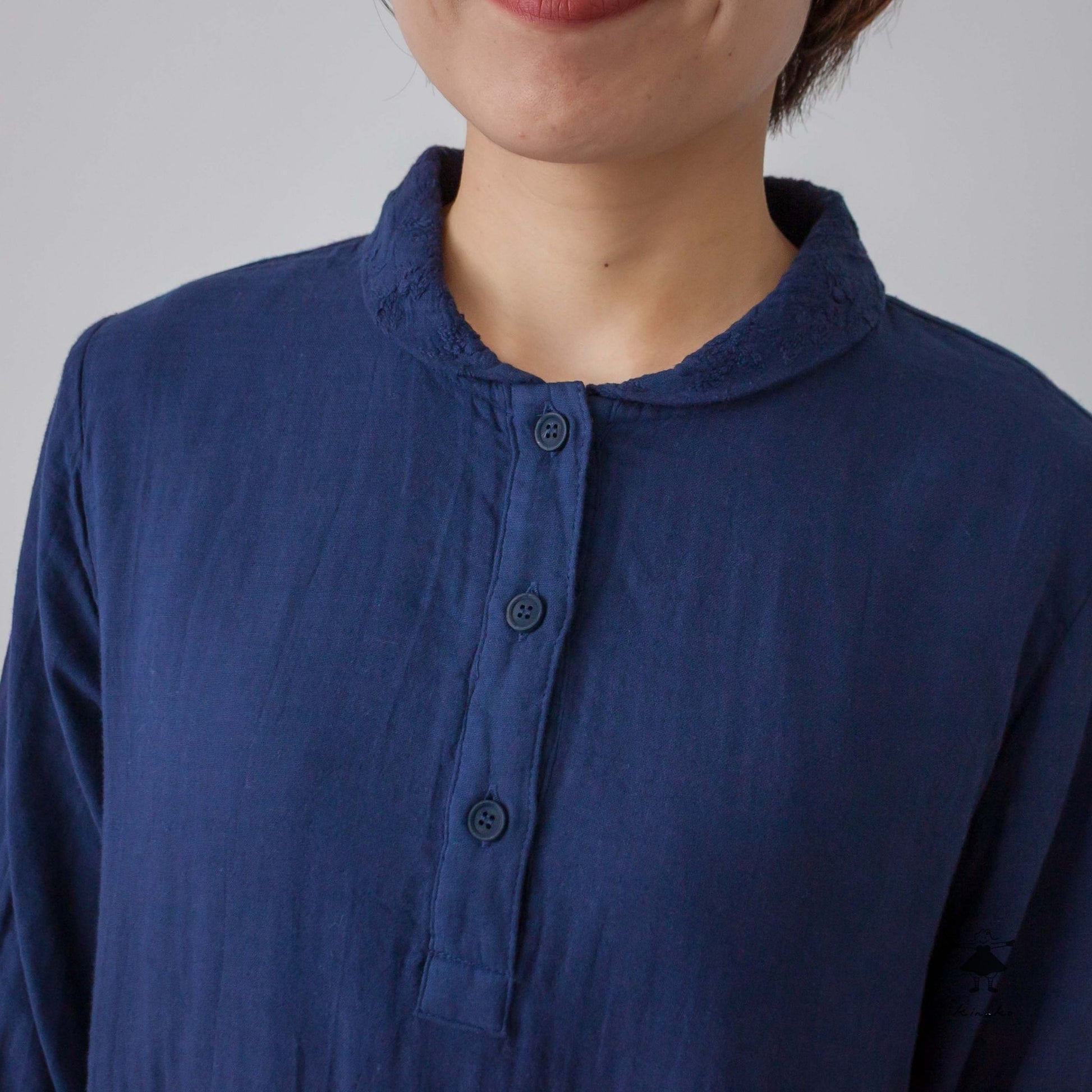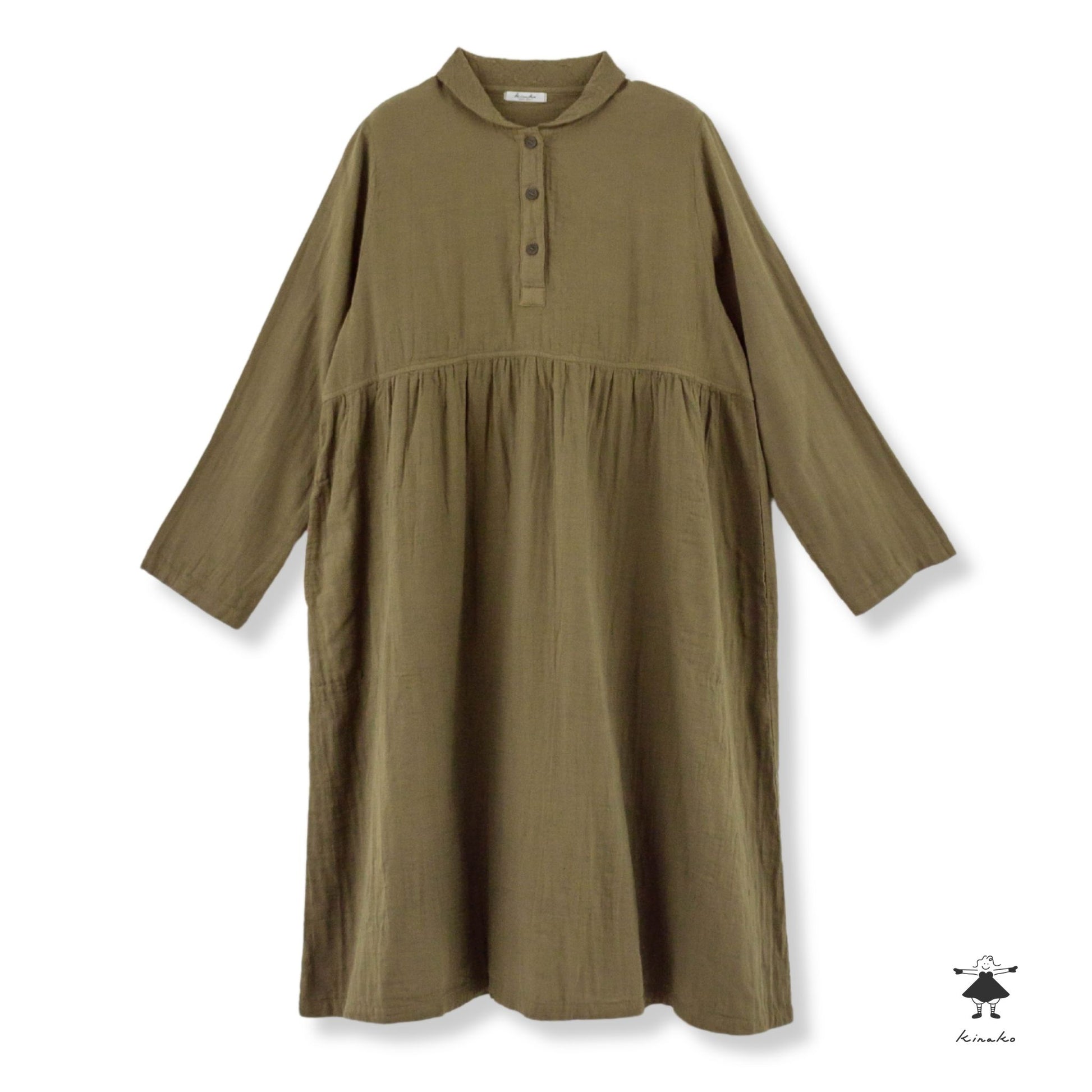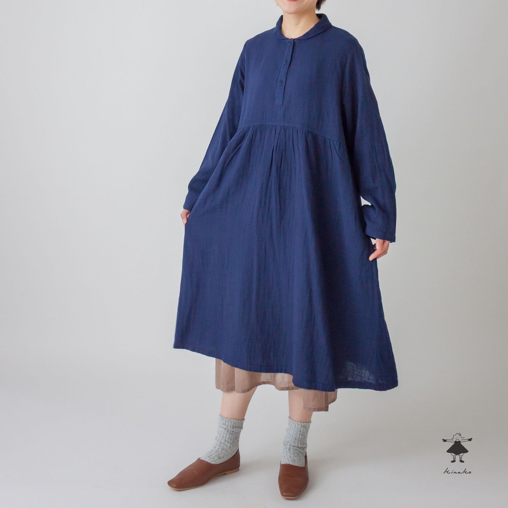 小さなショールカラーが特徴のワンピースです。衿に刺しゅう生地を使い、前ボタンで着やすい仕様にしました。
