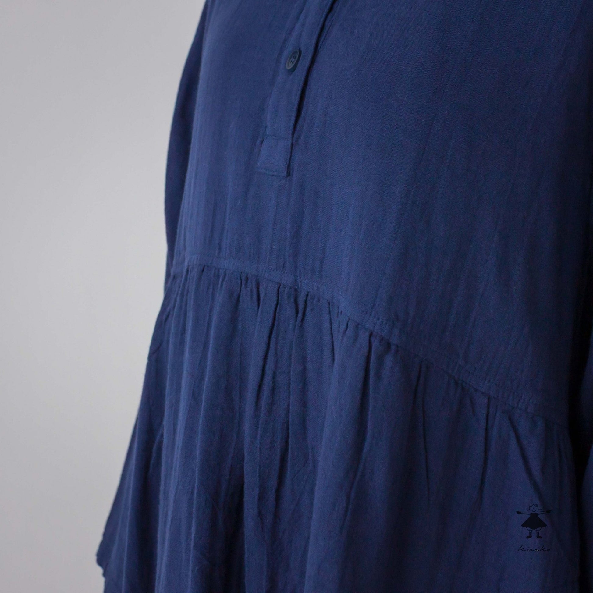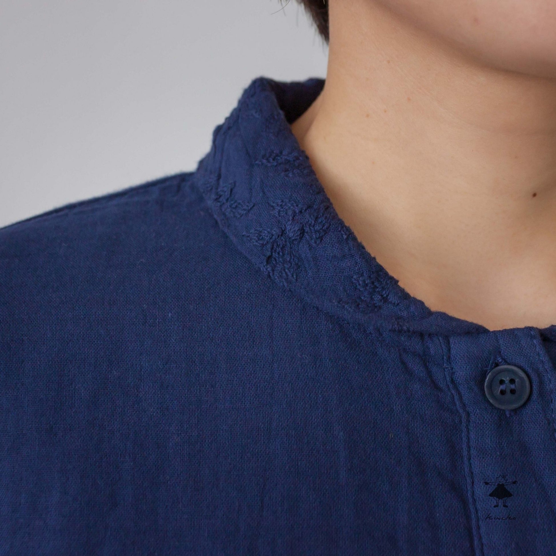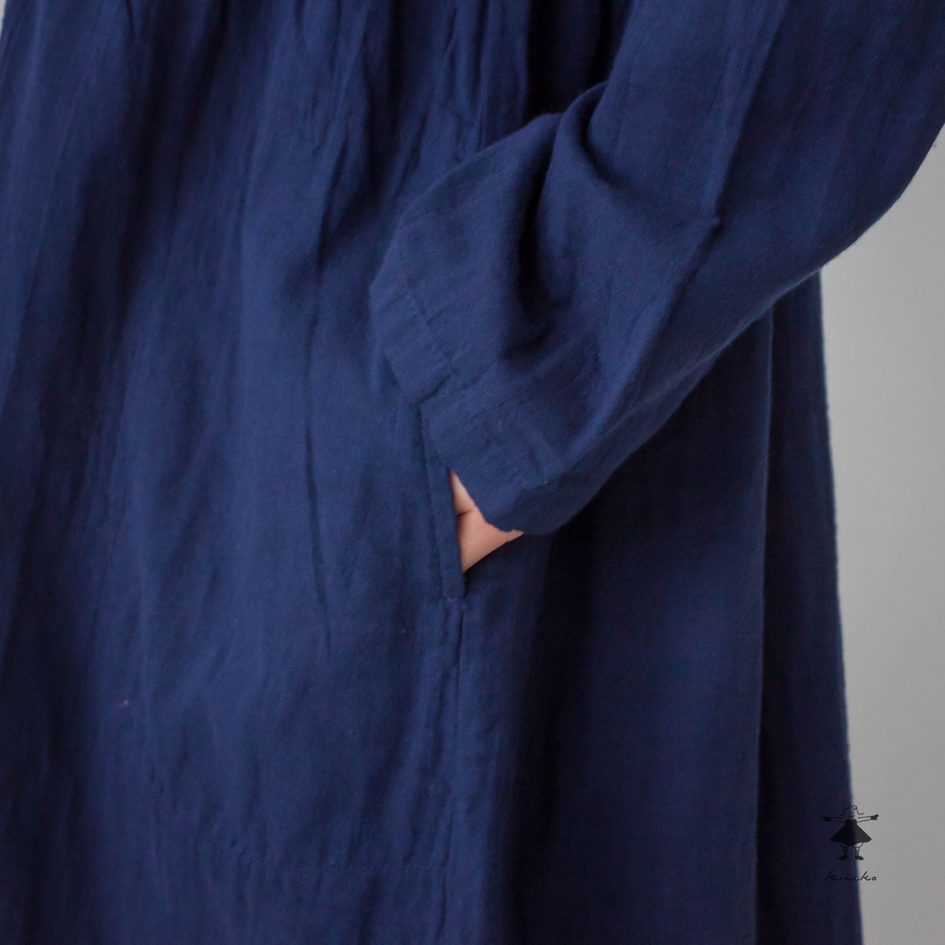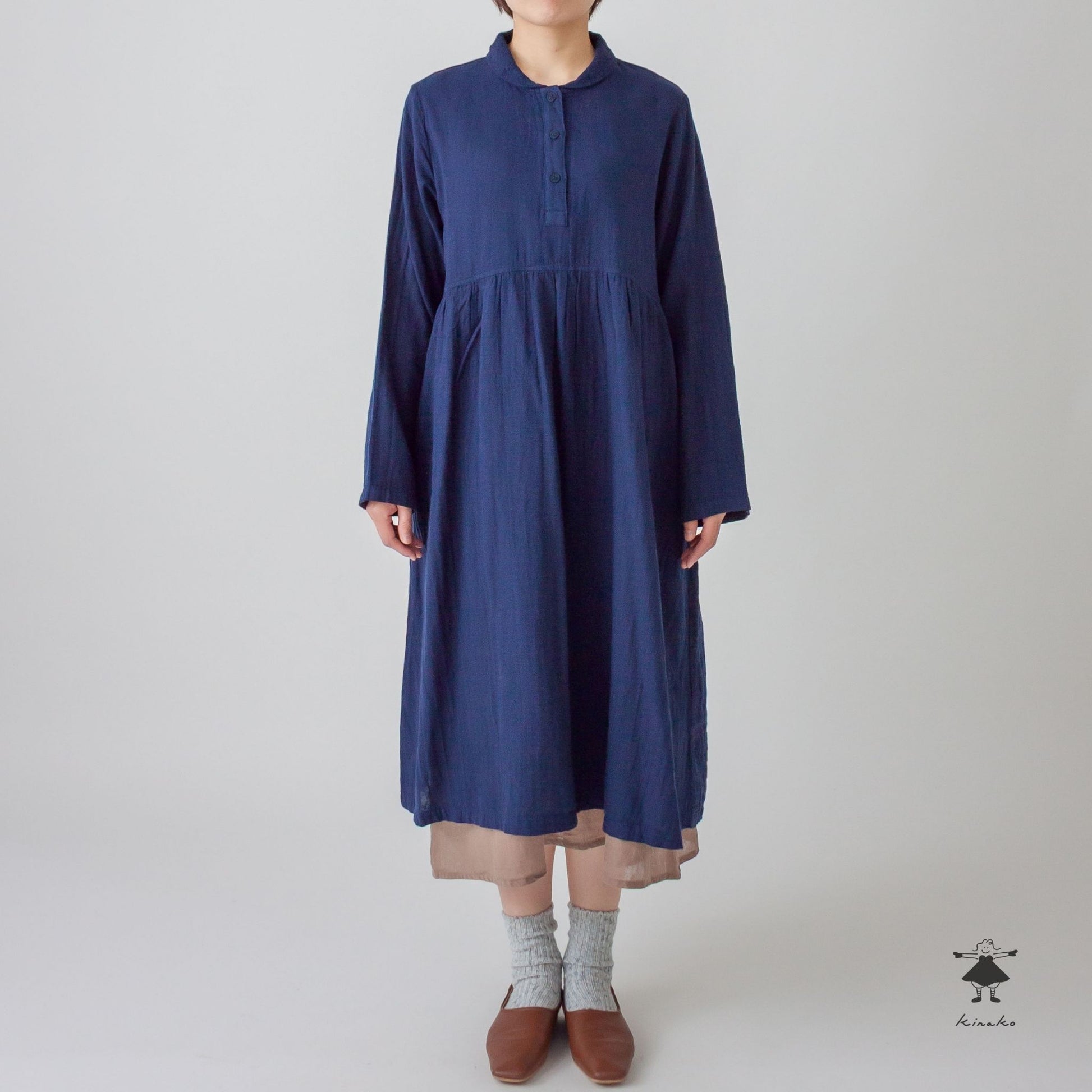 小さなショールカラーが特徴のワンピースです。衿に刺しゅう生地を使い、前ボタンで着やすい仕様にしました。