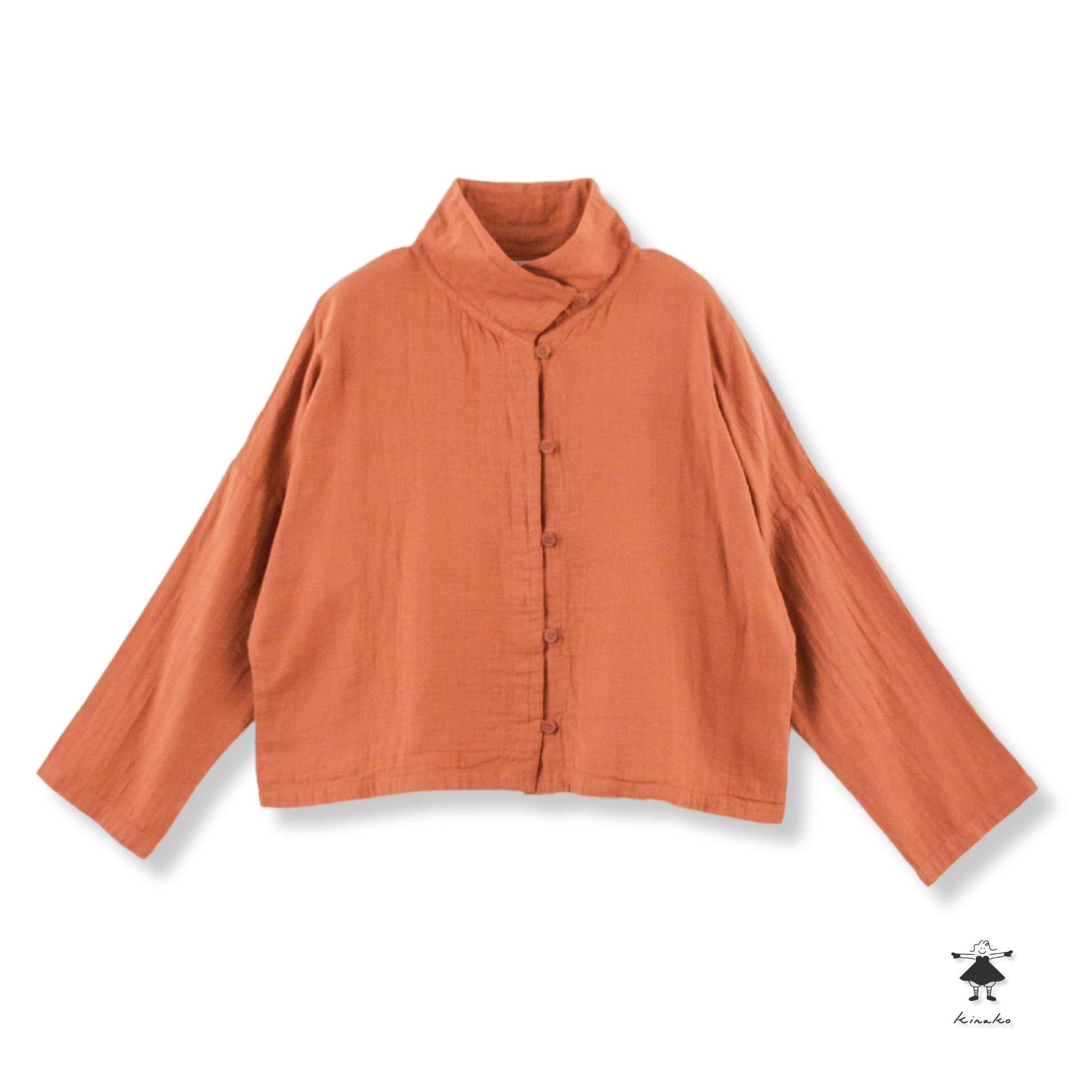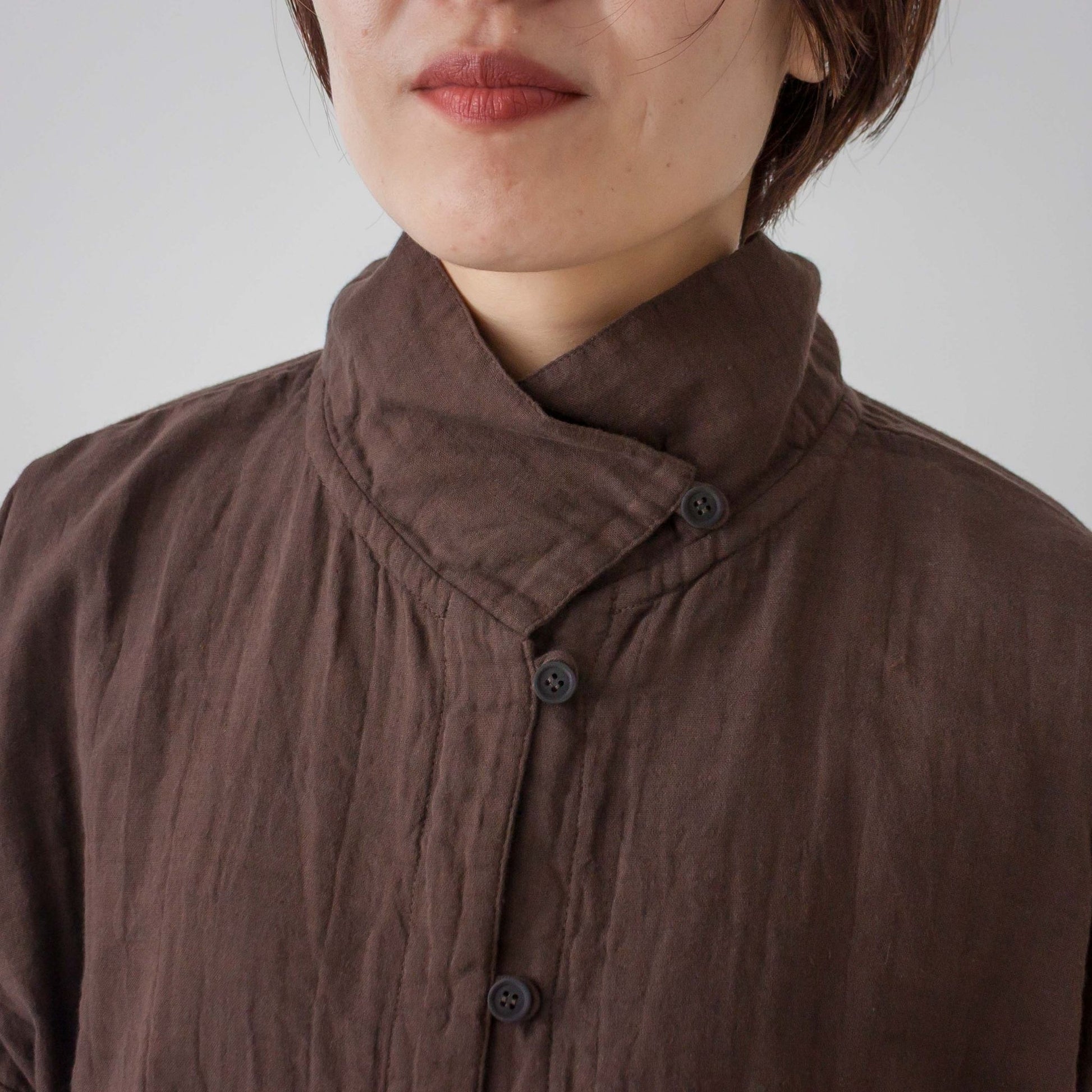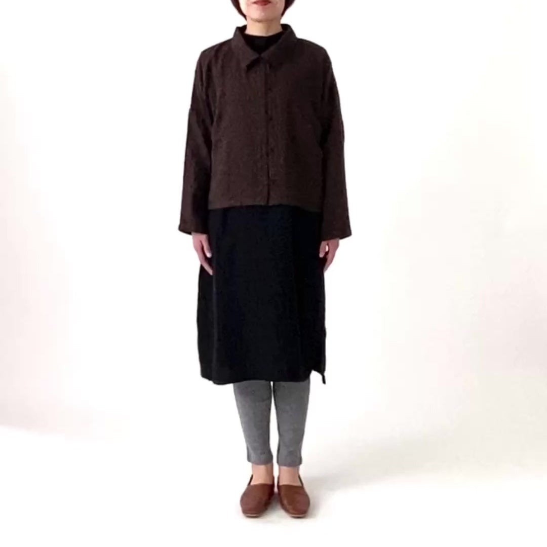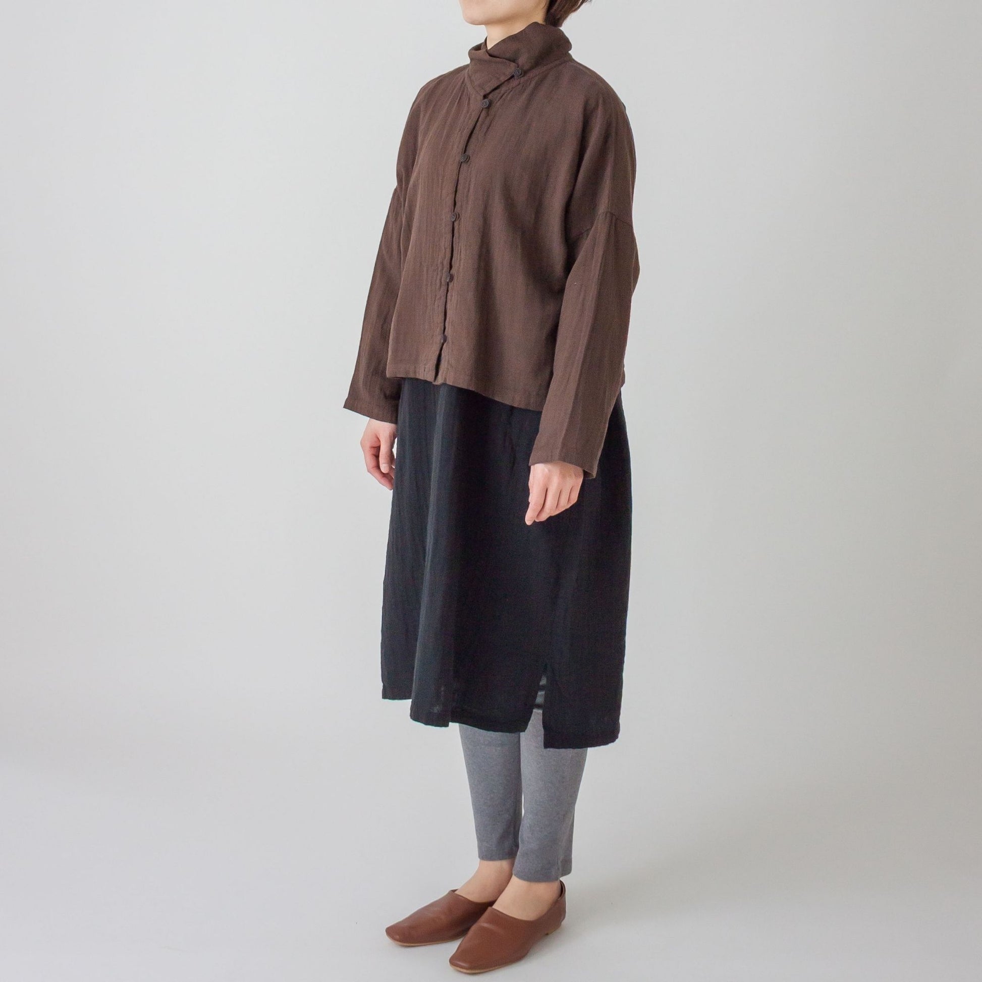 衿先に付けたボタンを留めるとハイネック風になる衿が特徴です。ボタンの開け閉めで衿の形を変えられます。ワンピースや着丈の長いものとコーディネイトしやすい様にショート丈に仕上げました。
