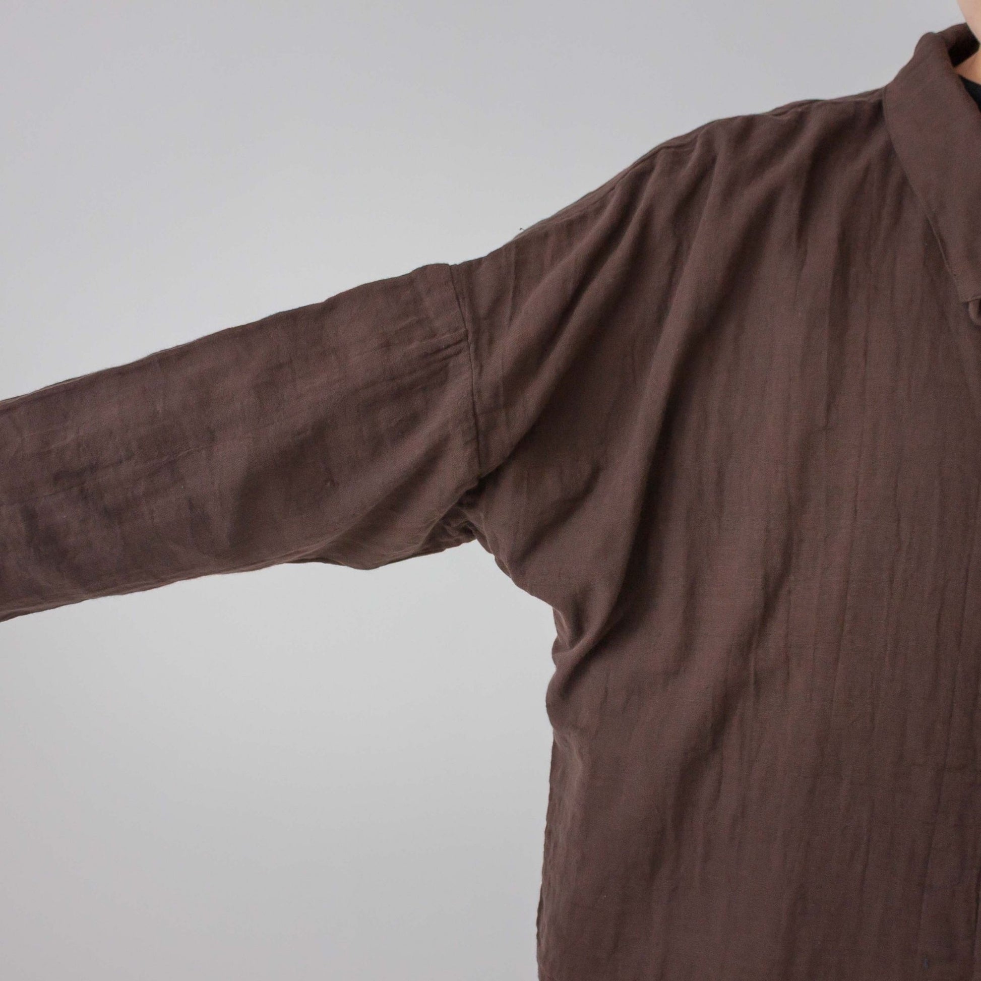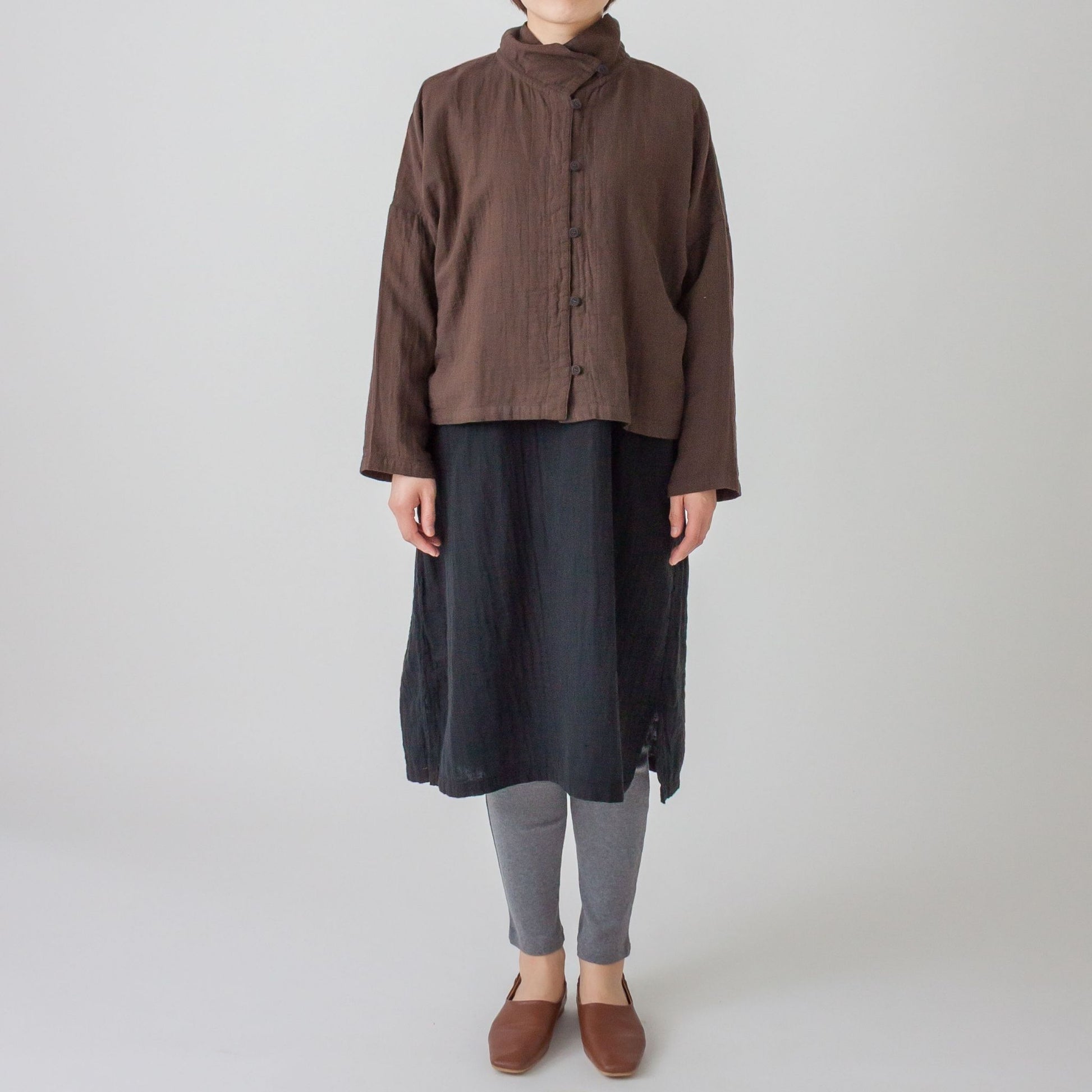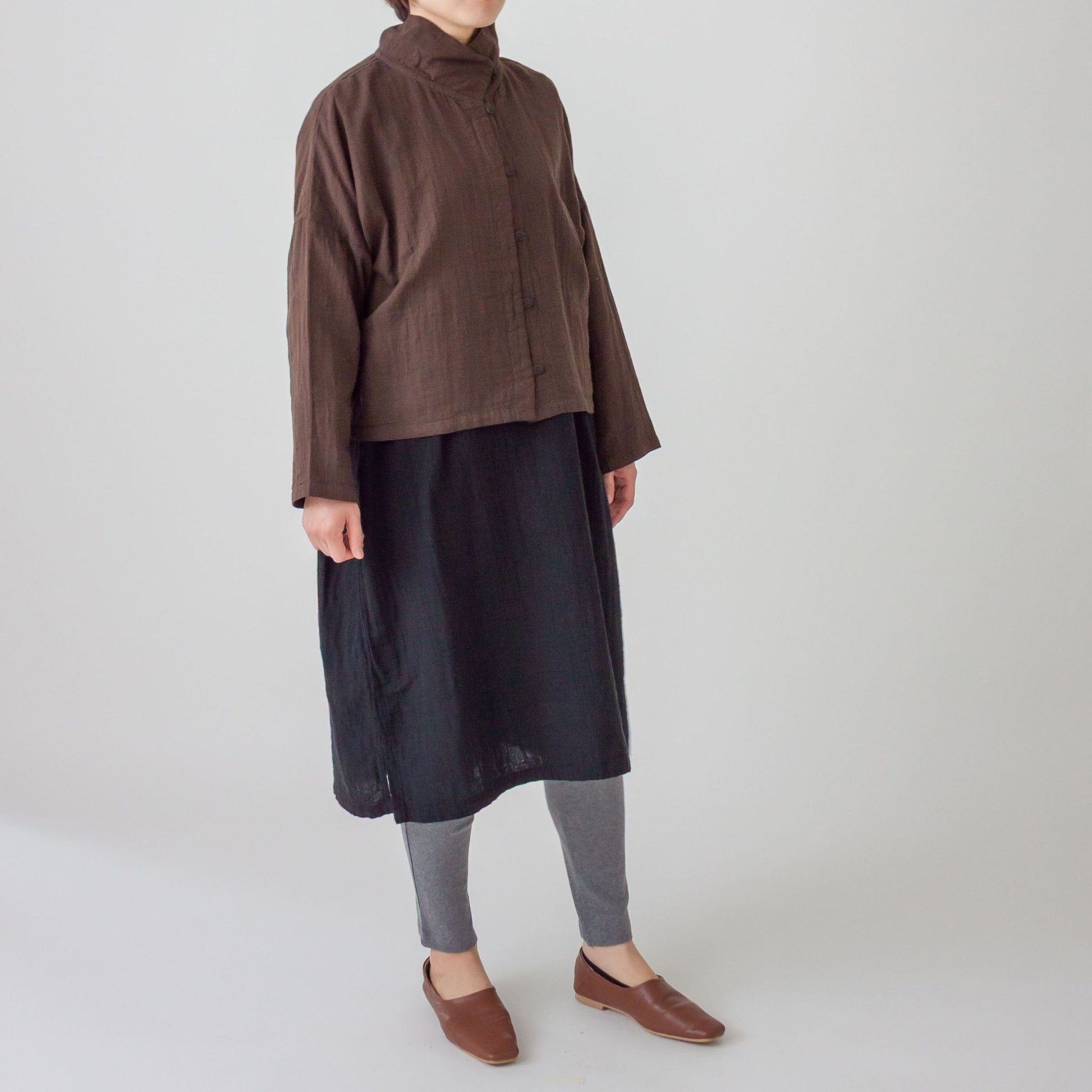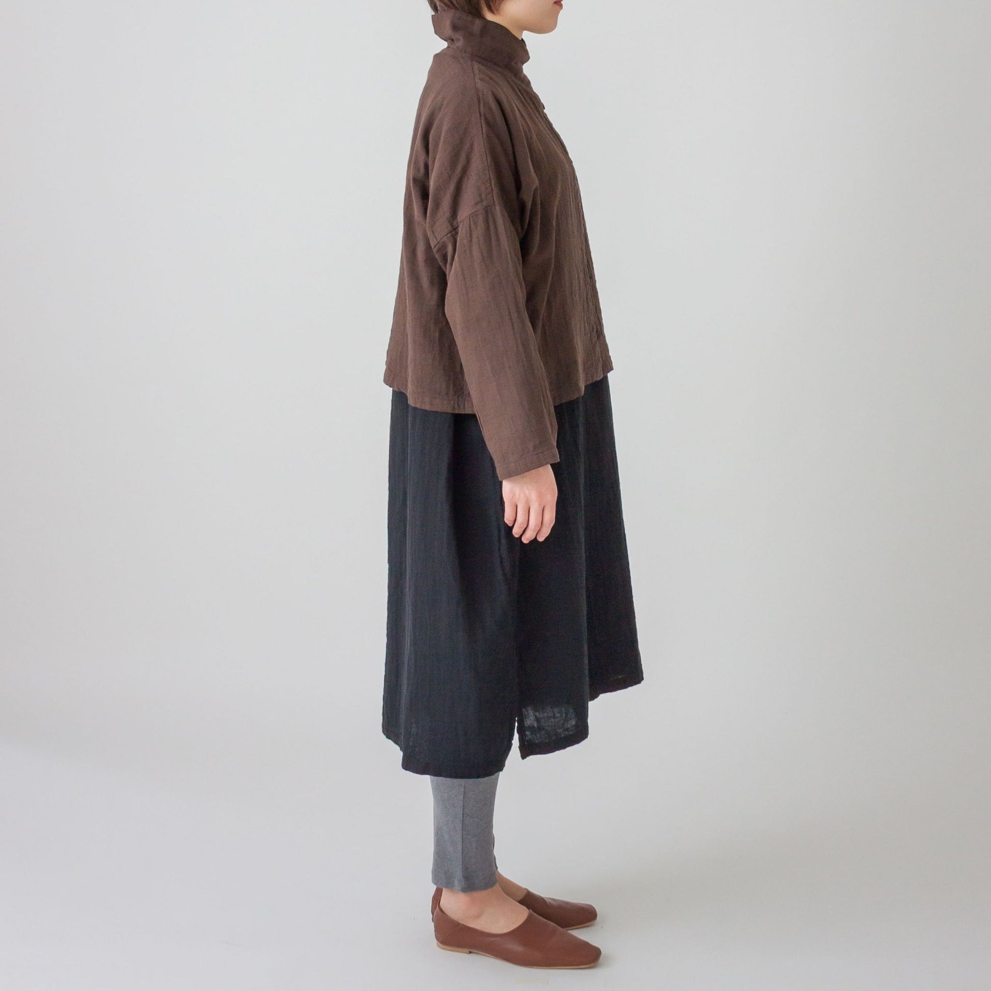 衿先に付けたボタンを留めるとハイネック風になる衿が特徴です。ボタンの開け閉めで衿の形を変えられます。ワンピースや着丈の長いものとコーディネイトしやすい様にショート丈に仕上げました。