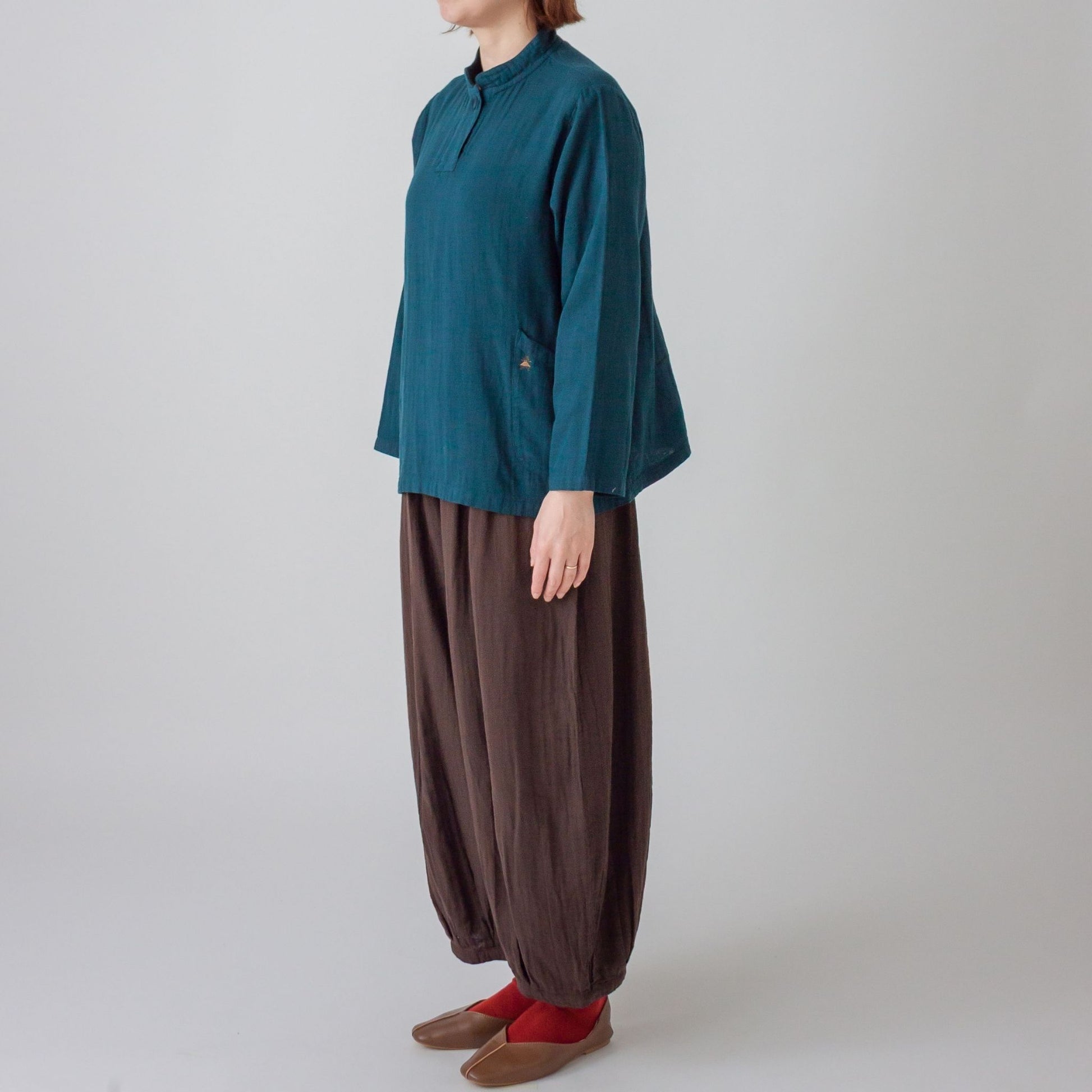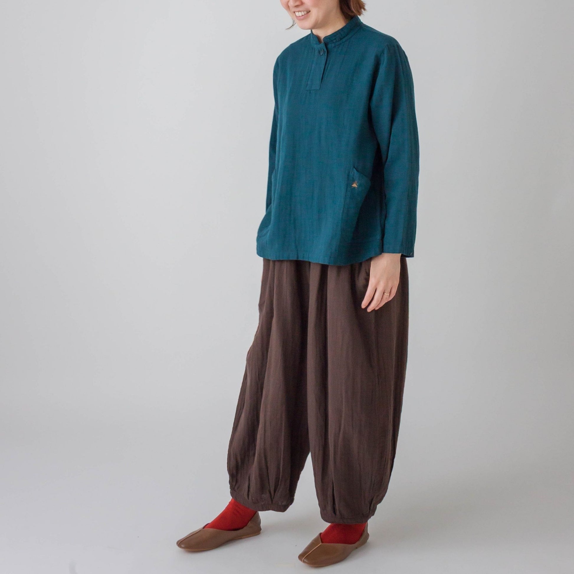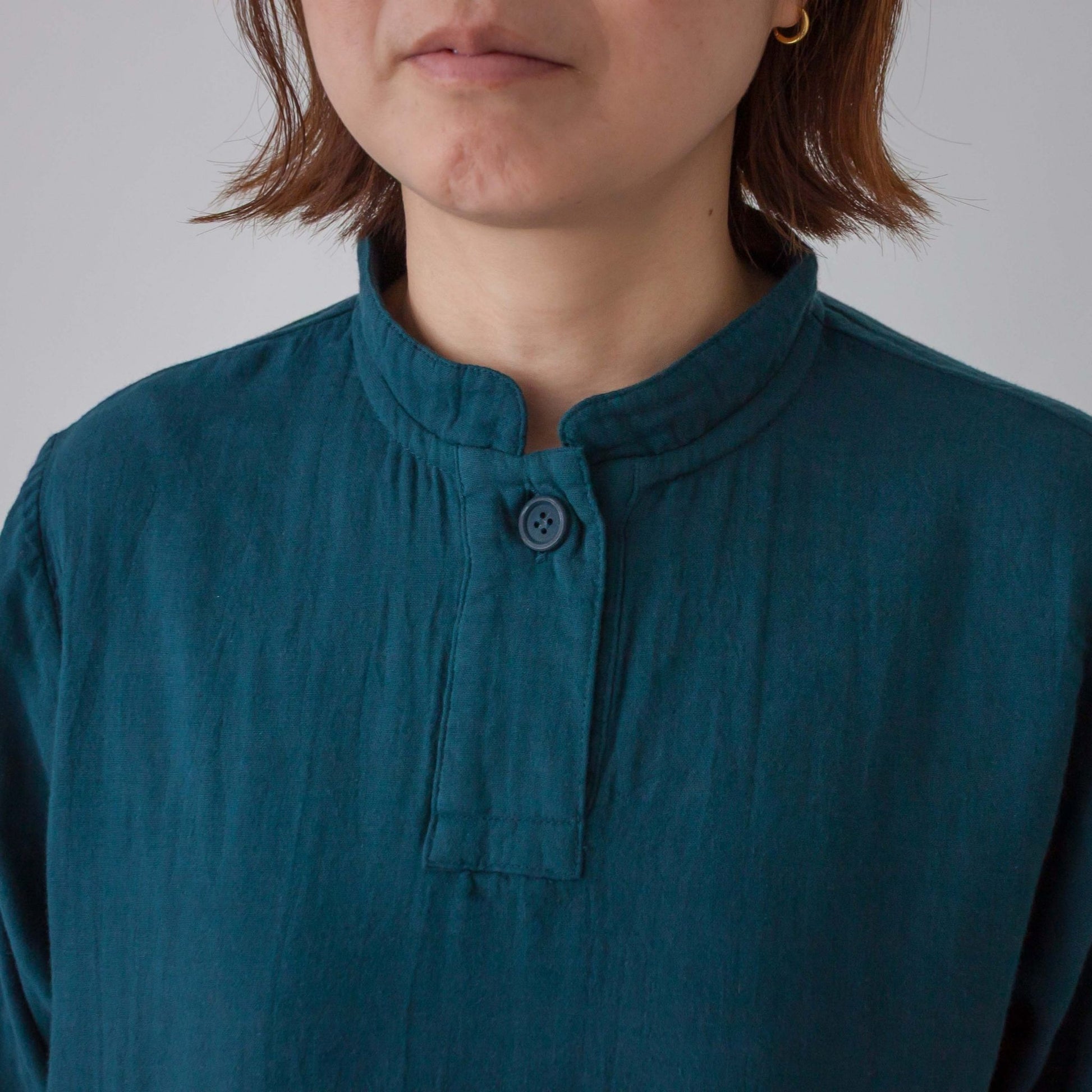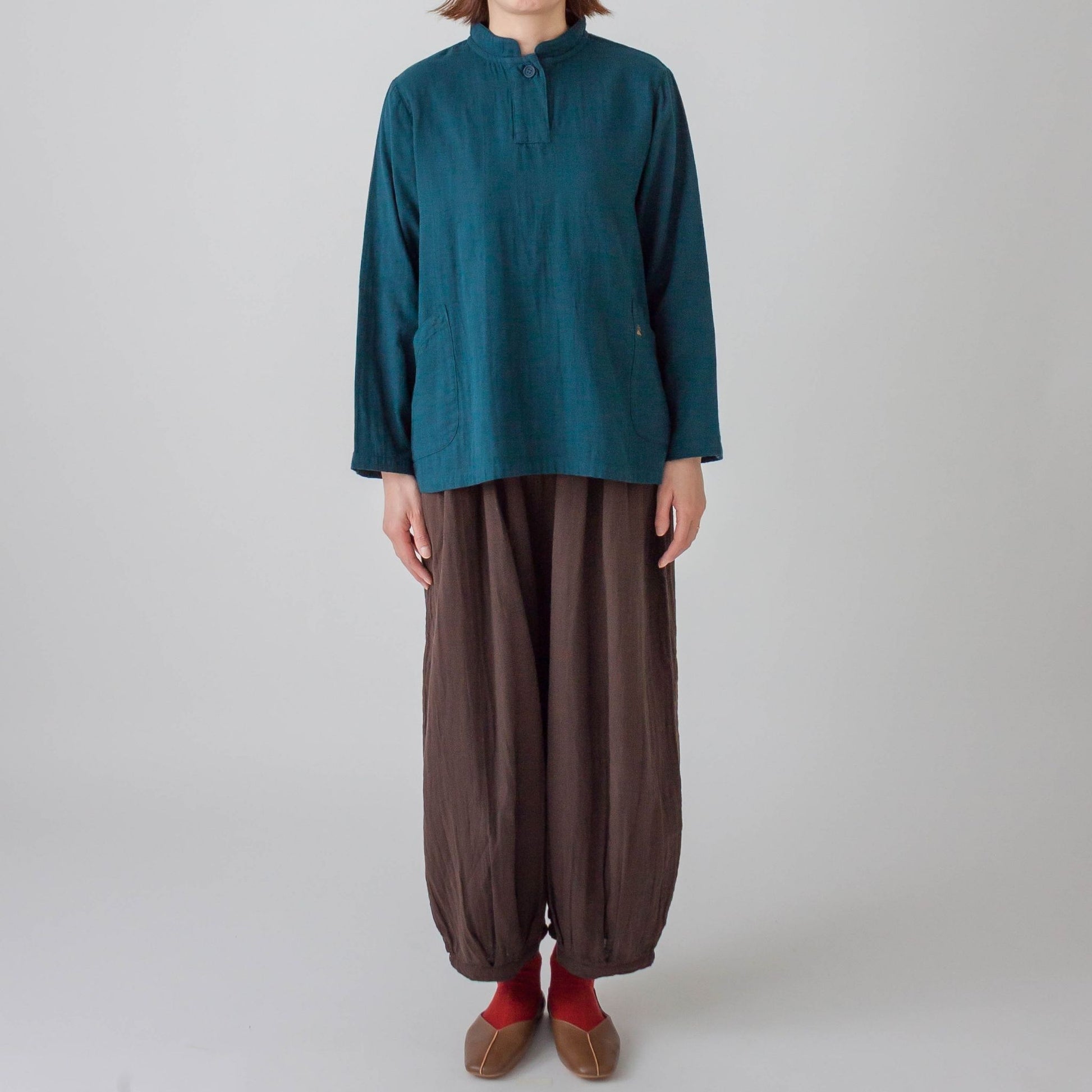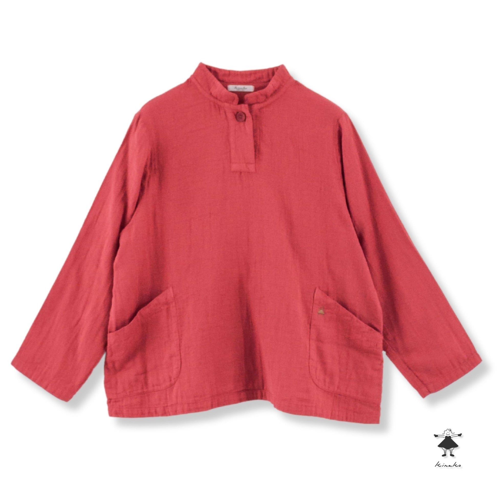 少し立ち上がった衿と大きめのボタンが特徴のプルオーバーです。合わせやすい着丈で色々なシルエットのボトムスとコーディネイトして頂けます。左ポケット部分にきなこちゃん刺しゅう有り。