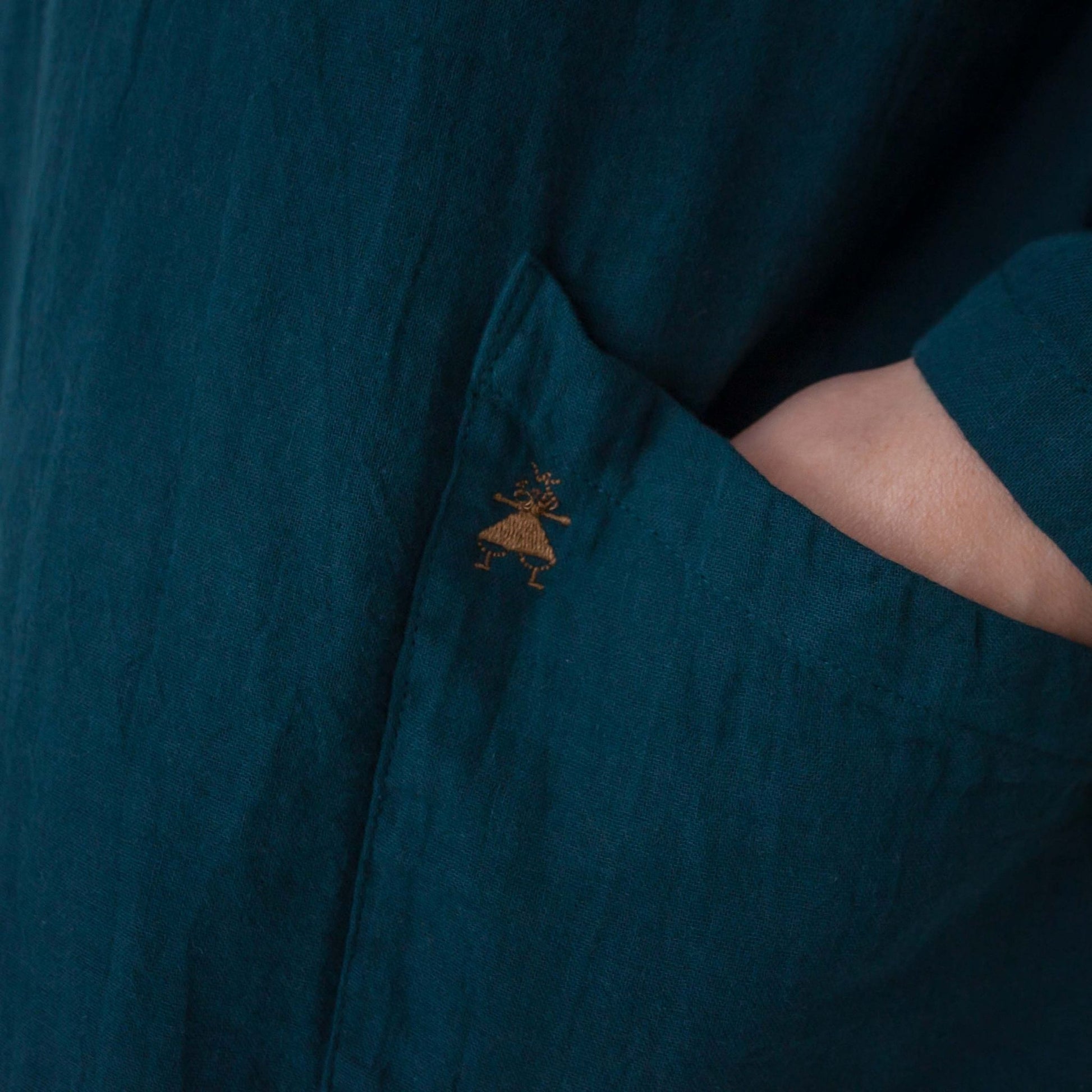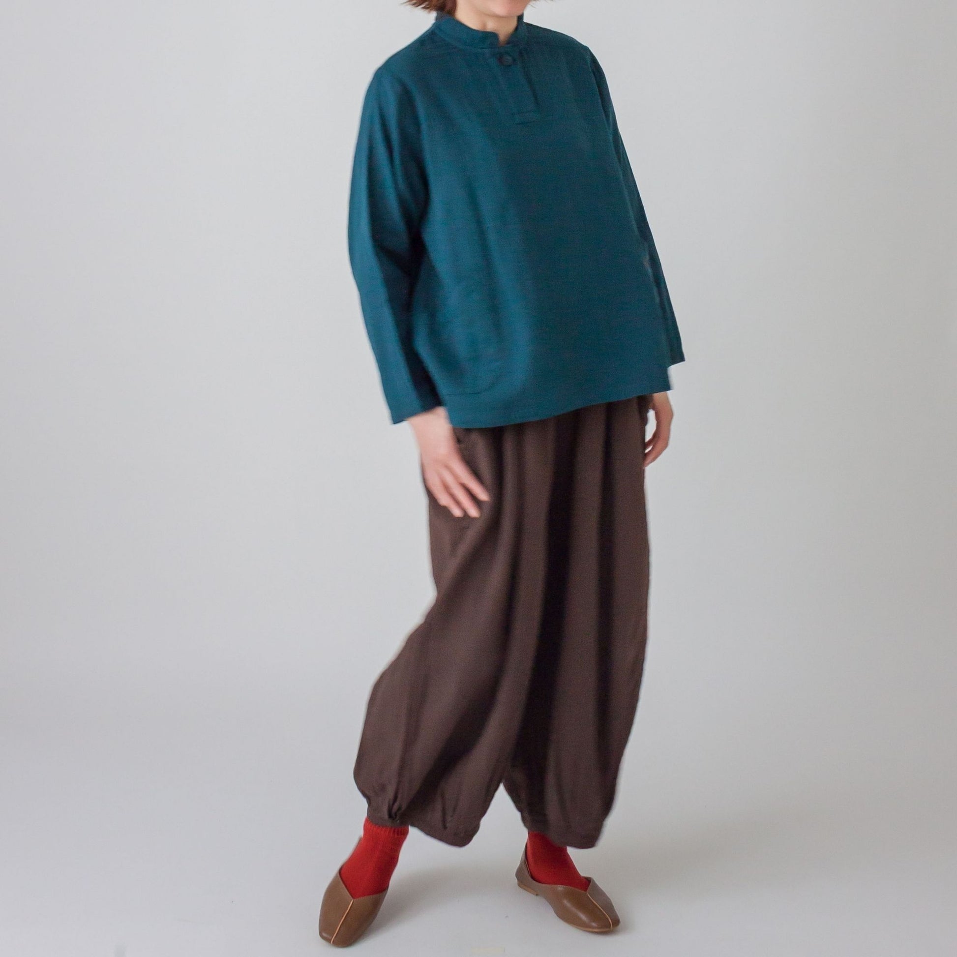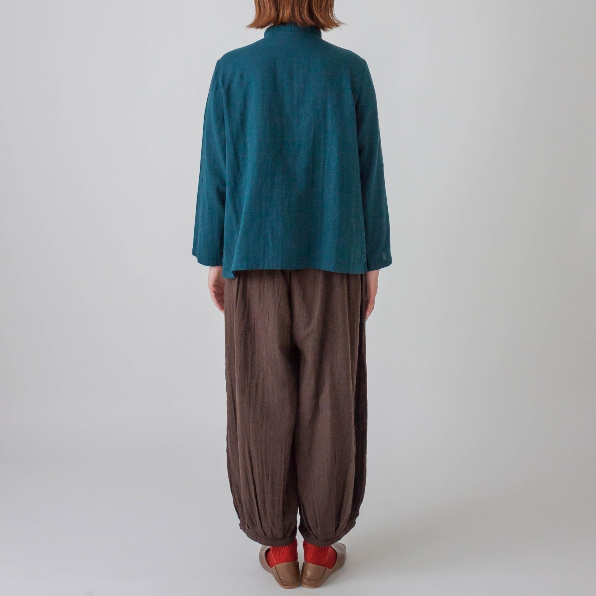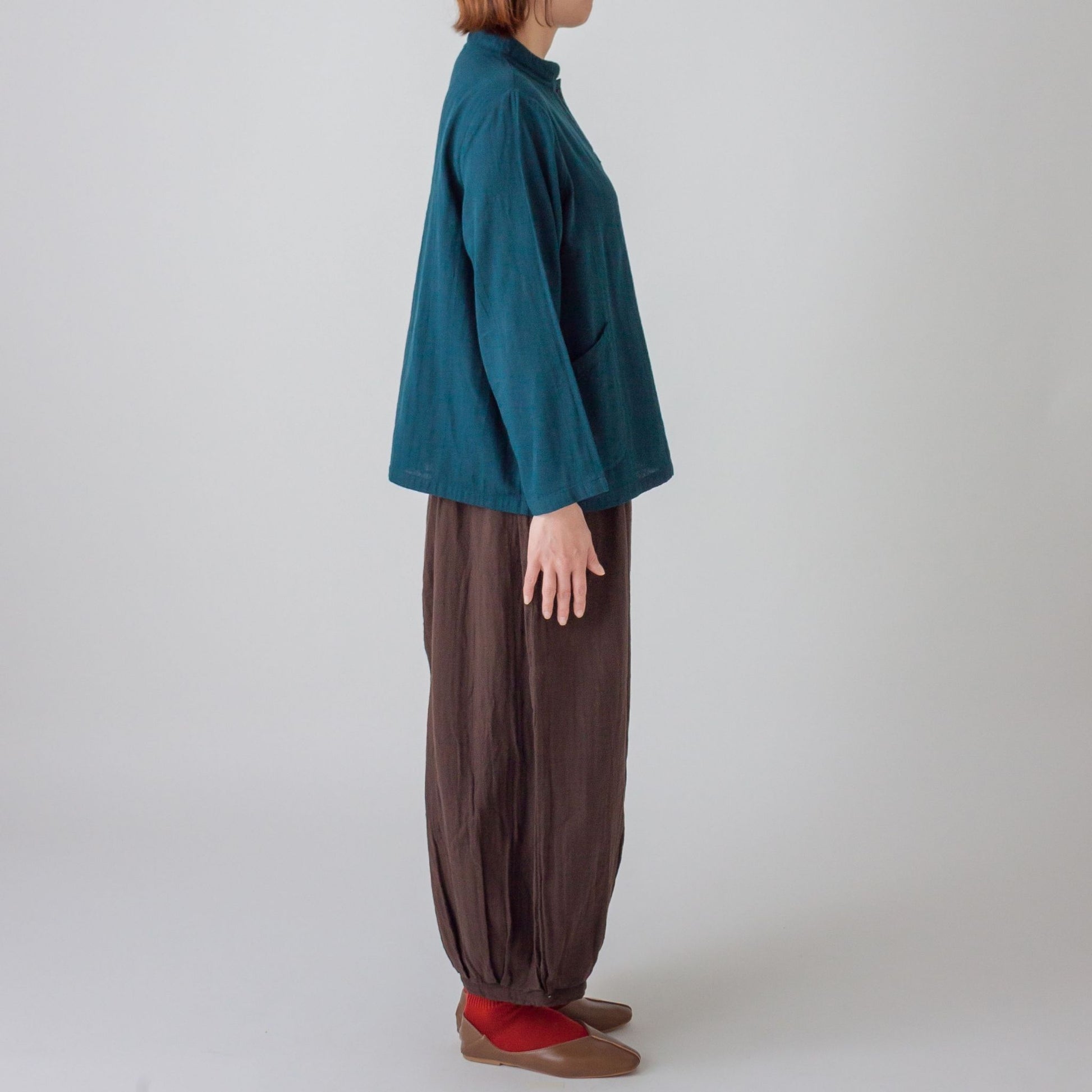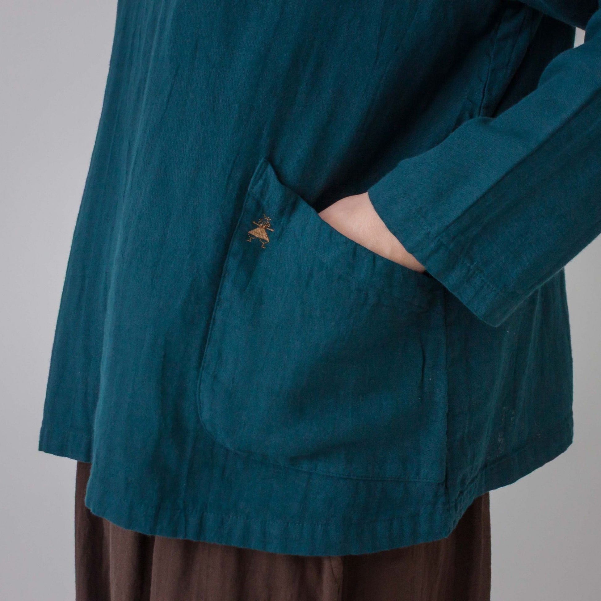 少し立ち上がった衿と大きめのボタンが特徴のプルオーバーです。合わせやすい着丈で色々なシルエットのボトムスとコーディネイトして頂けます。左ポケット部分にきなこちゃん刺しゅう有り。