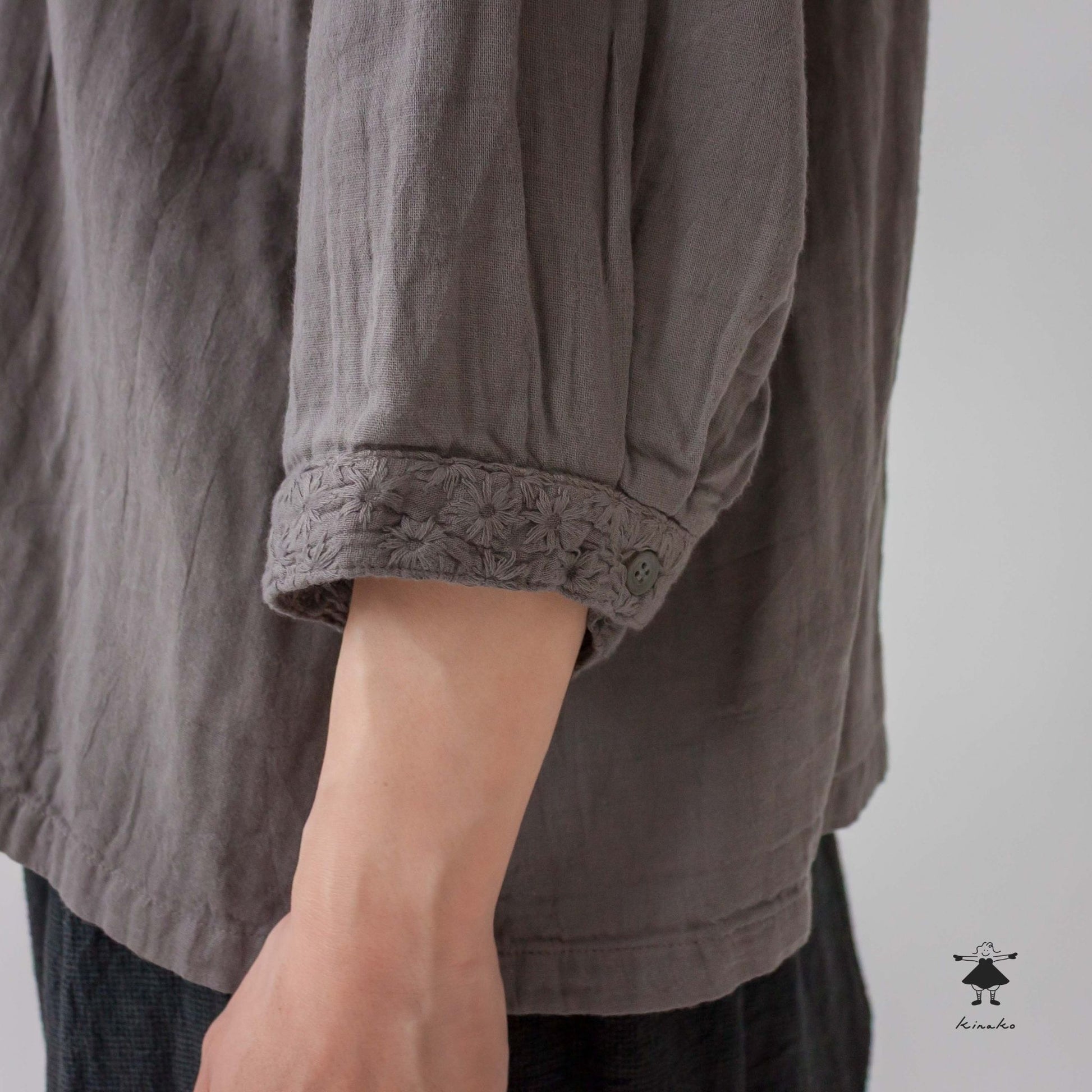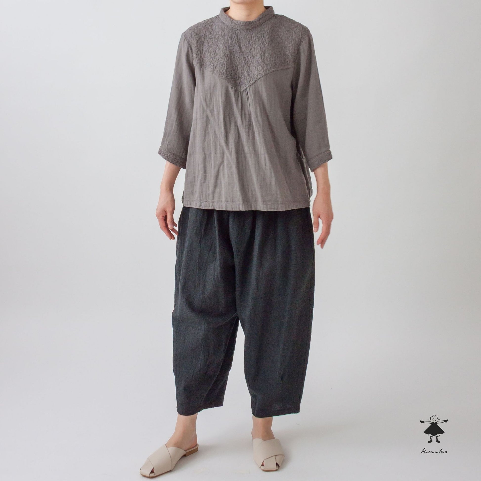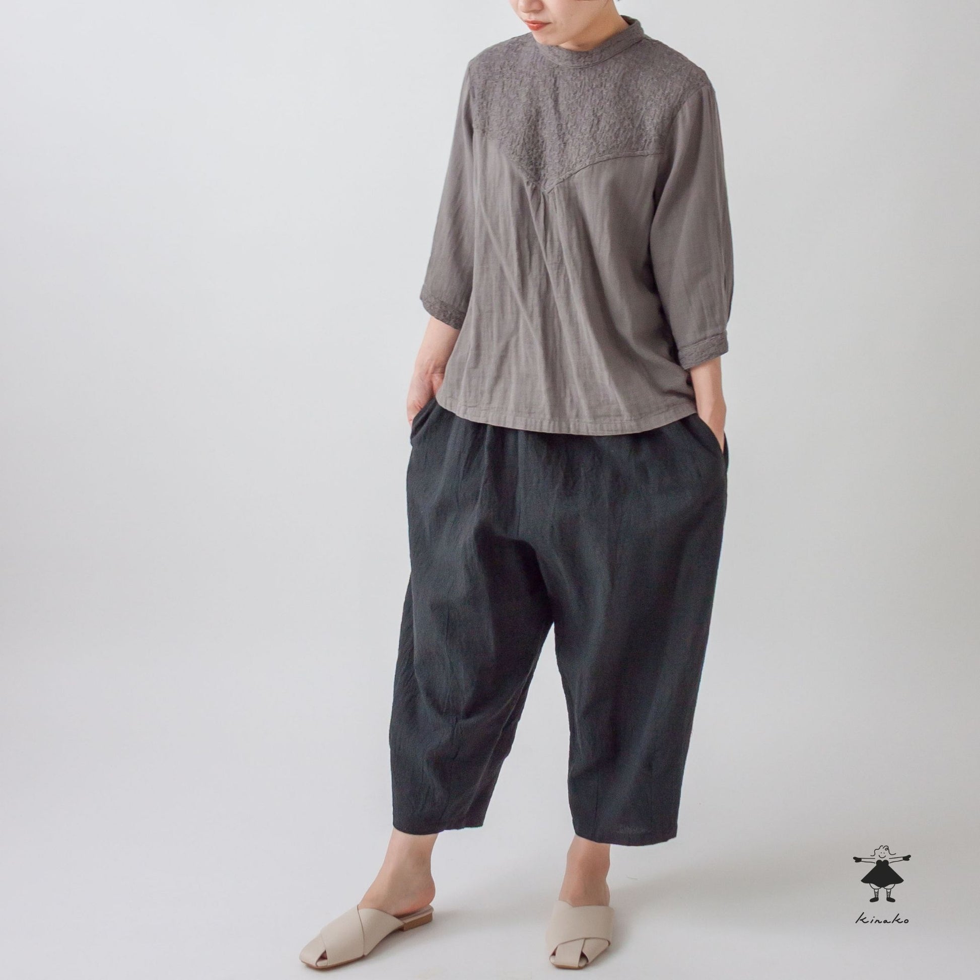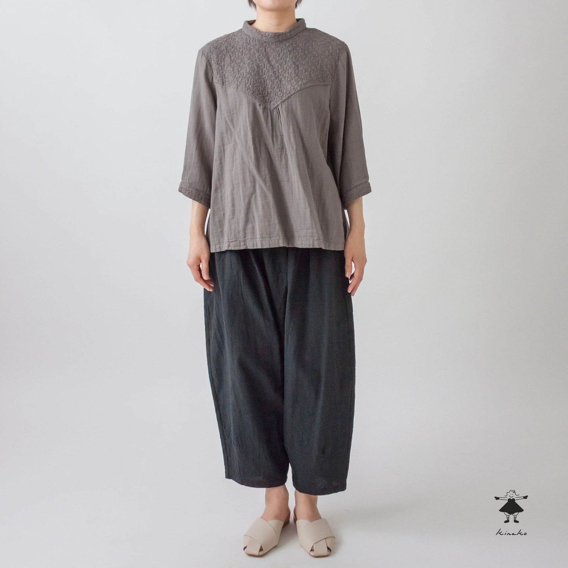 kinakoが使うWガーゼ生地に刺しゅう加工を加え、衿、袖口、胸切替部分に使ったプルオーバです。胸元の切替ラインが特徴で、ボリュームのあるボトムと相性の良い着丈にしました。