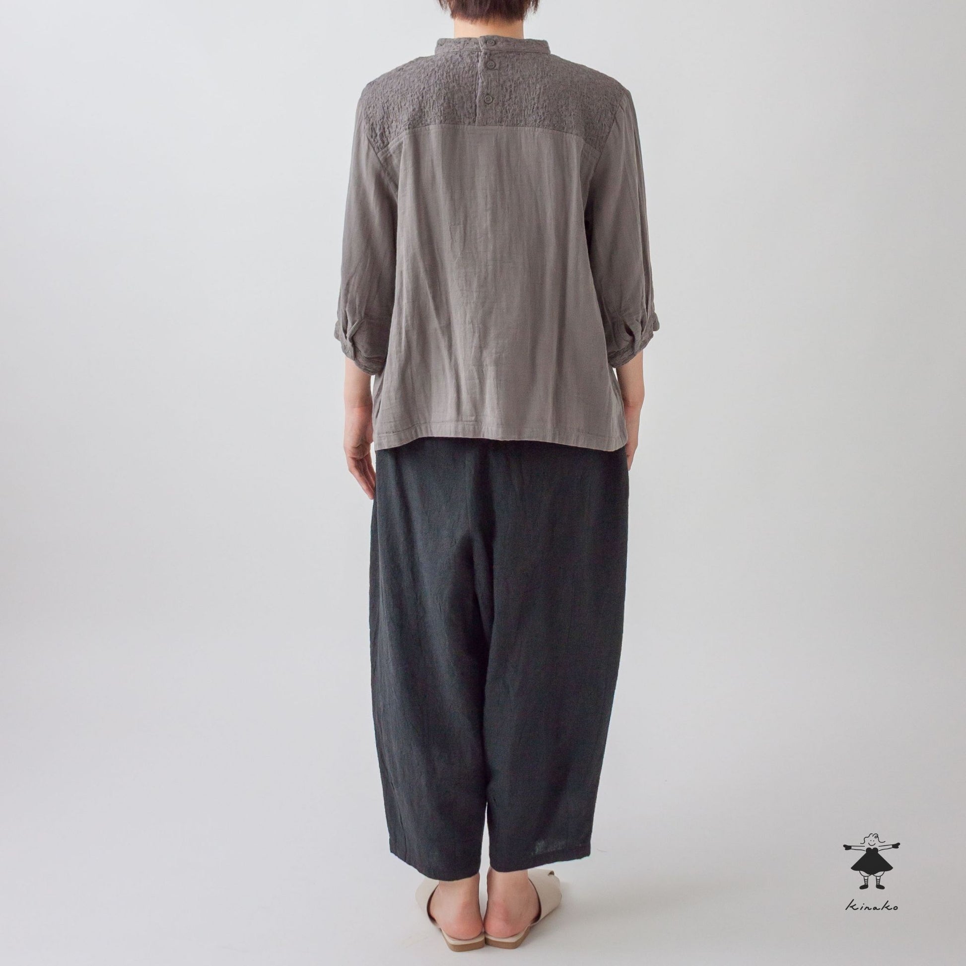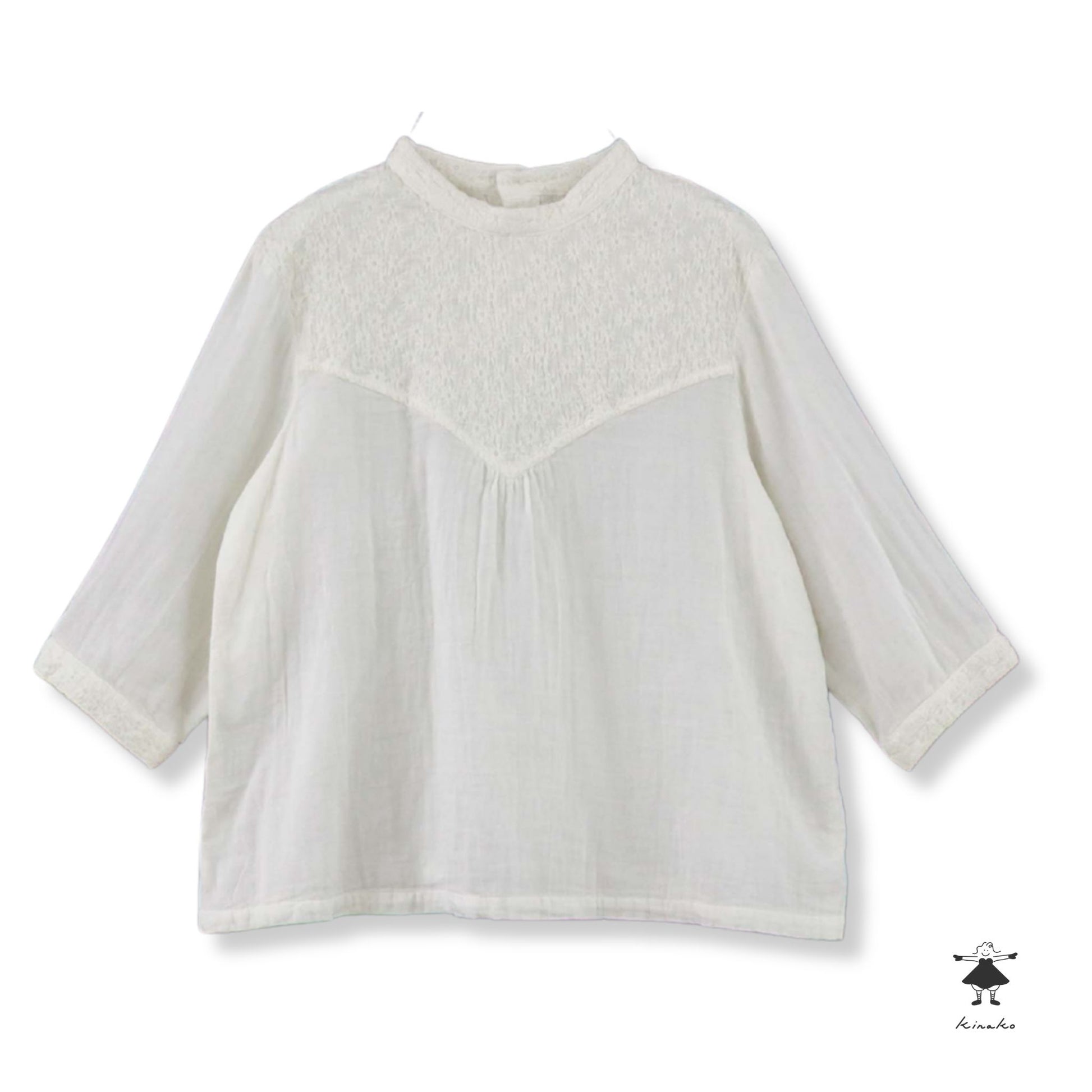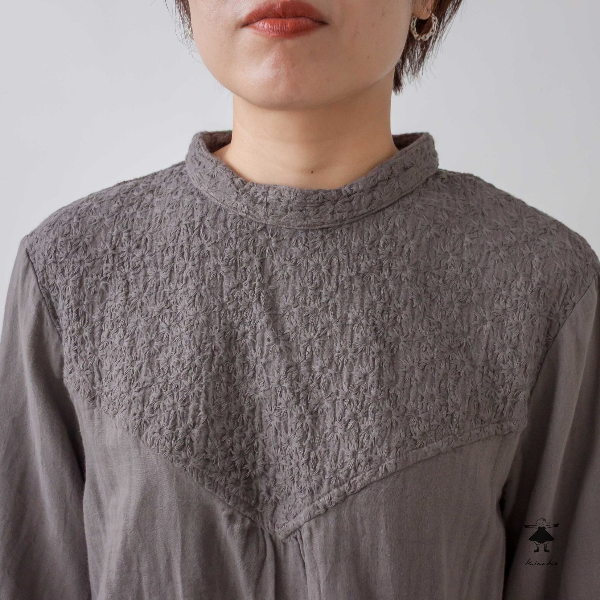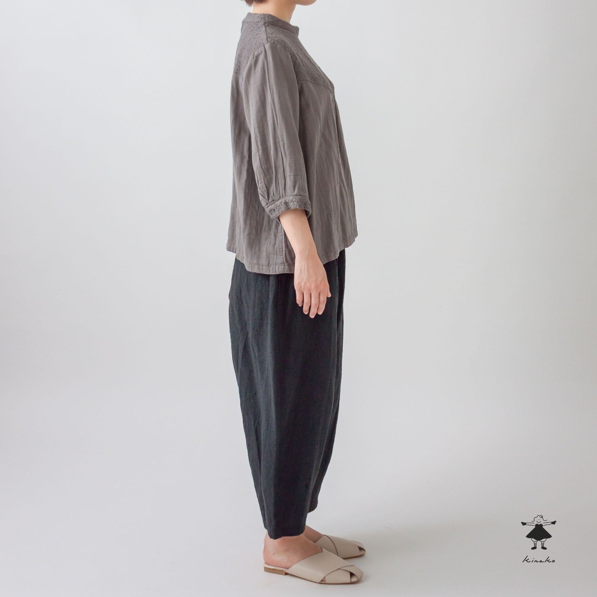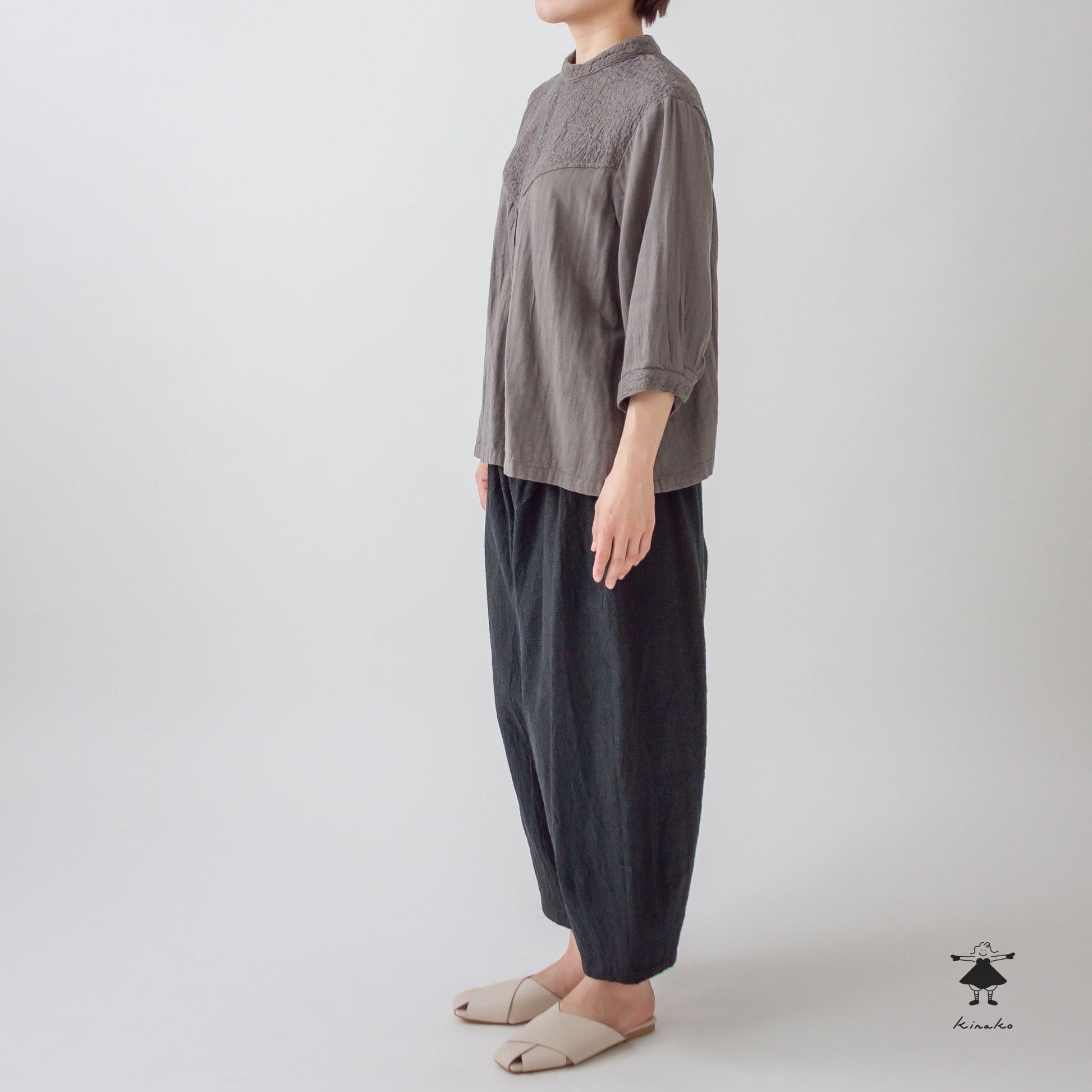 kinakoが使うWガーゼ生地に刺しゅう加工を加え、衿、袖口、胸切替部分に使ったプルオーバです。胸元の切替ラインが特徴で、ボリュームのあるボトムと相性の良い着丈にしました。