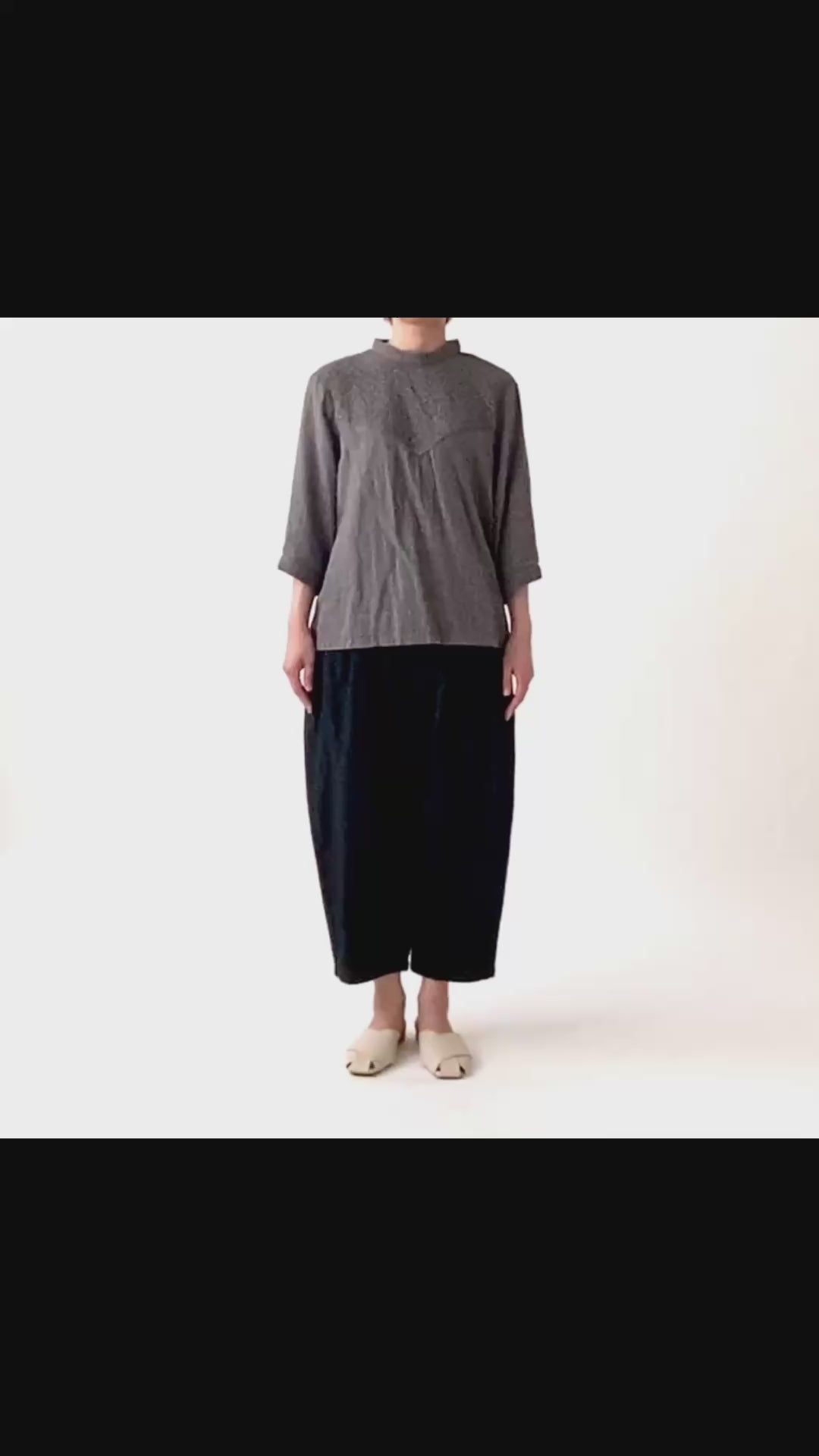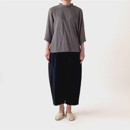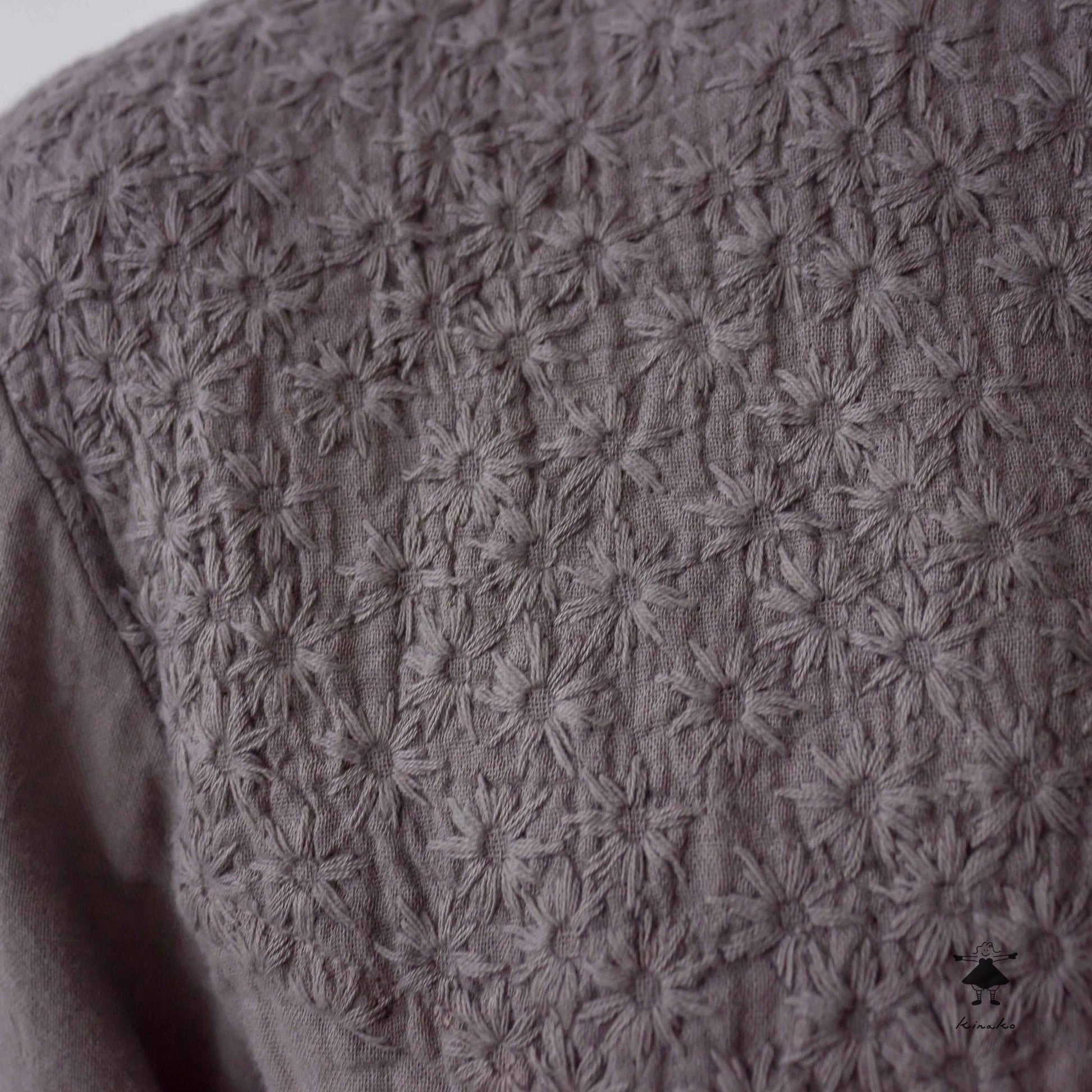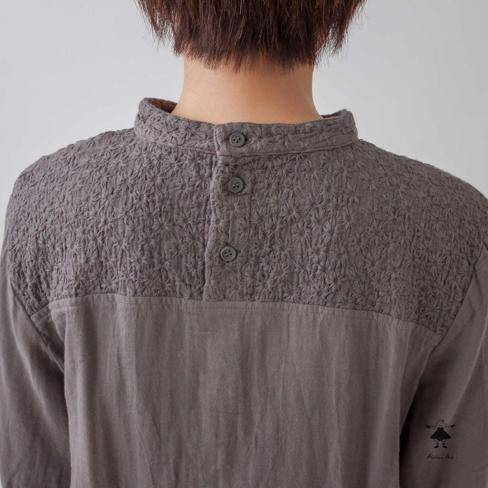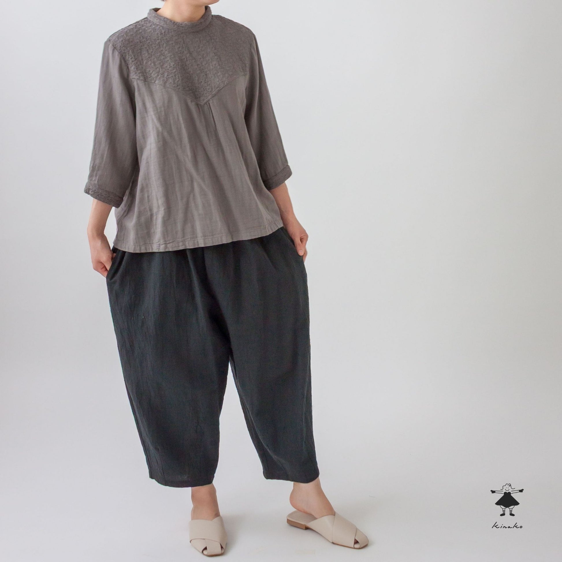 kinakoが使うWガーゼ生地に刺しゅう加工を加え、衿、袖口、胸切替部分に使ったプルオーバです。胸元の切替ラインが特徴で、ボリュームのあるボトムと相性の良い着丈にしました。