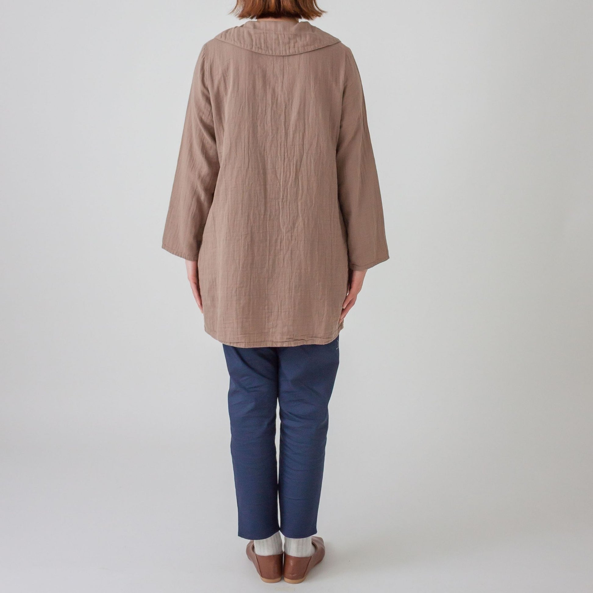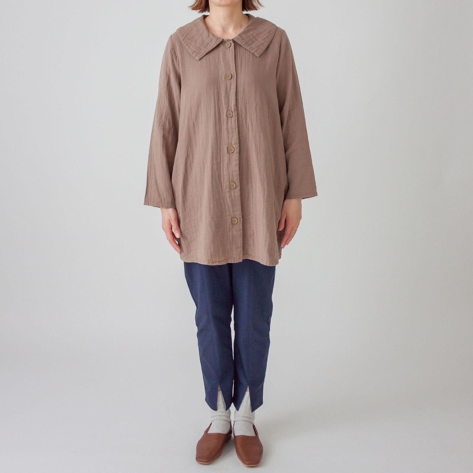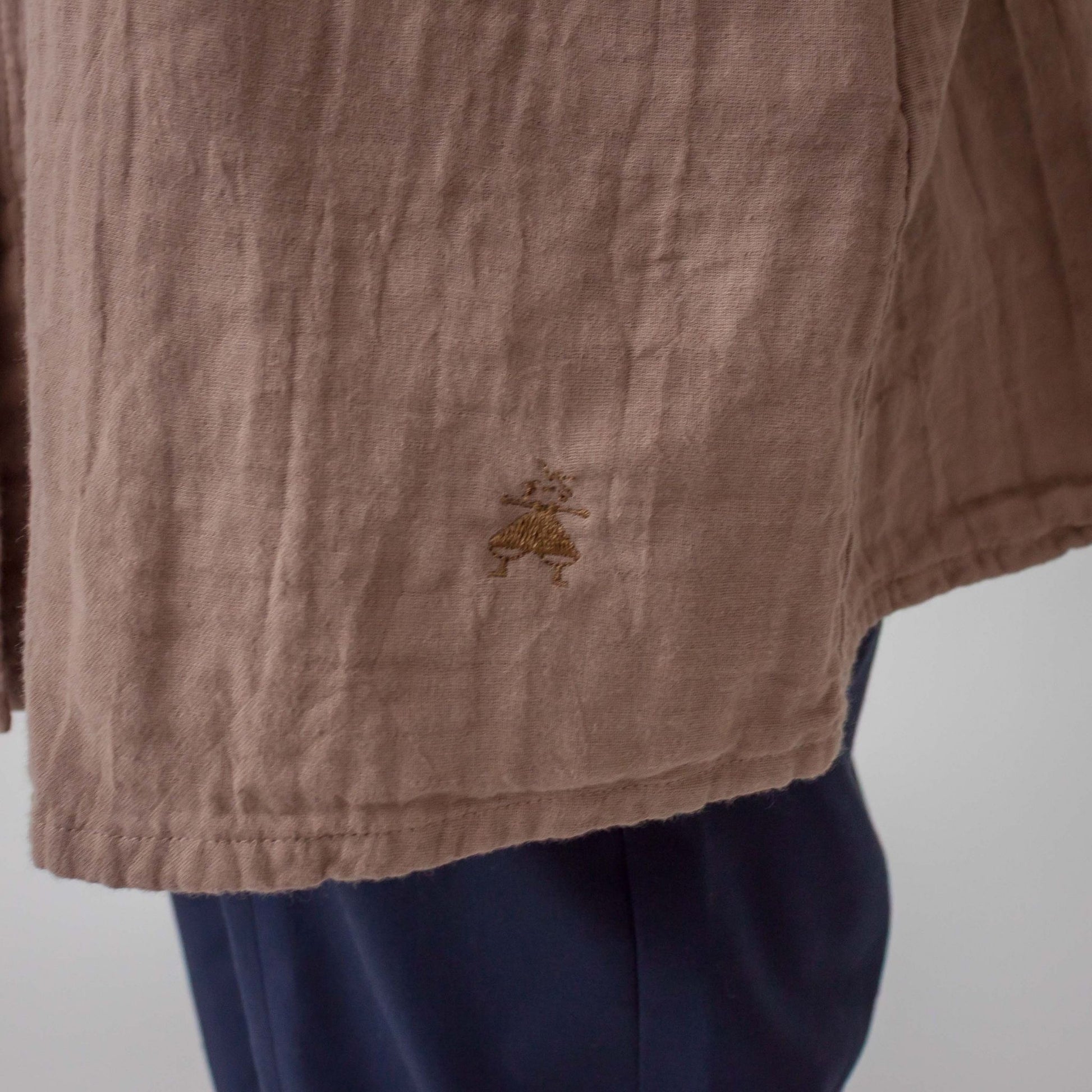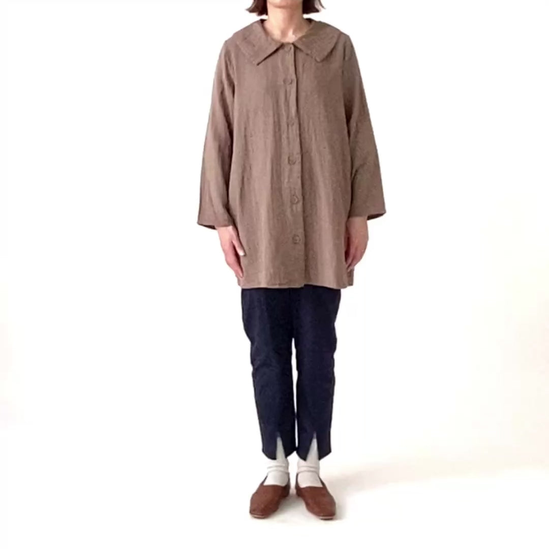 大きな衿が特徴のチュニックブラウスです。衿とのバランスを考えスッキリとしたシルエットに仕上げました。前ボタンで着やすく合わせやすい商品です。左裾にきなこちゃん刺しゅう有り。