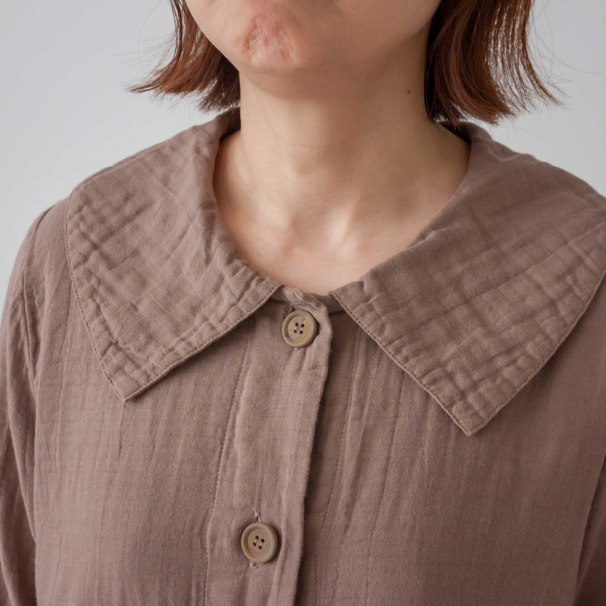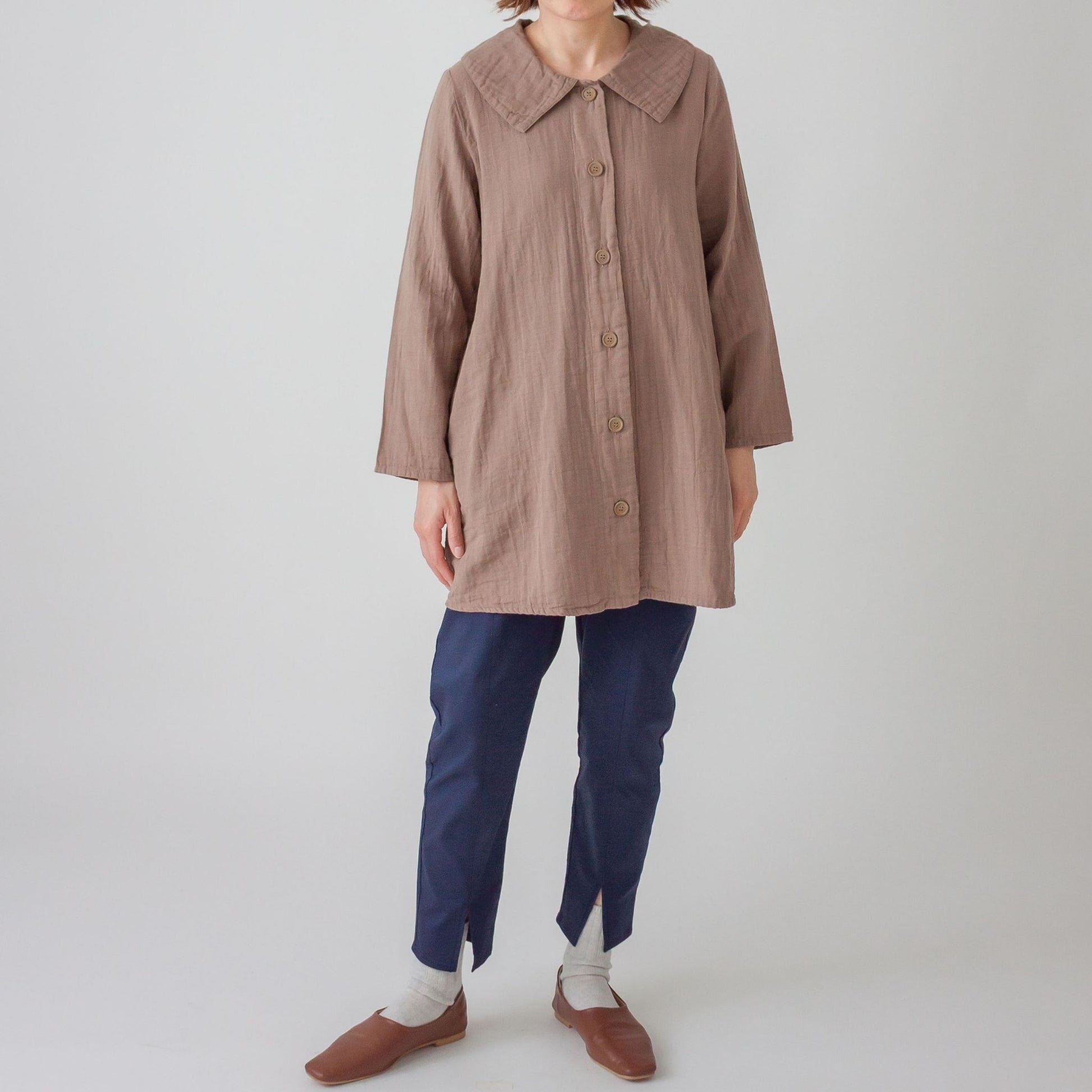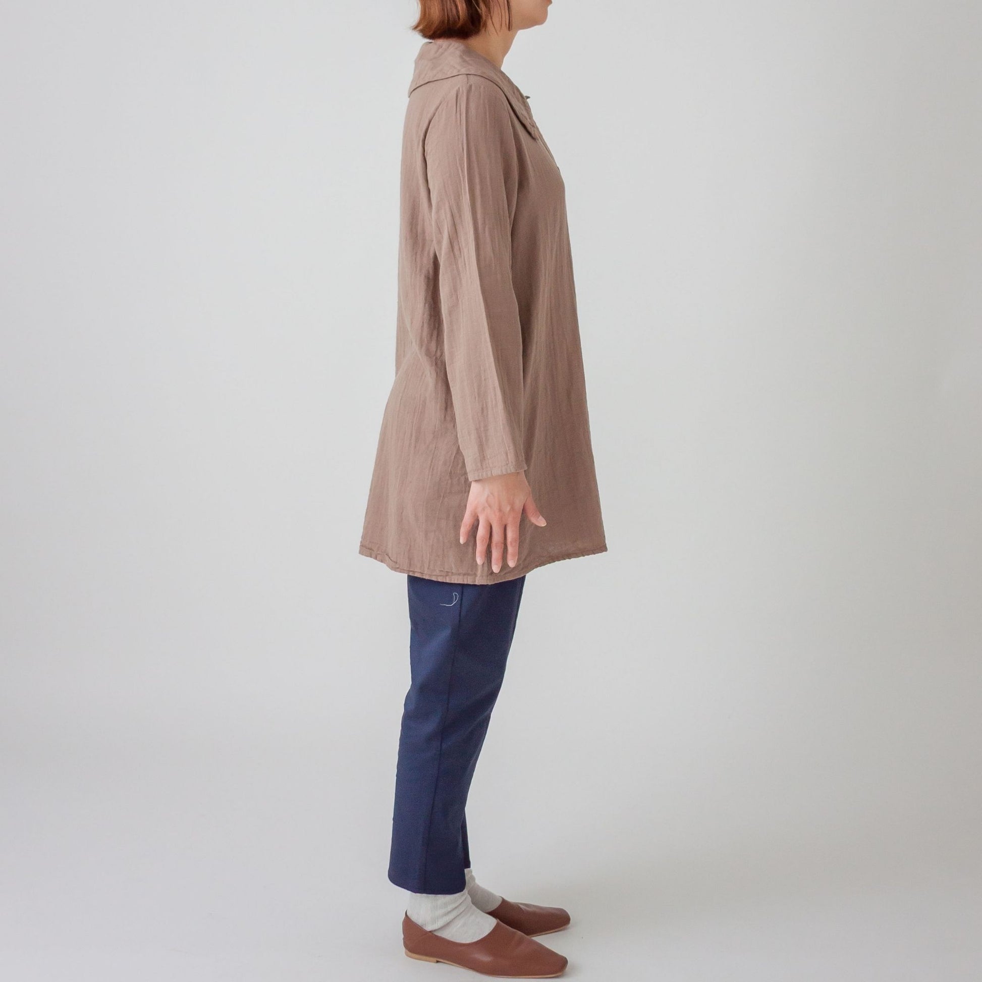 大きな衿が特徴のチュニックブラウスです。衿とのバランスを考えスッキリとしたシルエットに仕上げました。前ボタンで着やすく合わせやすい商品です。左裾にきなこちゃん刺しゅう有り。