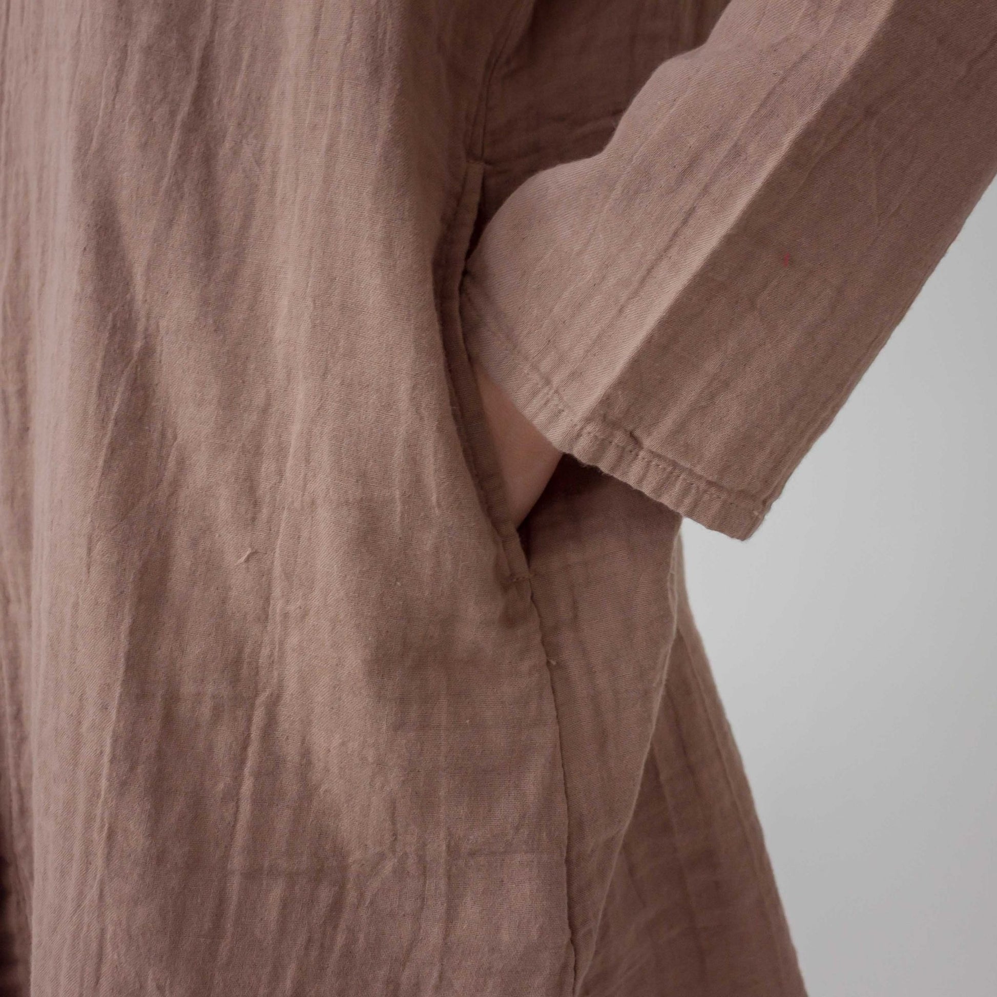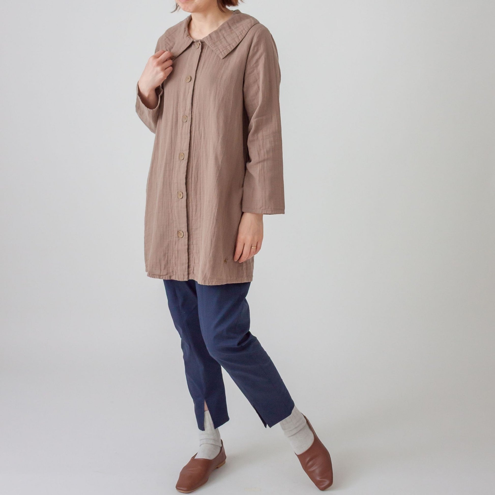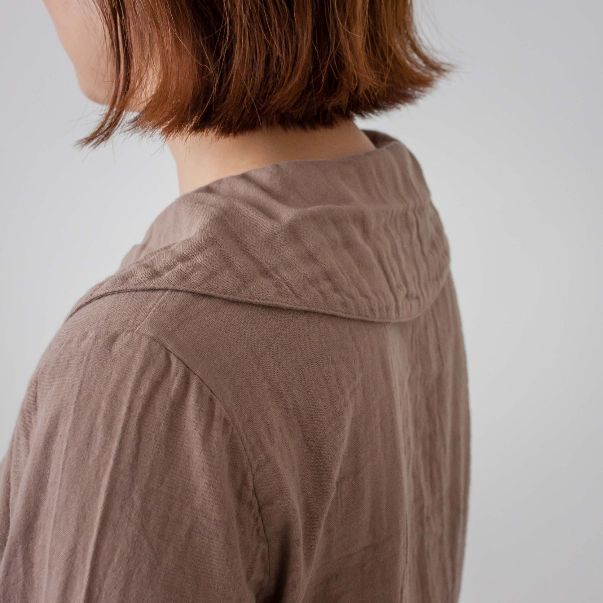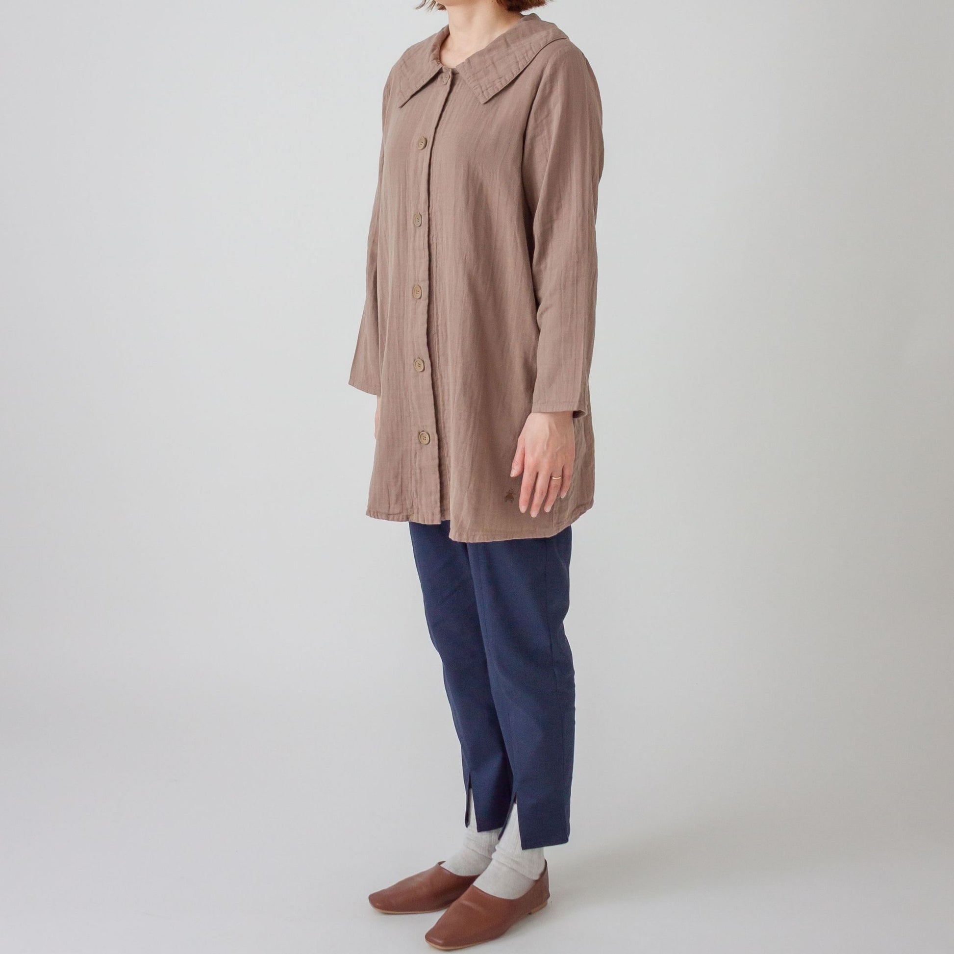 大きな衿が特徴のチュニックブラウスです。衿とのバランスを考えスッキリとしたシルエットに仕上げました。前ボタンで着やすく合わせやすい商品です。左裾にきなこちゃん刺しゅう有り。