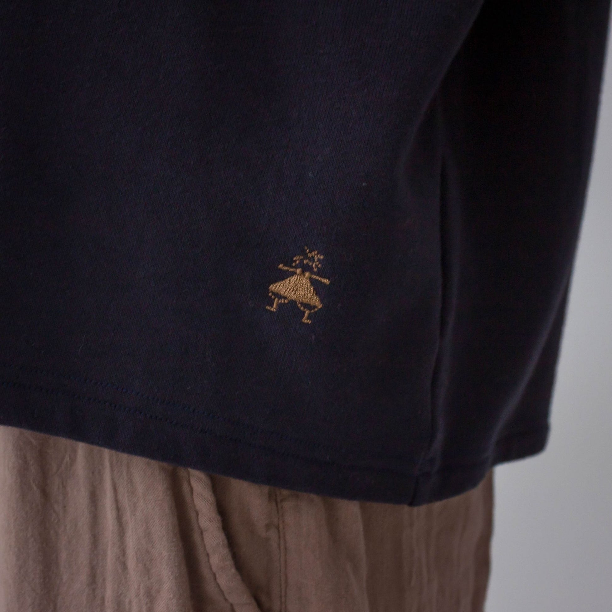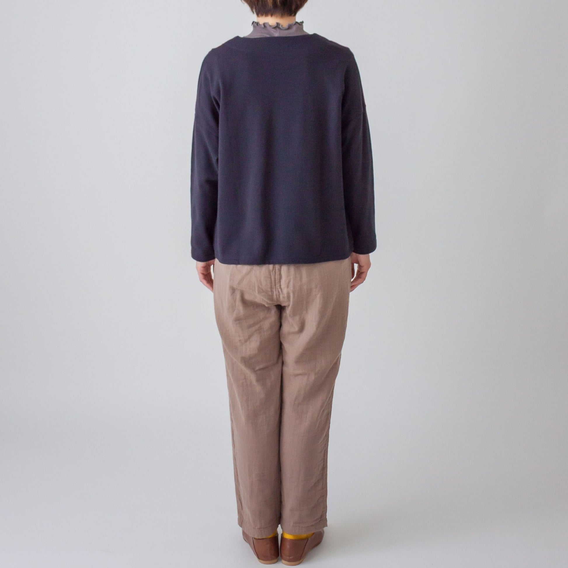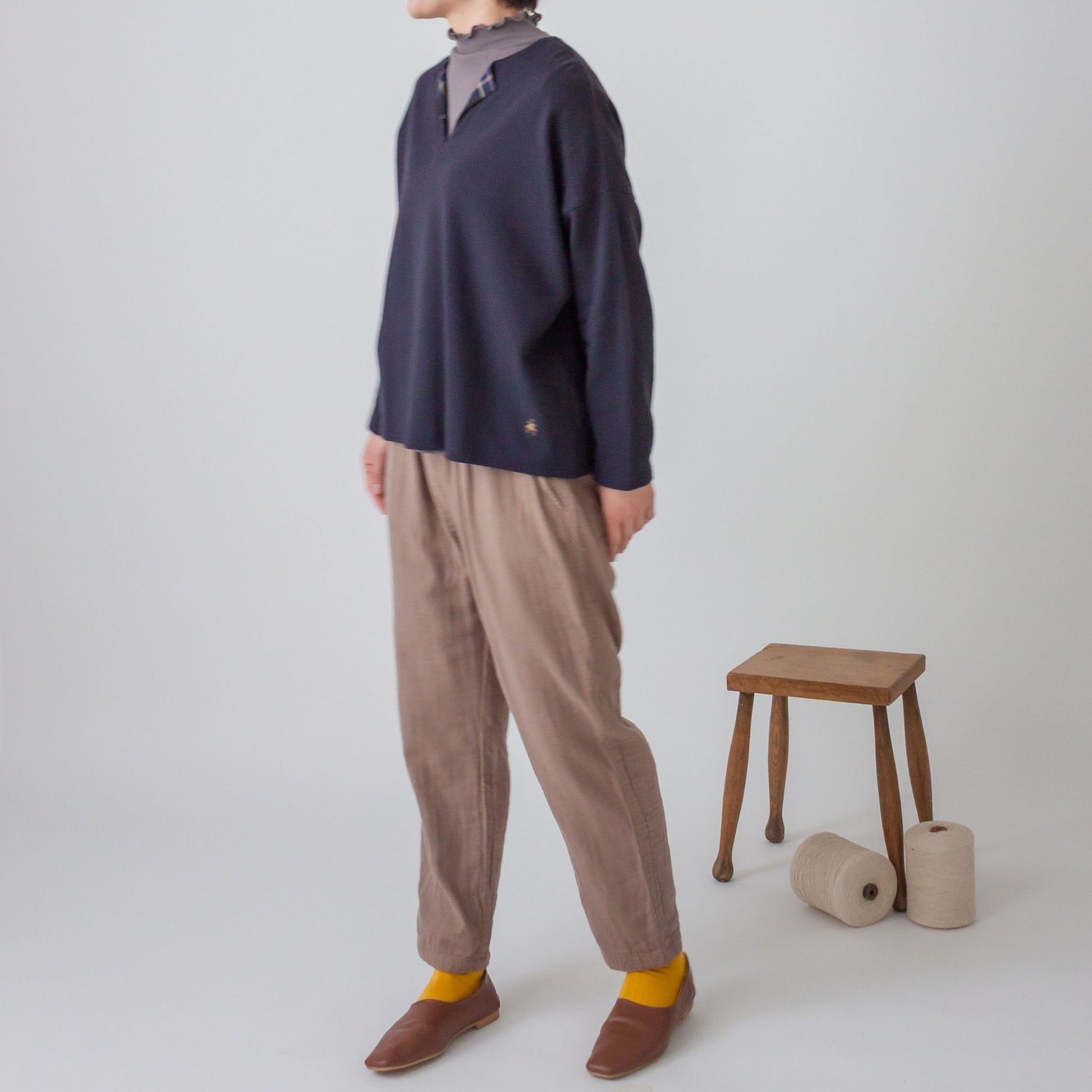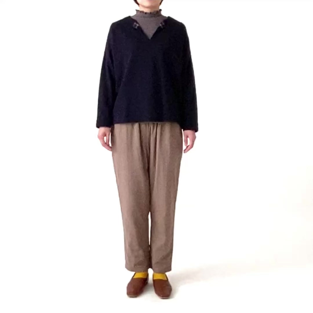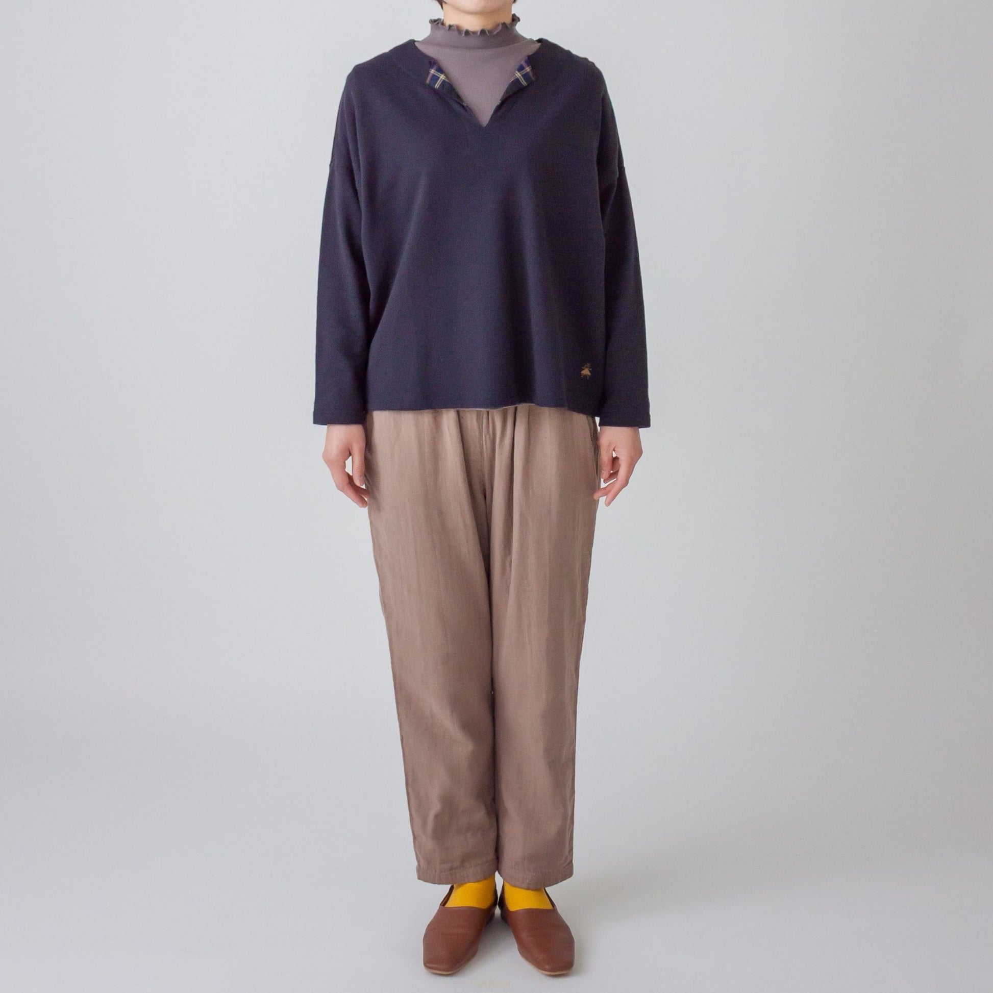 衿元のチェック柄がポイントのプルオーバーです。ワイドな身幅と柔らかいミニパイル生地を使うことで、楽で優しい着心地に仕上げました。衿のあるインナーと合わせて普段使いしやすい1着です。左裾にきなこちゃん刺しゅう有り。
