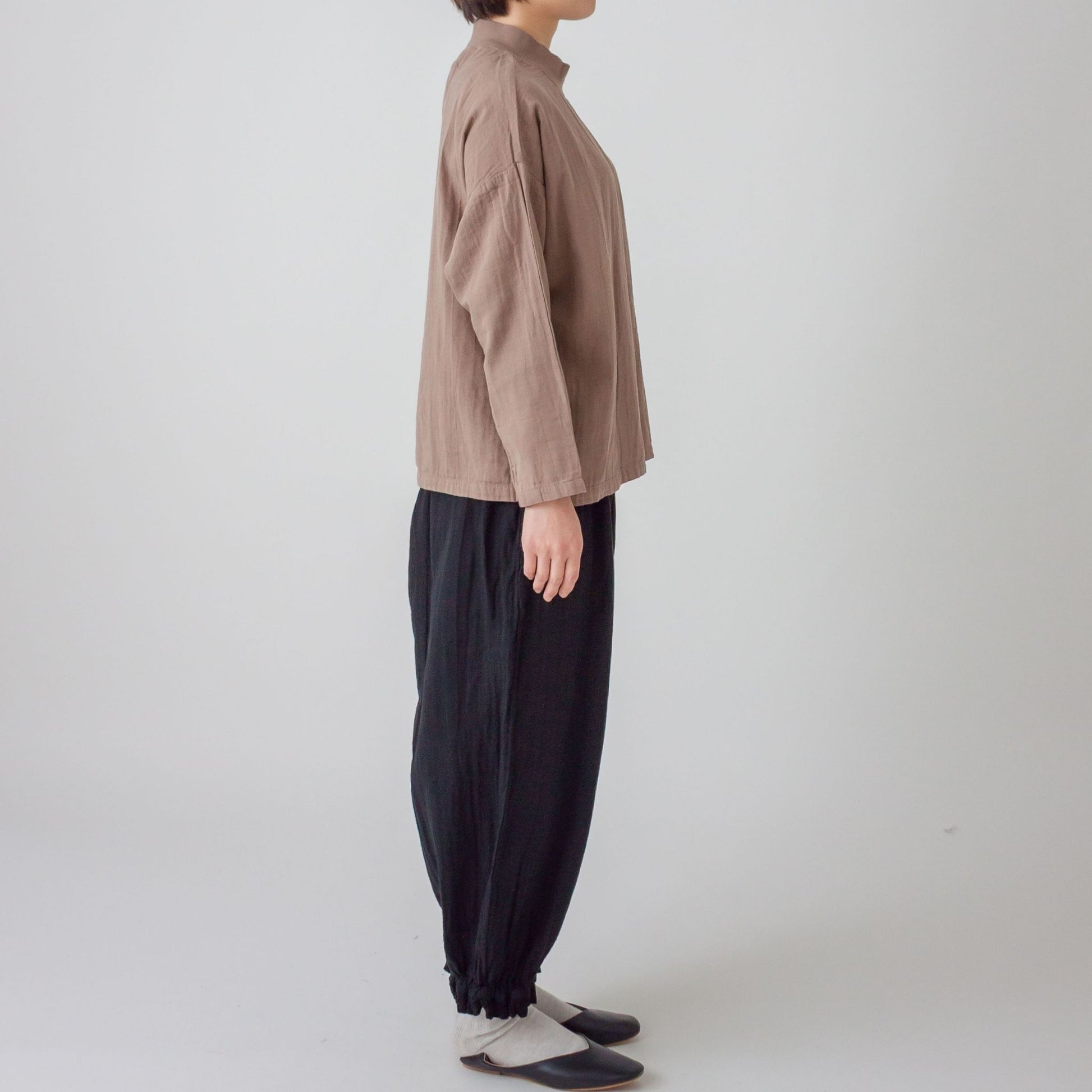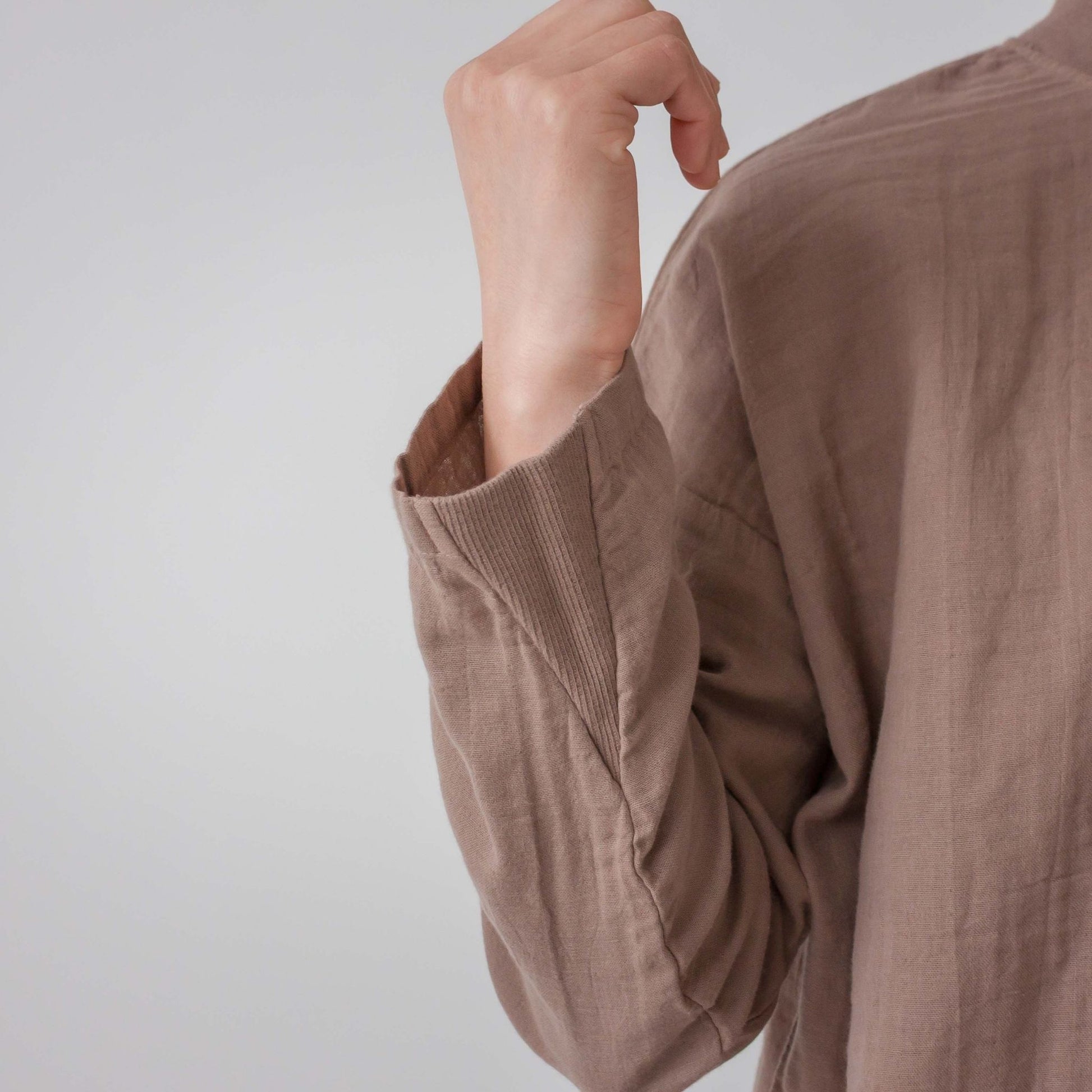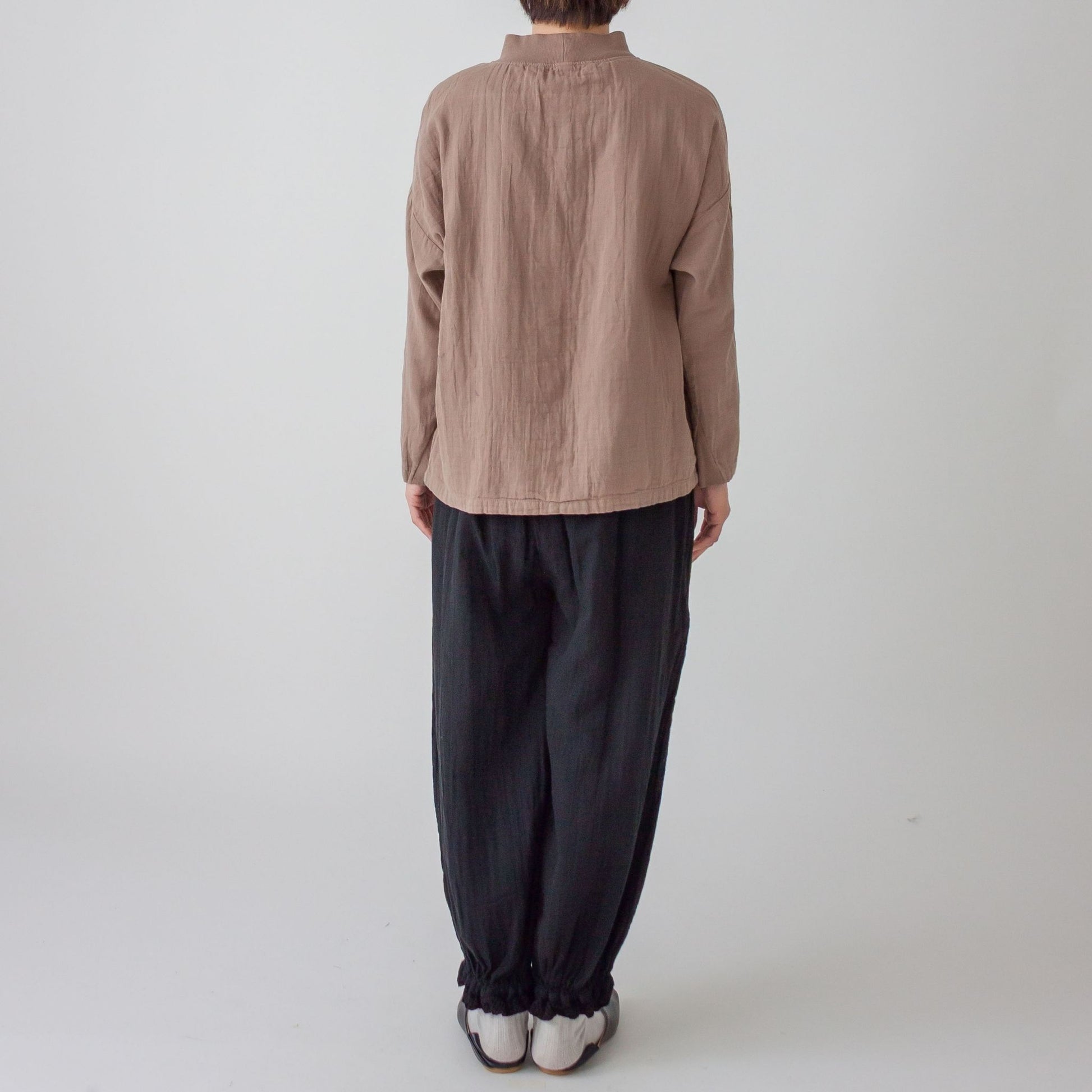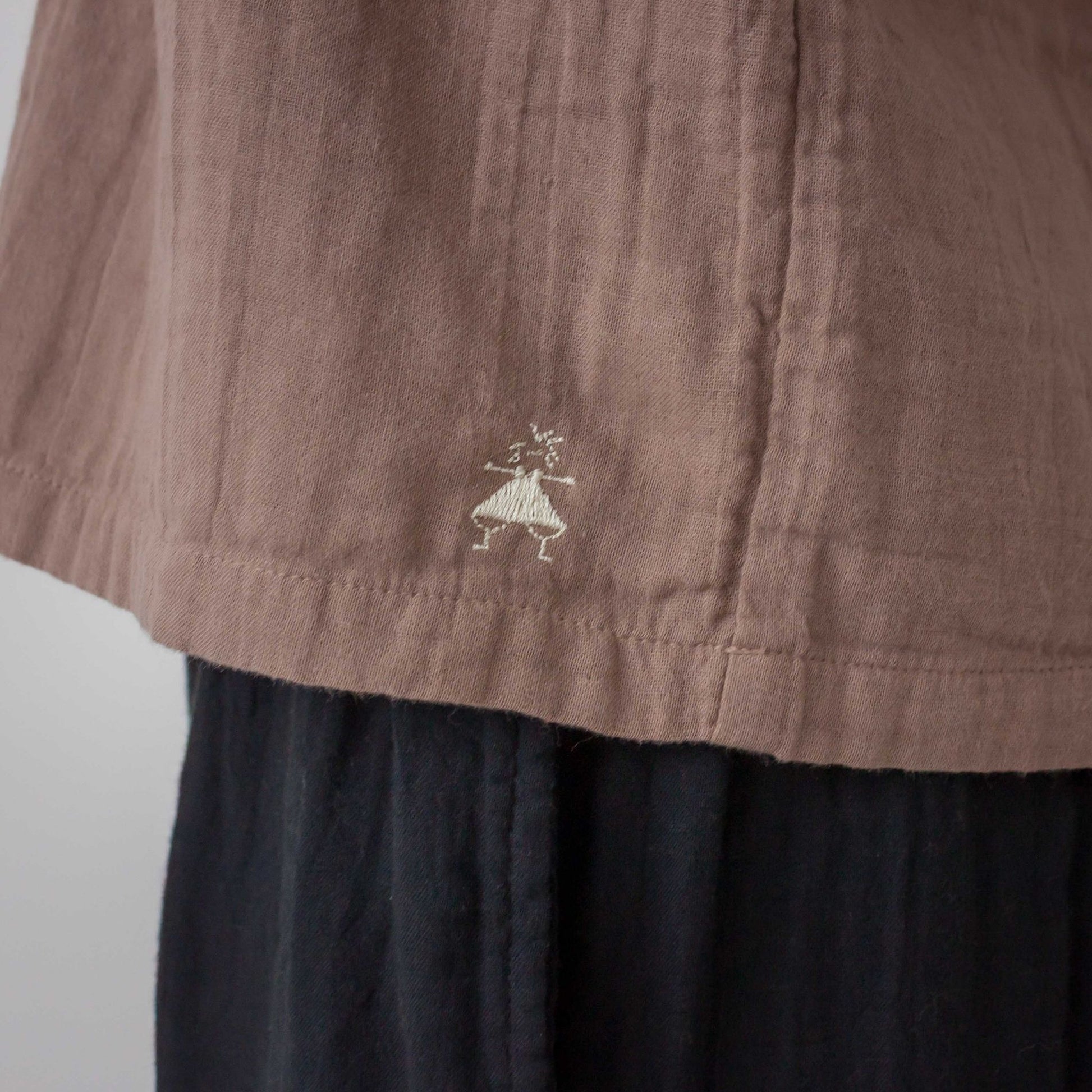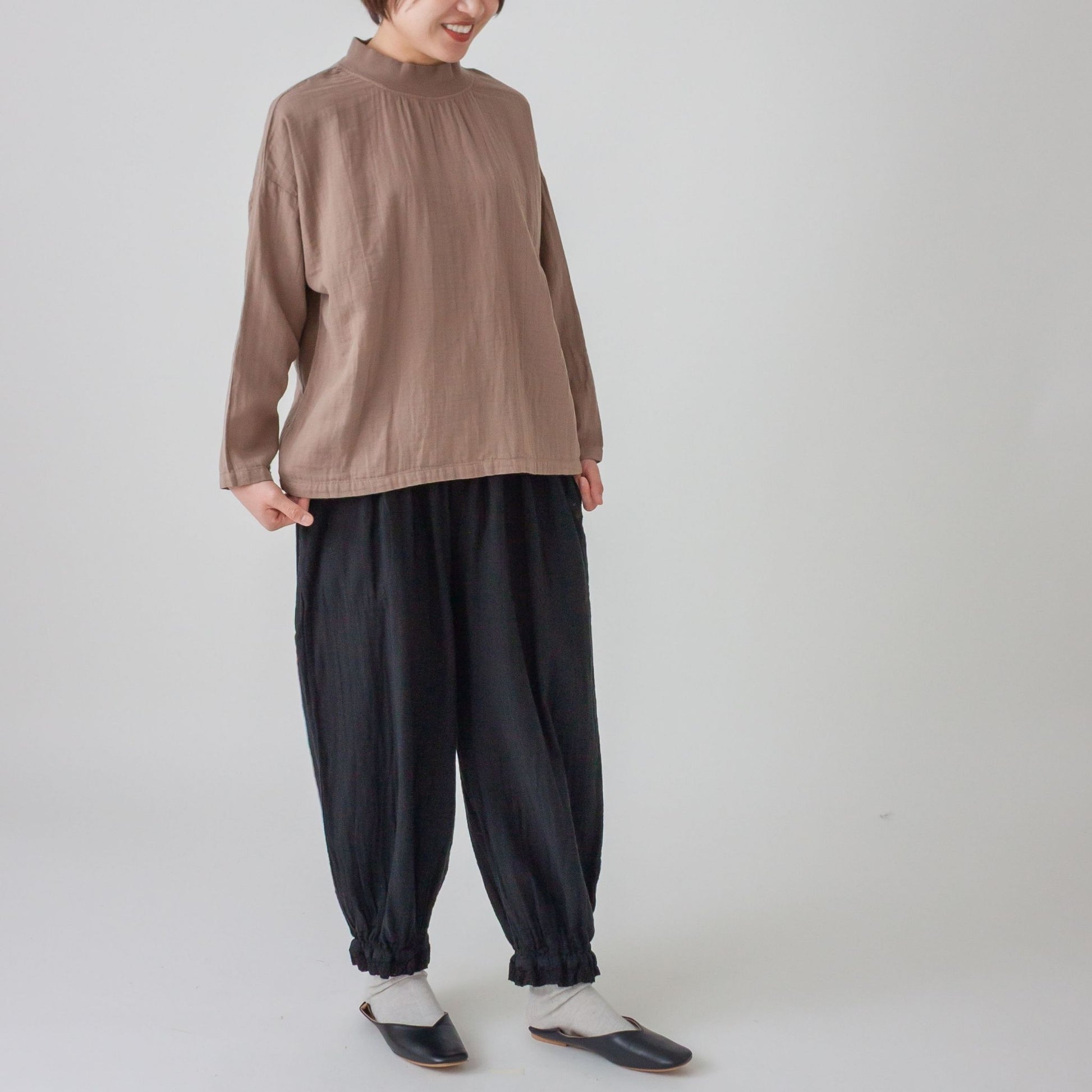 少し高めのリブ衿がポイントのプルオーバーです。昨年好評でした商品に、より着やすく改良を加えた袖口のリブ使いが特徴です。左裾にきなこちゃん刺しゅう有り。