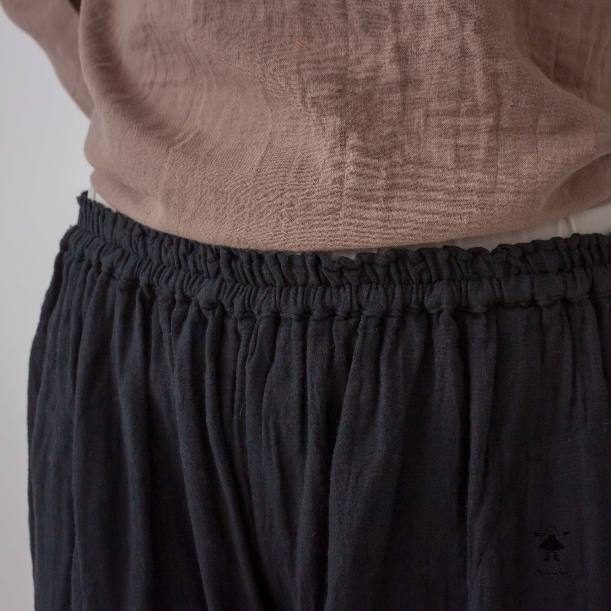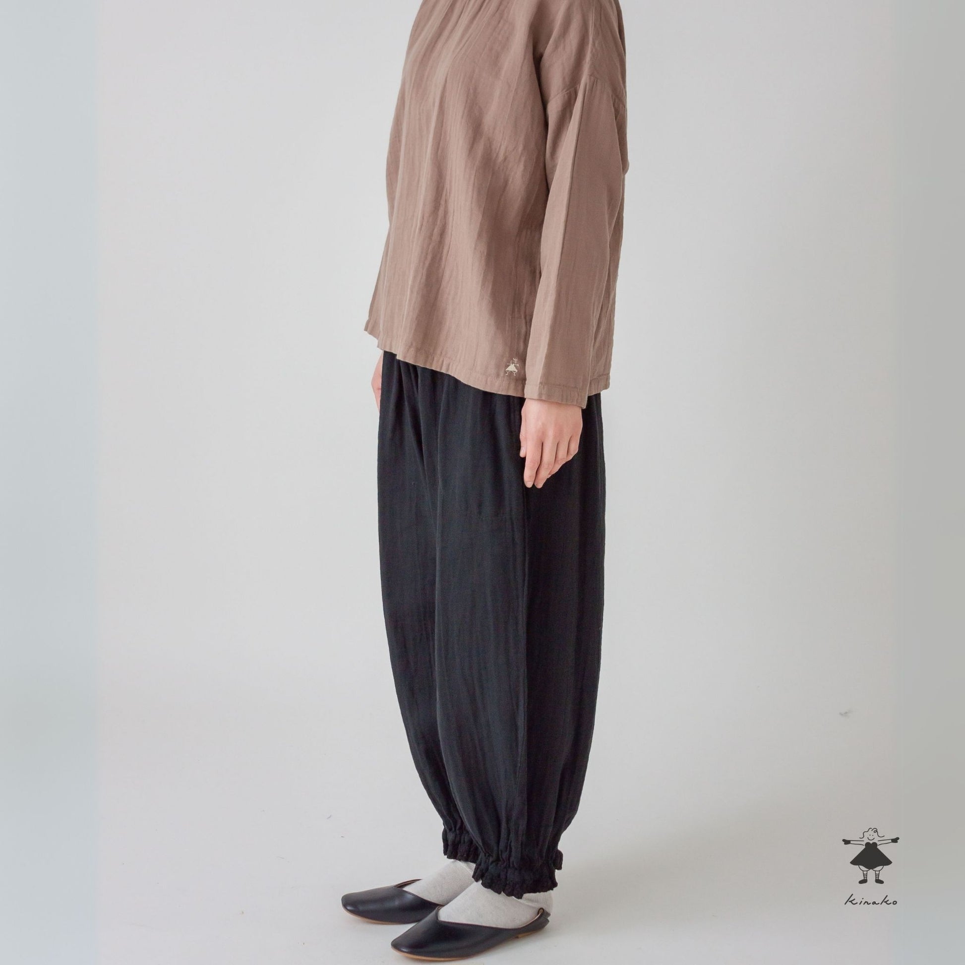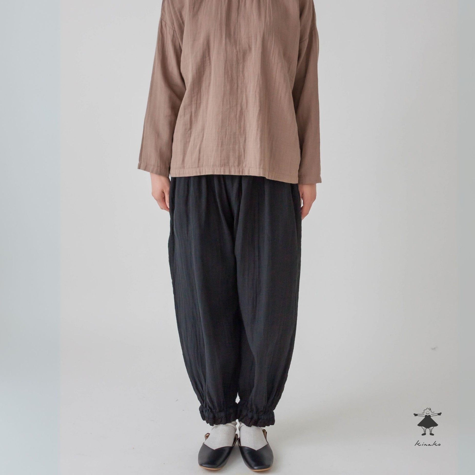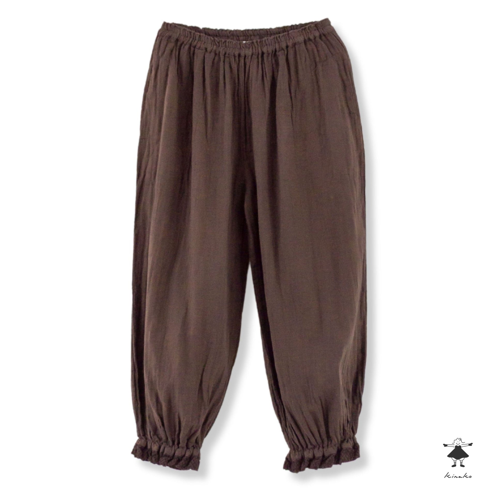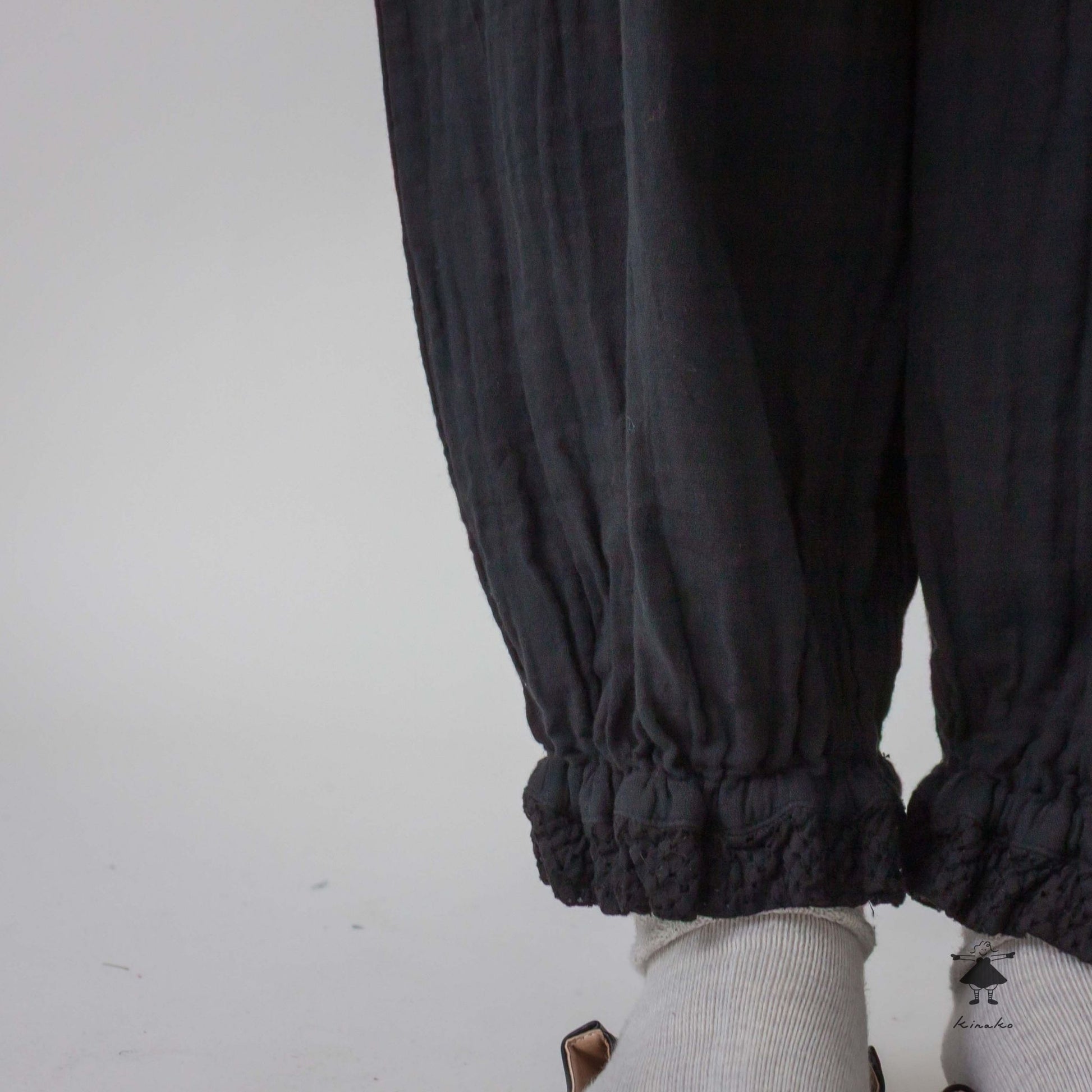 裾にドットレース生地を切替えゴムを入れたパンツです。裾口を程よく絞ることで足元を軽く見せ、インナーパンツとしてチュニックやワンピースとも相性良く仕上げました。