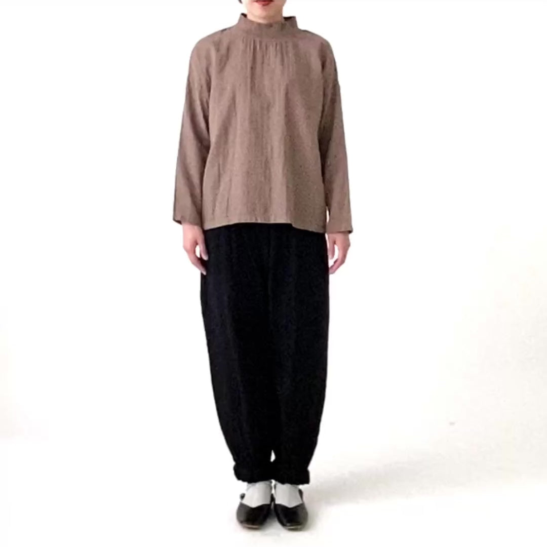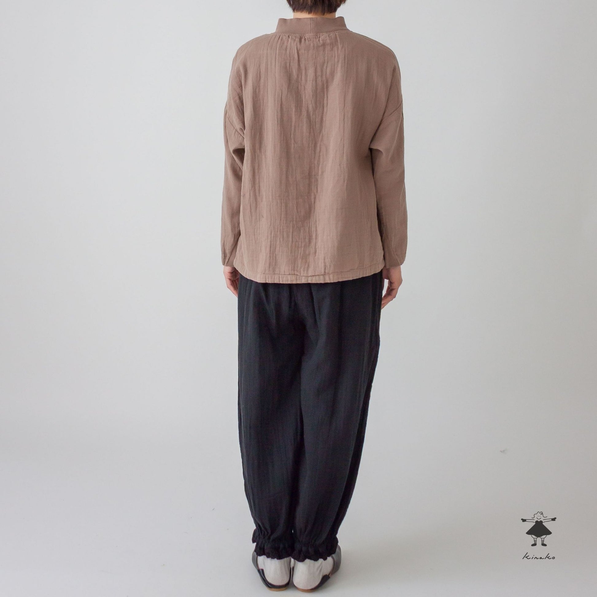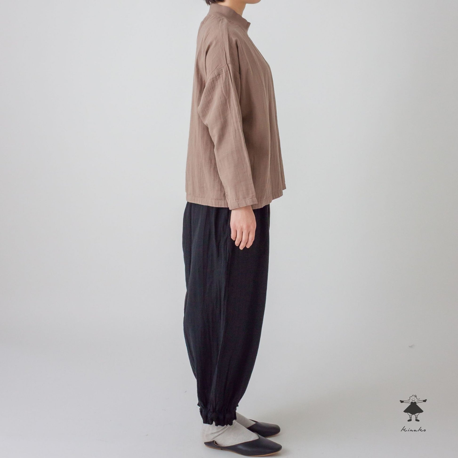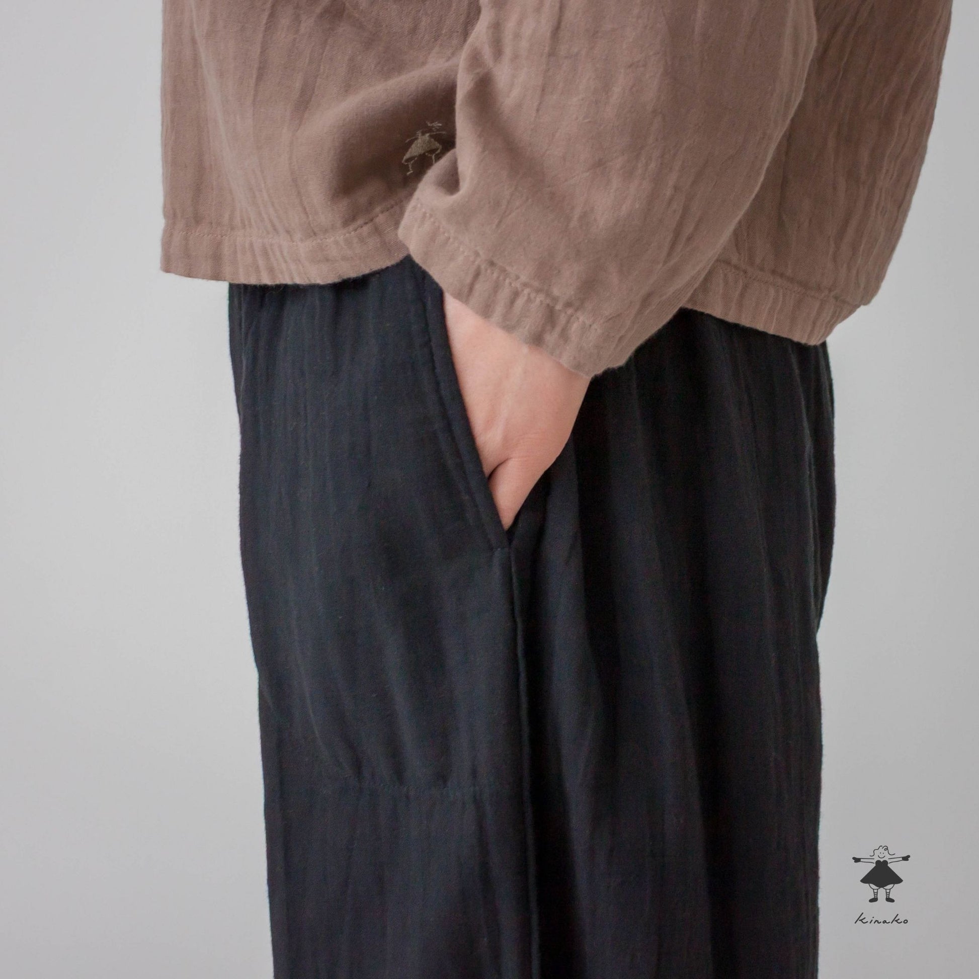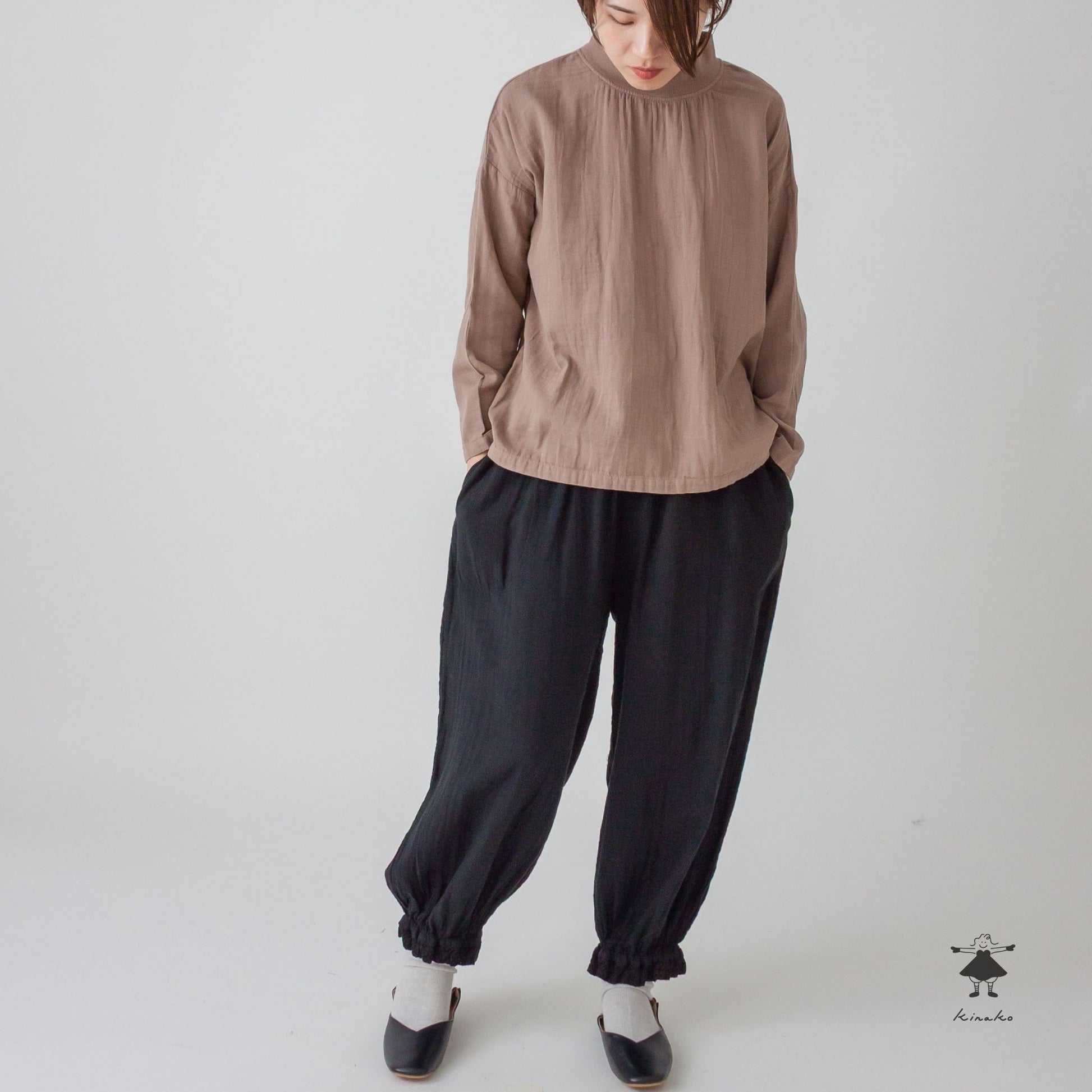 裾にドットレース生地を切替えゴムを入れたパンツです。裾口を程よく絞ることで足元を軽く見せ、インナーパンツとしてチュニックやワンピースとも相性良く仕上げました。