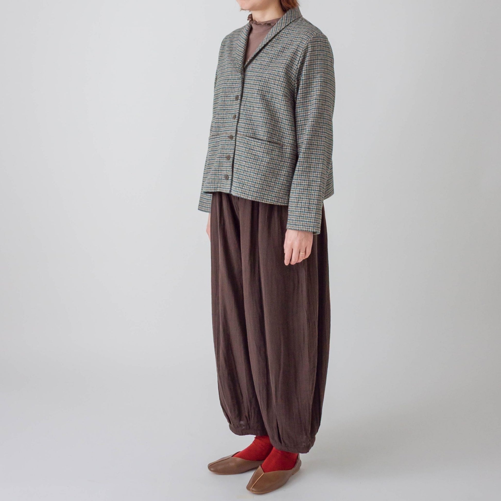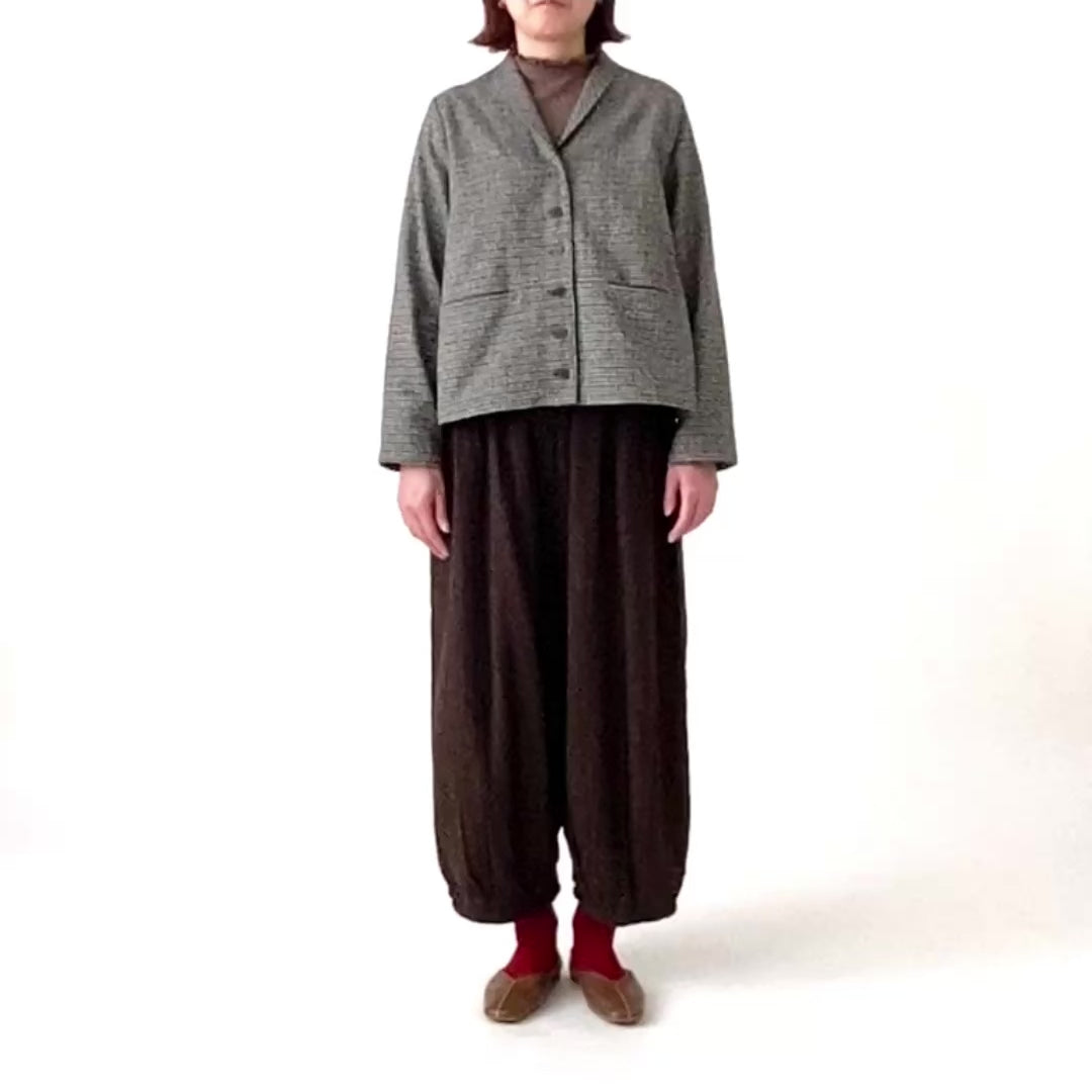 綿100%のツイード生地を使ったショート丈ジャケットです。スッキリしたショールカラーがポイントで、流行りのショート丈でコンパクトな見た目に仕上げました。