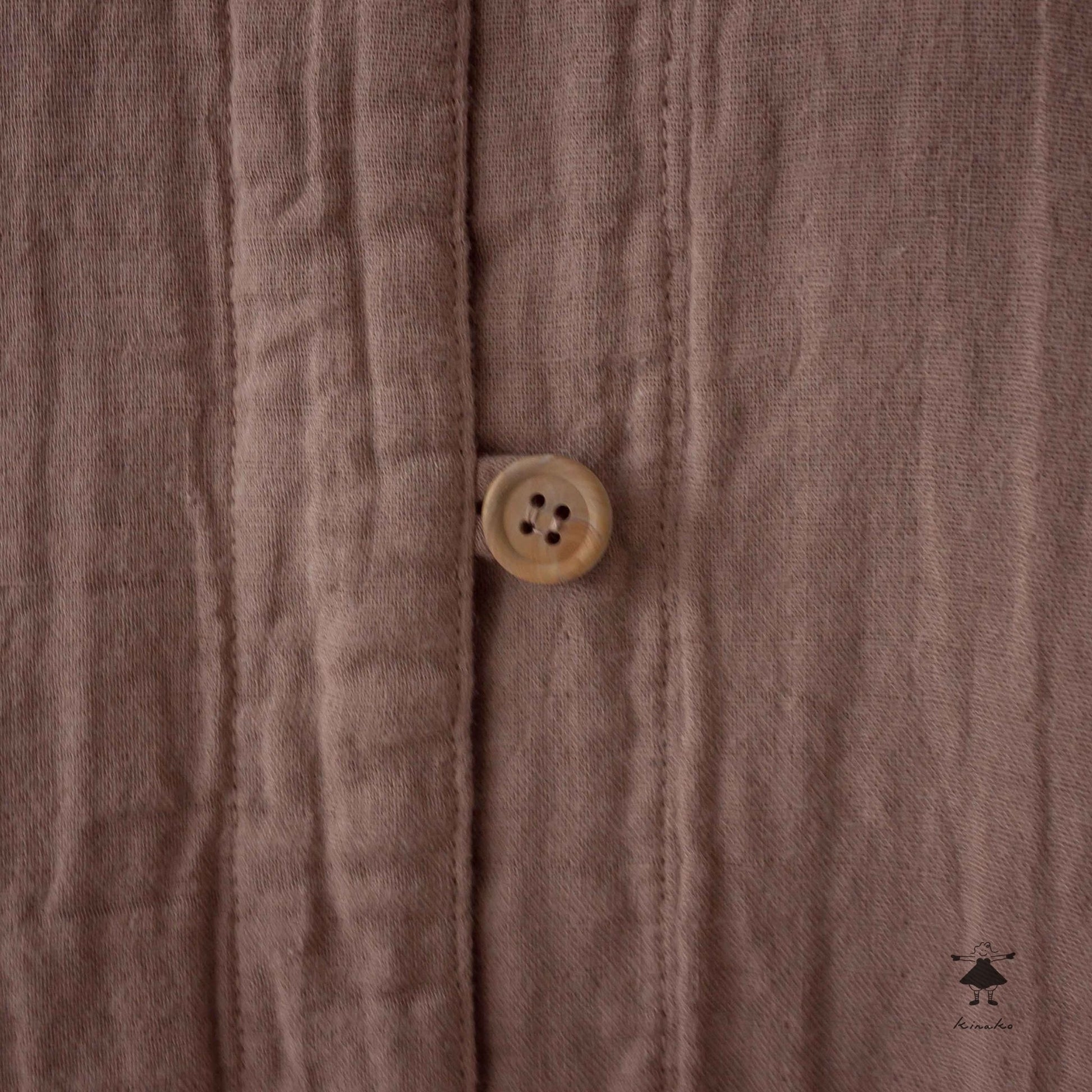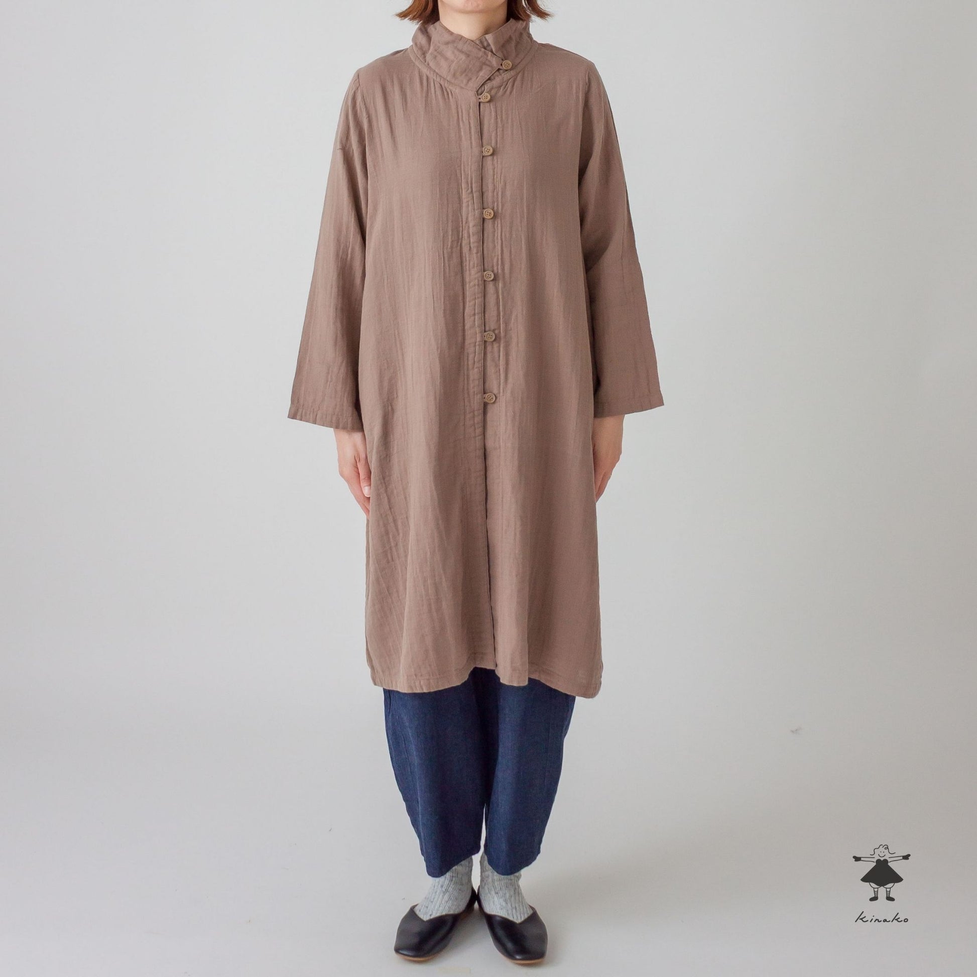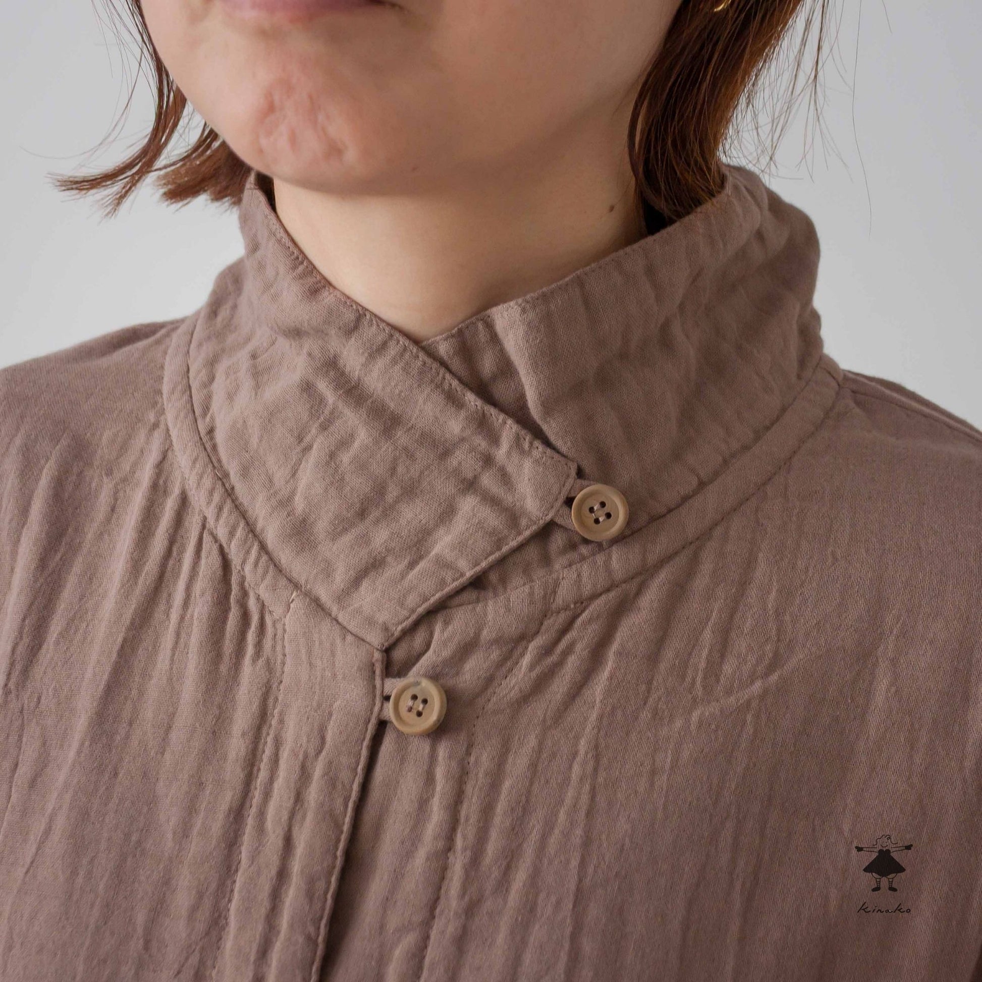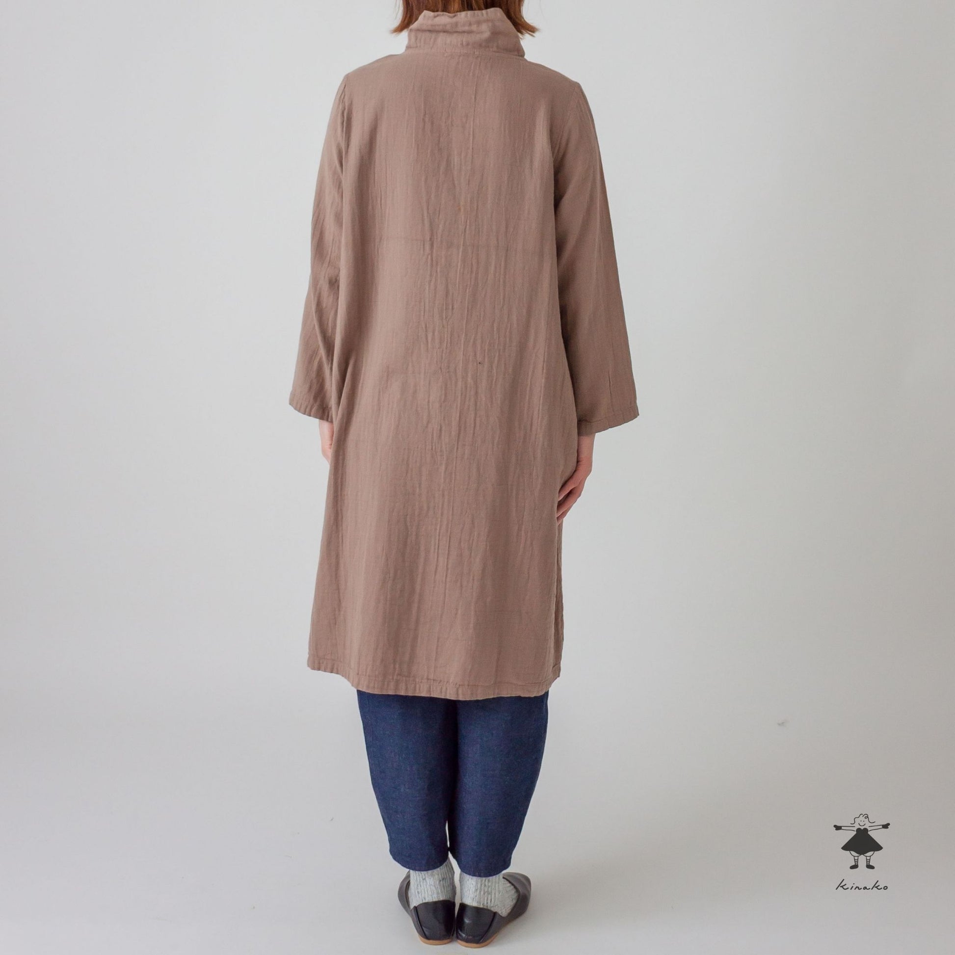 衿先に付けたボタンを留めるとハイネック風になる衿が特徴です。ボタンの開け閉めで印象を変えることができ、前開きで羽織物として使って頂ける商品です。左ポケット口にきなこちゃん刺しゅう有り。