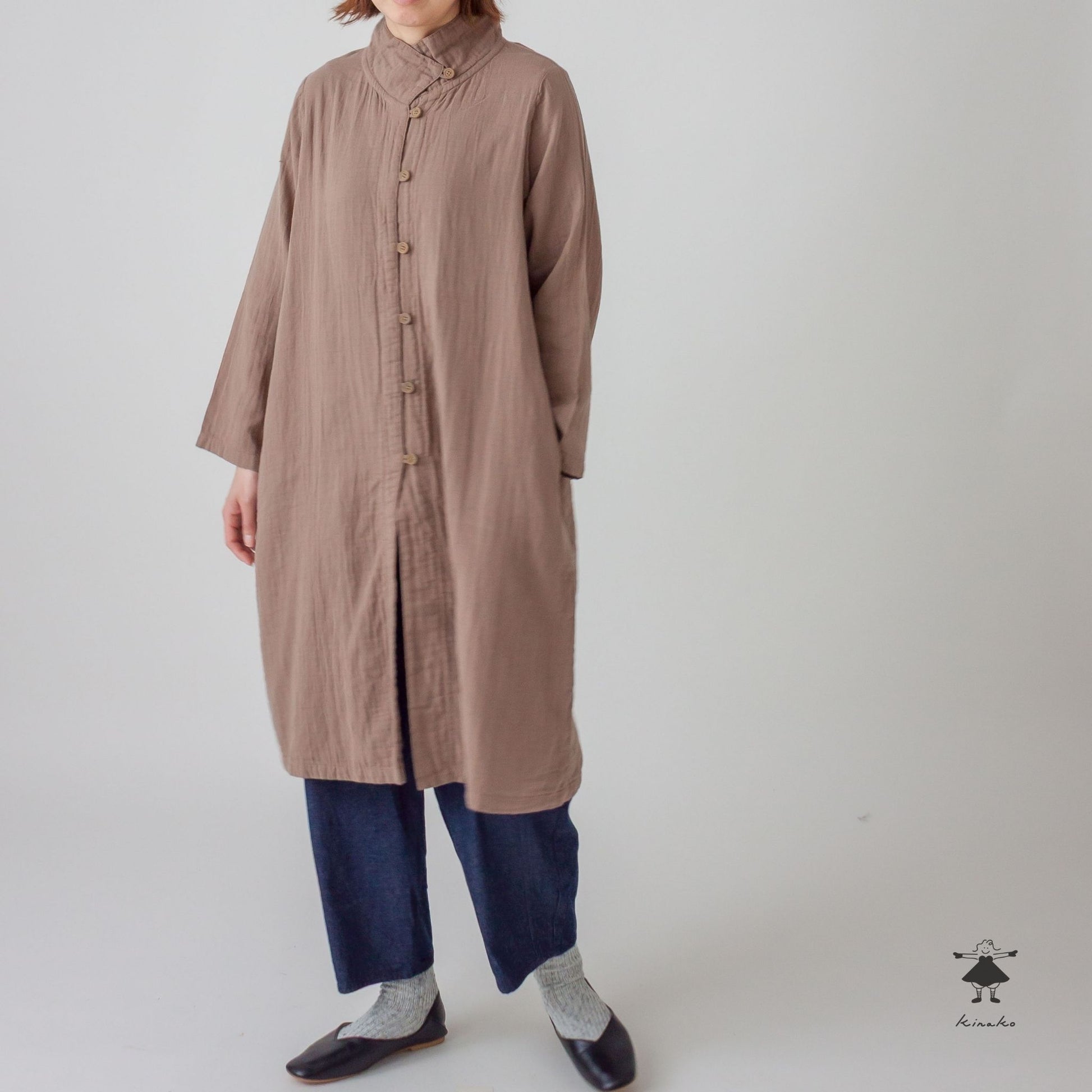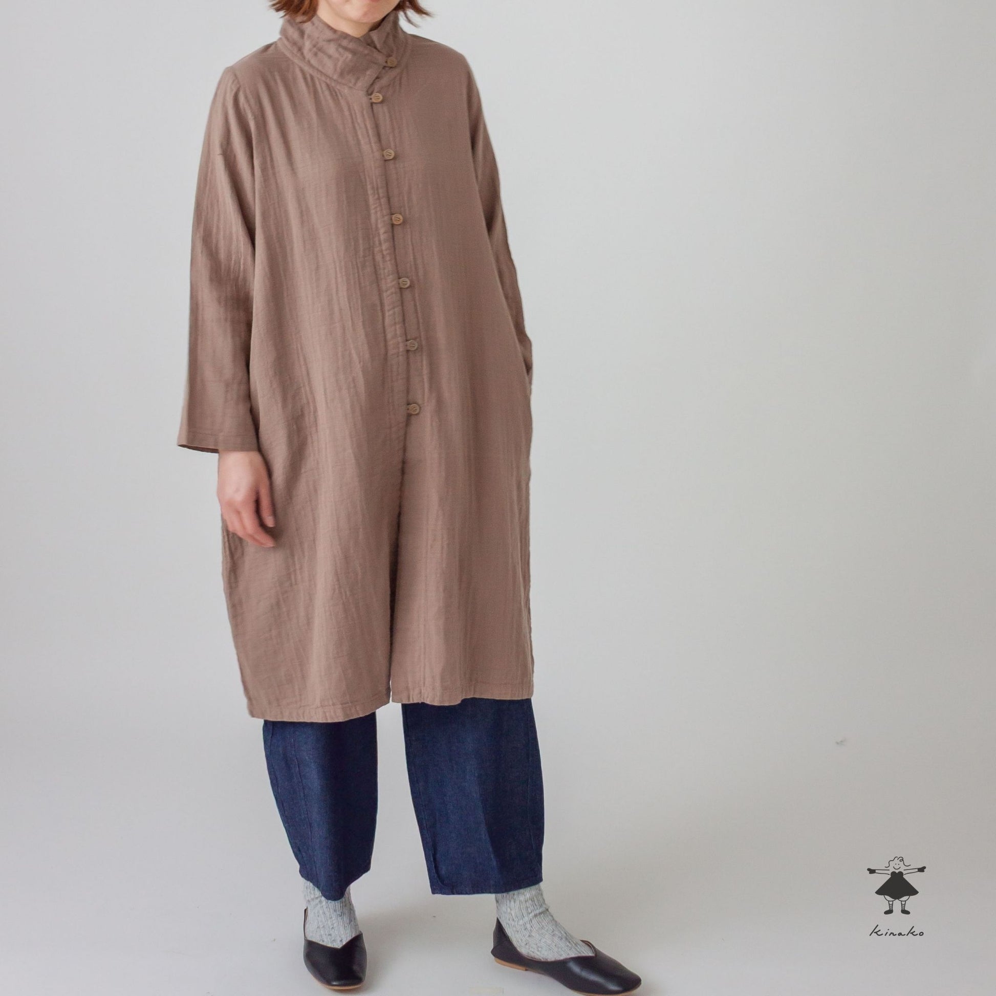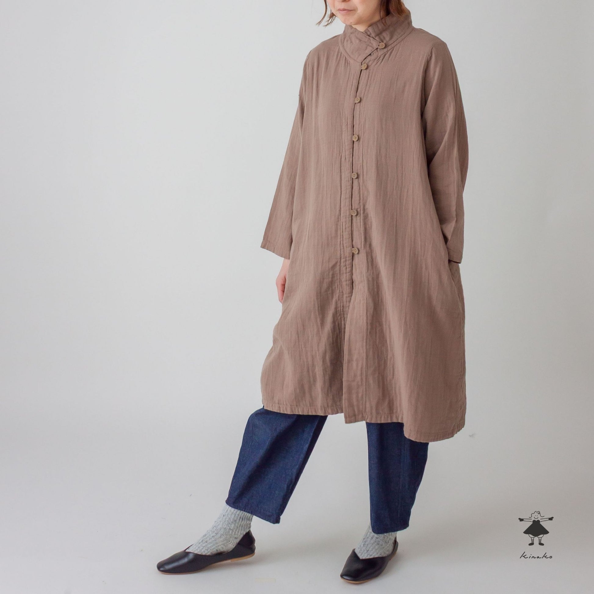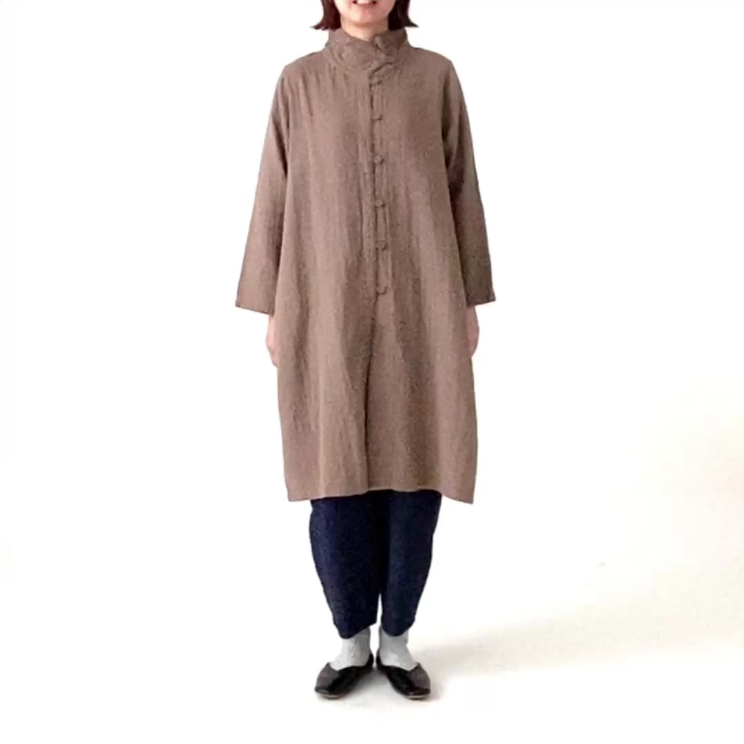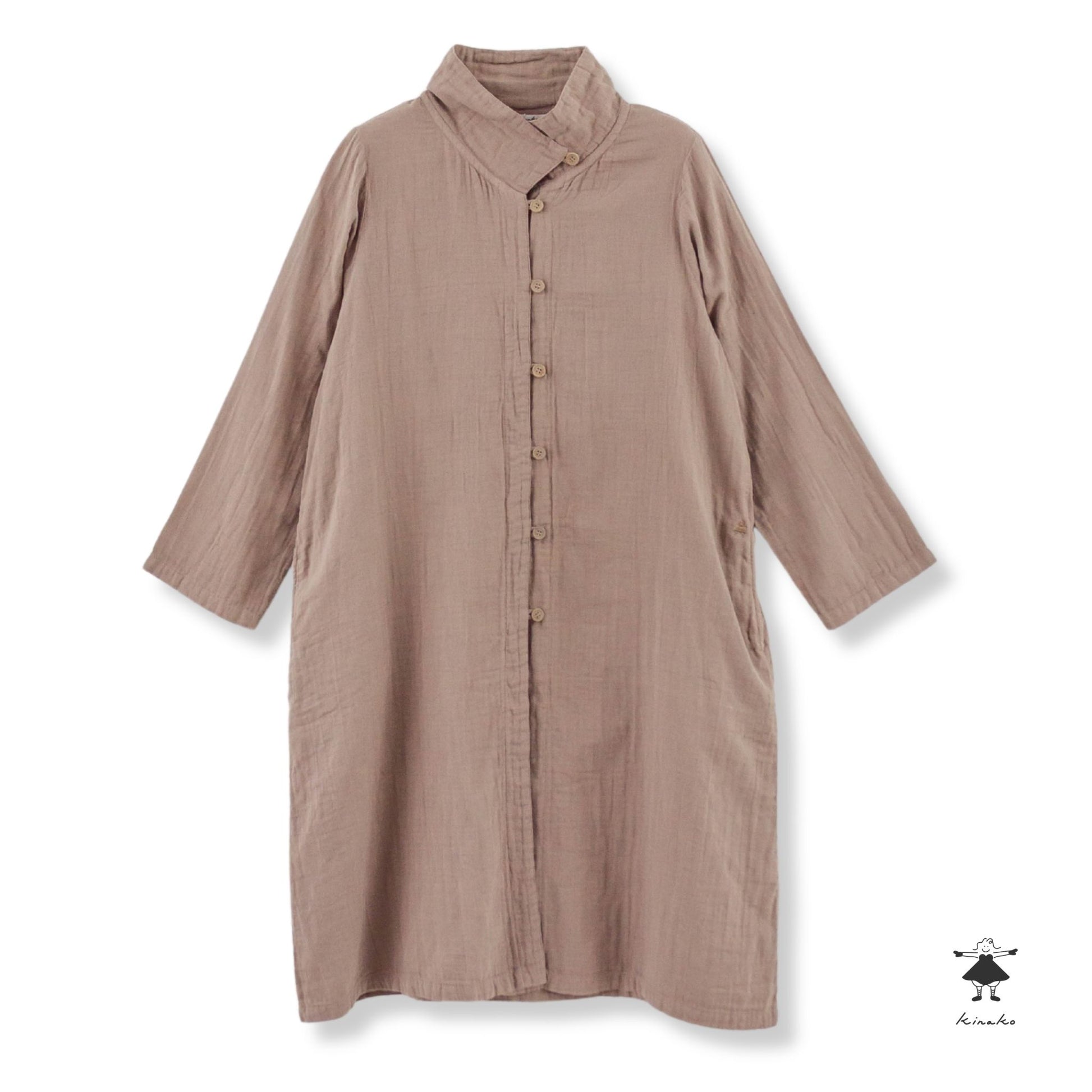衿先に付けたボタンを留めるとハイネック風になる衿が特徴です。ボタンの開け閉めで印象を変えることができ、前開きで羽織物として使って頂ける商品です。左ポケット口にきなこちゃん刺しゅう有り。