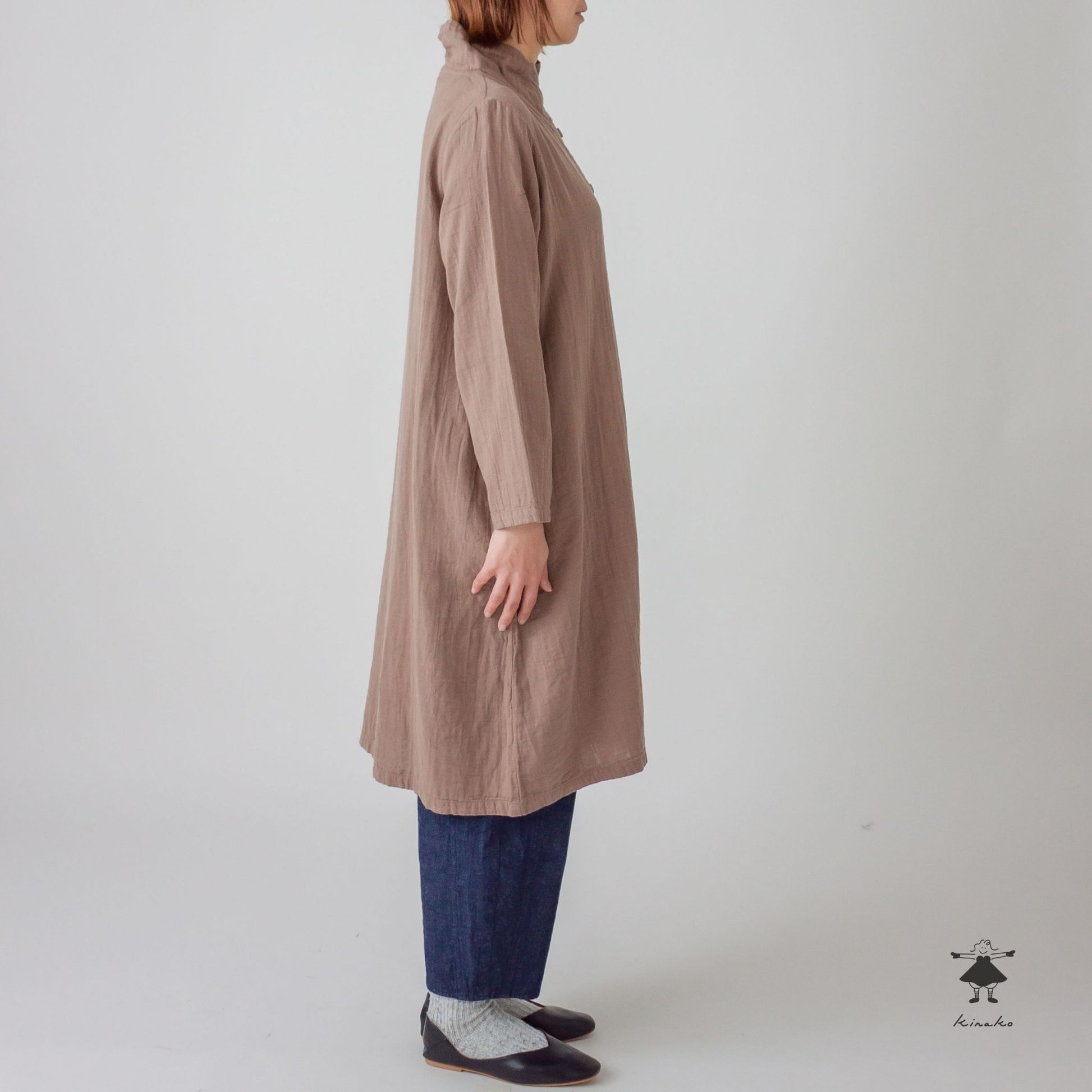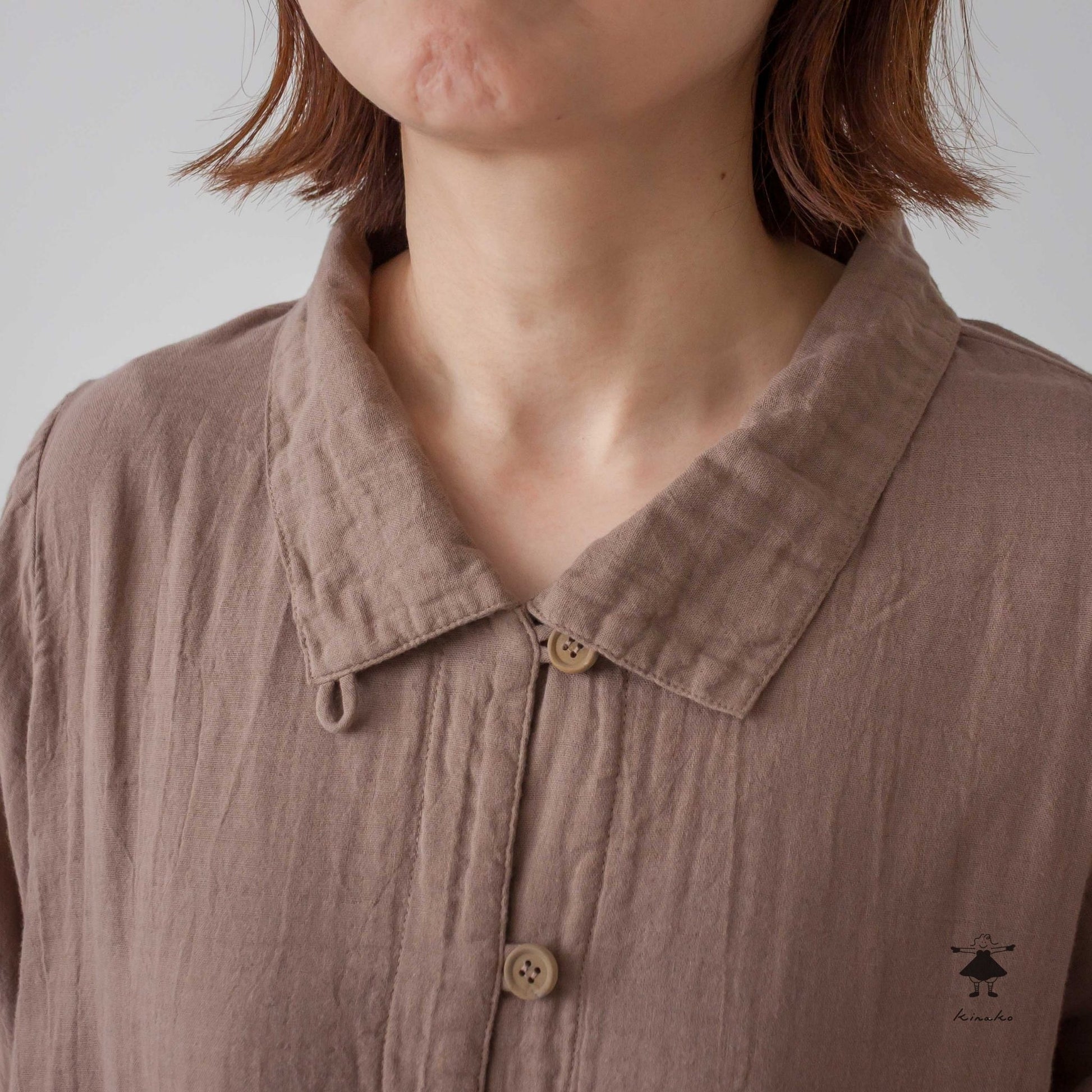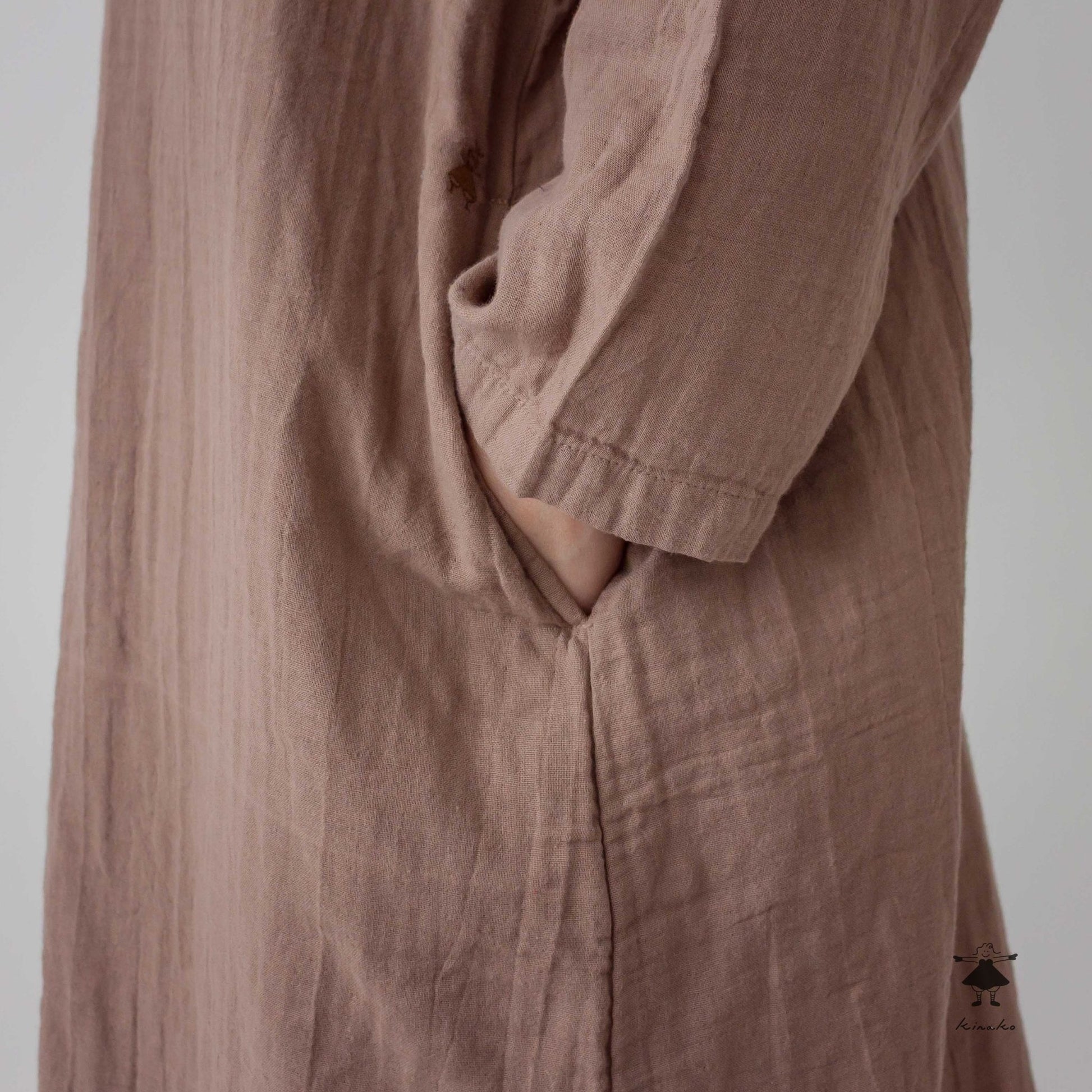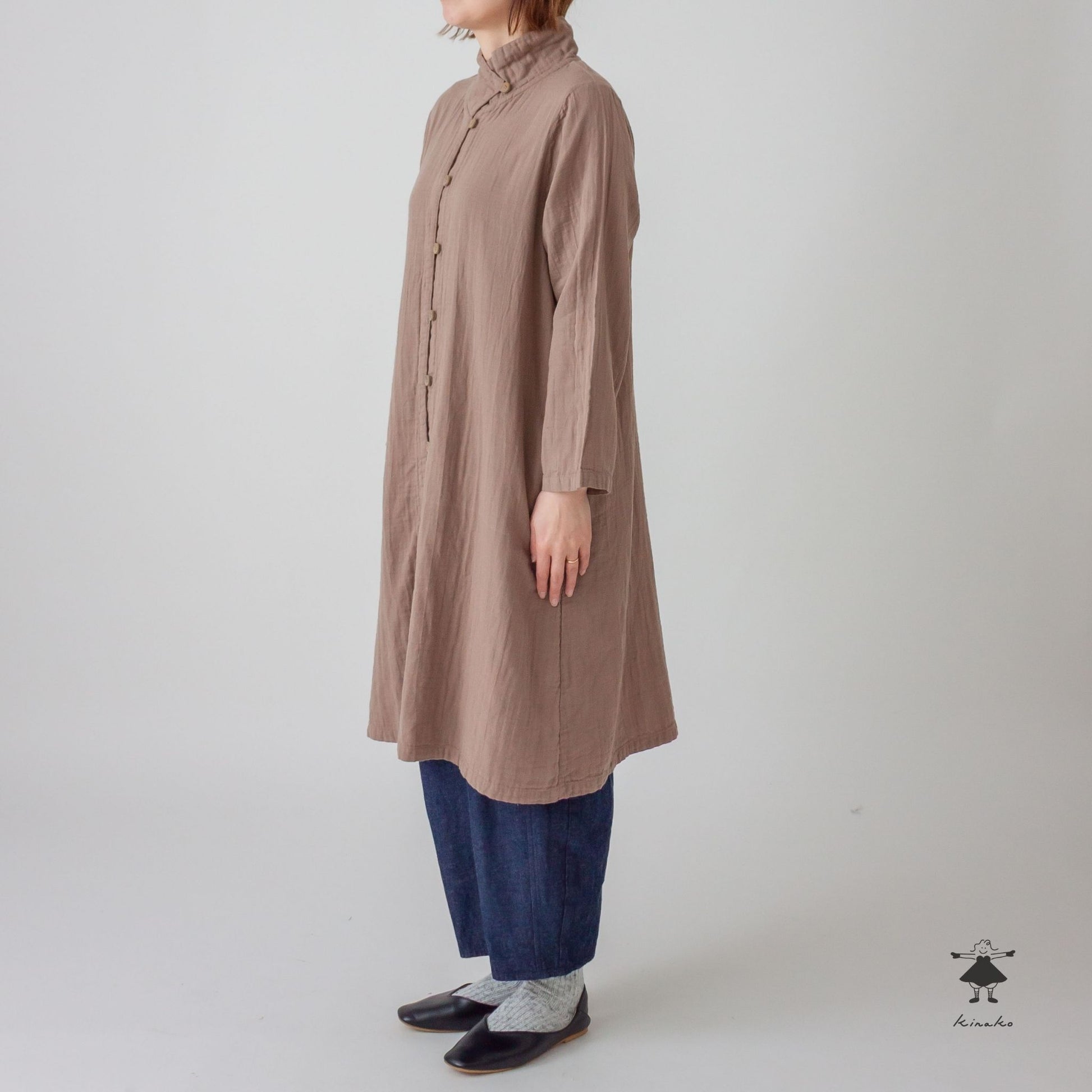 衿先に付けたボタンを留めるとハイネック風になる衿が特徴です。ボタンの開け閉めで印象を変えることができ、前開きで羽織物として使って頂ける商品です。左ポケット口にきなこちゃん刺しゅう有り。