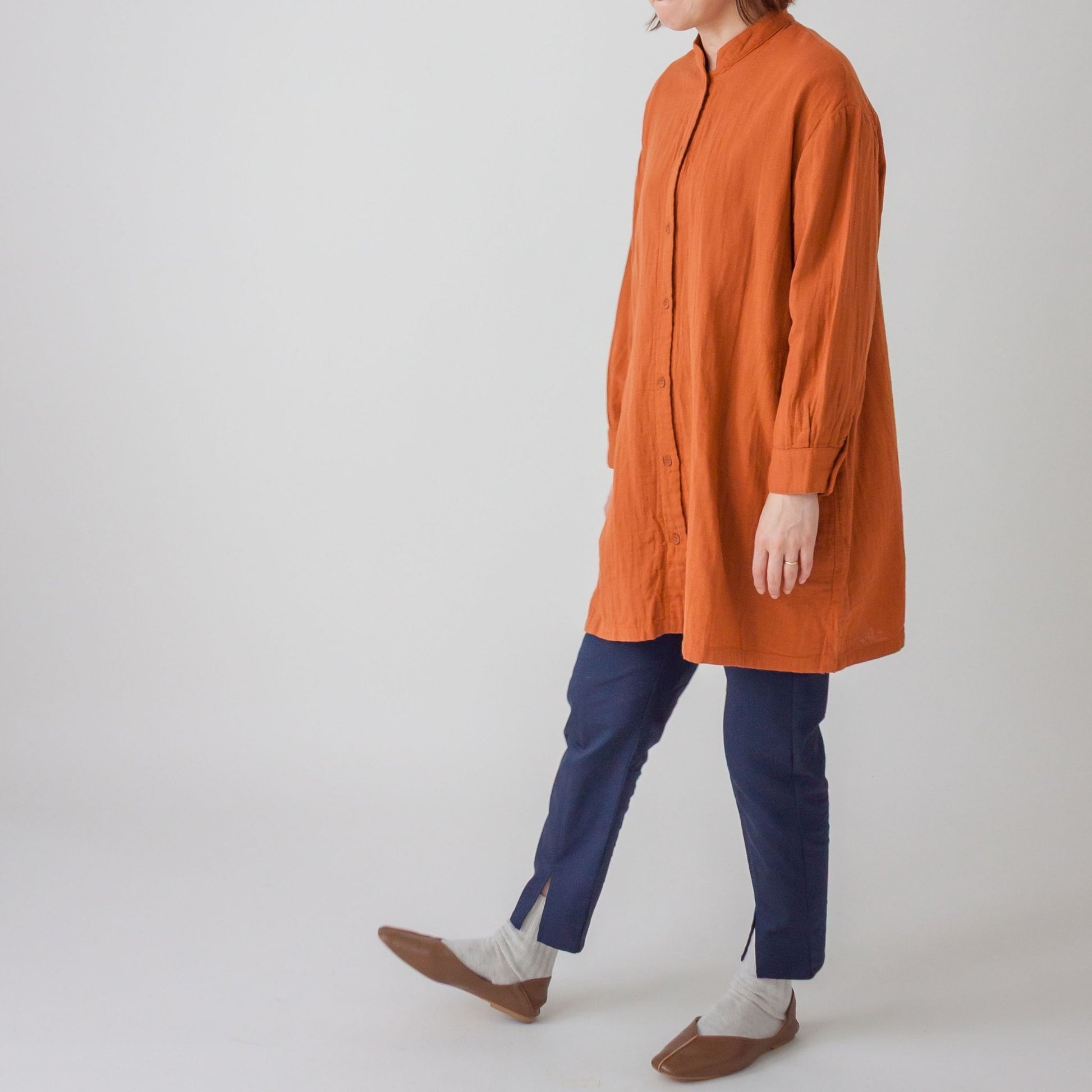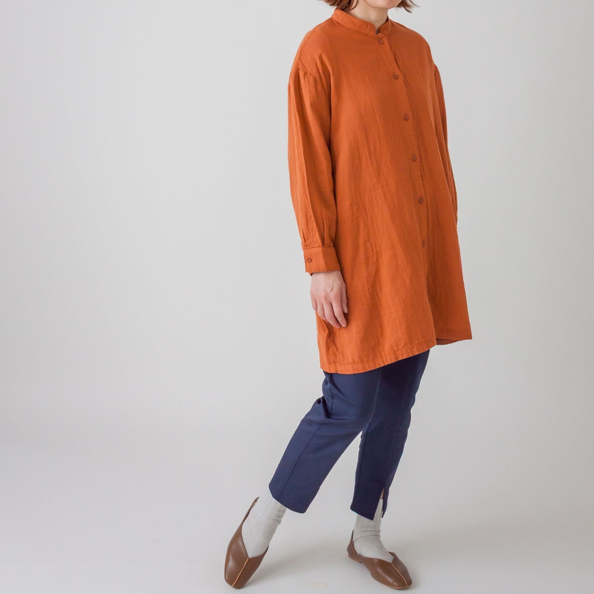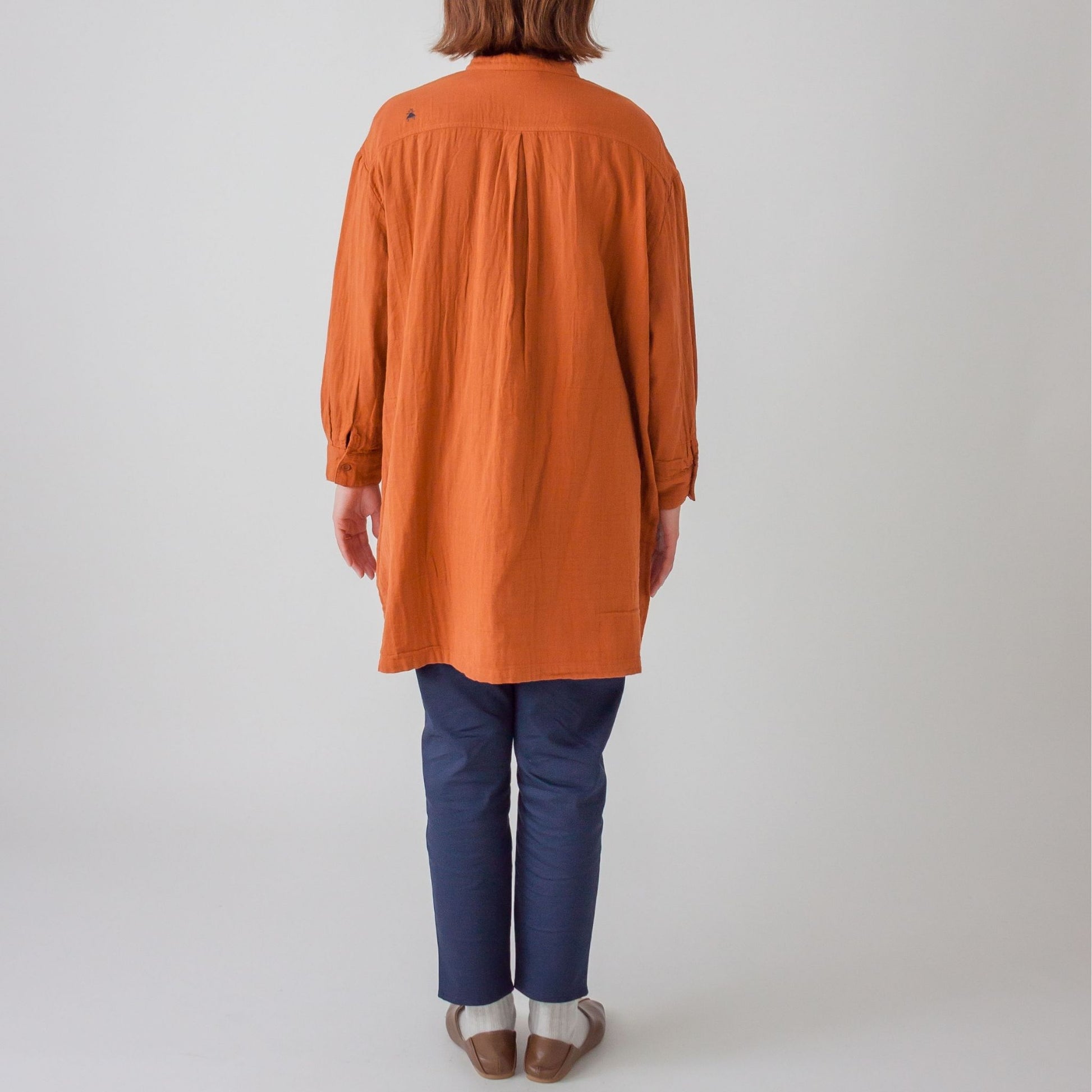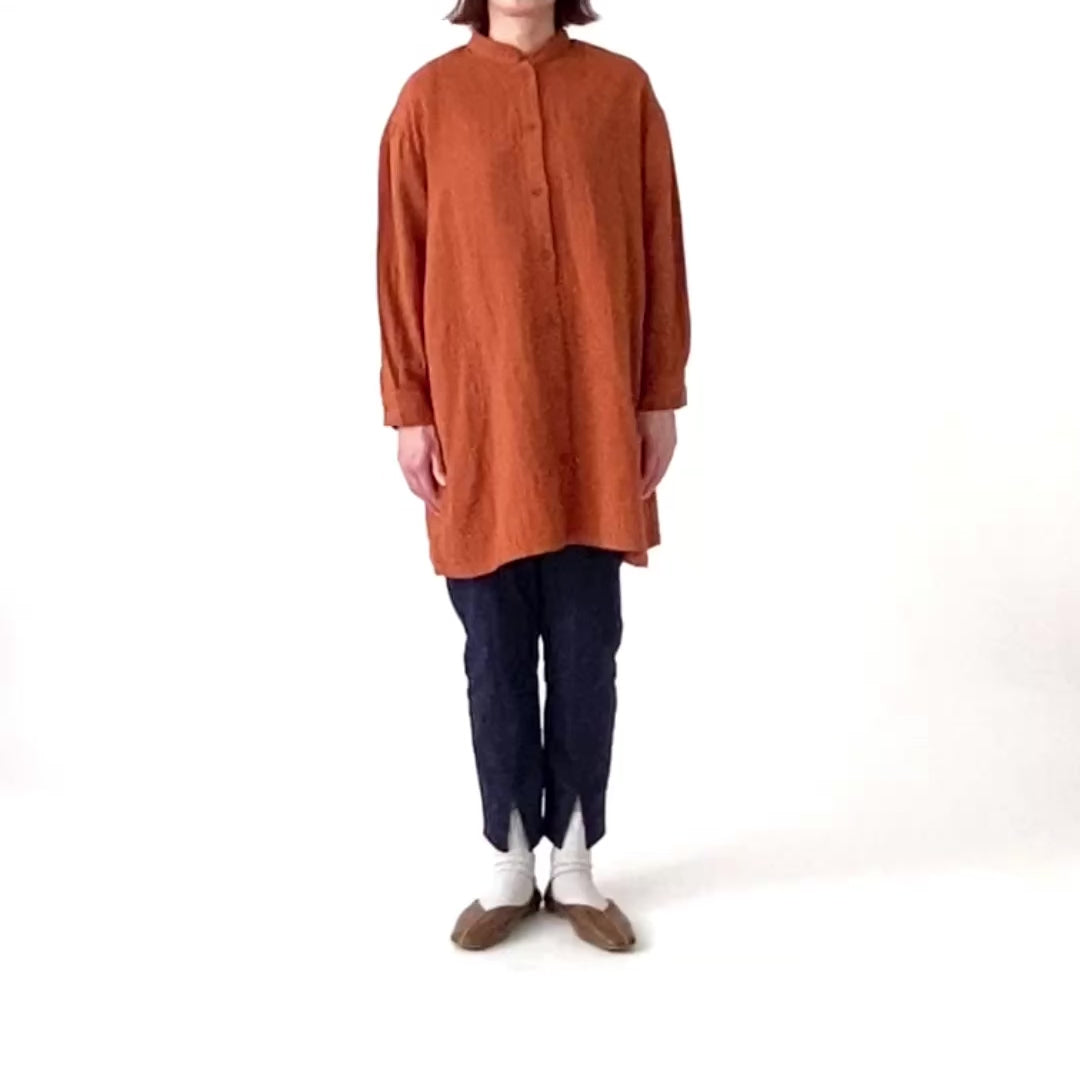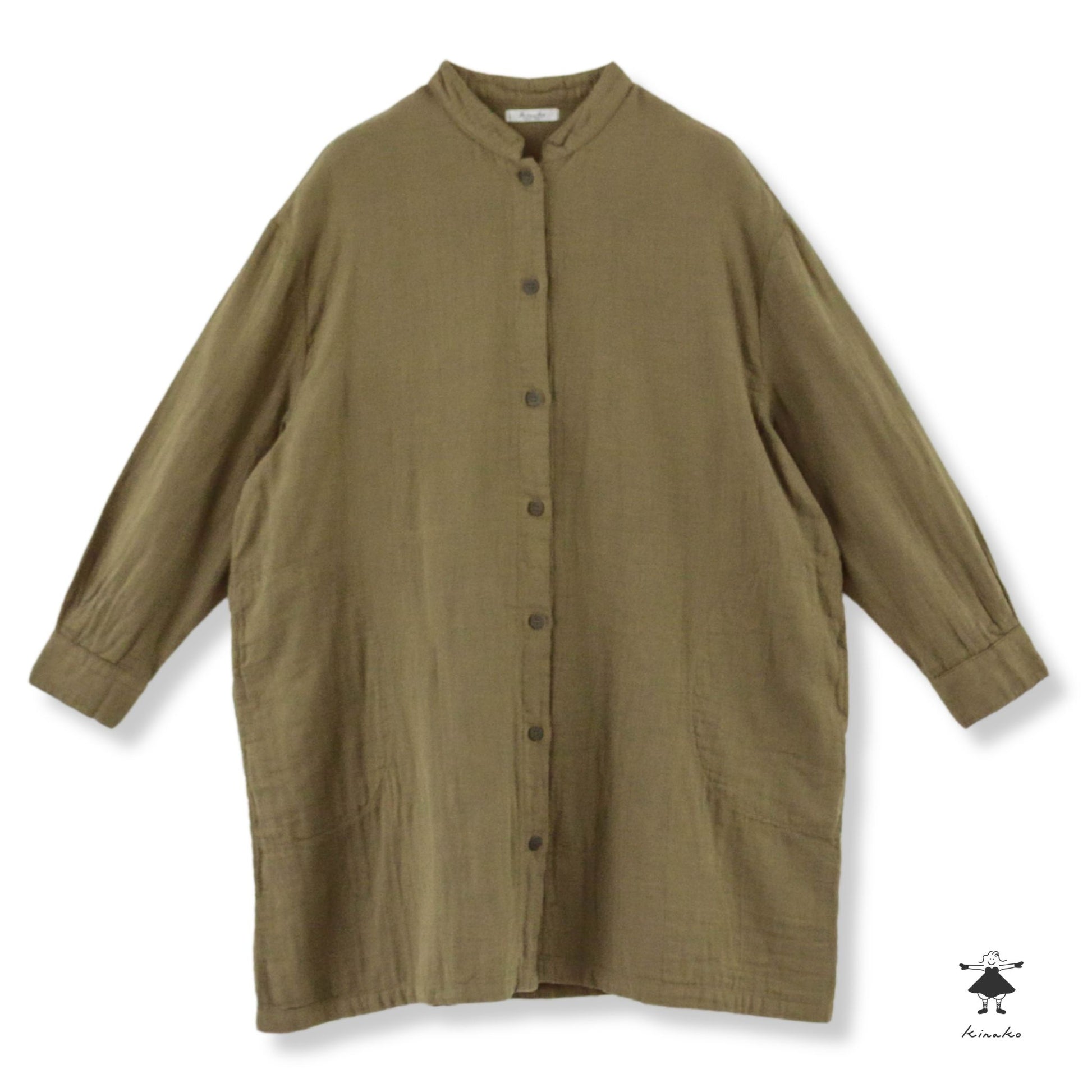 ゆったりとした身幅のチュニックブラウスです。裾にかけて広がりを抑えたシルエットでスッキリとした印象です。羽織物としても使える着やすい商品です。左後ろヨーク部分にきなこちゃん刺しゅう有り。