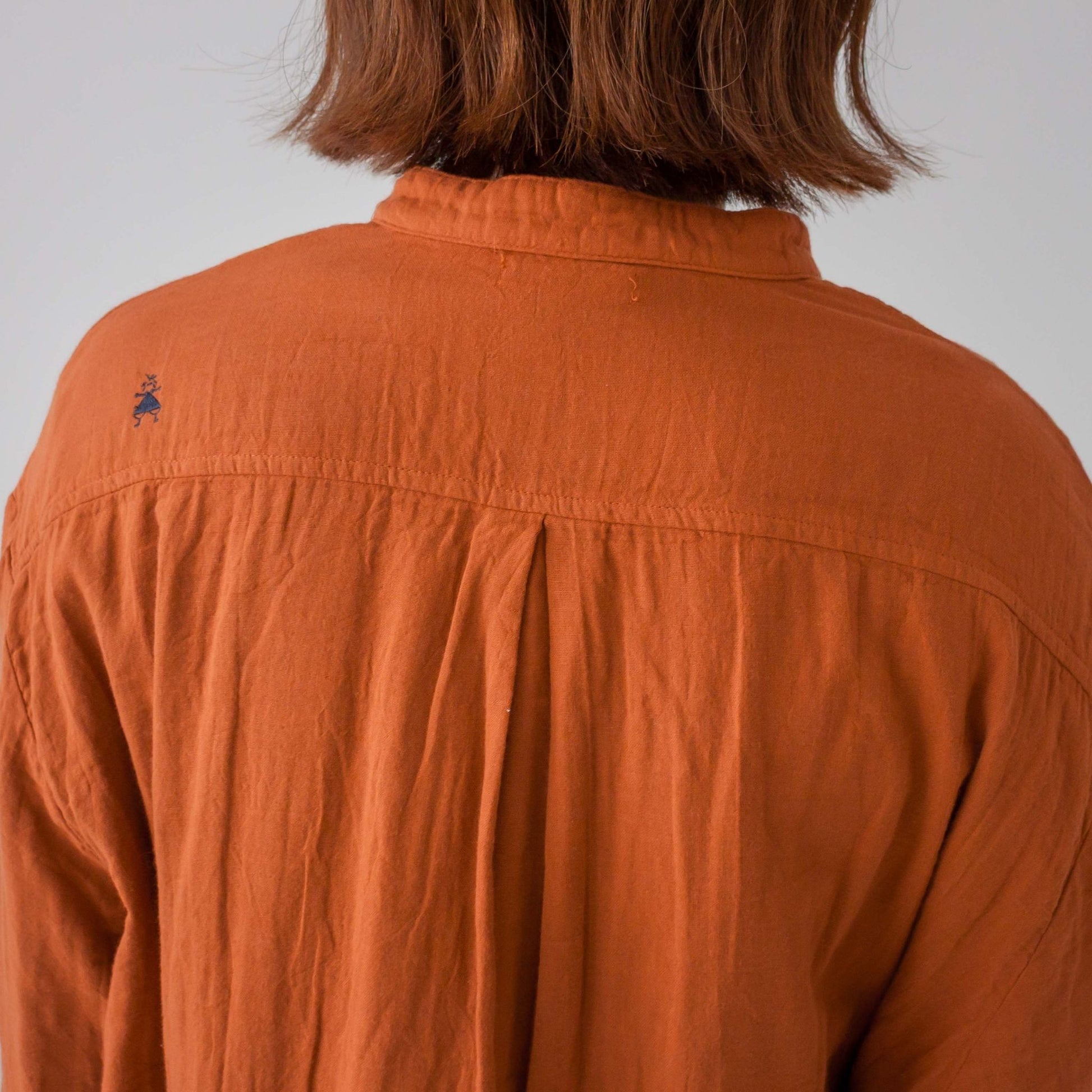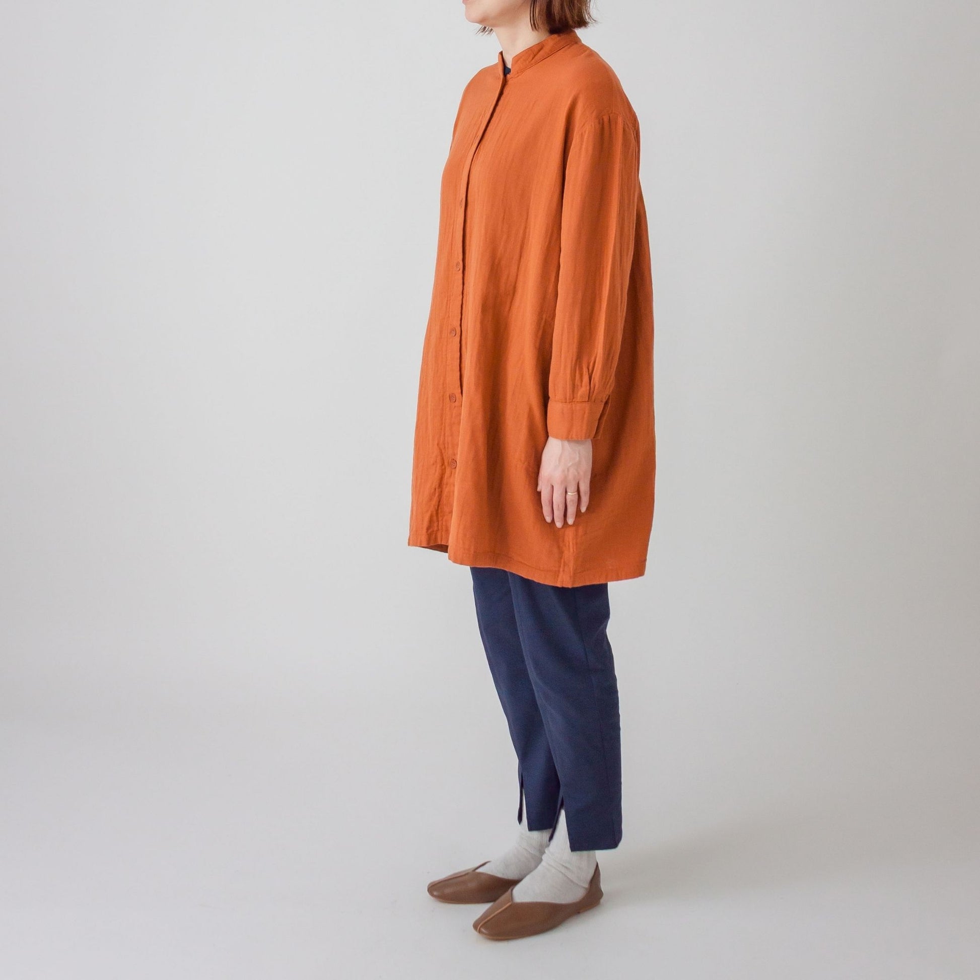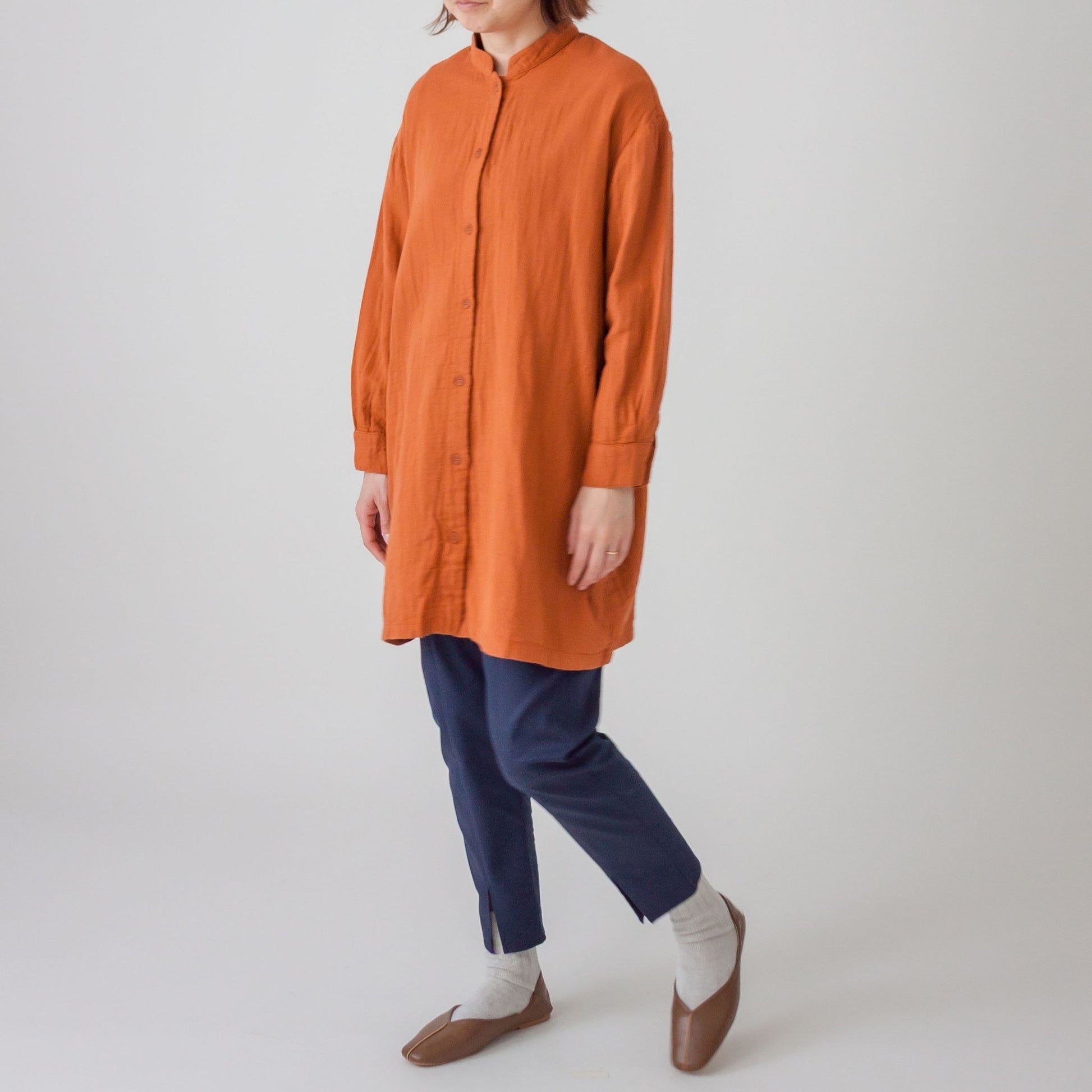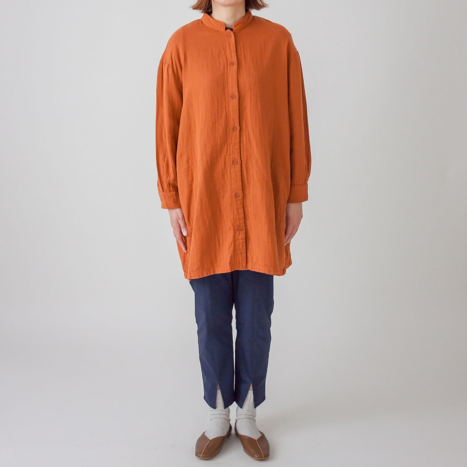 ゆったりとした身幅のチュニックブラウスです。裾にかけて広がりを抑えたシルエットでスッキリとした印象です。羽織物としても使える着やすい商品です。左後ろヨーク部分にきなこちゃん刺しゅう有り。
