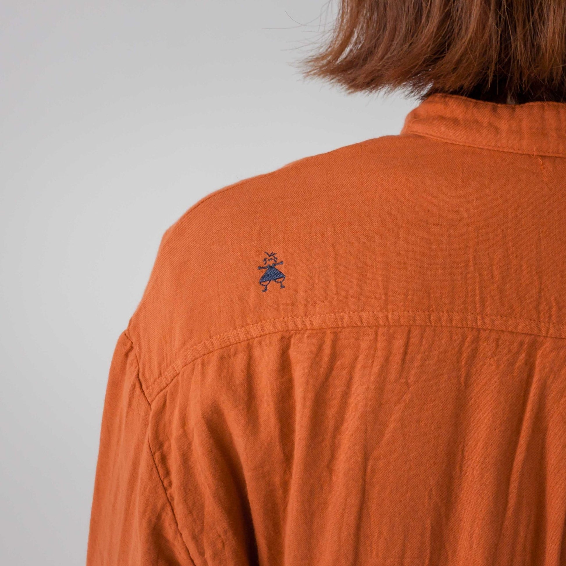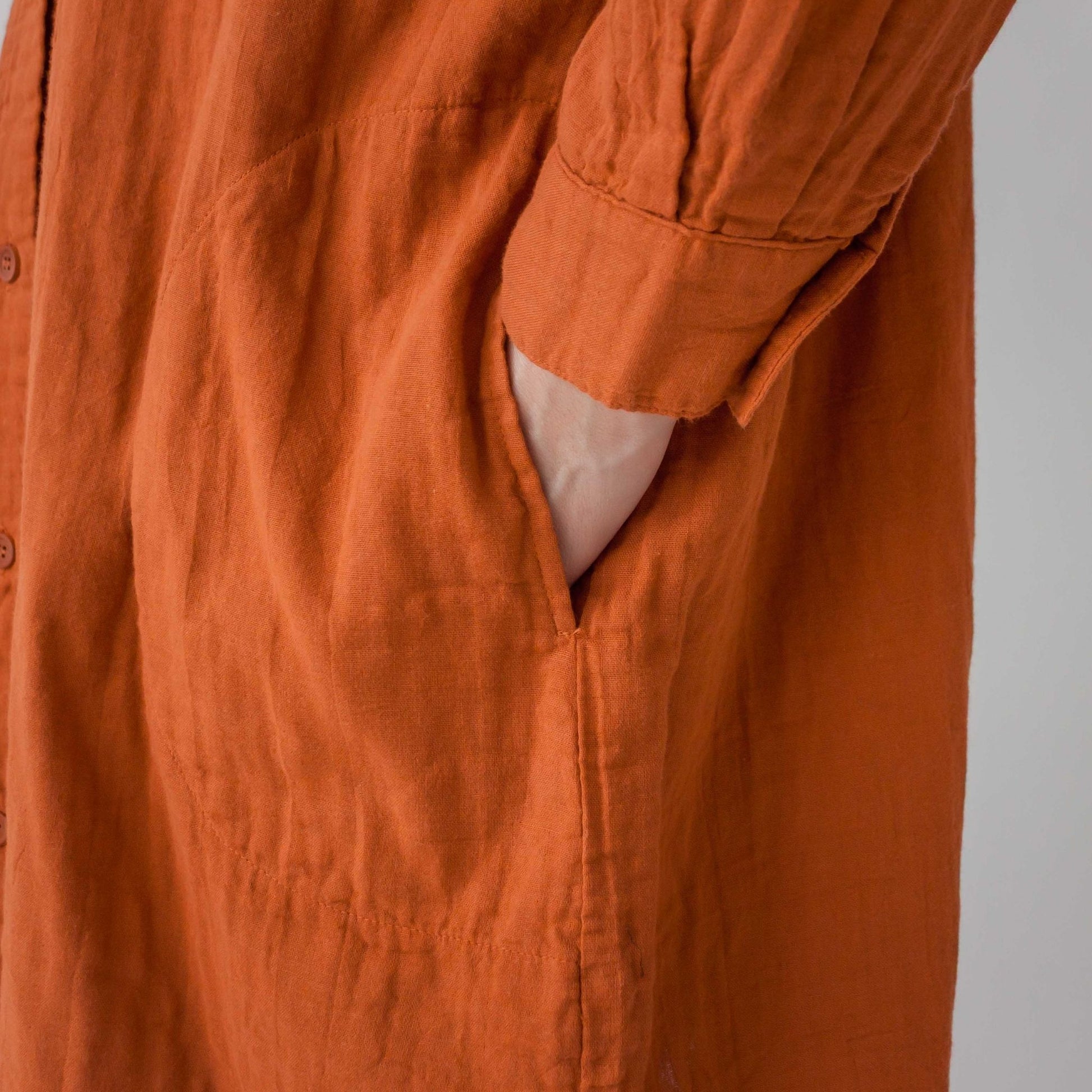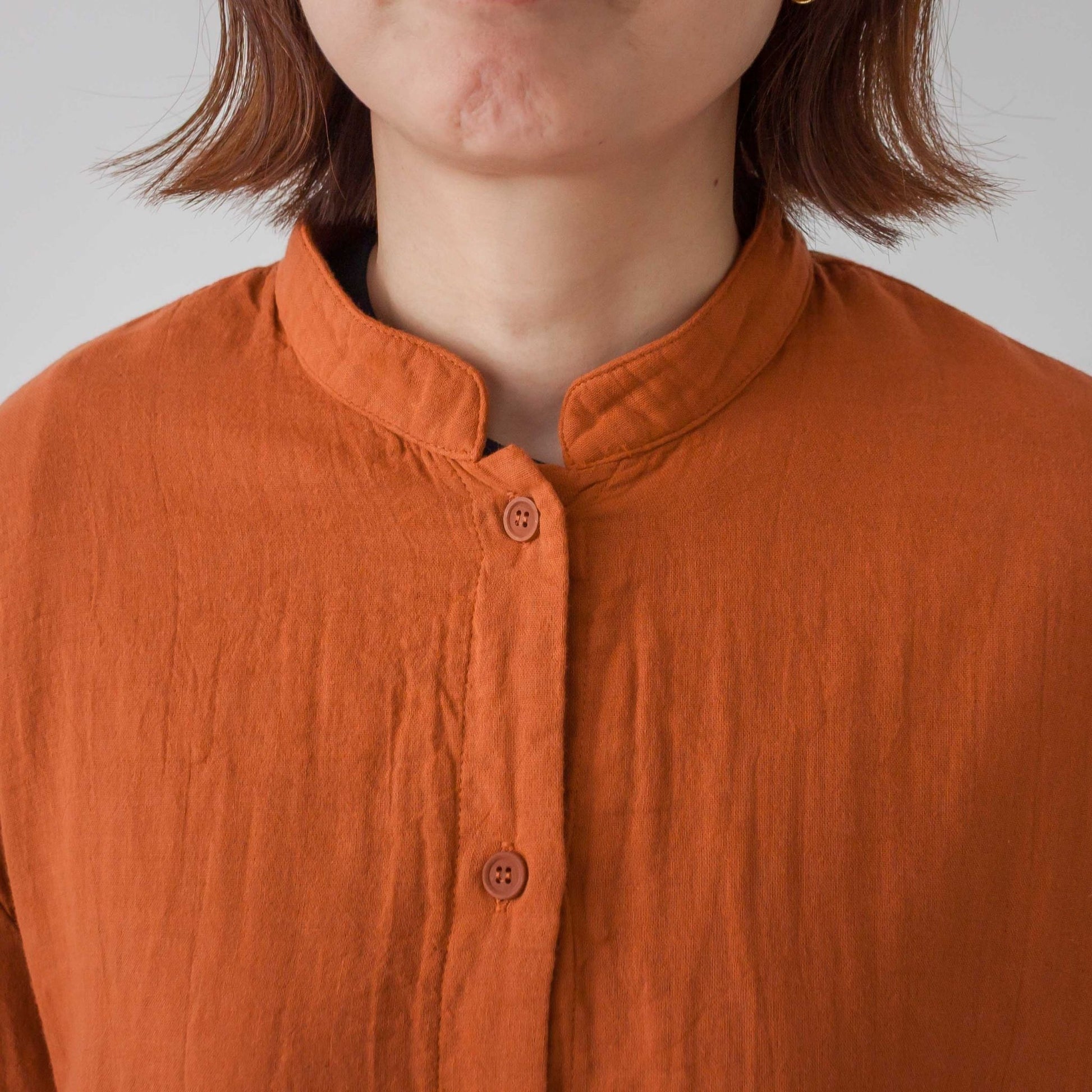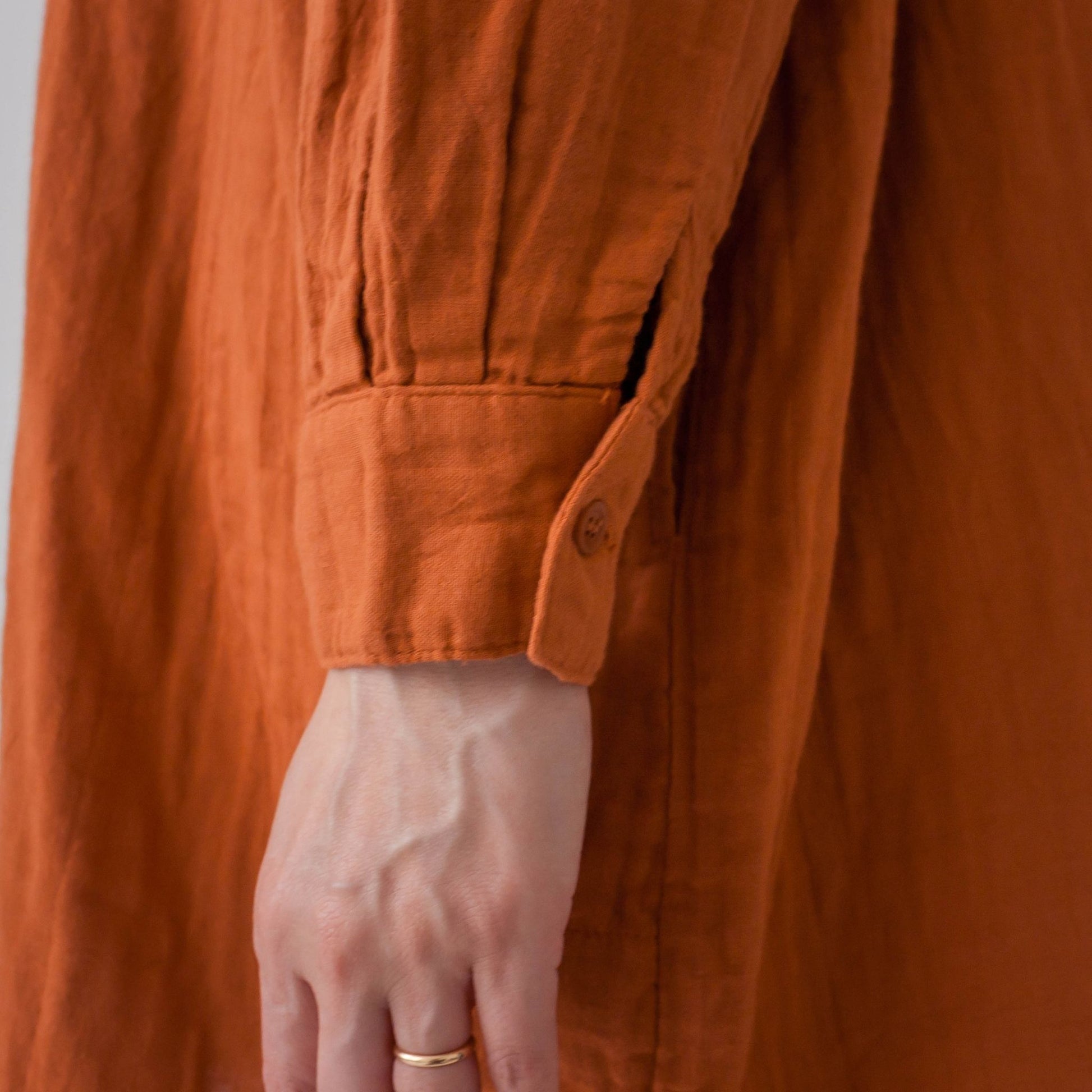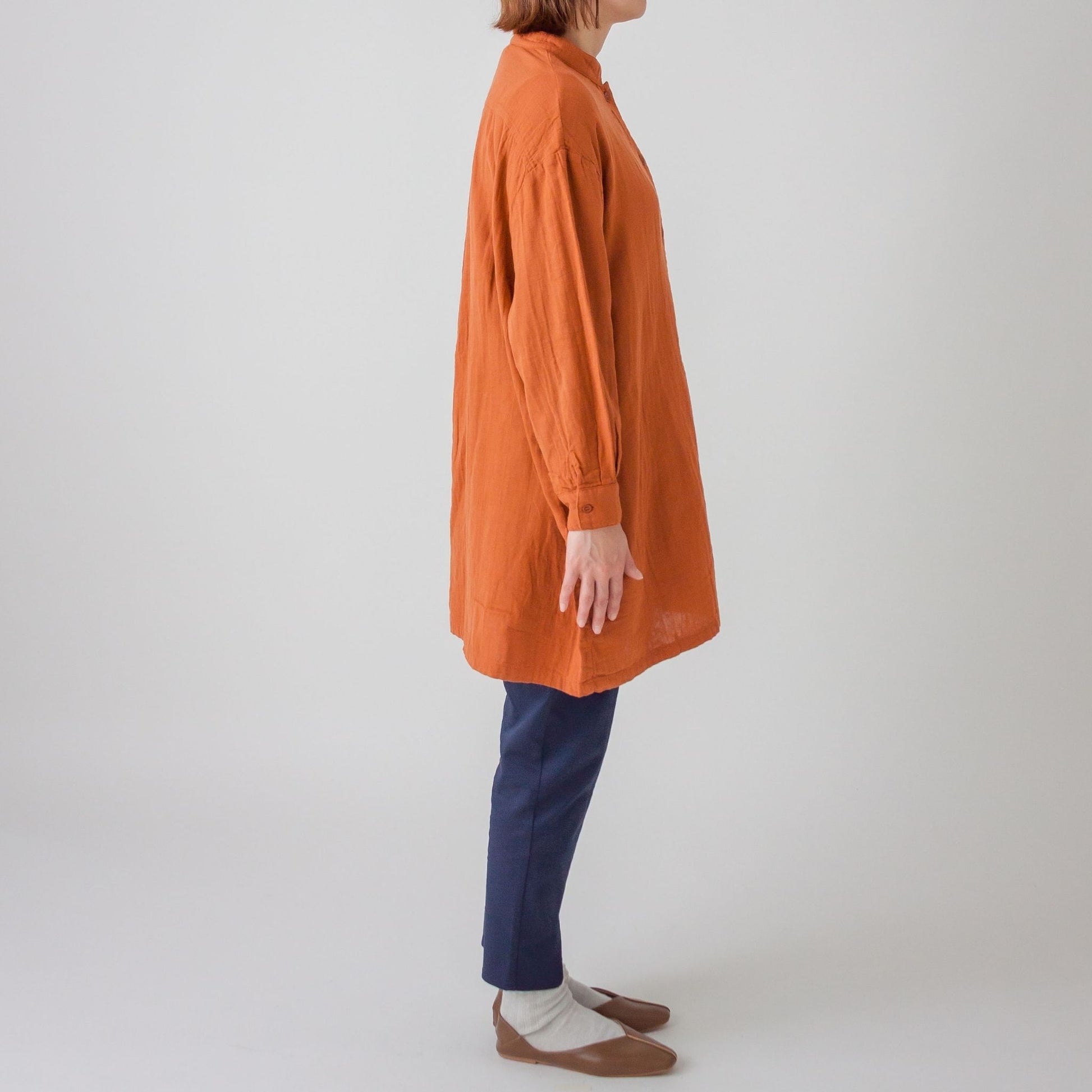ゆったりとした身幅のチュニックブラウスです。裾にかけて広がりを抑えたシルエットでスッキリとした印象です。羽織物としても使える着やすい商品です。左後ろヨーク部分にきなこちゃん刺しゅう有り。