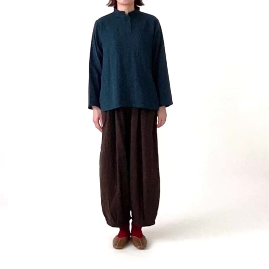 少し立ち上がった衿と大きめのボタンが特徴のプルオーバーです。合わせやすい着丈で色々なシルエットのボトムスとコーディネイトして頂けます。左ポケット部分にきなこちゃん刺しゅう有り。