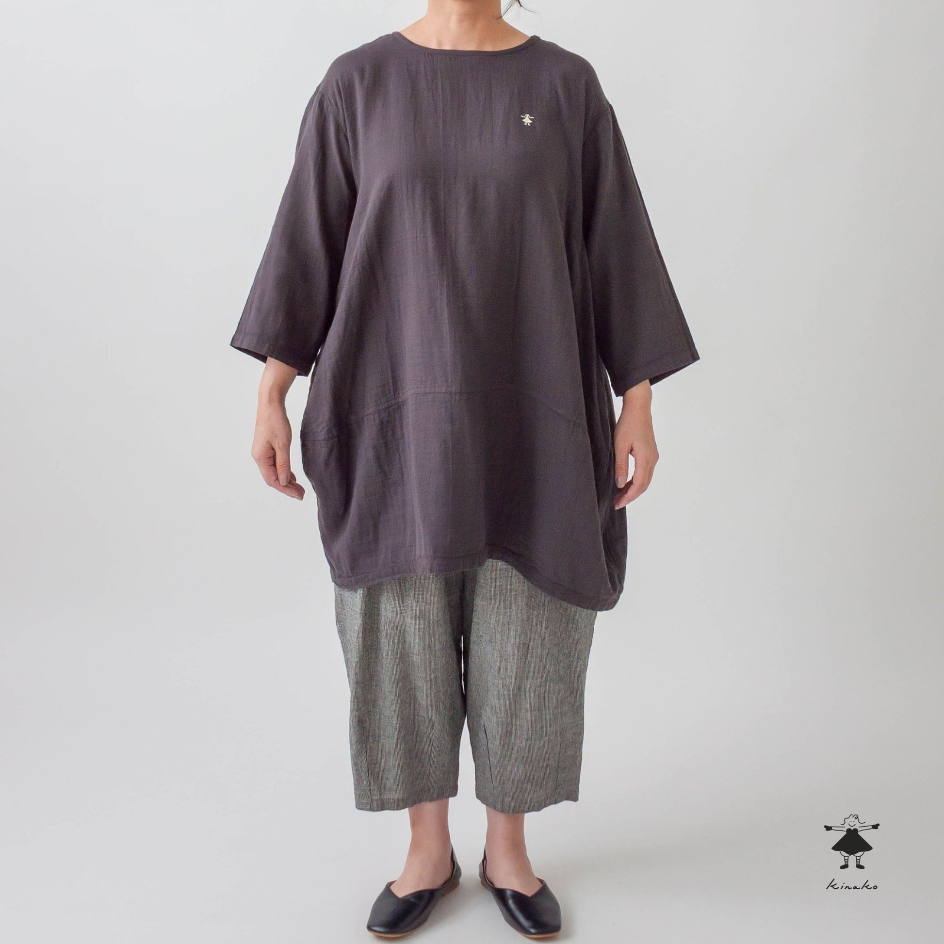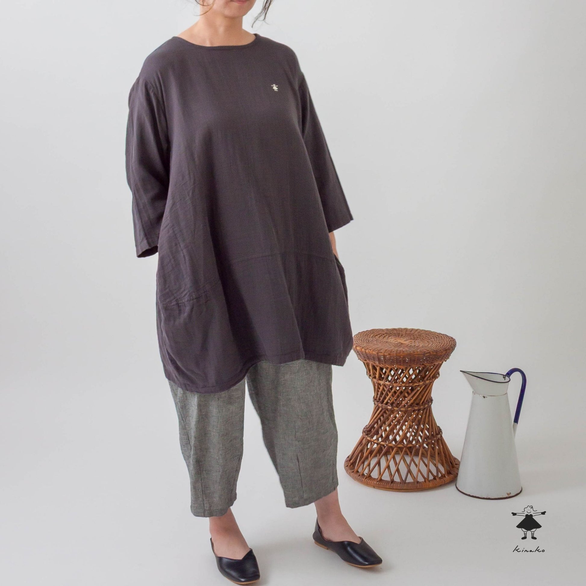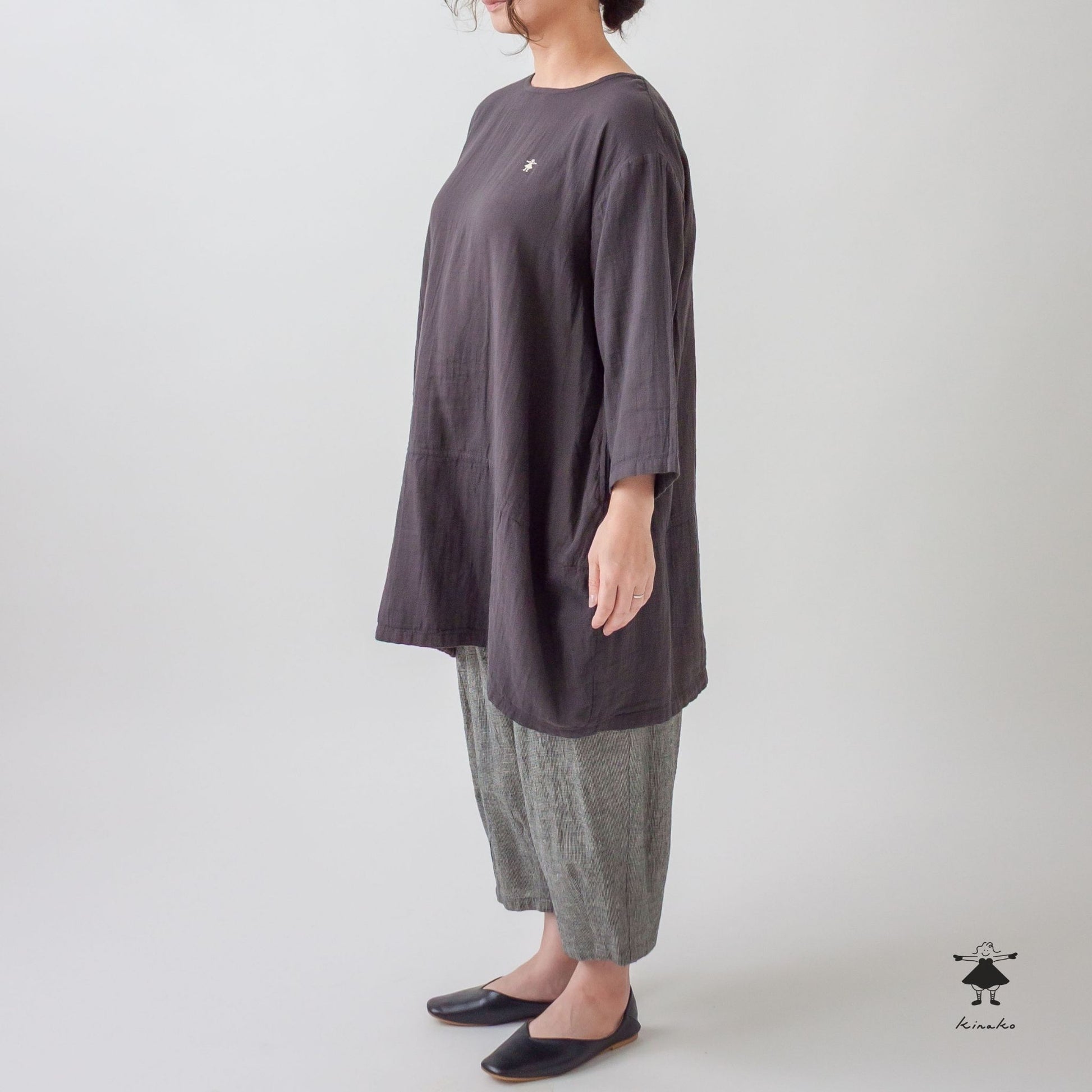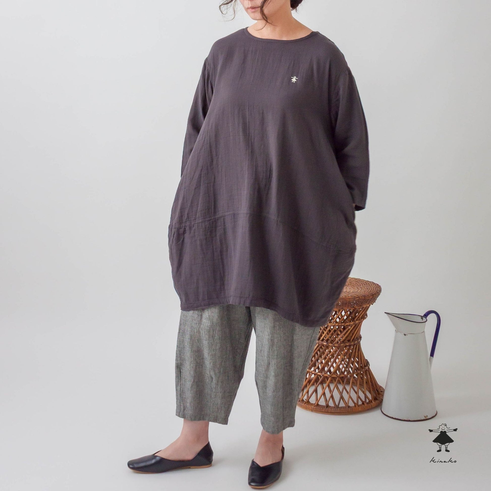 裾の切り替えによりバルーン型にデザインしたチュニックです。ゆったりとしたサイズ感で、シンプルなデザインですがシルエットに特徴があります。衿後ろにゴムを入れ衿開きを抑え、脱ぎ着しやすい仕様にしています。左胸にきなこちゃん刺しゅう有り。