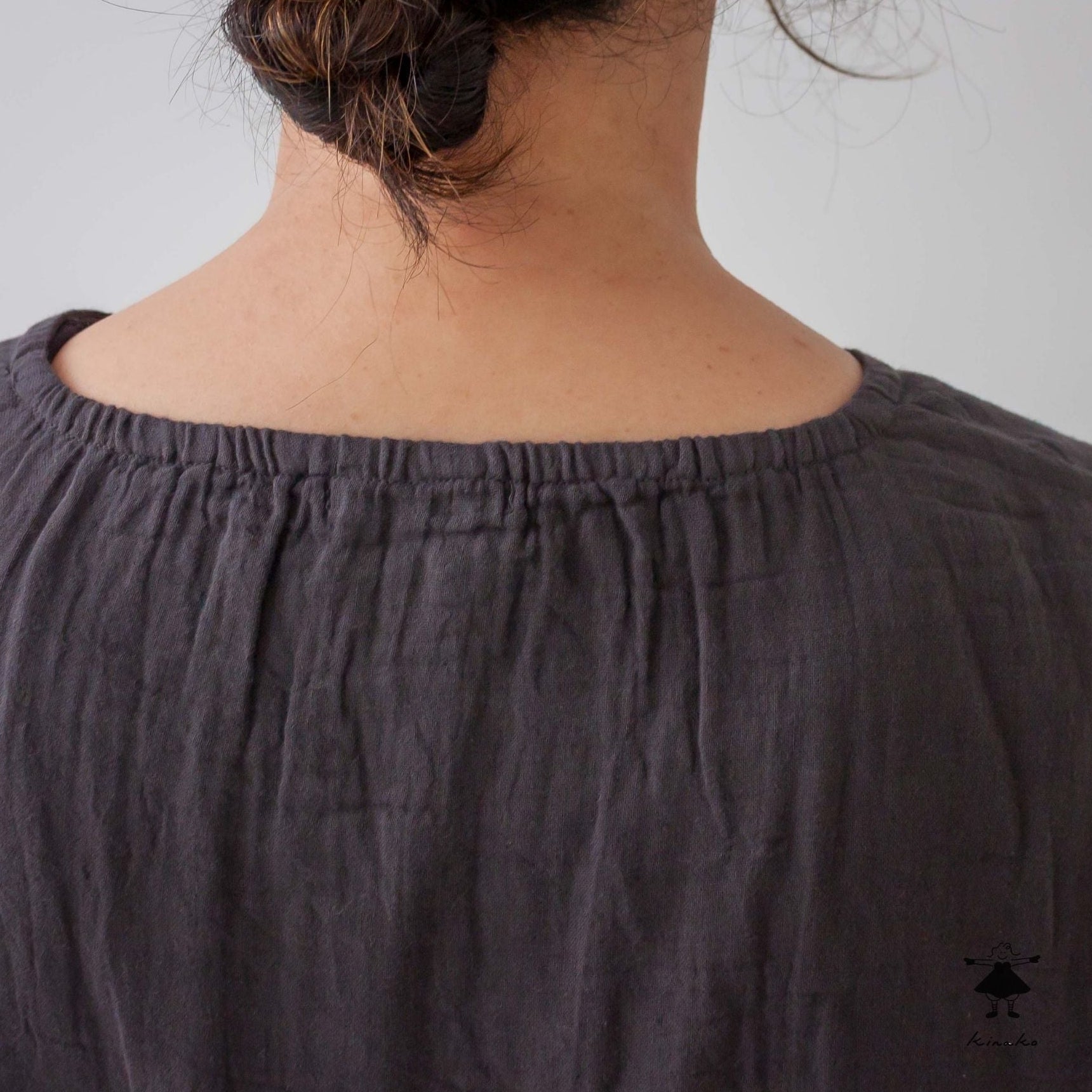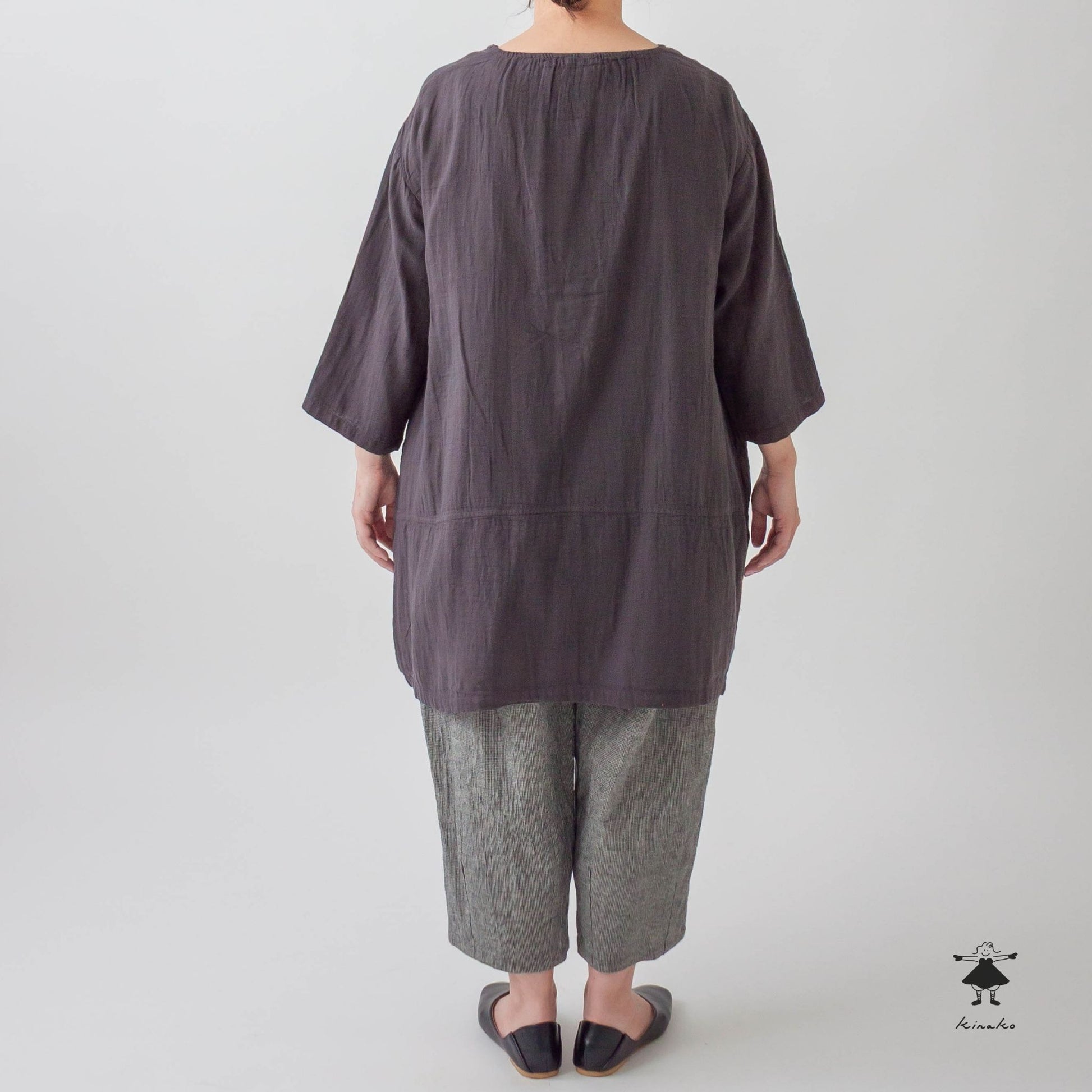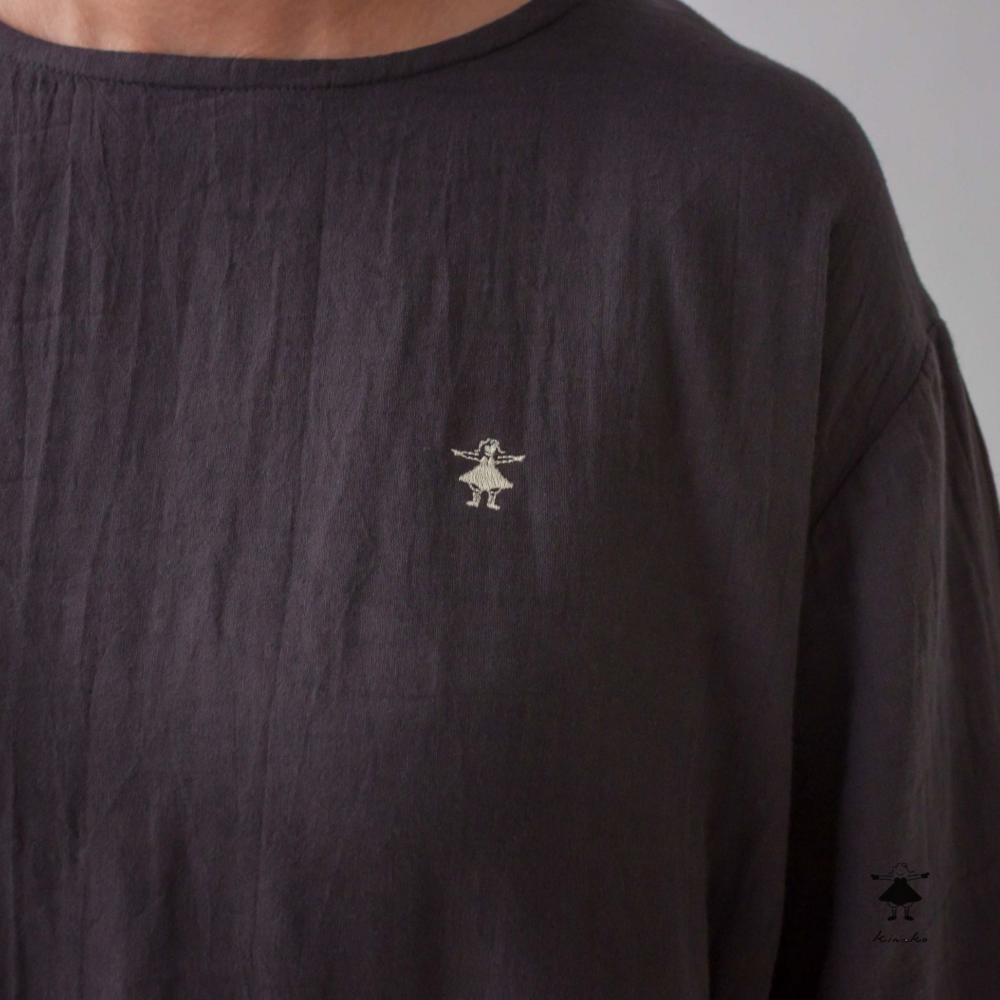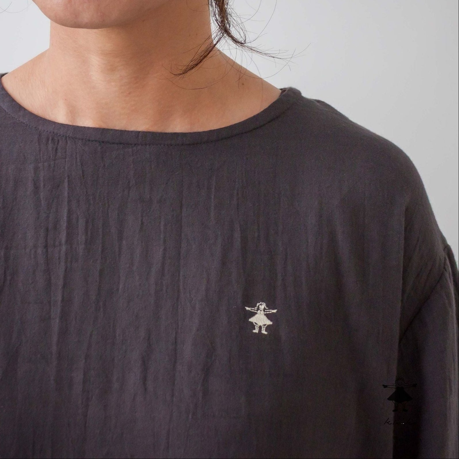 裾の切り替えによりバルーン型にデザインしたチュニックです。ゆったりとしたサイズ感で、シンプルなデザインですがシルエットに特徴があります。衿後ろにゴムを入れ衿開きを抑え、脱ぎ着しやすい仕様にしています。左胸にきなこちゃん刺しゅう有り。