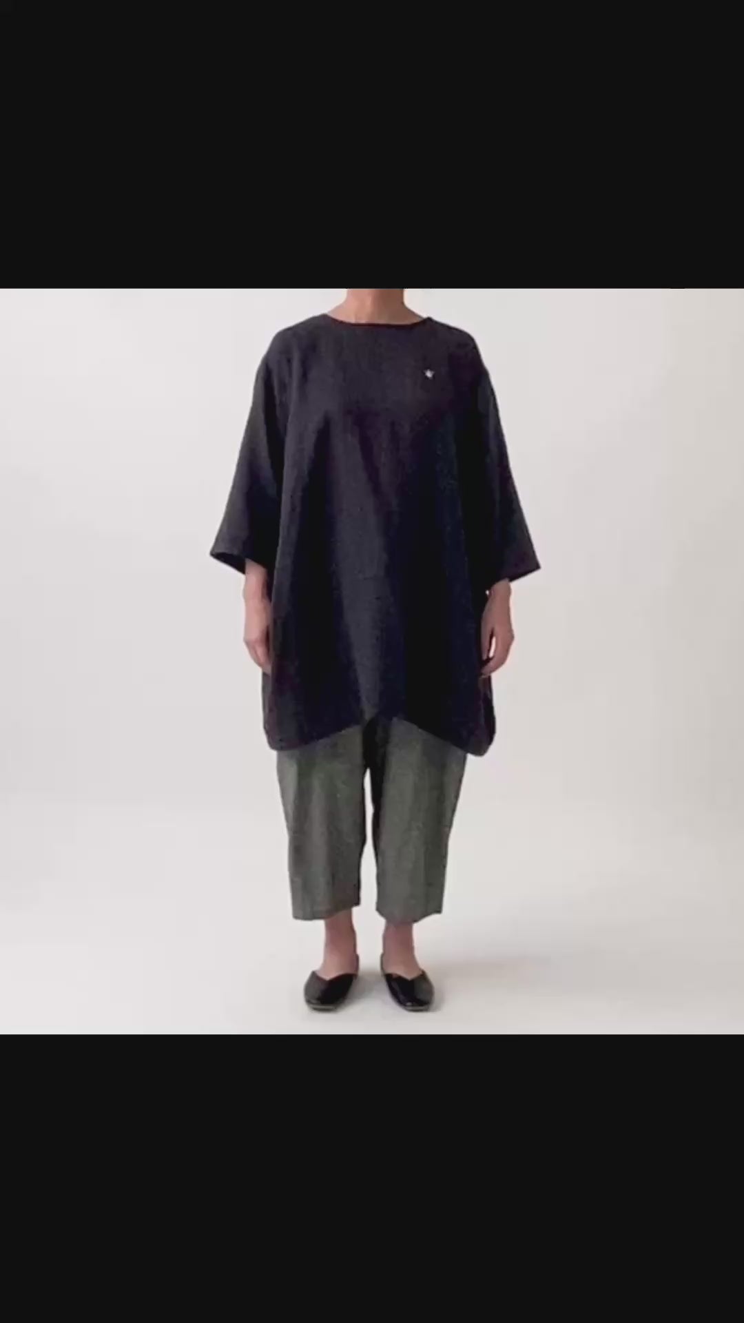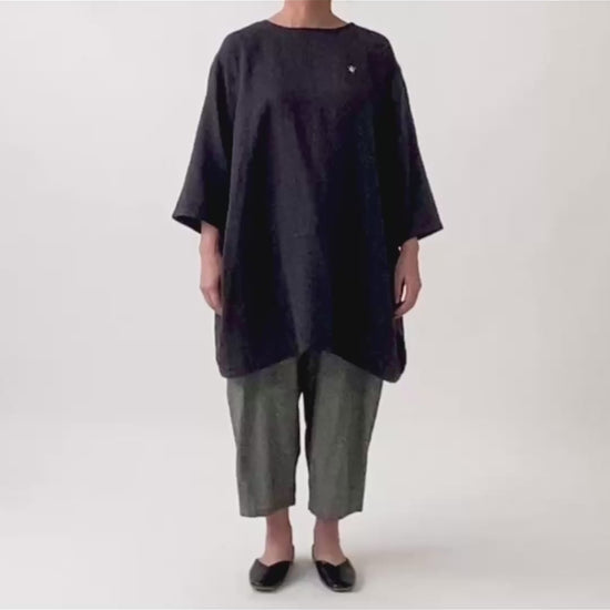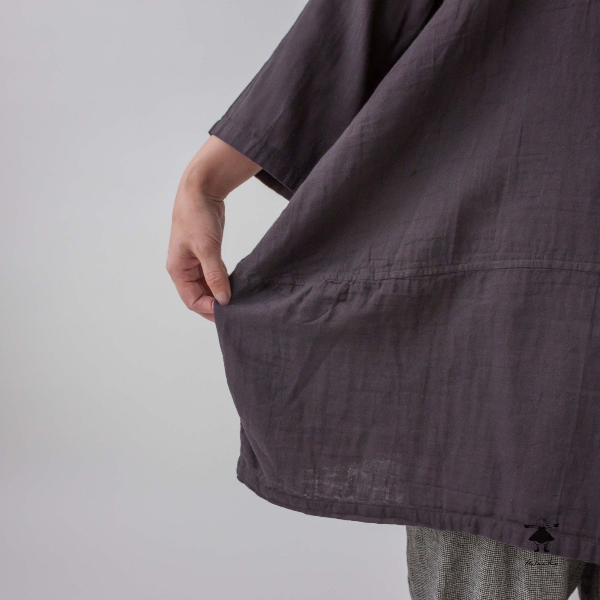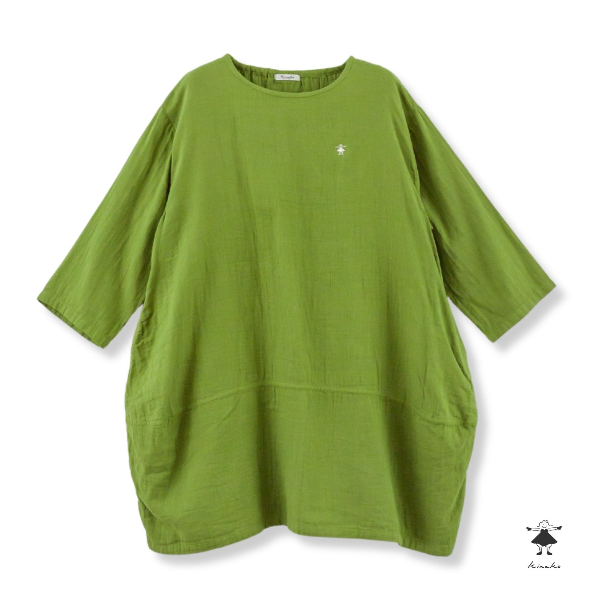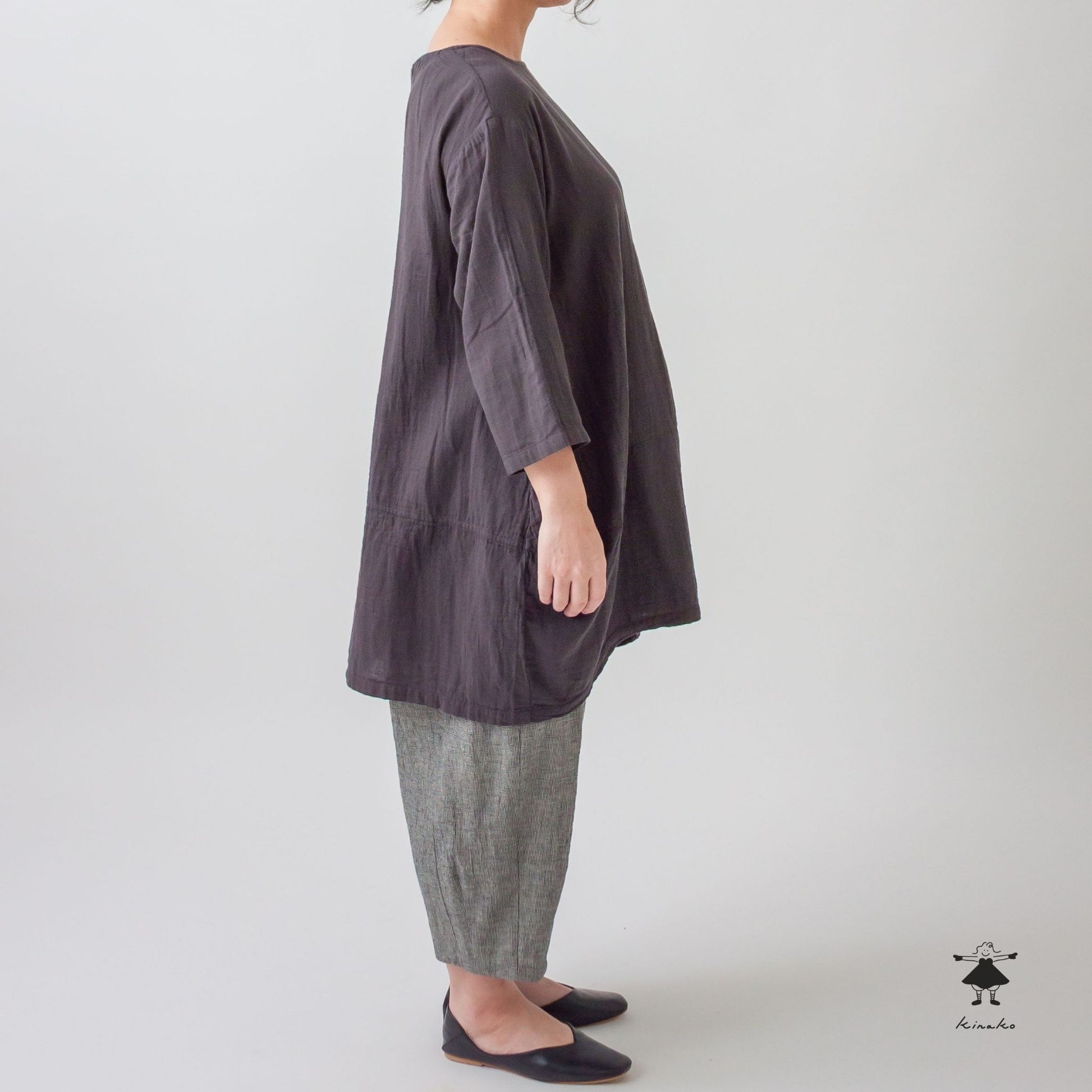 裾の切り替えによりバルーン型にデザインしたチュニックです。ゆったりとしたサイズ感で、シンプルなデザインですがシルエットに特徴があります。衿後ろにゴムを入れ衿開きを抑え、脱ぎ着しやすい仕様にしています。左胸にきなこちゃん刺しゅう有り。