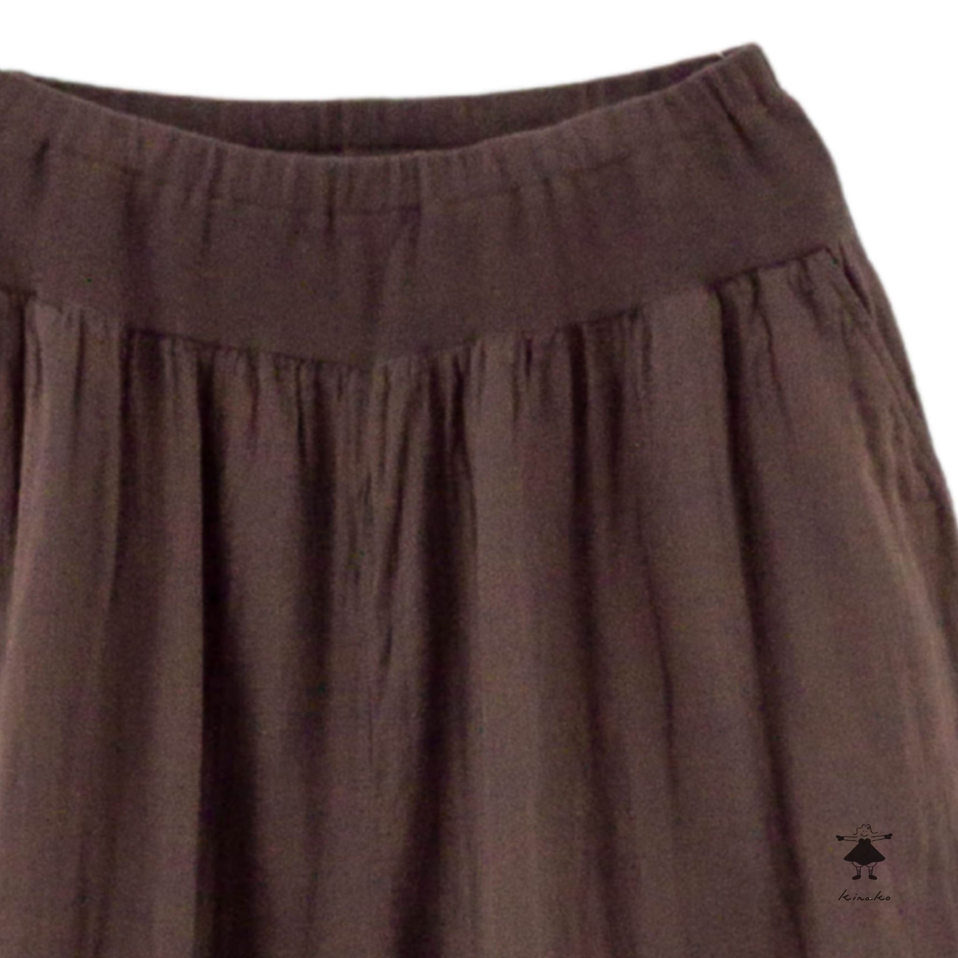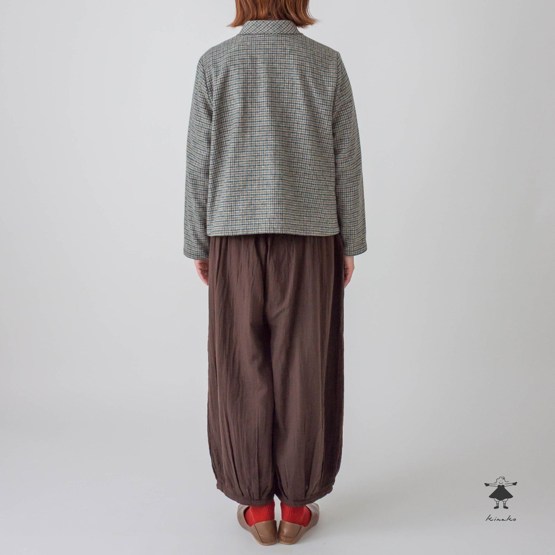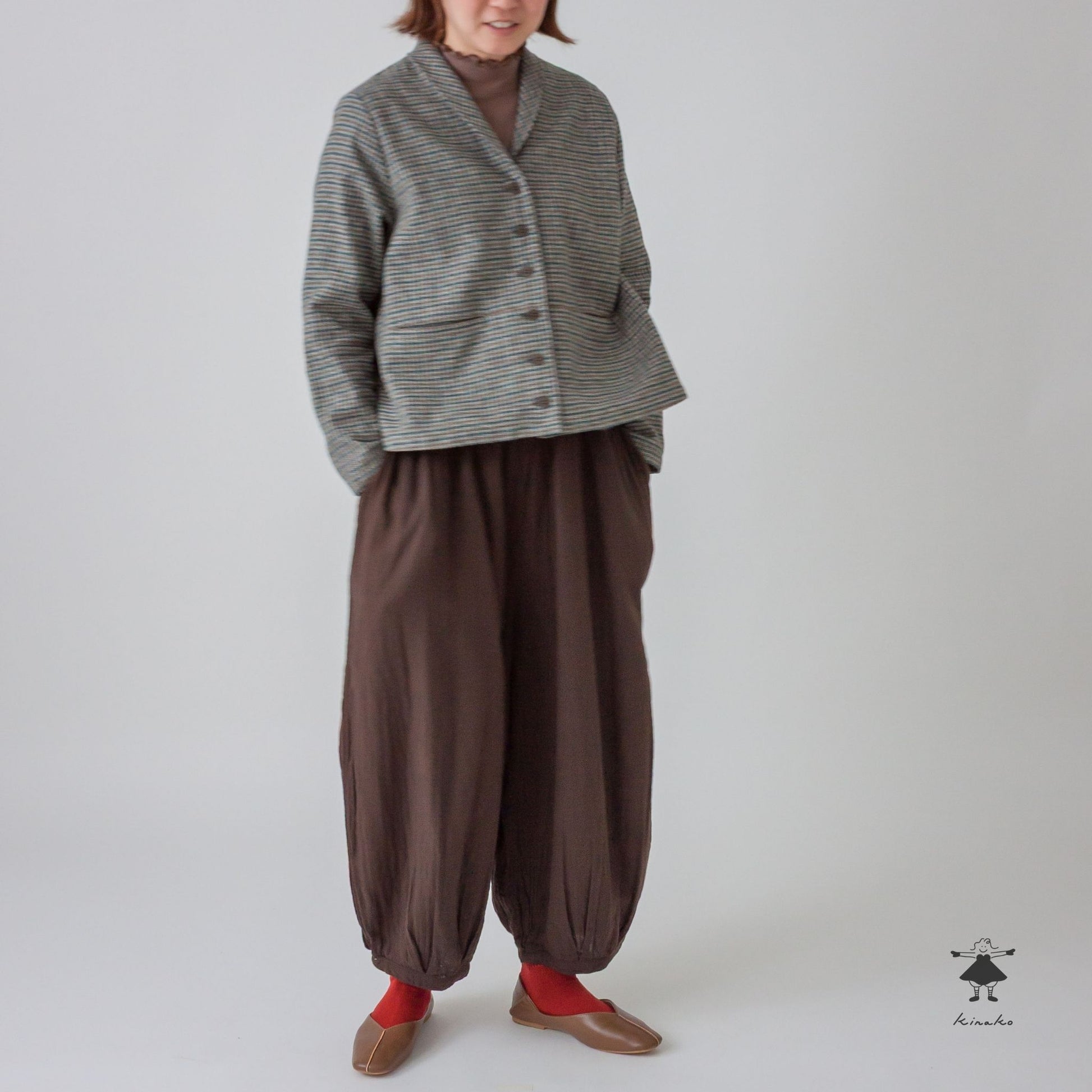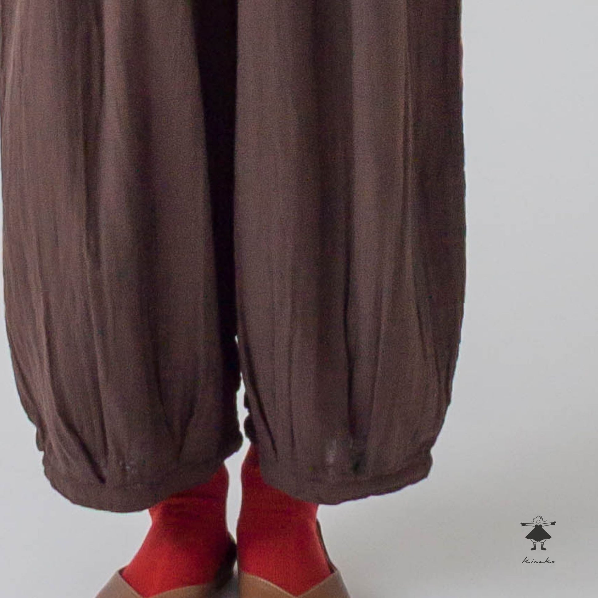 ガーゼ生地をたっぷり使ったバルーン型パンツです。ウエスト部分はテレコ生地を使いスッキリした見た目とお腹を包むような優しい履き心地が特徴です。裾口にタックを入れて丸いシルエットに仕上げました。