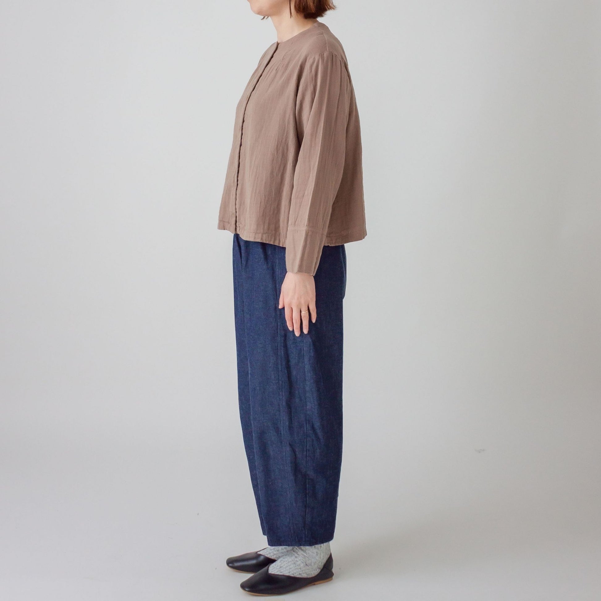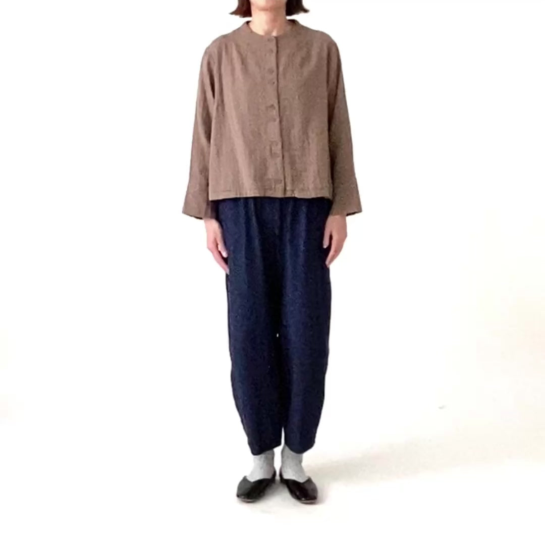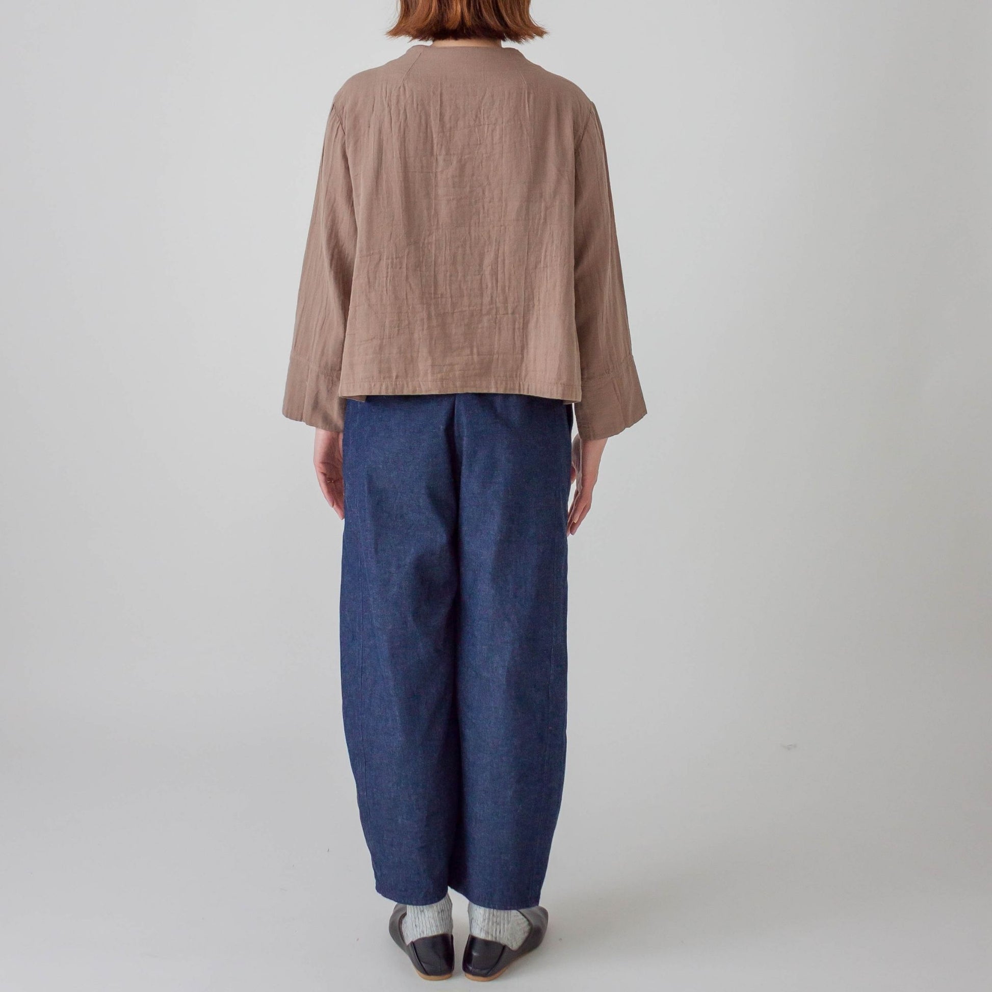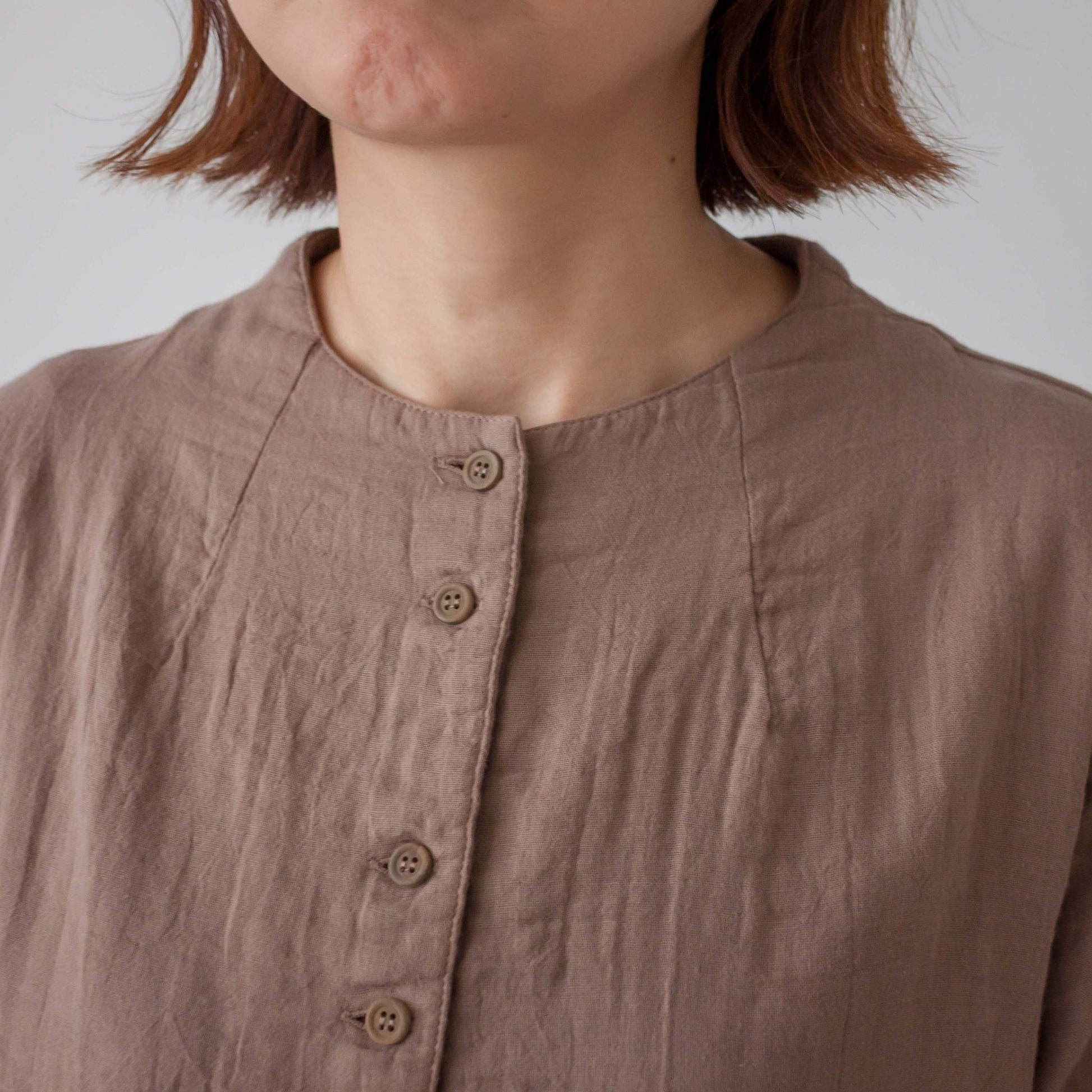少し反りあがったボトルネック風のショートブラウスです。衿と胸にダーツを入れ細かい形に拘った一着です。袖口は折り返しできる仕様です。