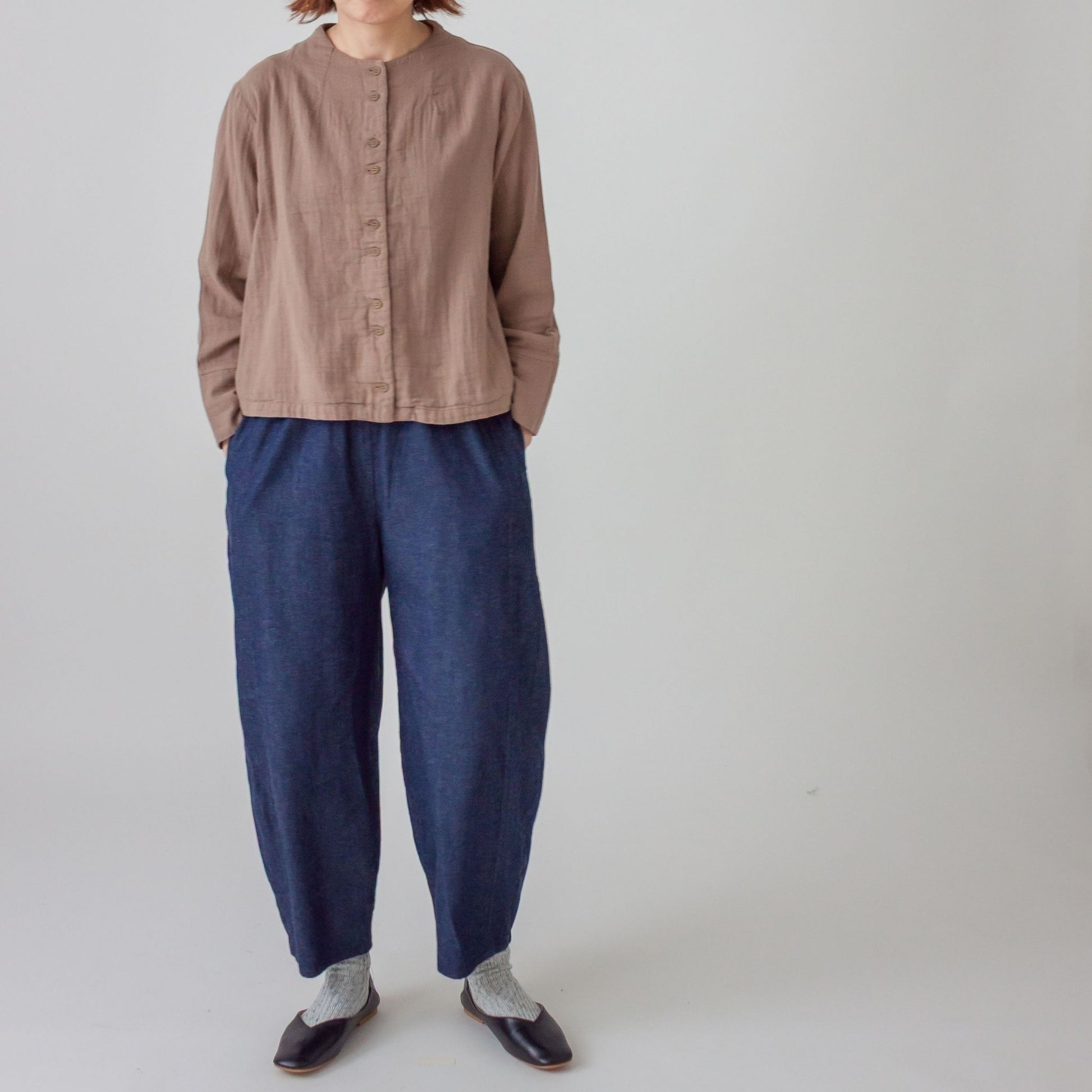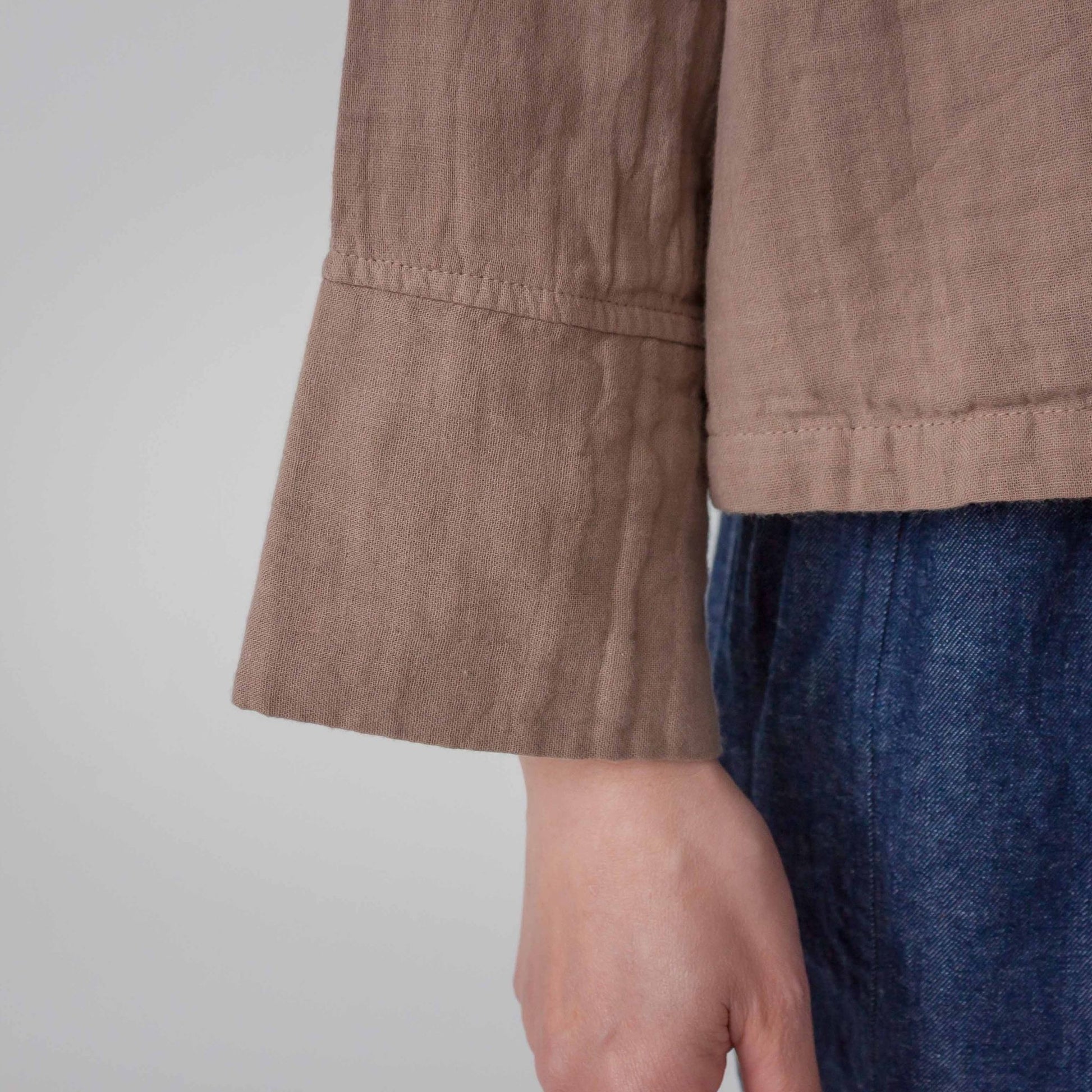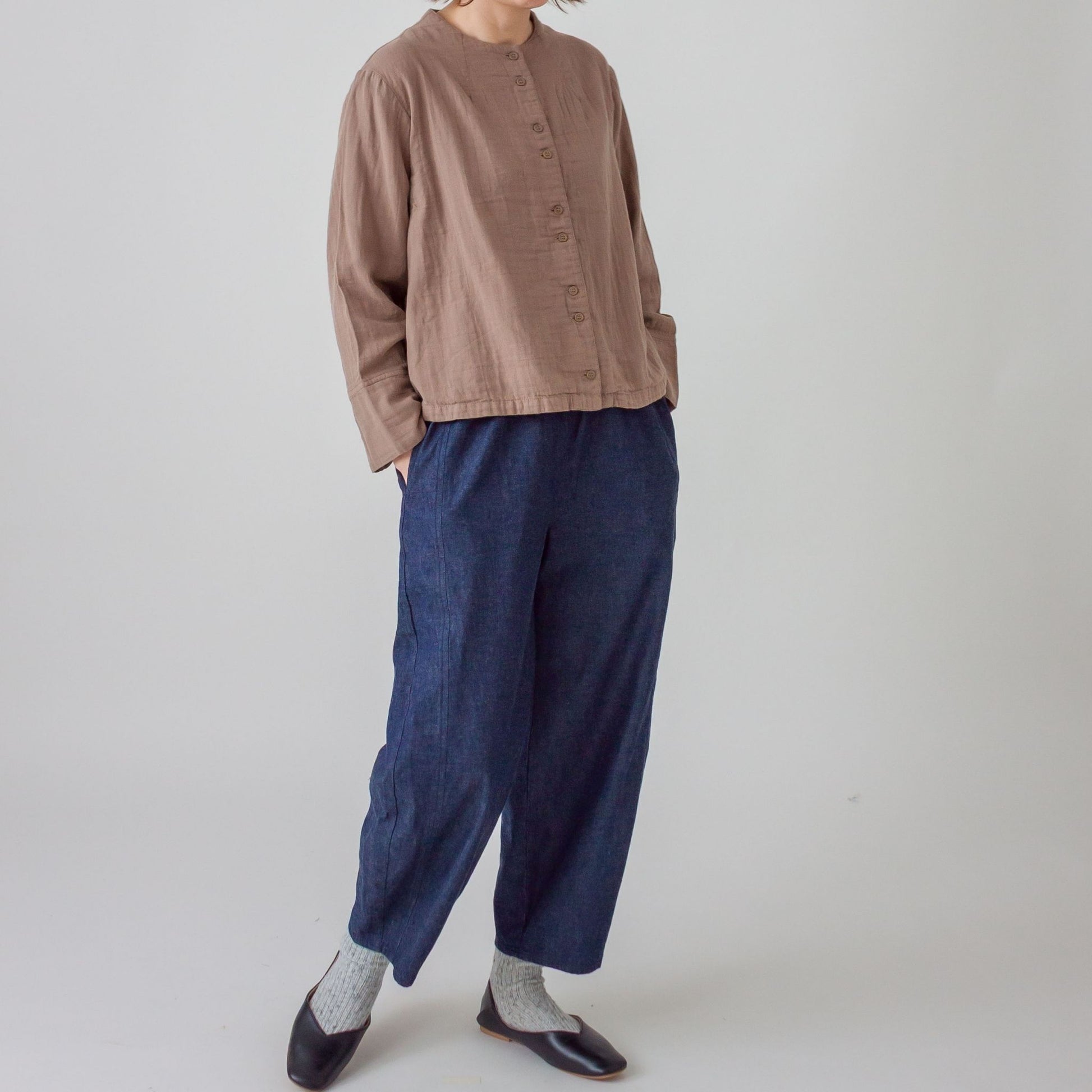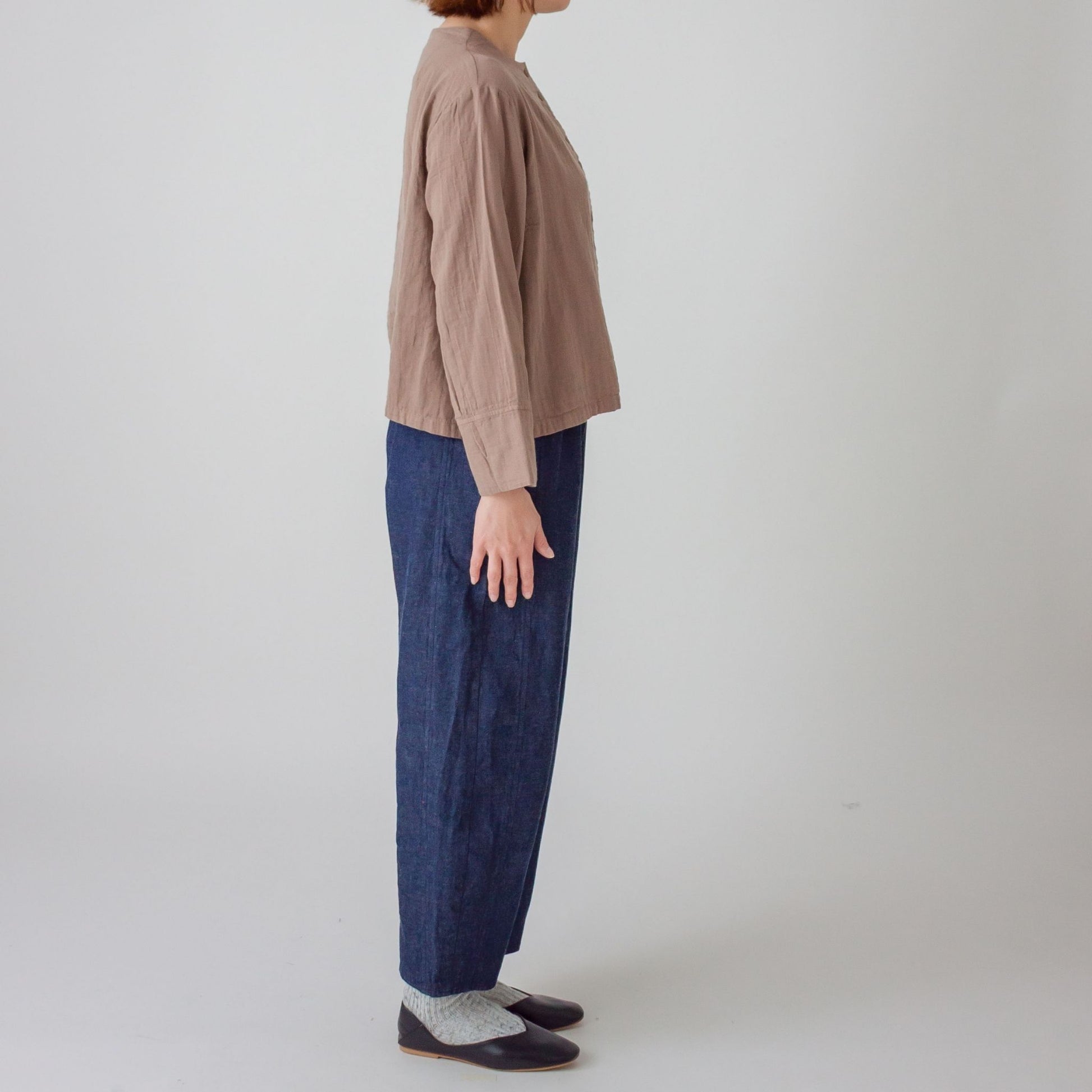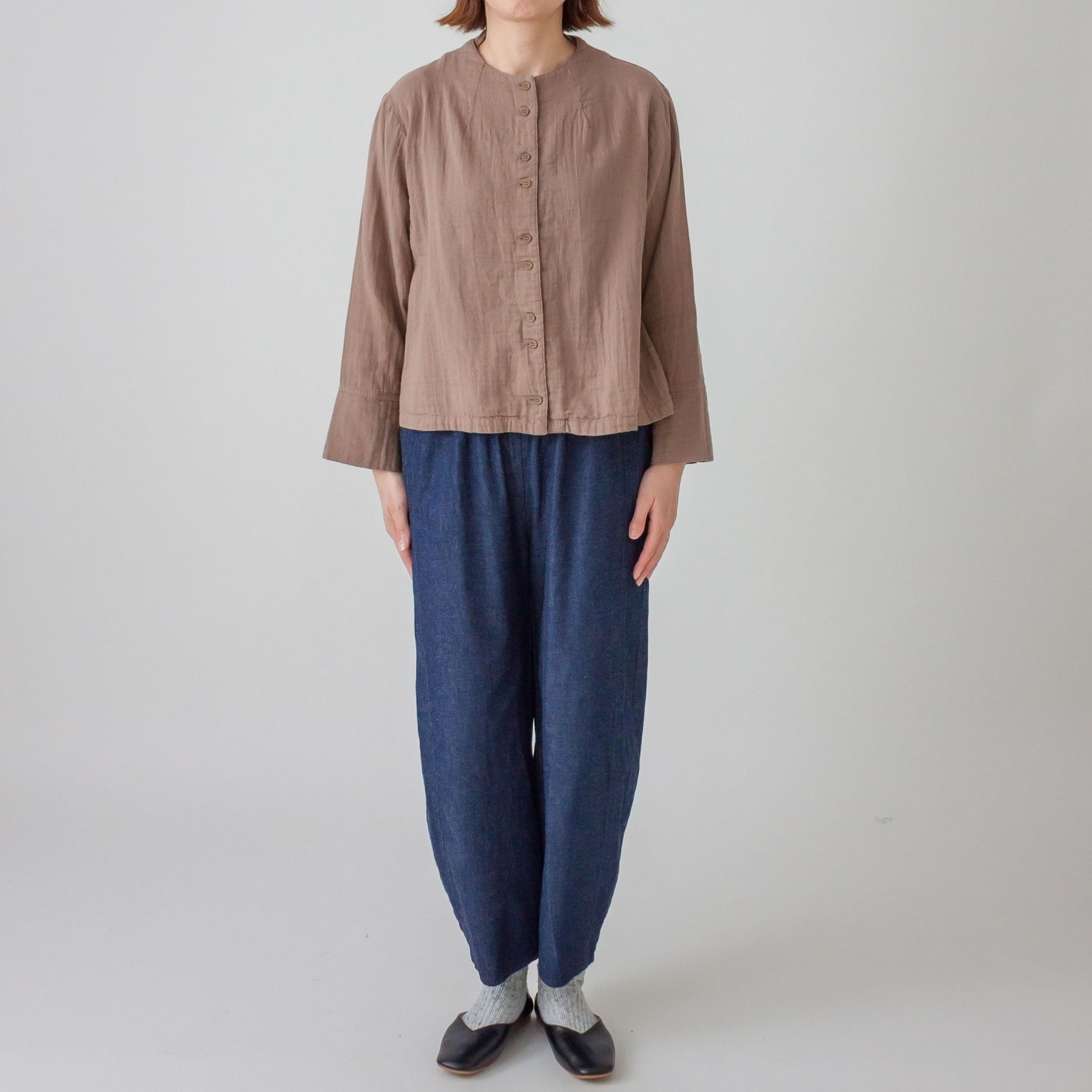 少し反りあがったボトルネック風のショートブラウスです。衿と胸にダーツを入れ細かい形に拘った一着です。袖口は折り返しできる仕様です。