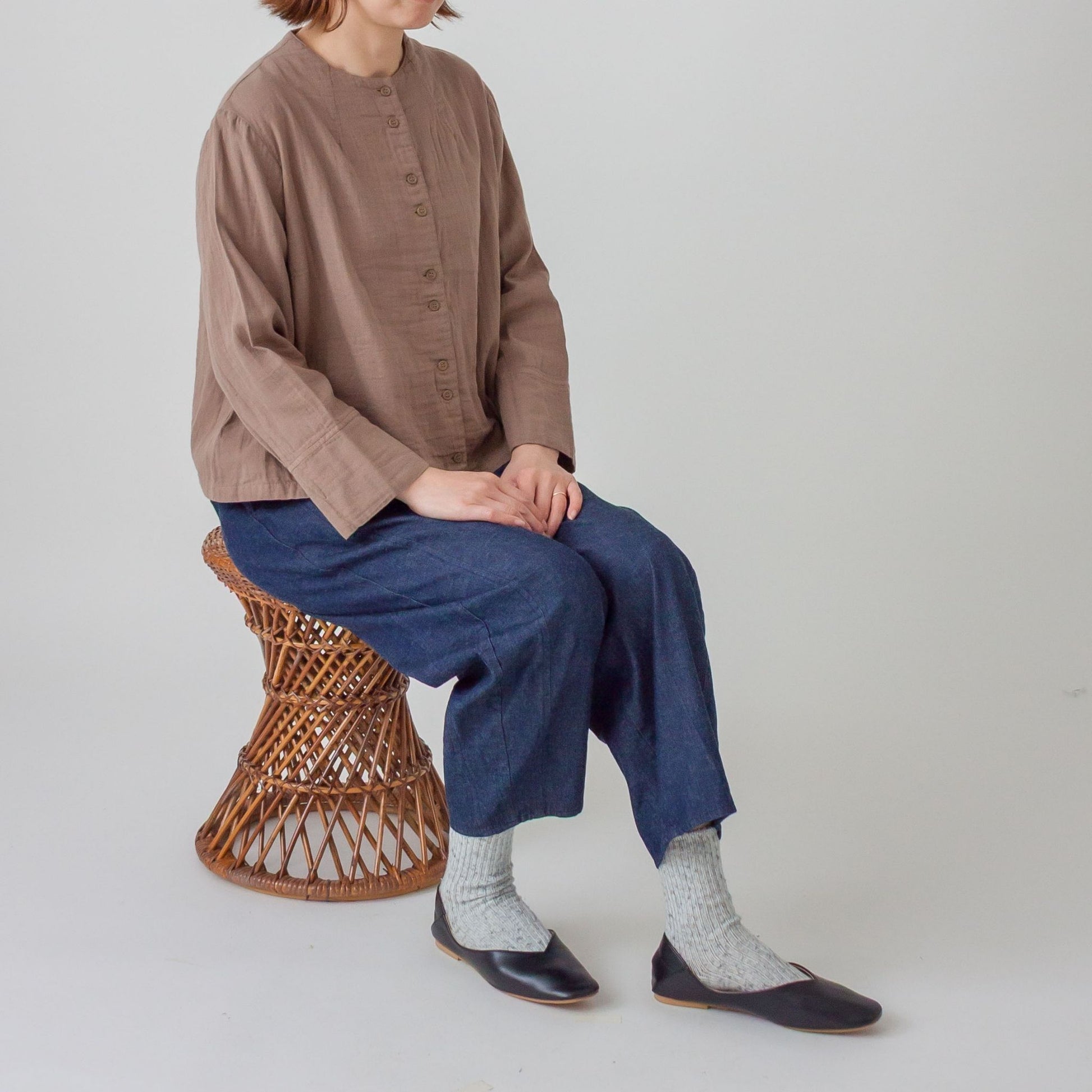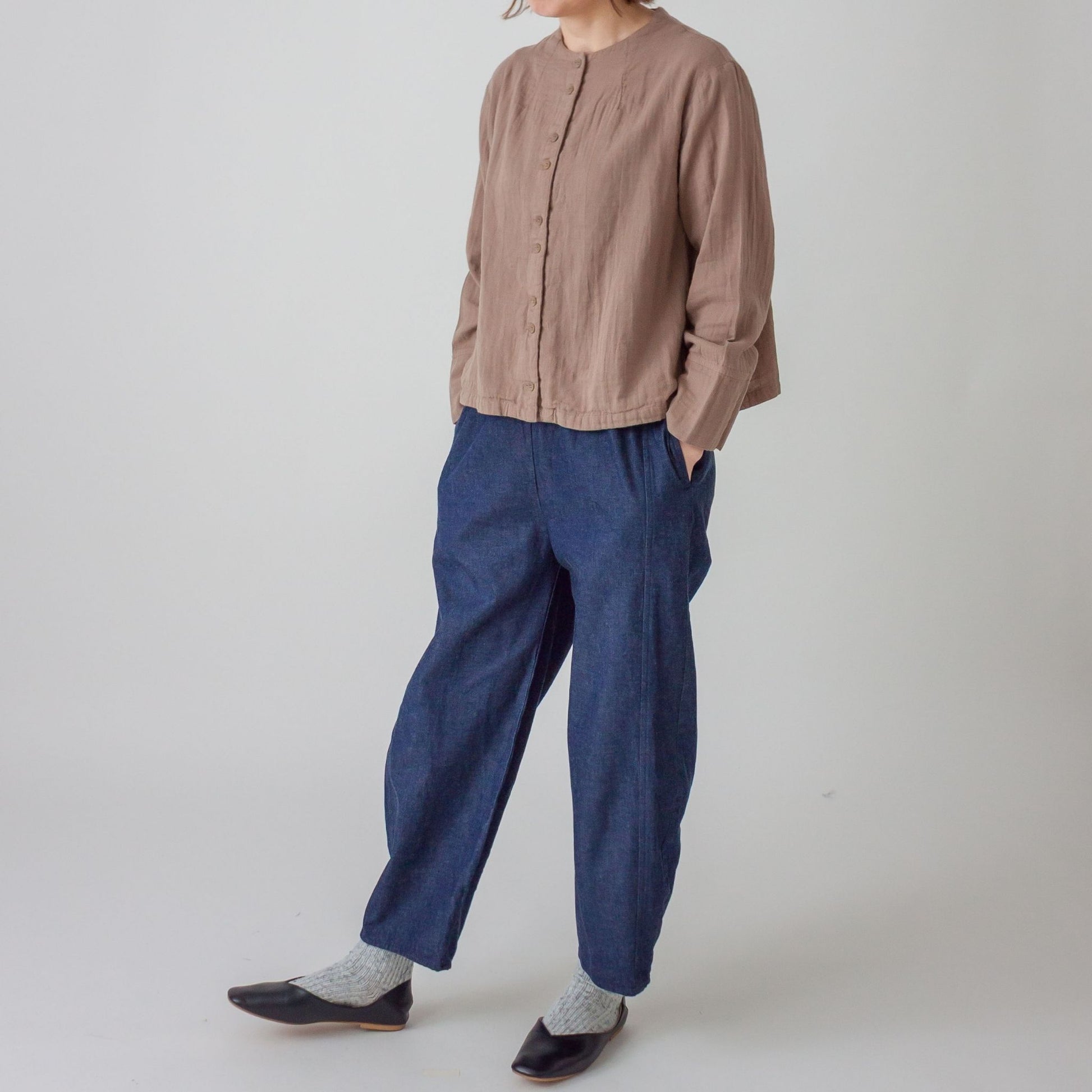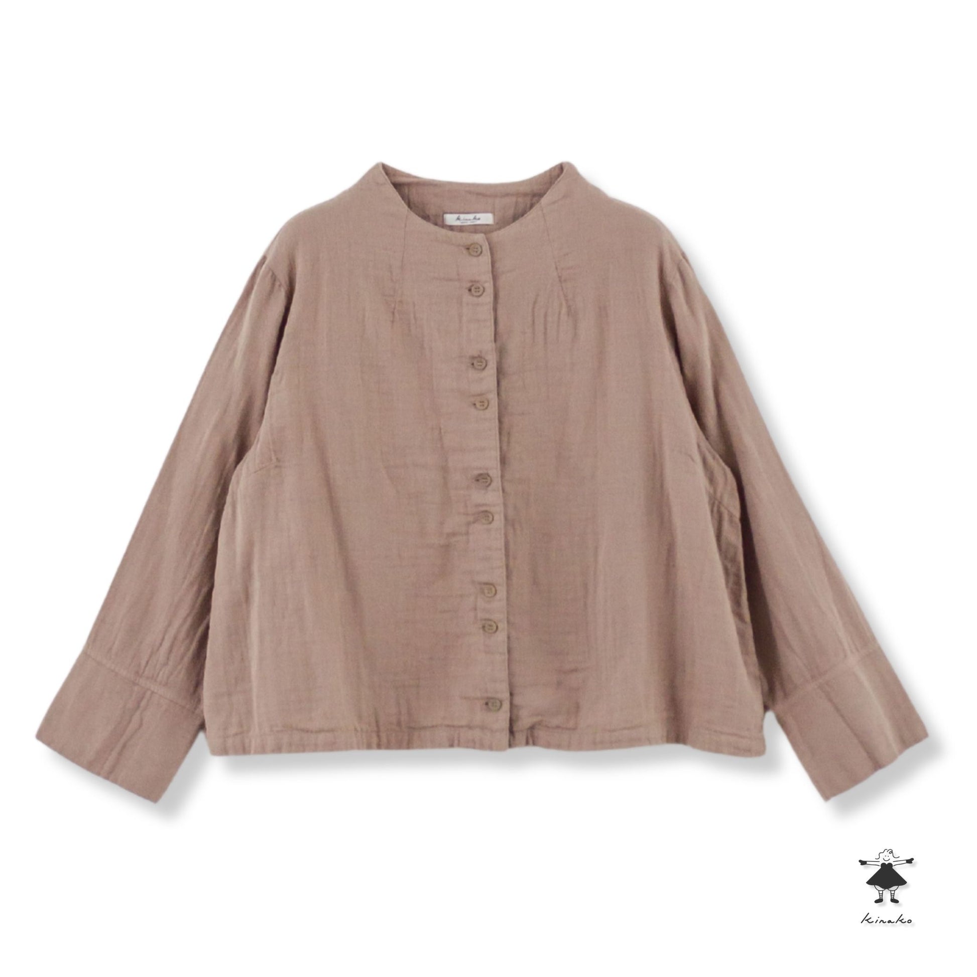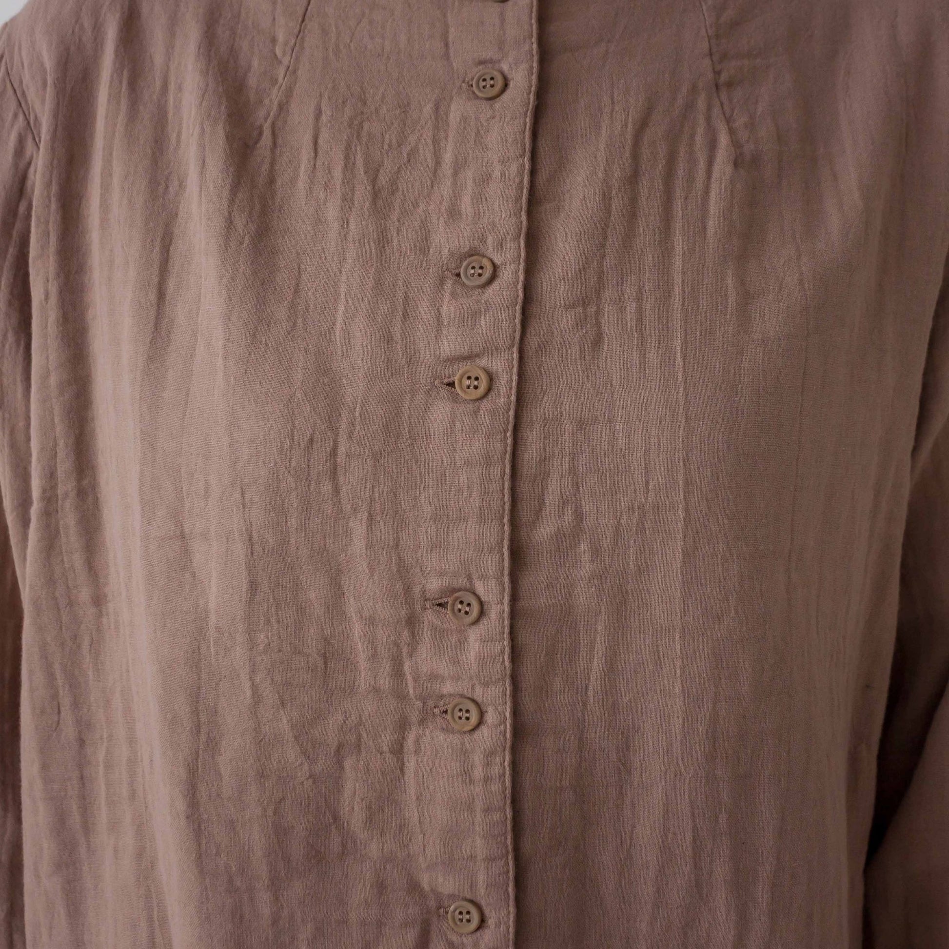 少し反りあがったボトルネック風のショートブラウスです。衿と胸にダーツを入れ細かい形に拘った一着です。袖口は折り返しできる仕様です。