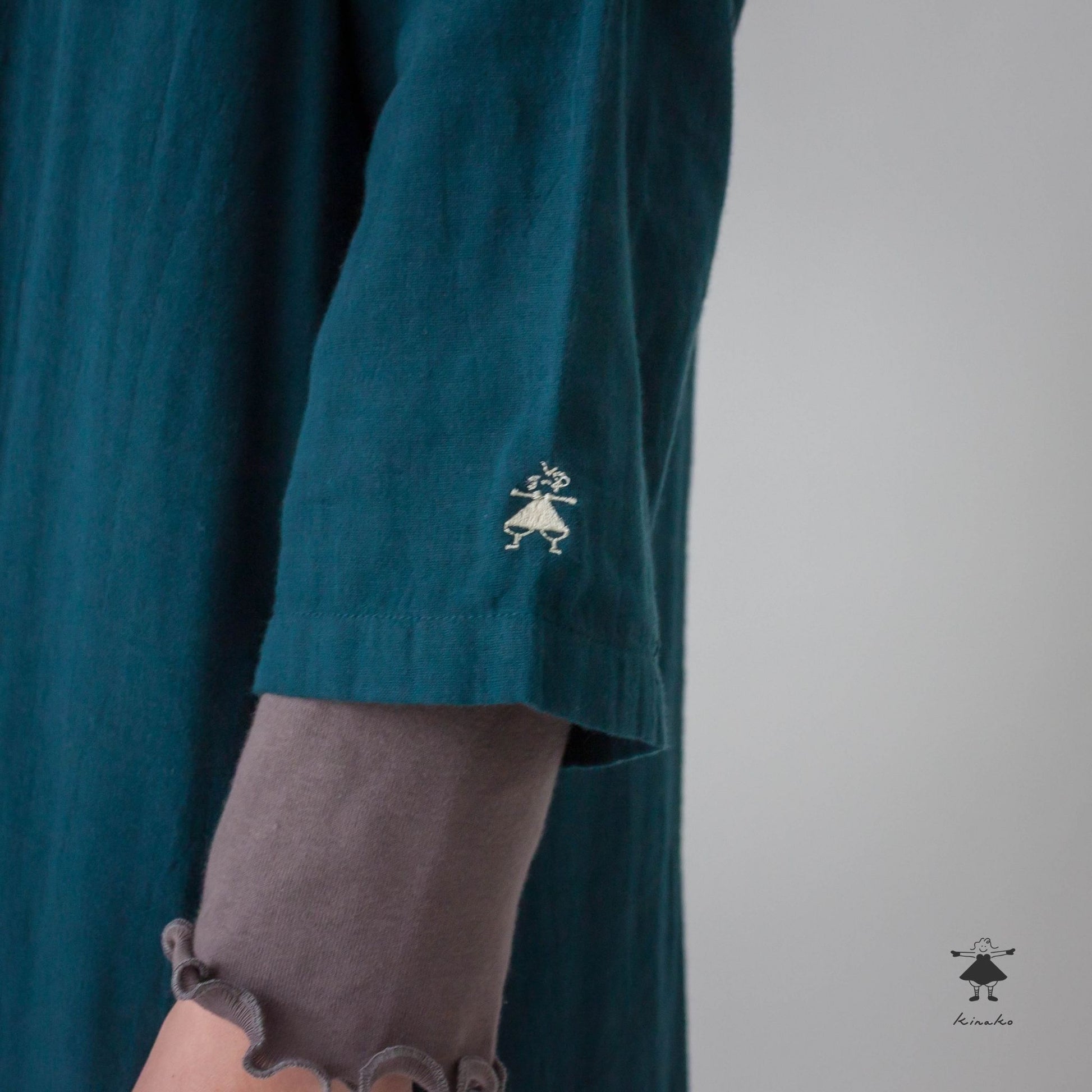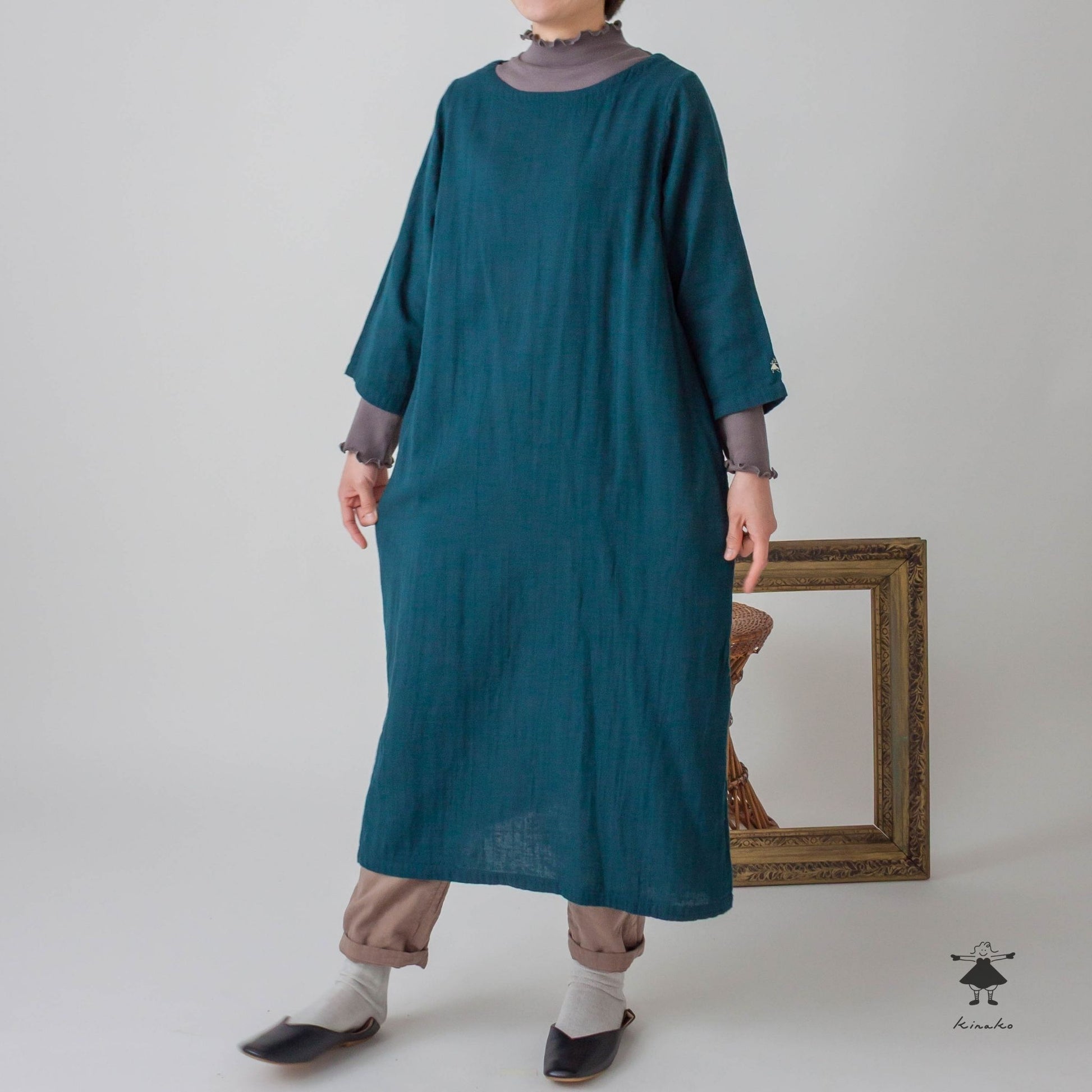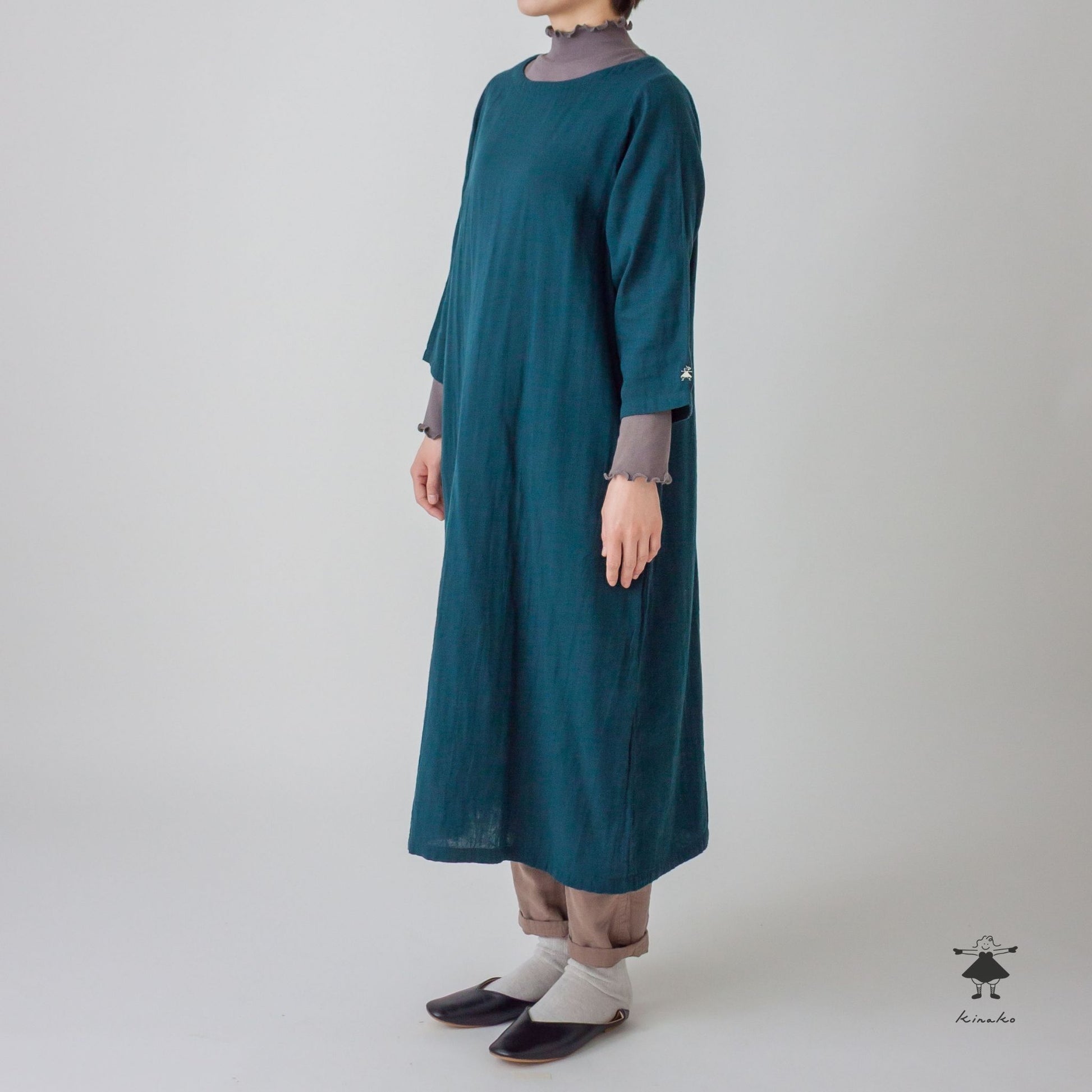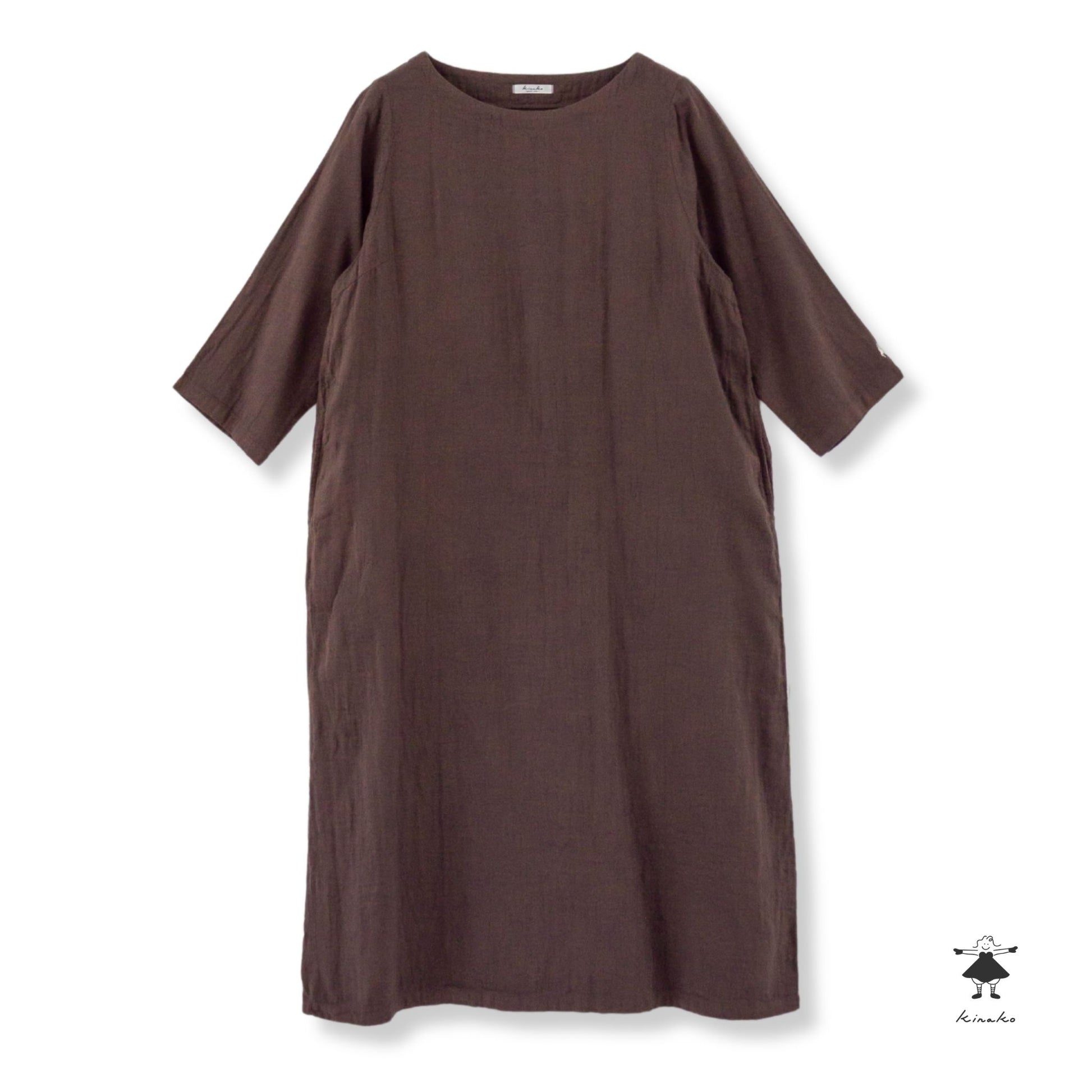 7分袖のシンプルなワンピースです。胸にダーツを入れシルエットに拘りました。裾にかけて緩やかに広がるAラインシルエットで、合わせやすい商品です。左袖口にきなこちゃん刺しゅう有り。