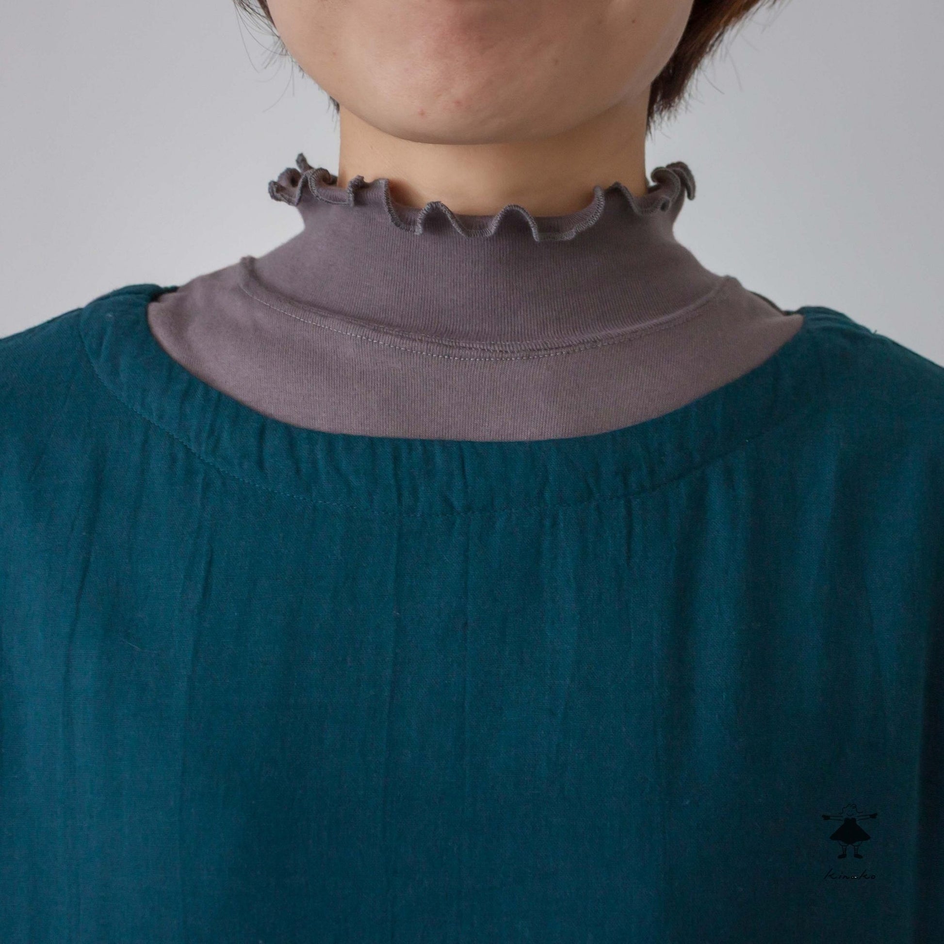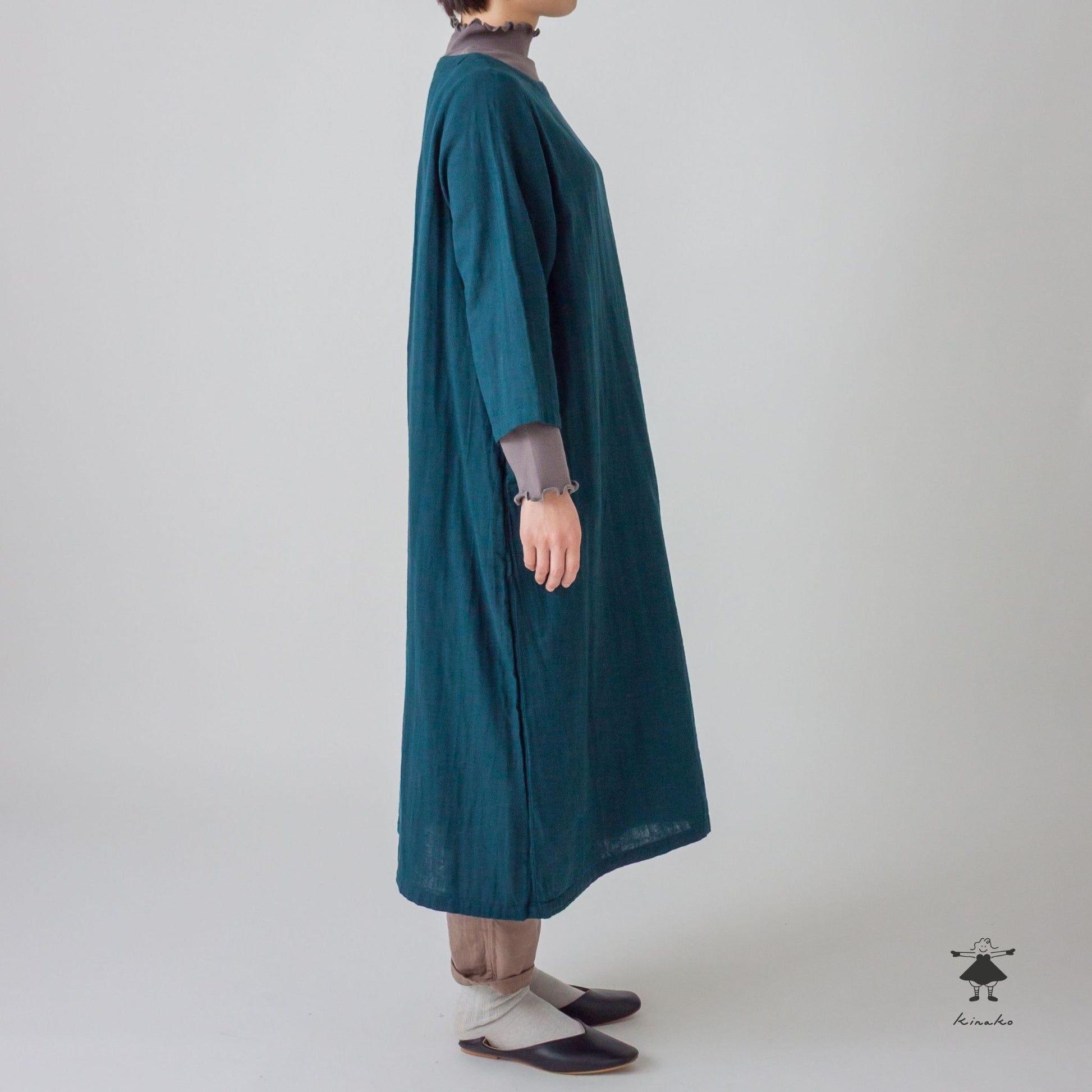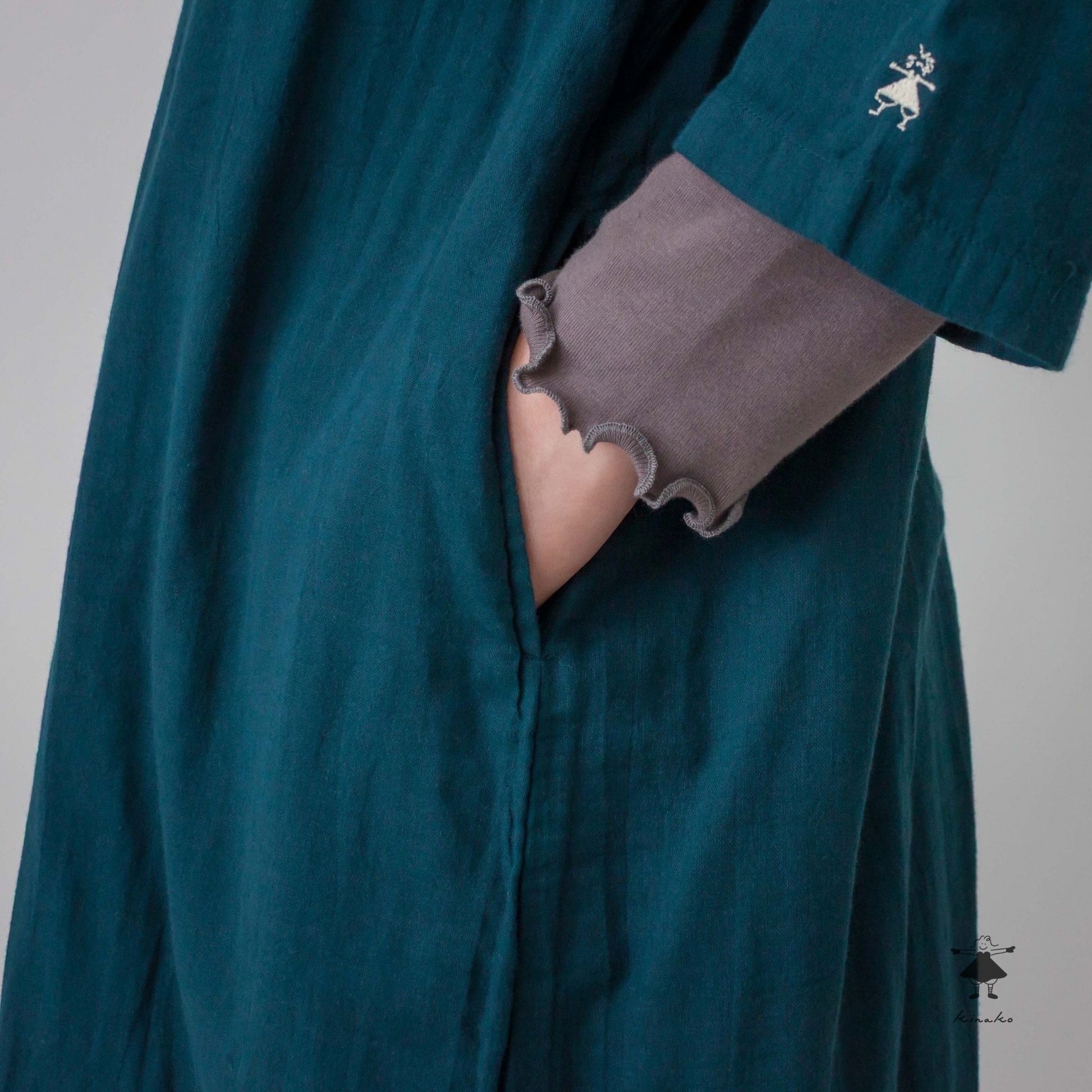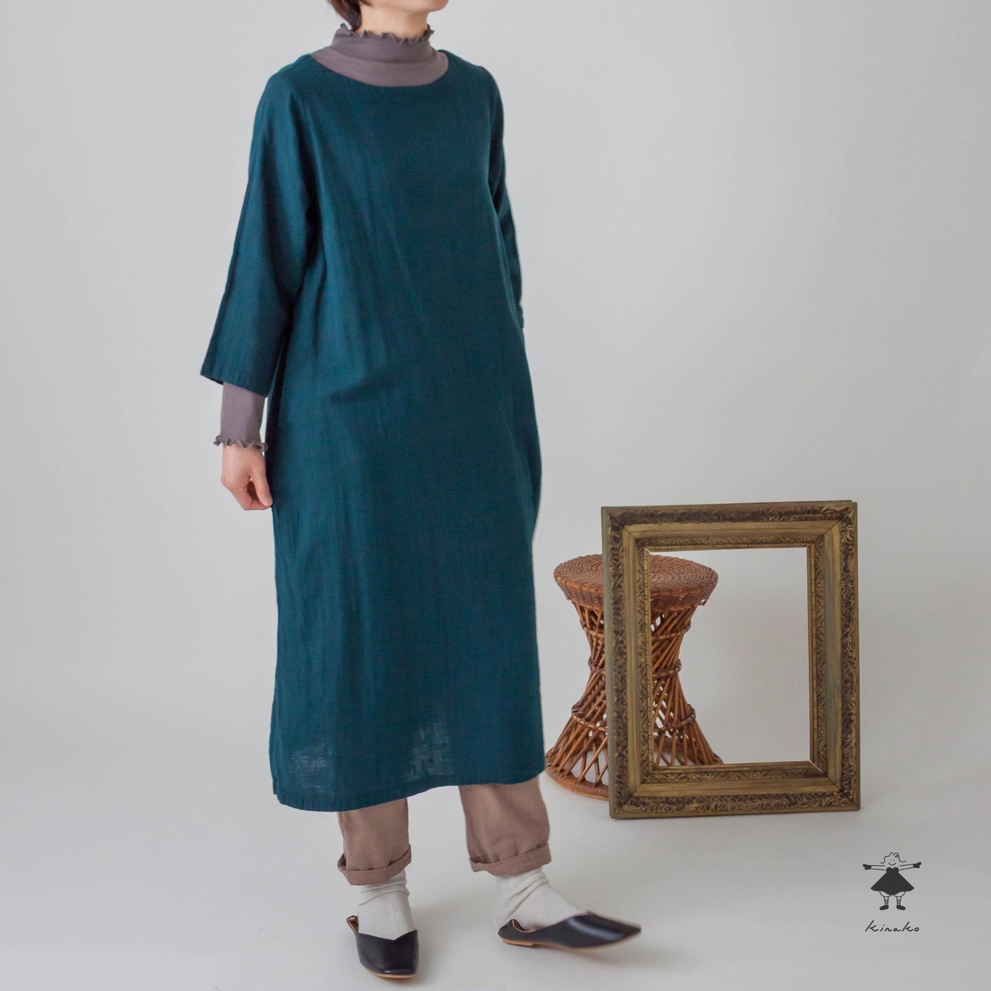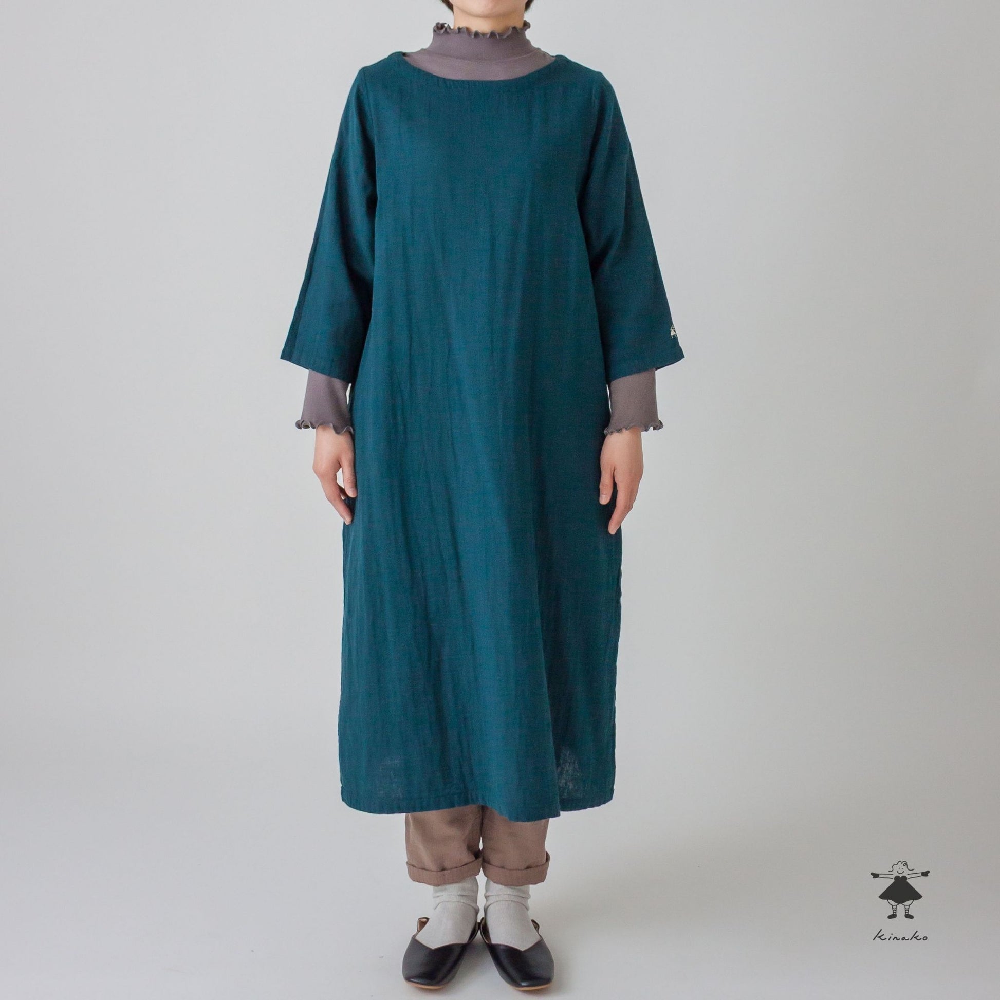 7分袖のシンプルなワンピースです。胸にダーツを入れシルエットに拘りました。裾にかけて緩やかに広がるAラインシルエットで、合わせやすい商品です。左袖口にきなこちゃん刺しゅう有り。