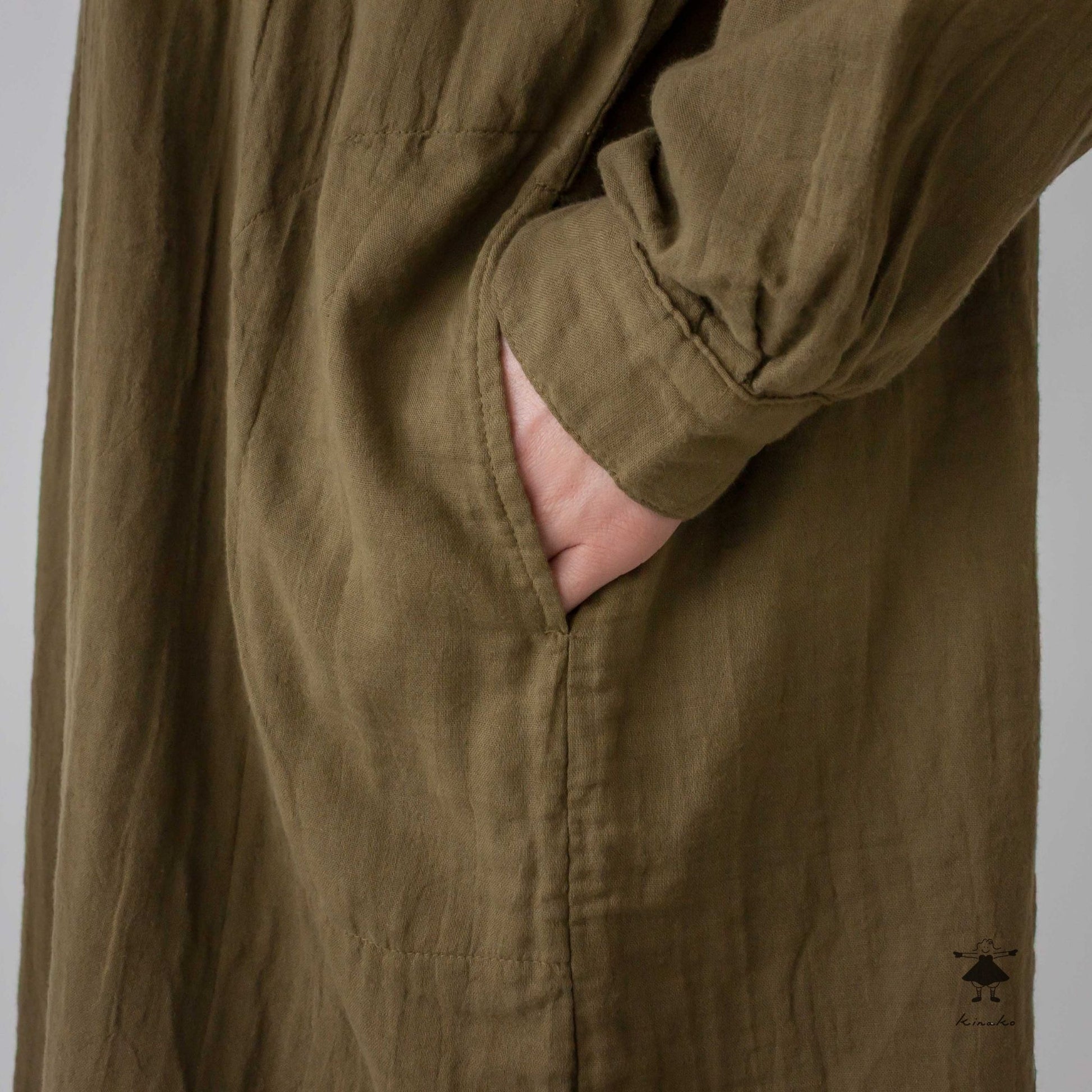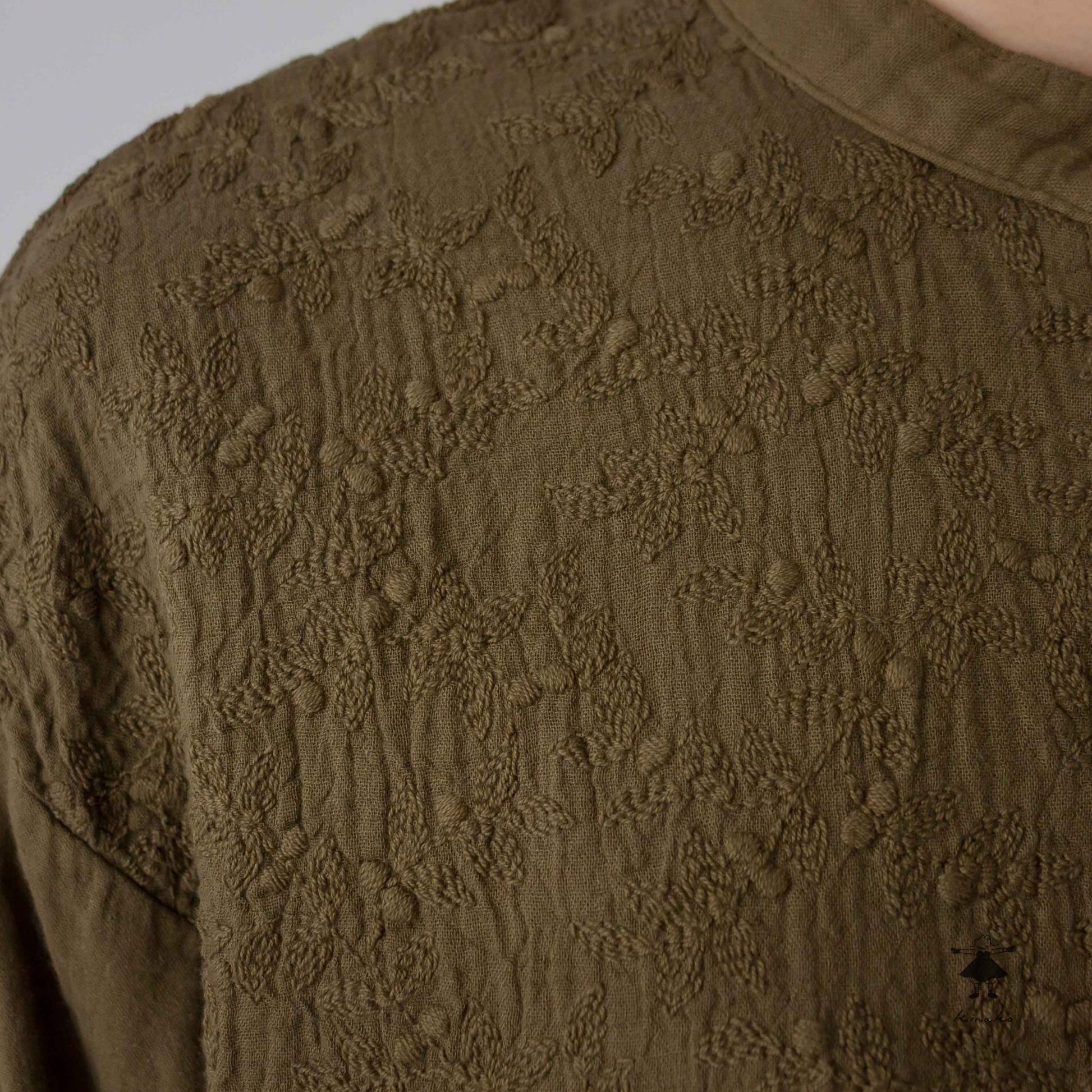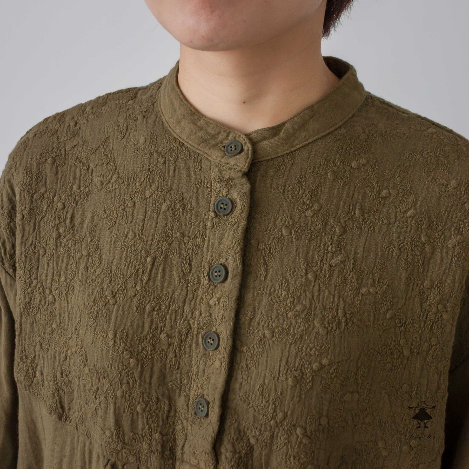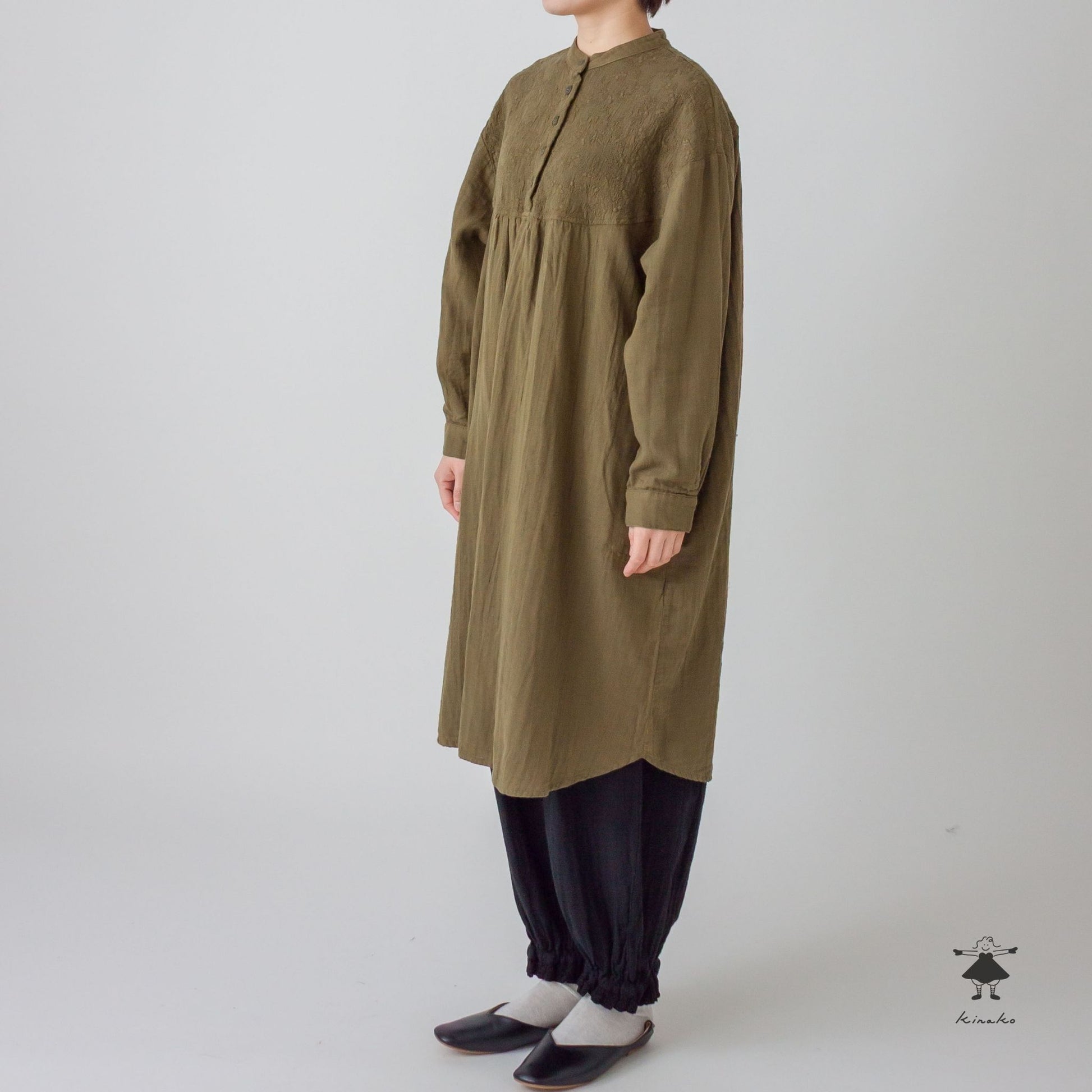 前後切替部分に刺しゅう生地を使ったワンピースです。バンドカラーと前ボタンが特徴で、着やすくゆったりとしたサイズ感が楽な着心地と優しい雰囲気の1着です。