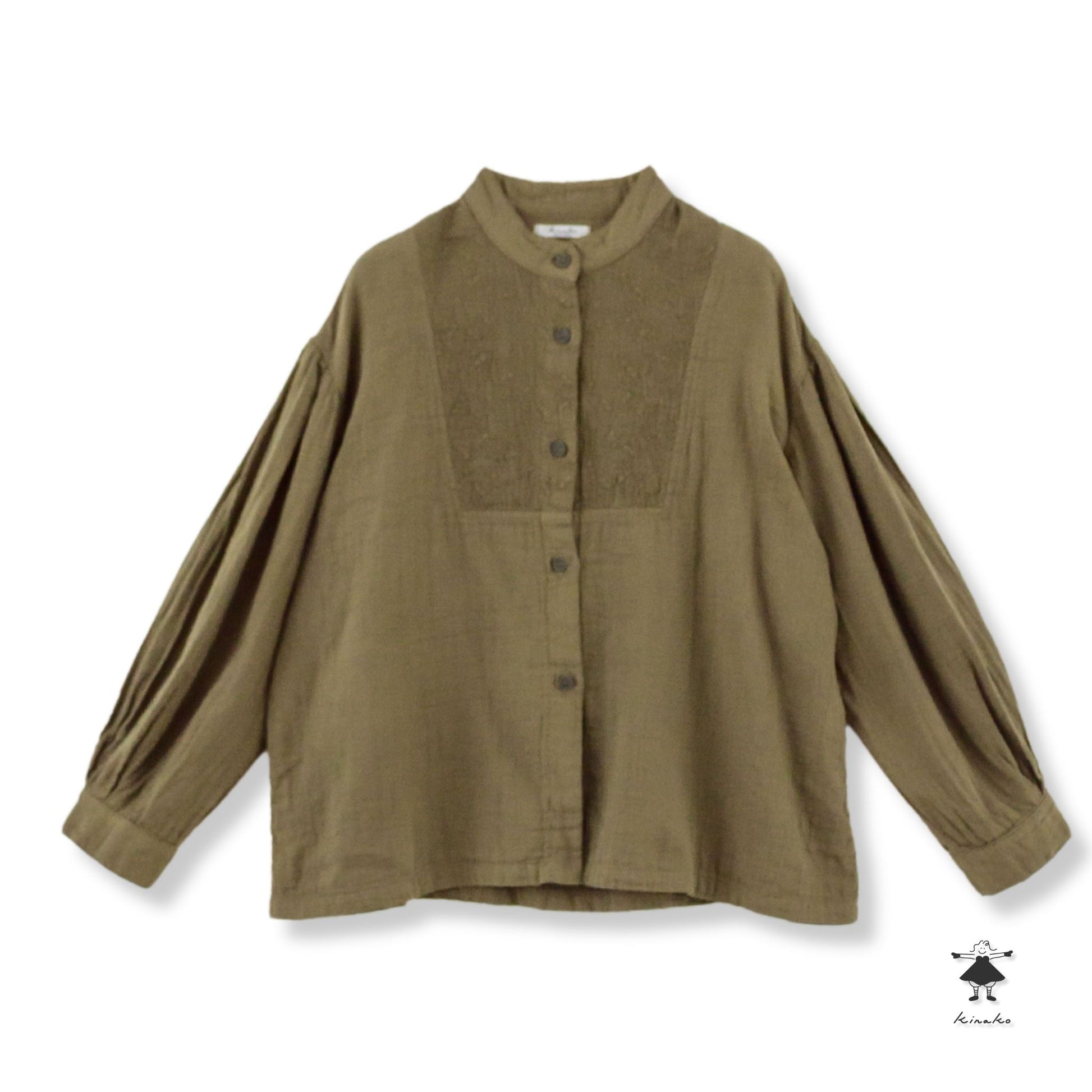 胸の切替部分に刺しゅう生地を使ったショート丈ブラウスです。袖山と袖口にタックをとりボリュームのある袖が特徴です。