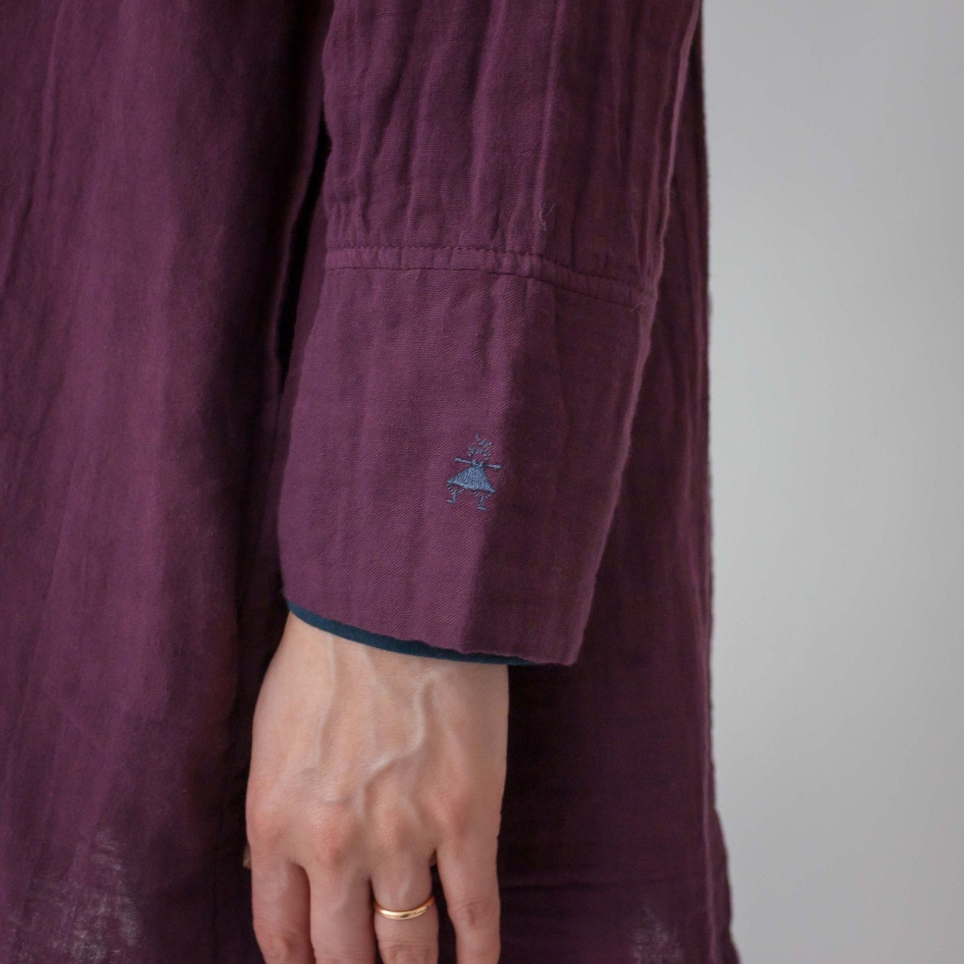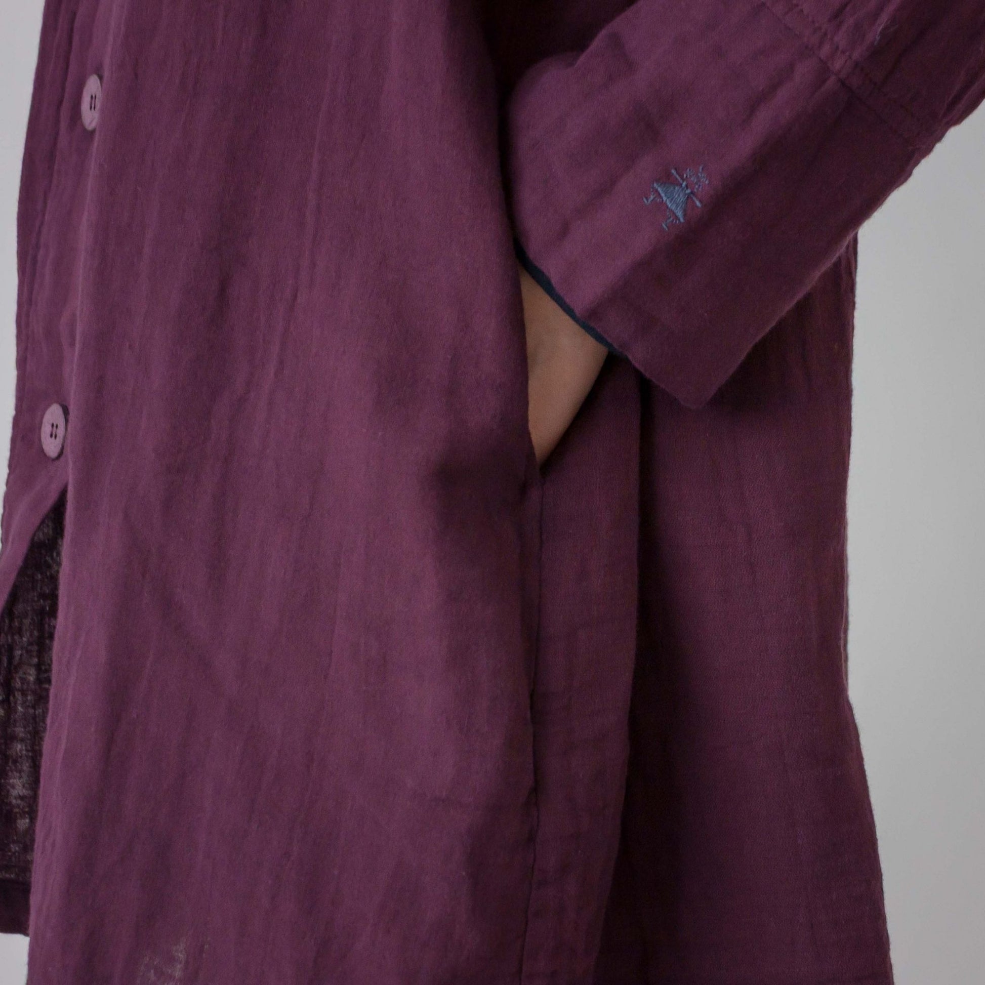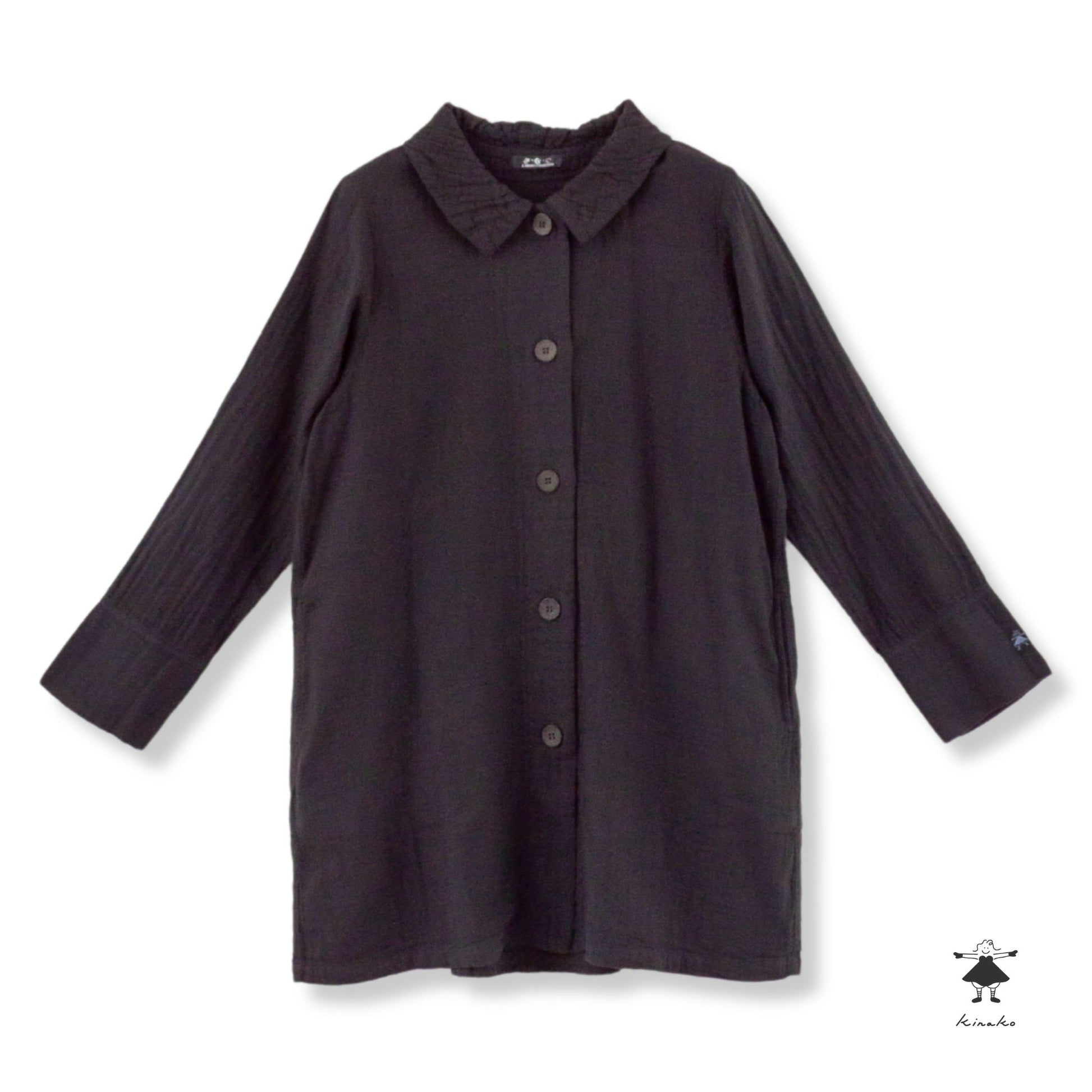 ギャザーを寄せた衿が特徴のチュニック丈コートです。ボタンを閉めてチュニックとしても着られる商品で、袖口は折り返しできる仕様です。左袖にきなこちゃん刺しゅう有り。