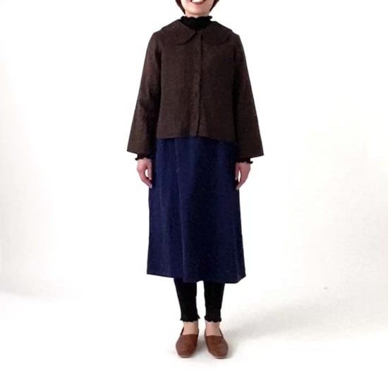 刺しゅう生地を使った大きな衿が特徴のブラウスです。衿とのバランスを考えたコンパクトなショート丈に仕上げました。ワイドパンツやワンピースとの重ね着にも着用いただけます。