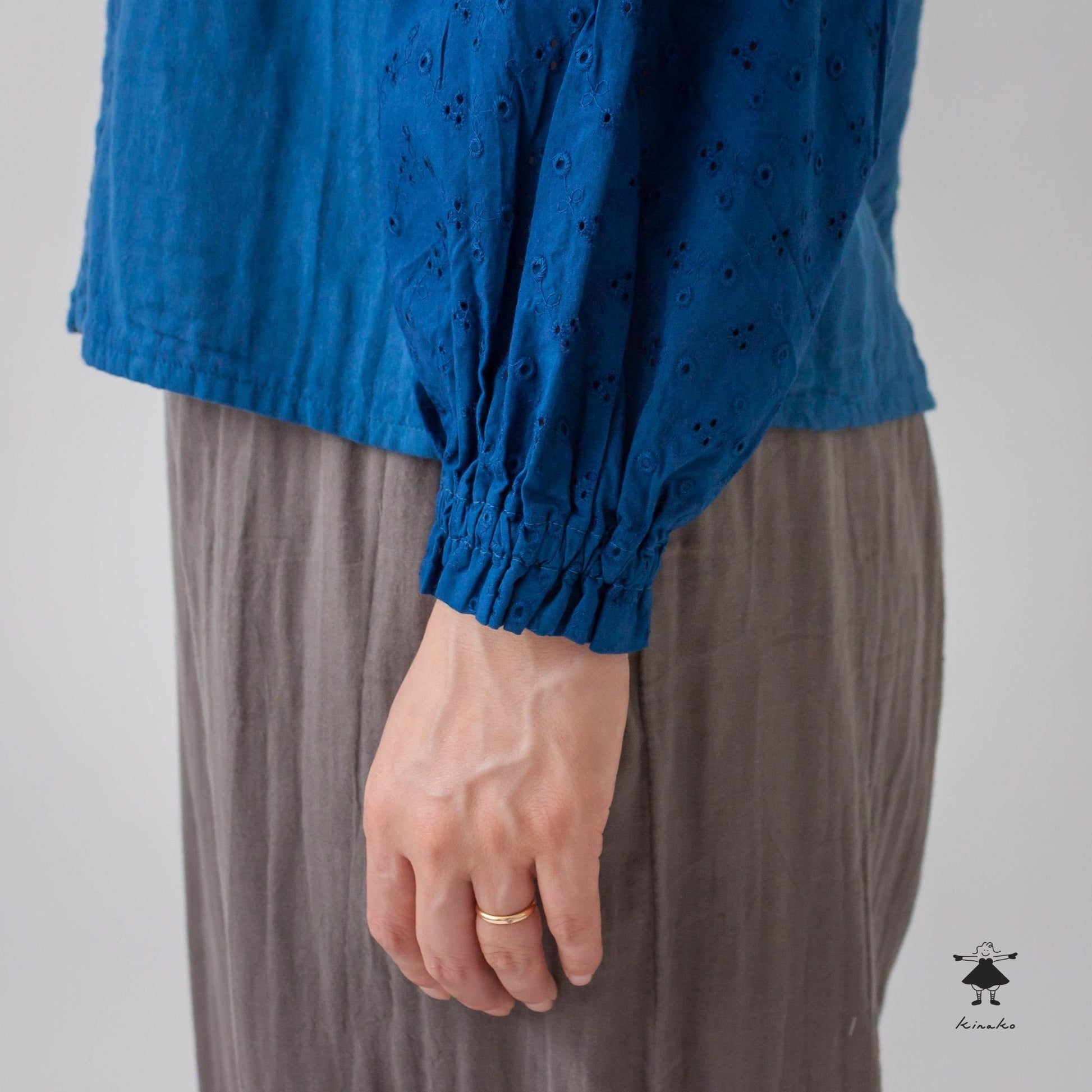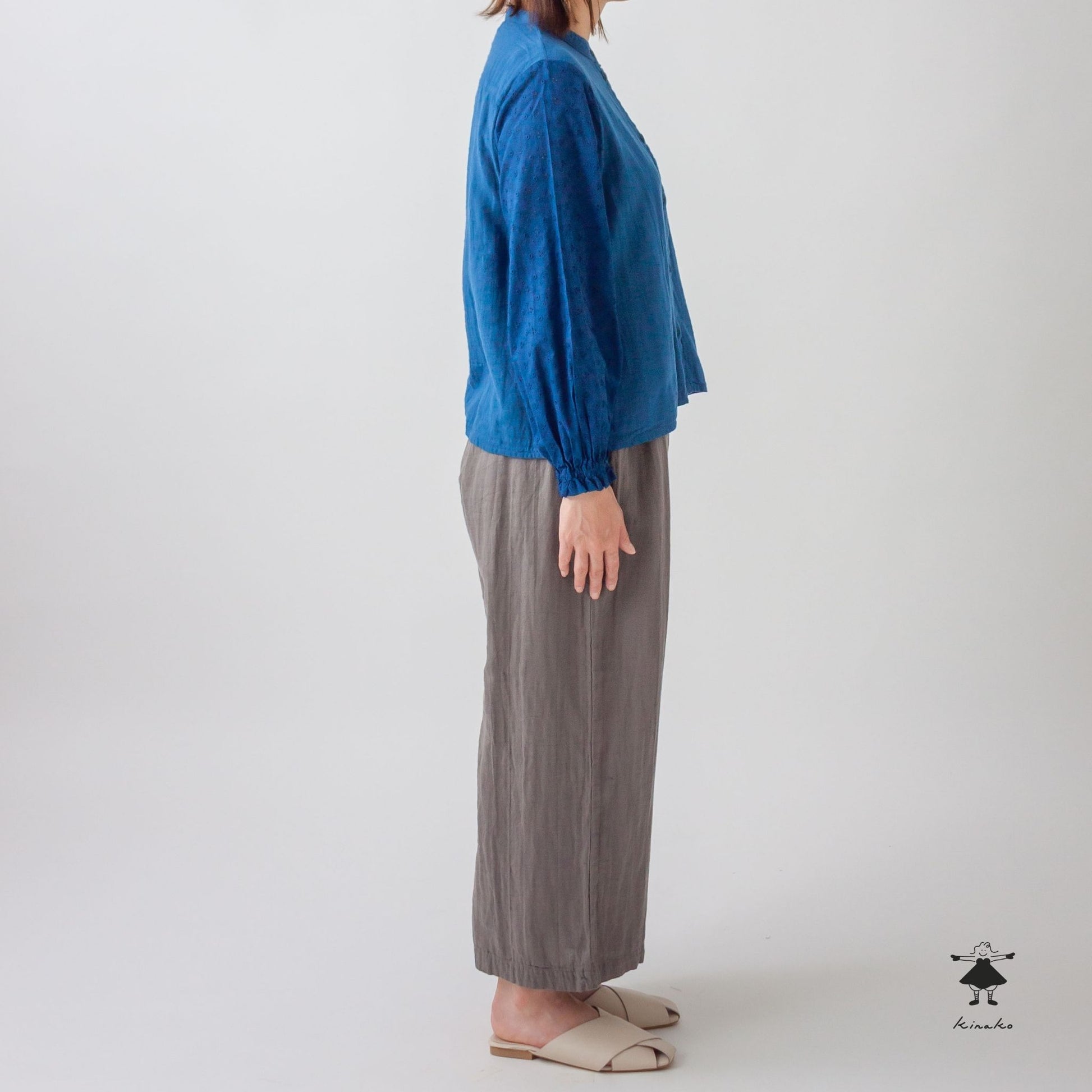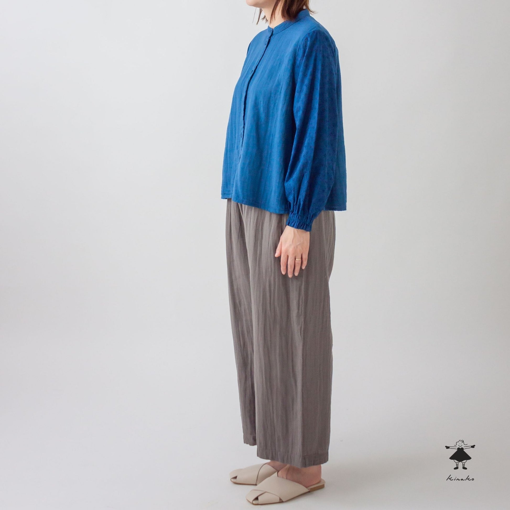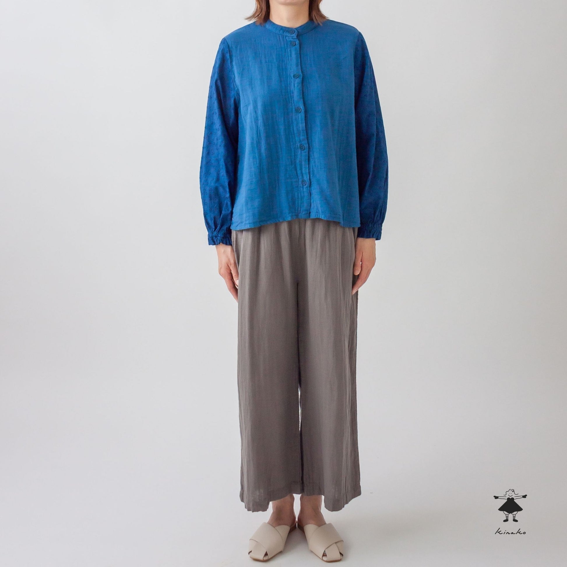 袖にレース生地を使ったブラウスです。身頃にはWガーゼを使い小さなスタンドカラーに仕上げました。見た目にも涼し気なレース袖はインナーを替えて夏まで着て頂けます。背中にタックを入れて立体感と着心地を考慮しました。