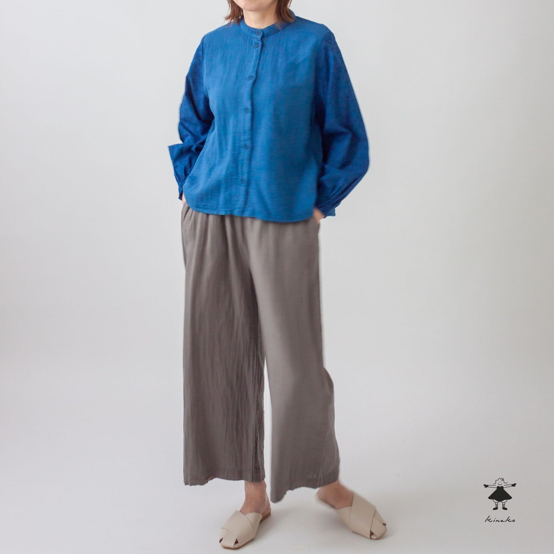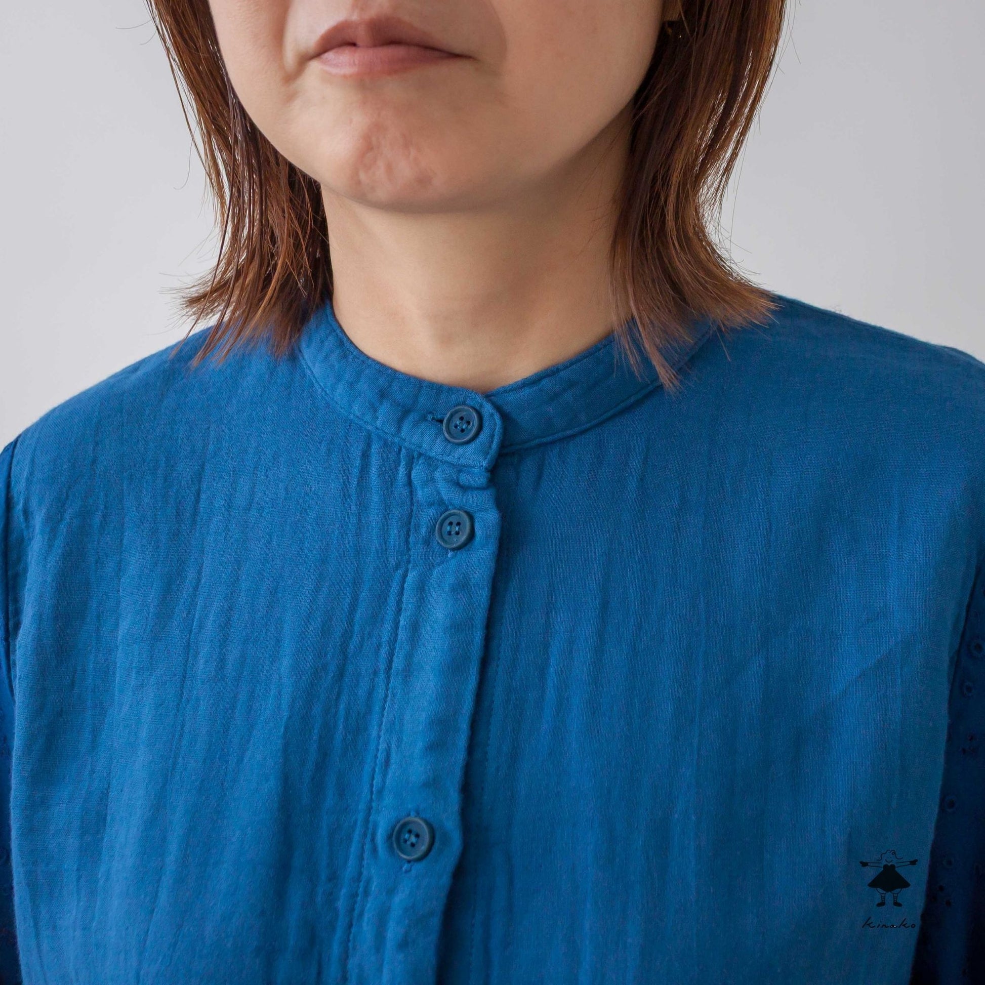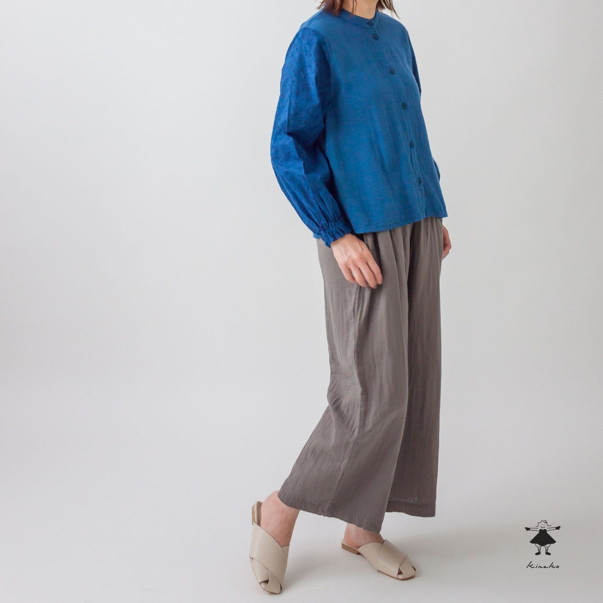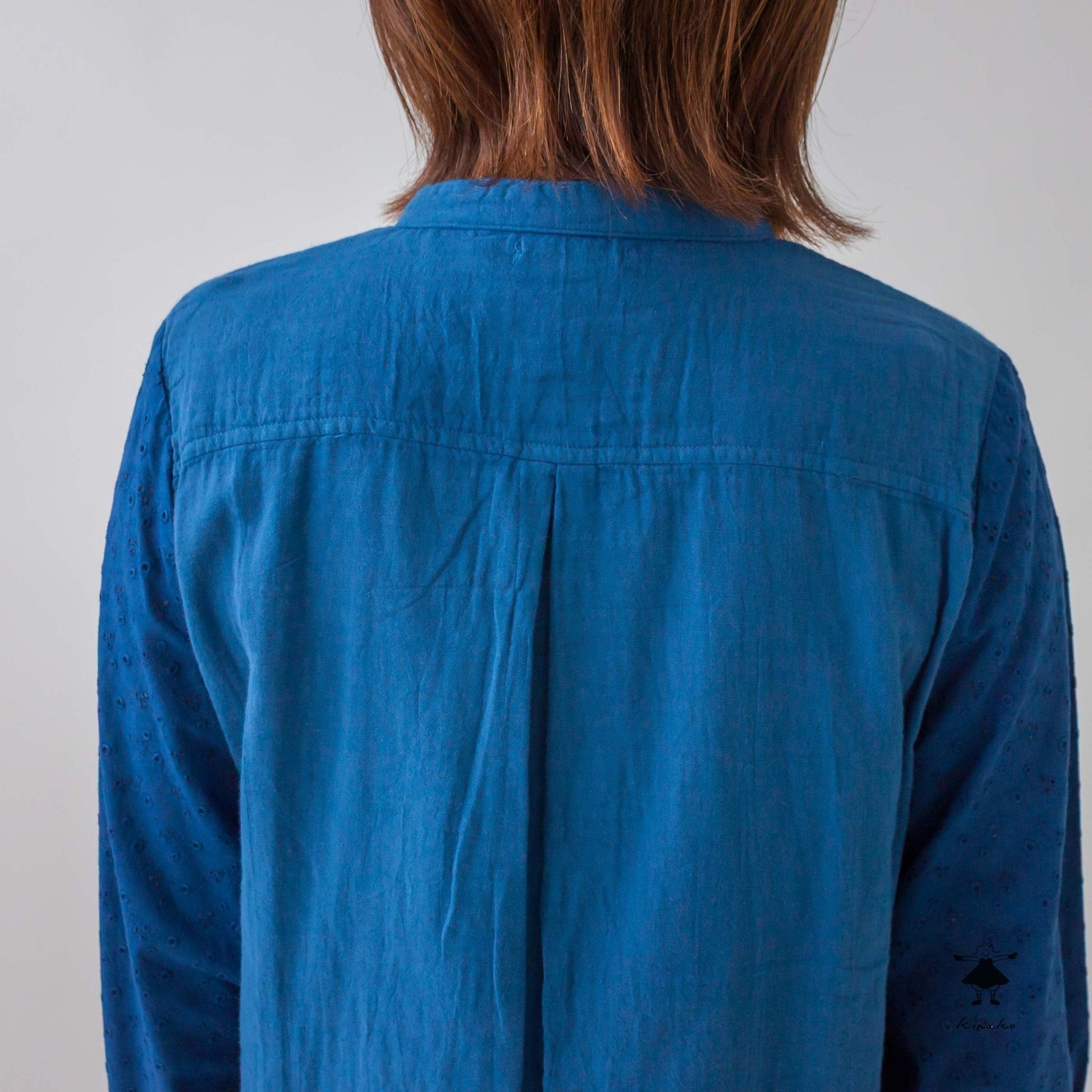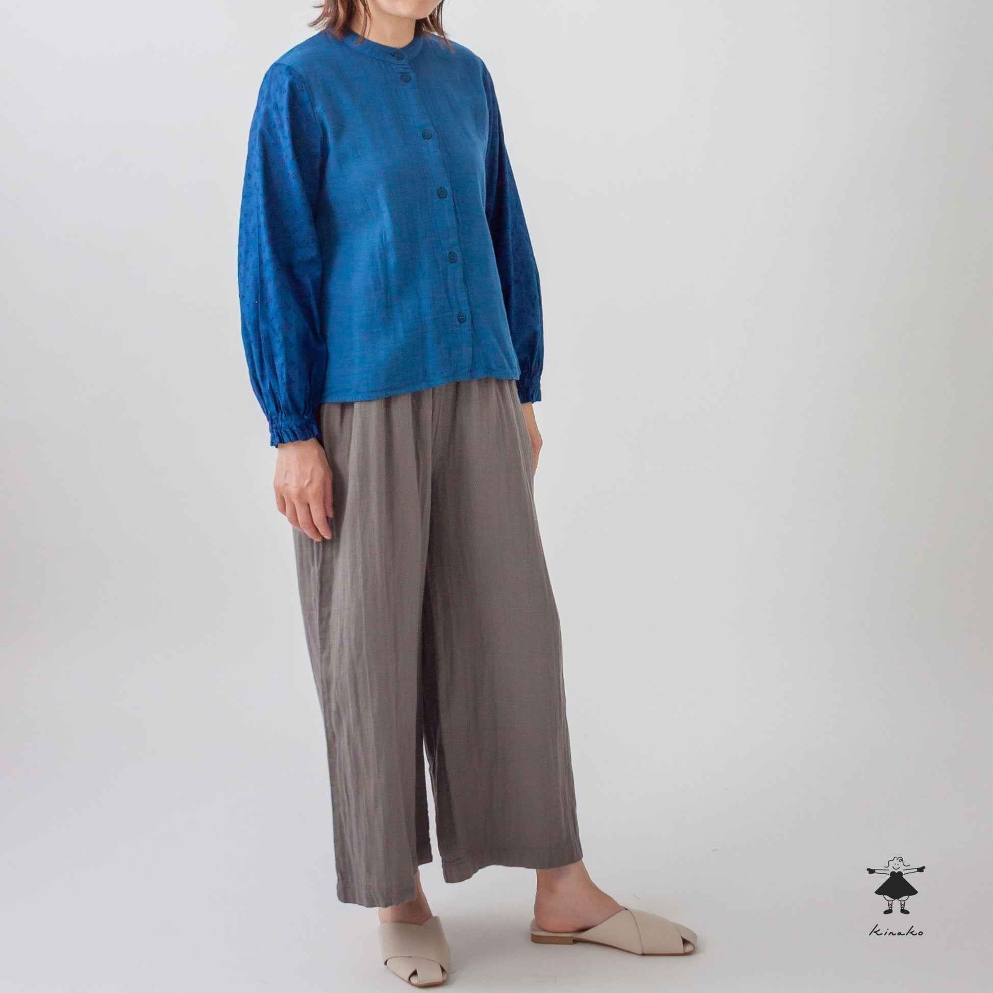 袖にレース生地を使ったブラウスです。身頃にはWガーゼを使い小さなスタンドカラーに仕上げました。見た目にも涼し気なレース袖はインナーを替えて夏まで着て頂けます。背中にタックを入れて立体感と着心地を考慮しました。