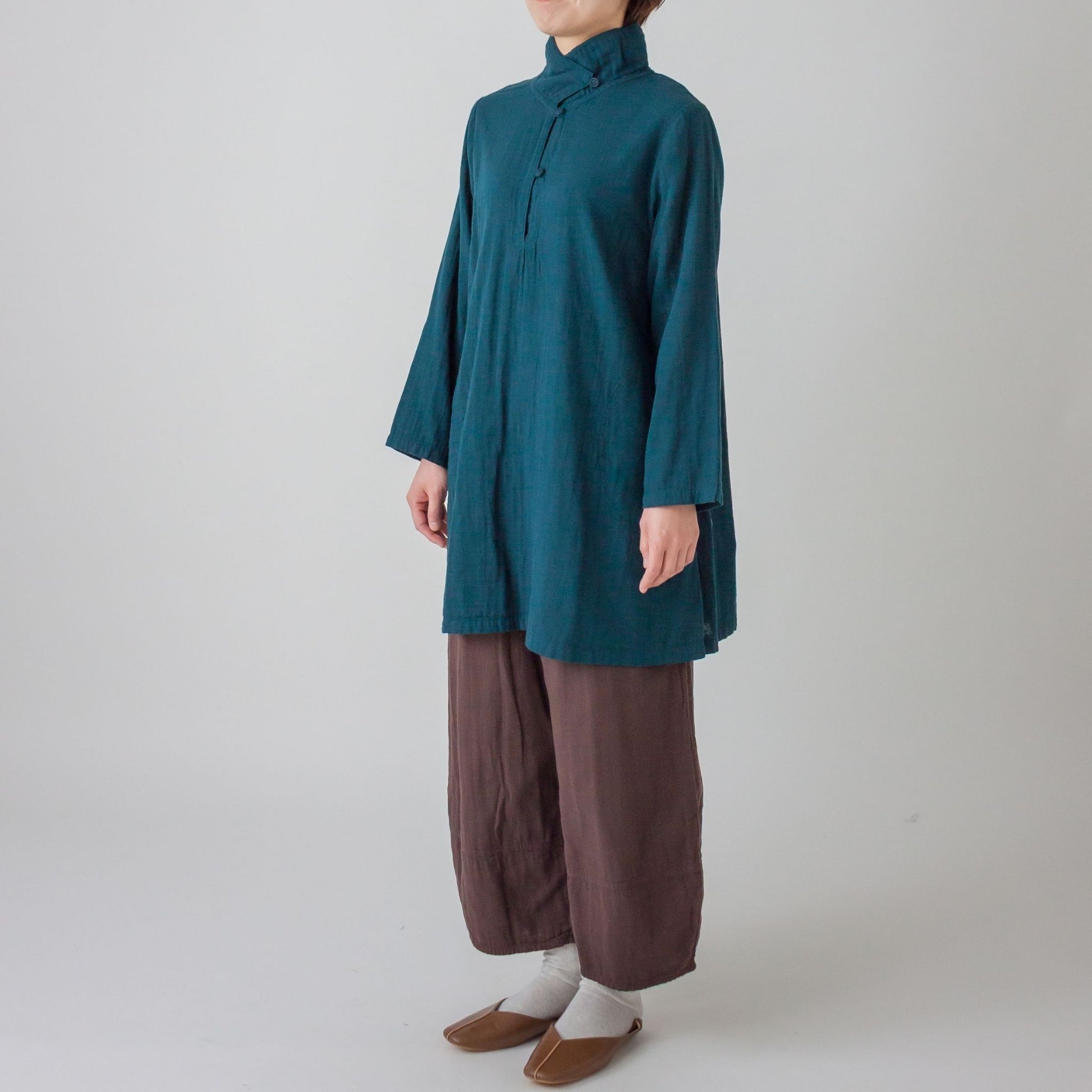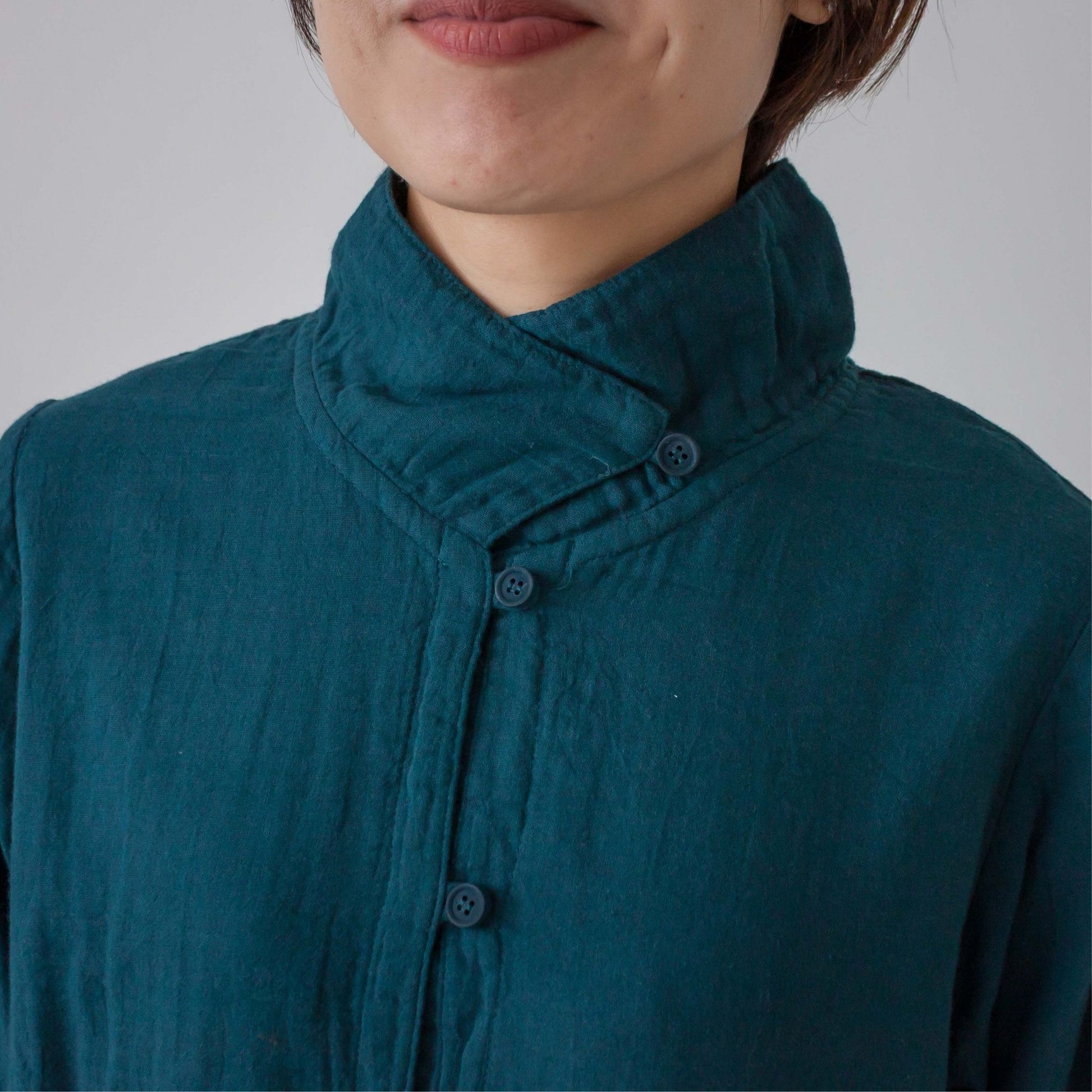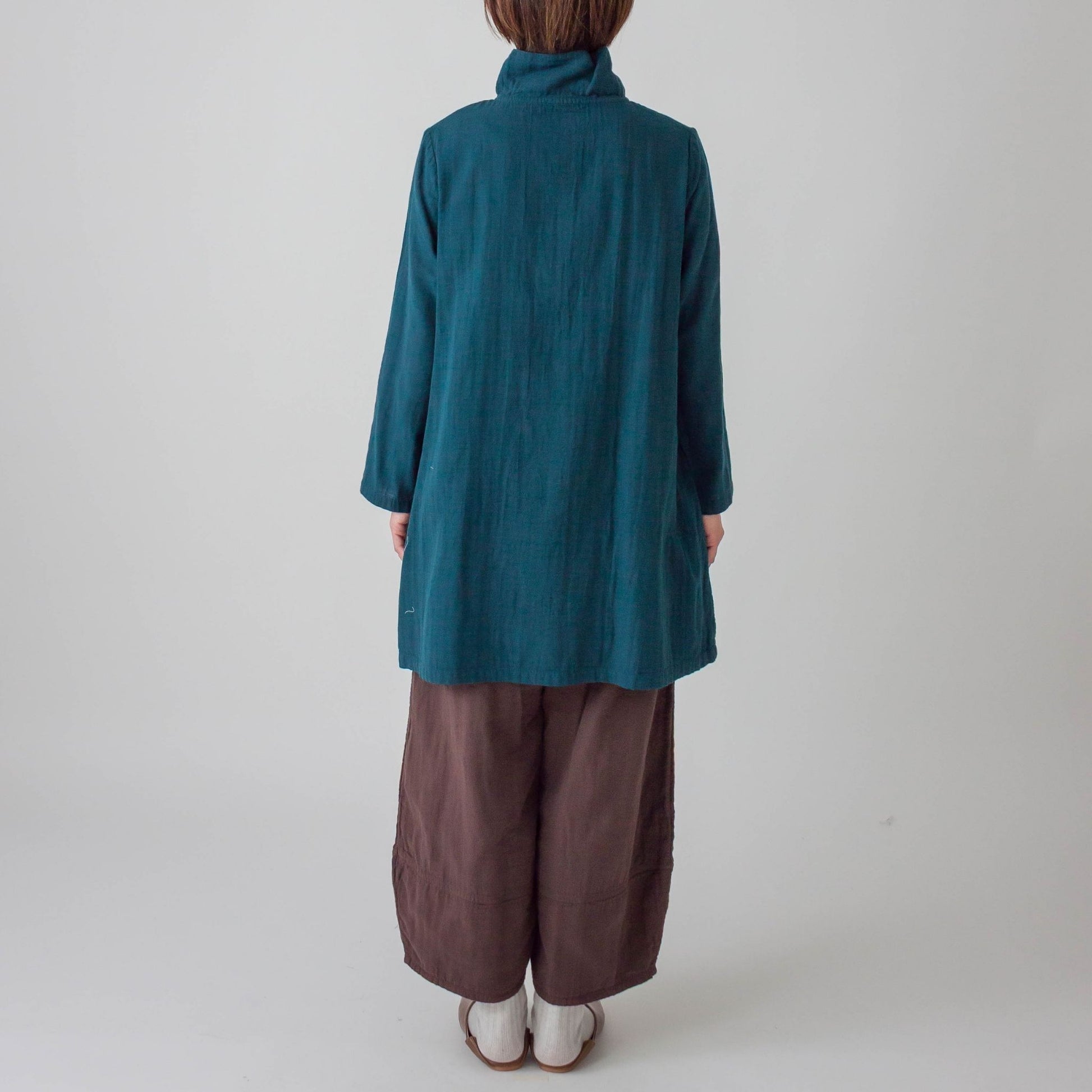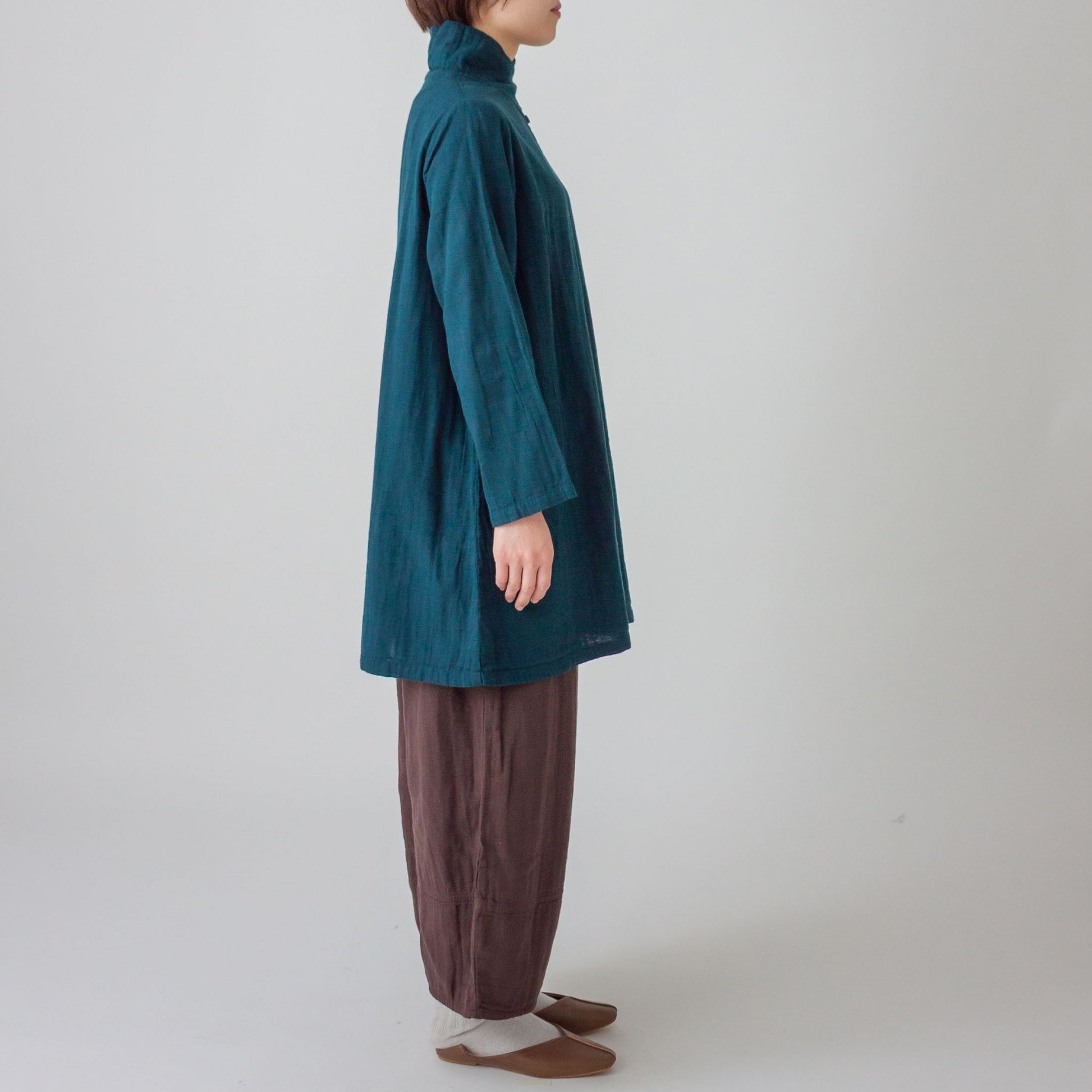 衿先に付けたボタンを留めるとハイネック風になる衿が特徴です。ボタンの開け閉めで衿の形を変えられます。胸にダーツを入れ綺麗なシルエットに仕上げました。
