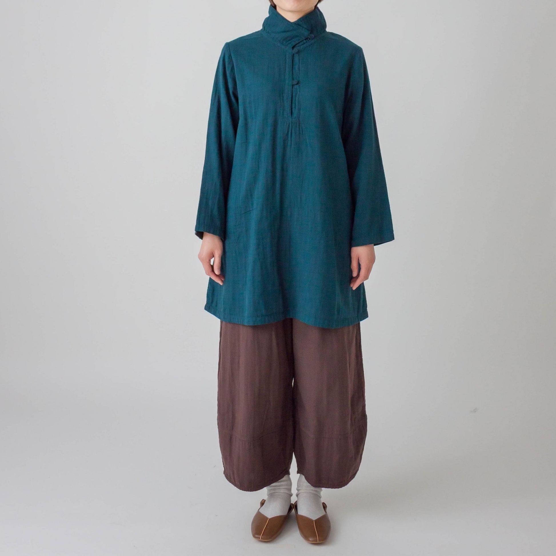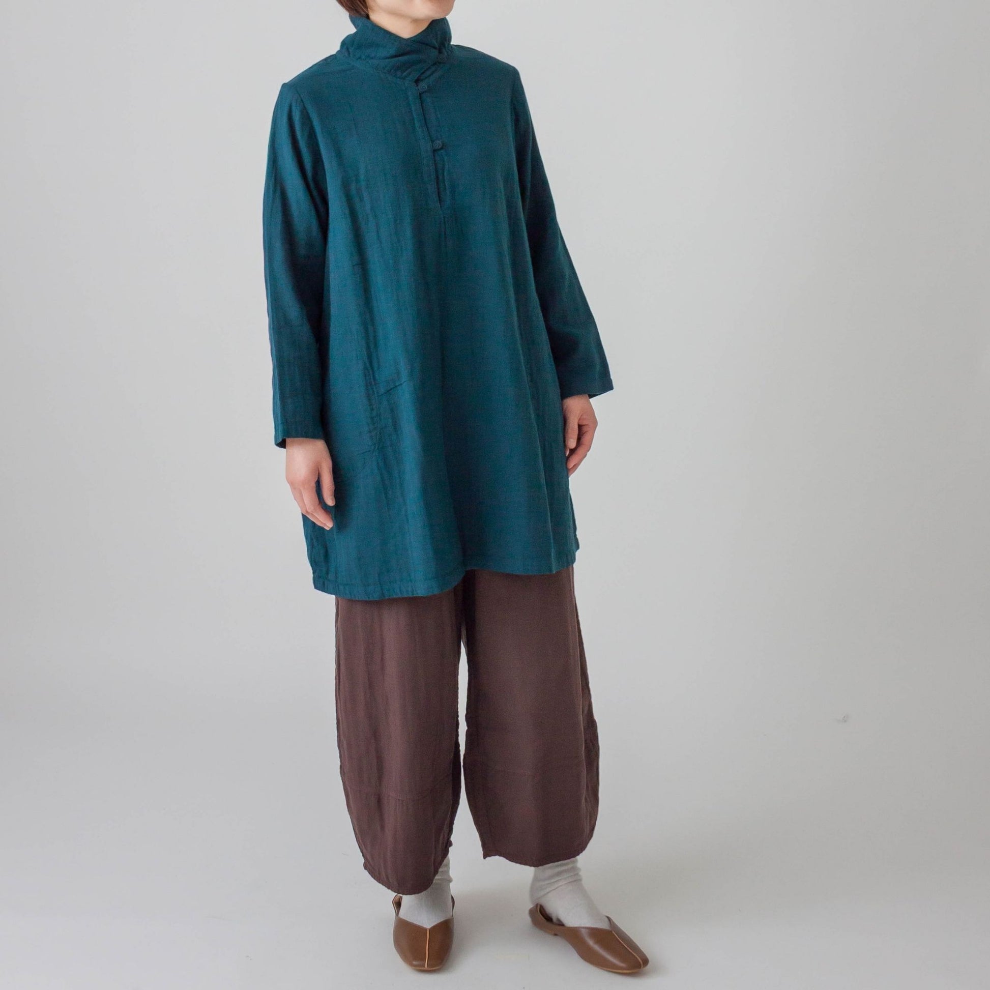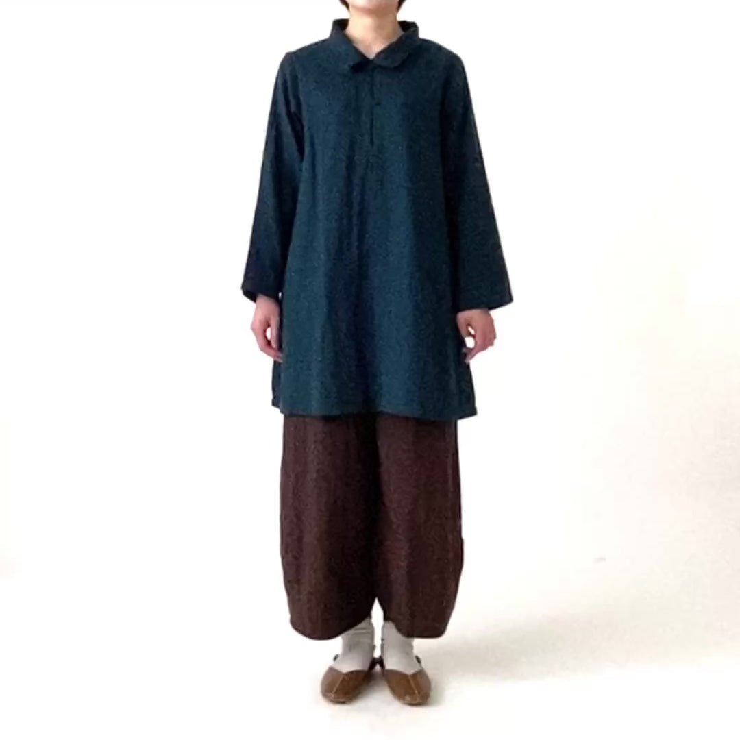 衿先に付けたボタンを留めるとハイネック風になる衿が特徴です。ボタンの開け閉めで衿の形を変えられます。胸にダーツを入れ綺麗なシルエットに仕上げました。