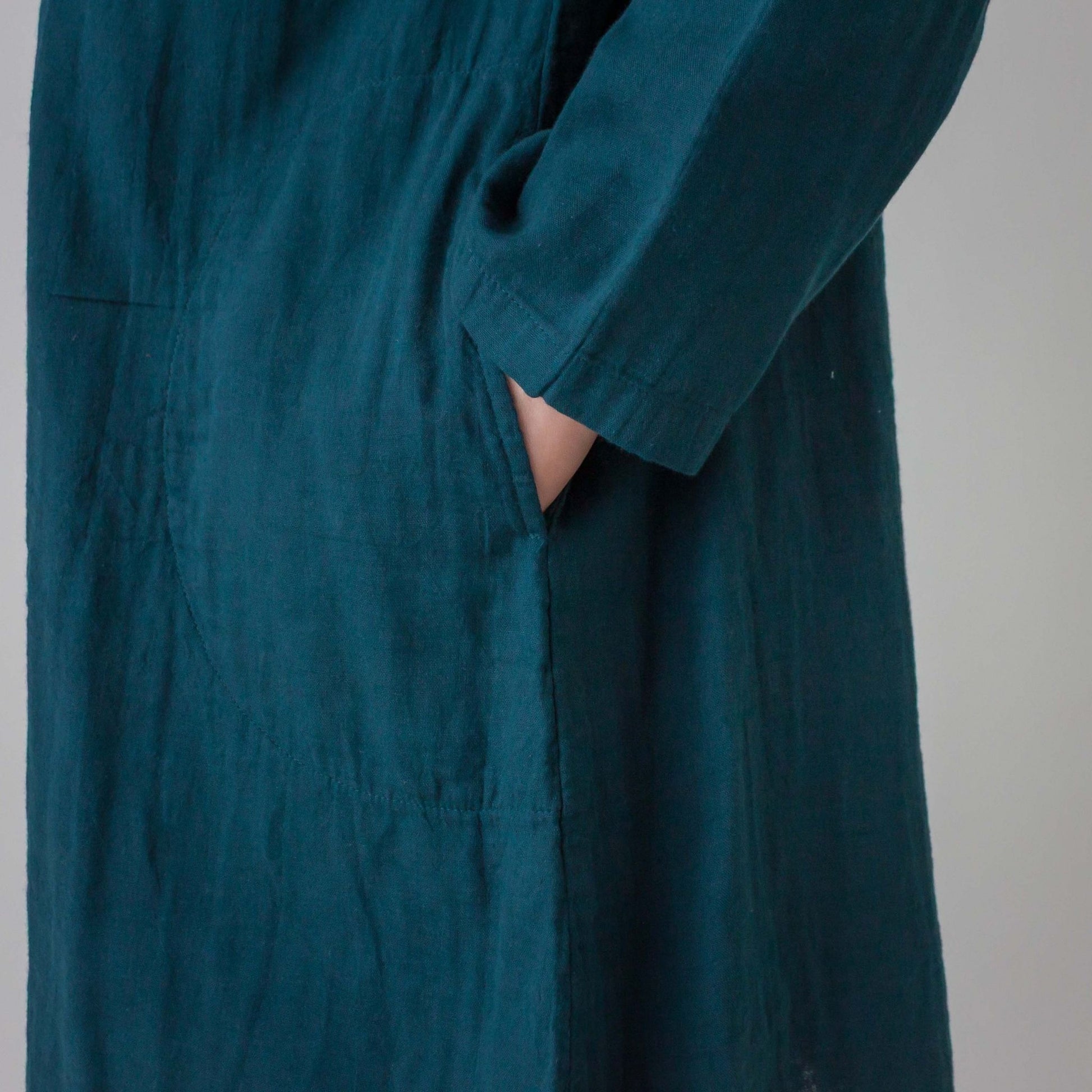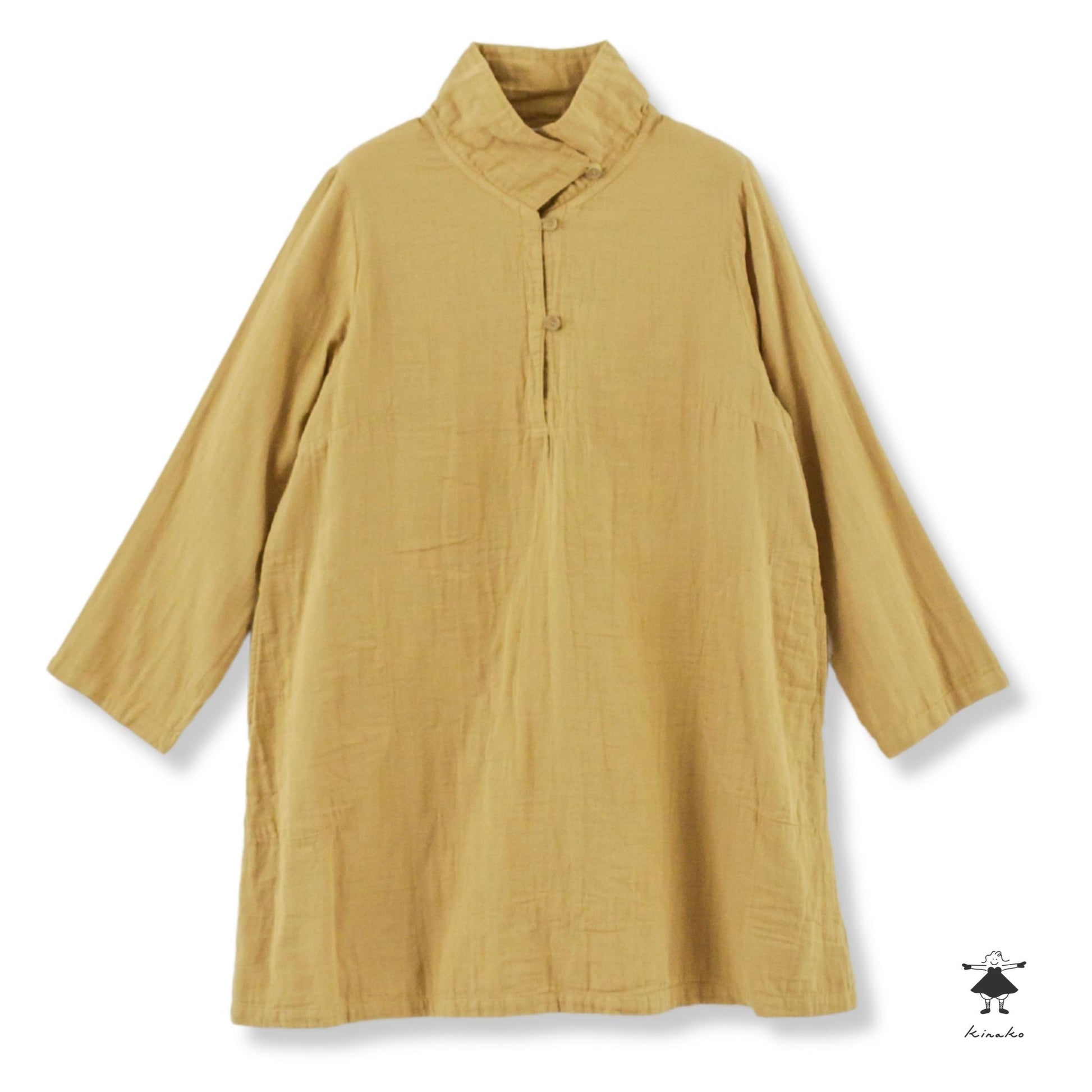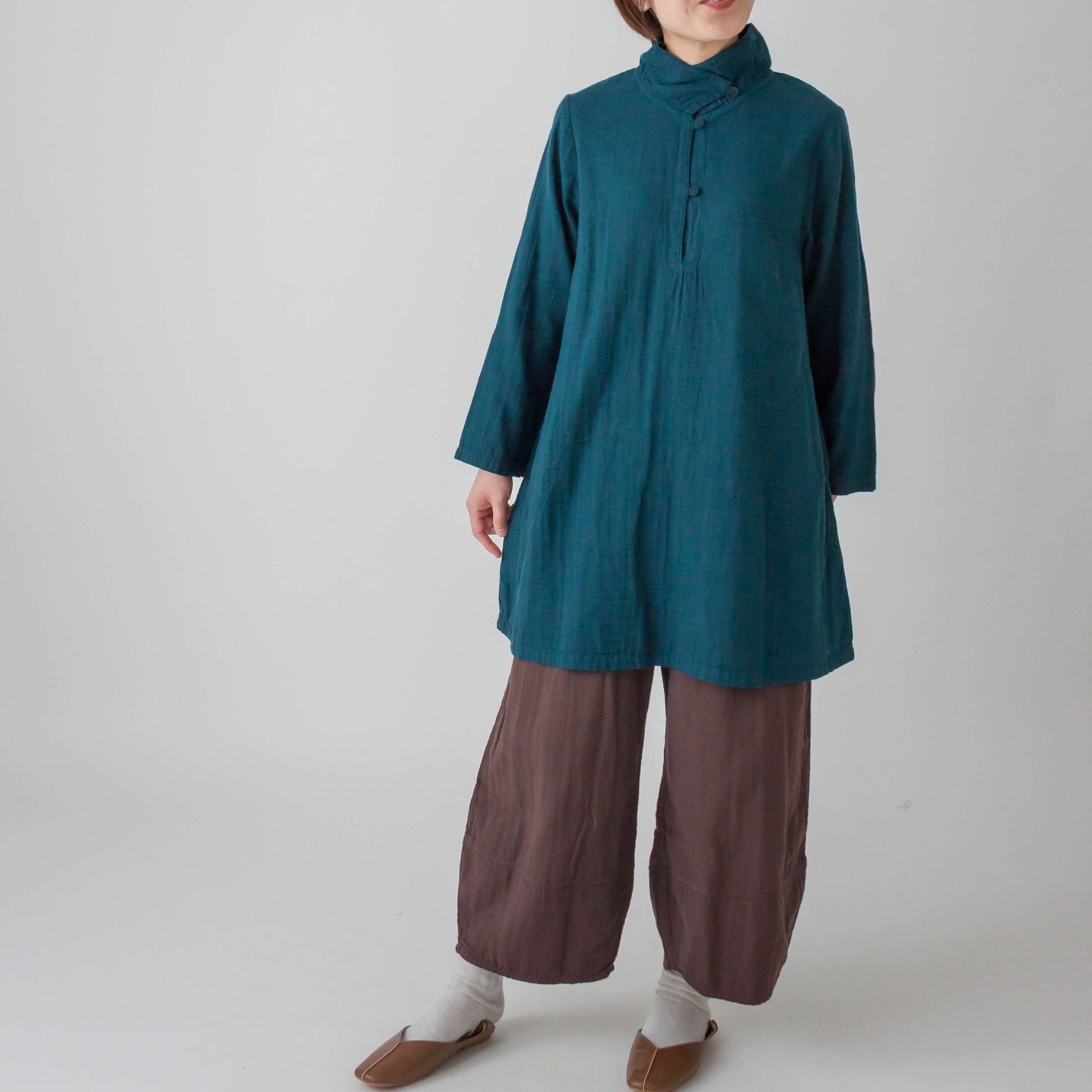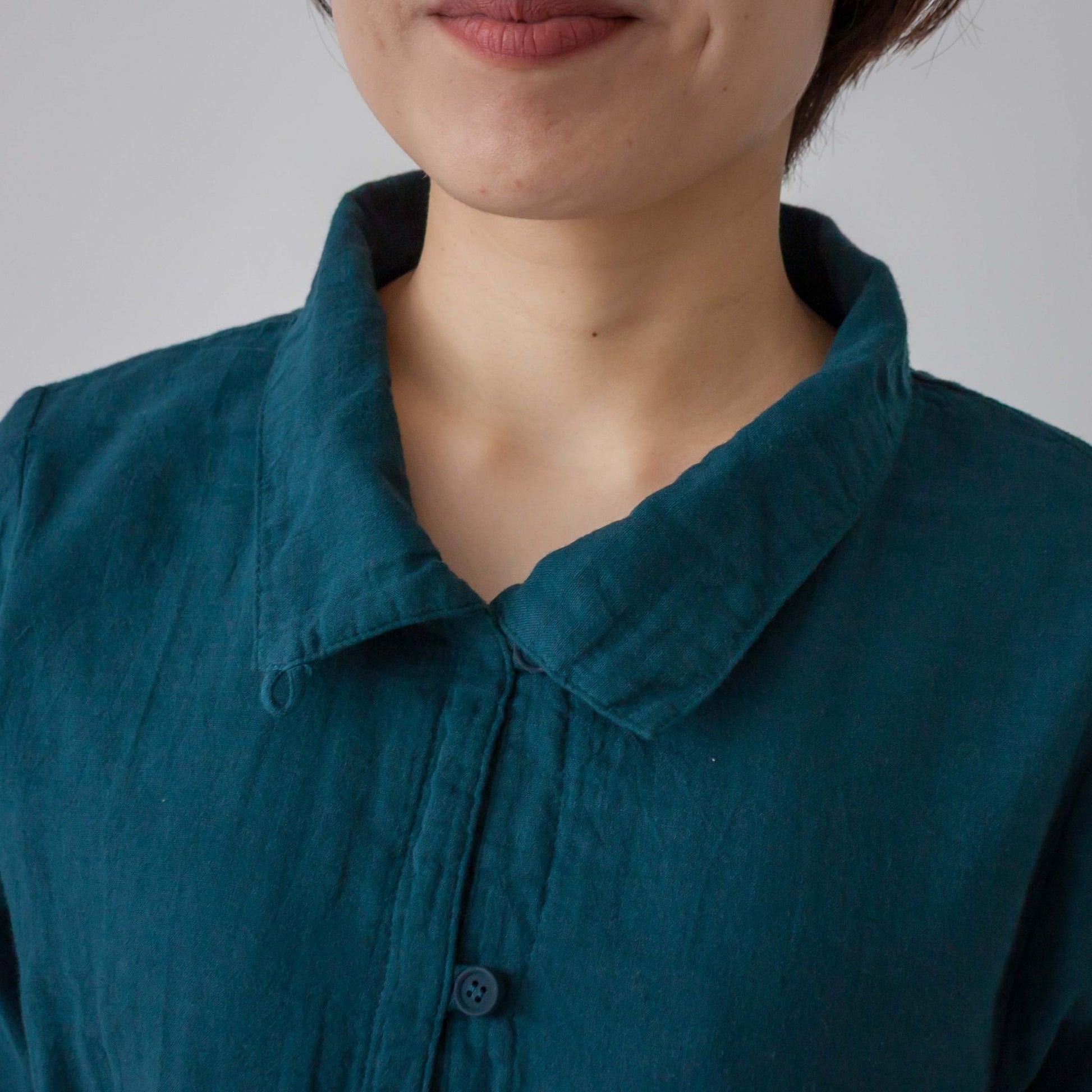 衿先に付けたボタンを留めるとハイネック風になる衿が特徴です。ボタンの開け閉めで衿の形を変えられます。胸にダーツを入れ綺麗なシルエットに仕上げました。